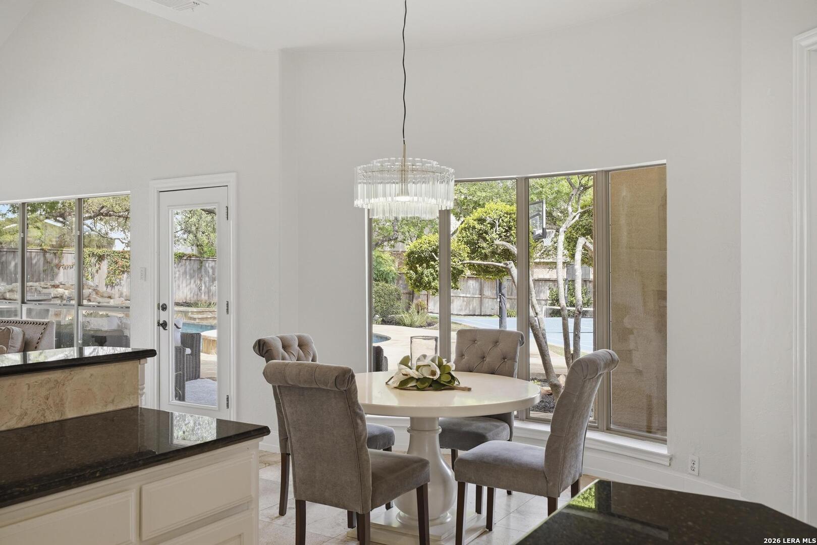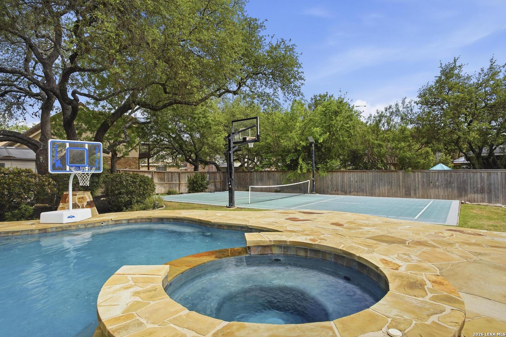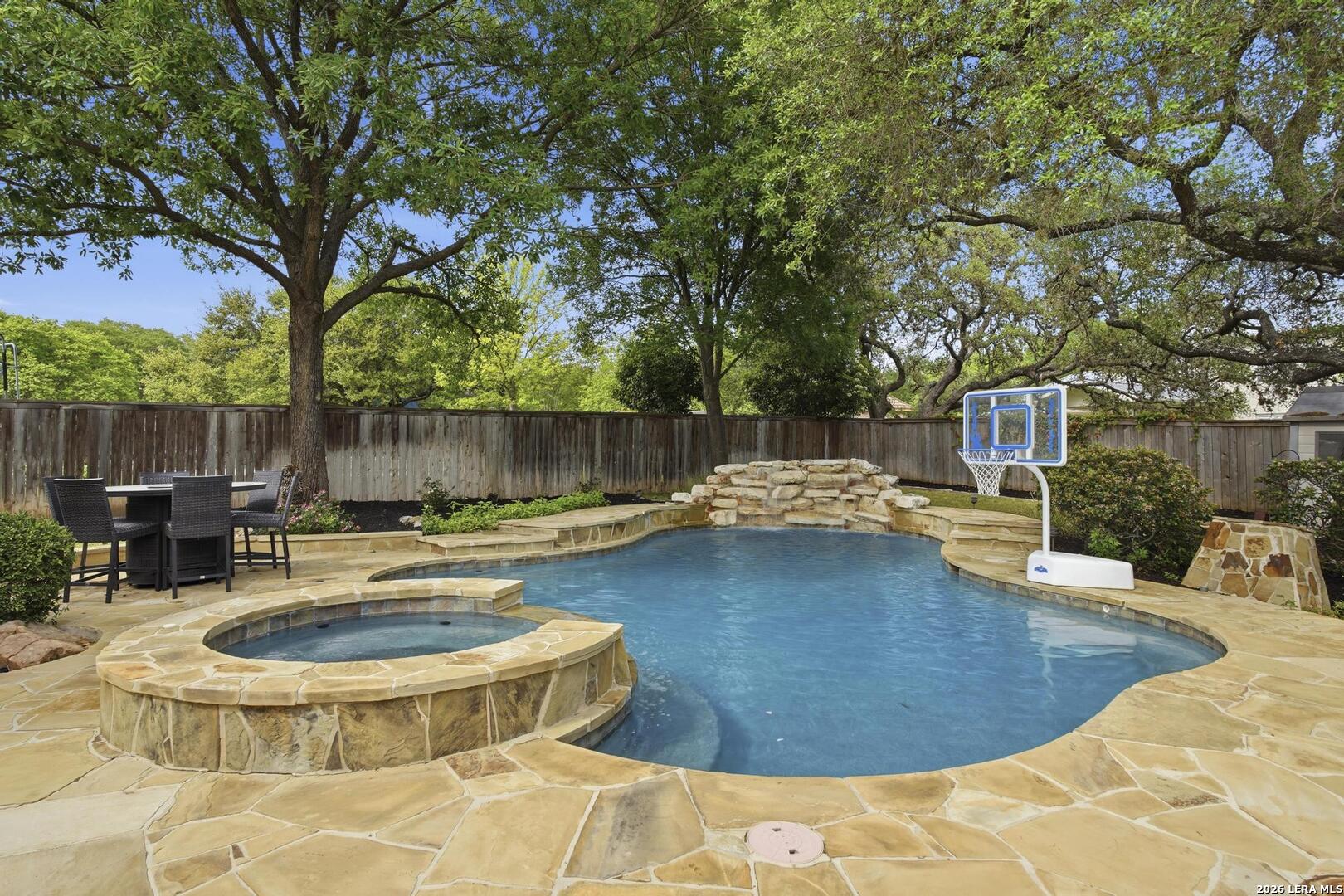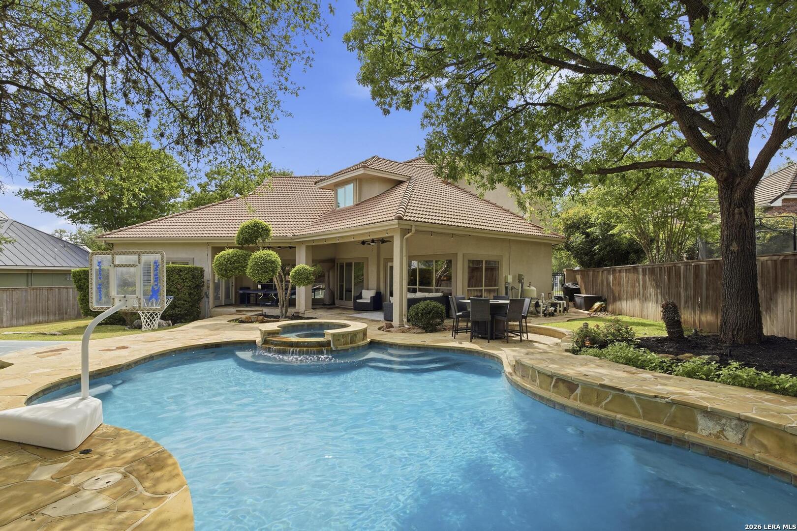 Welcome to this captivating, custom-built Burdick home located in The Fairways of Sonterra. This meticulously maintained 5-bedroom, 4.5-bath property blends timeless sophistication with a neutral color palette and natural materials, creating a welcoming ambiance throughout. The main floor features an exquisite primary suite, a secondary bedroom with a full bath (which could make an excellent office/study), formal dining and formal living room - all enhanced with elegant Plantation Shutters. Enjoy an open-concept layout with a dream kitchen, complete with stainless steel appliances, a spacious island, and abundant counter space, perfect for entertaining. The breakfast area and great room offer a warm, corner fireplace and large, sparkling windows that let natural light flow in throughout this home. Upstairs, discover three generously sized bedrooms, including one with its own private bath. The oversized garage provides ample space for vehicles and a golf cart, ensuring convenience for golf enthusiasts. Step outside to the expansive, private backyard designed for both relaxation and recreation. Enjoy cool breezes on the covered patio, a sparkling heated pool with spa and tranquil waterfall, and a private sport court/pickleball court for endless fun. Recent updates include a new main floor Water Heater, a new High Efficiency Water Softener system, a new Garage Door, Epoxy flooring in the garage, new Carpet in the master bedroom, LED lights, new Ceiling Fans, and more. This exceptional home offers the perfect blend of luxury and comfort - making it a place you may want to make your own.