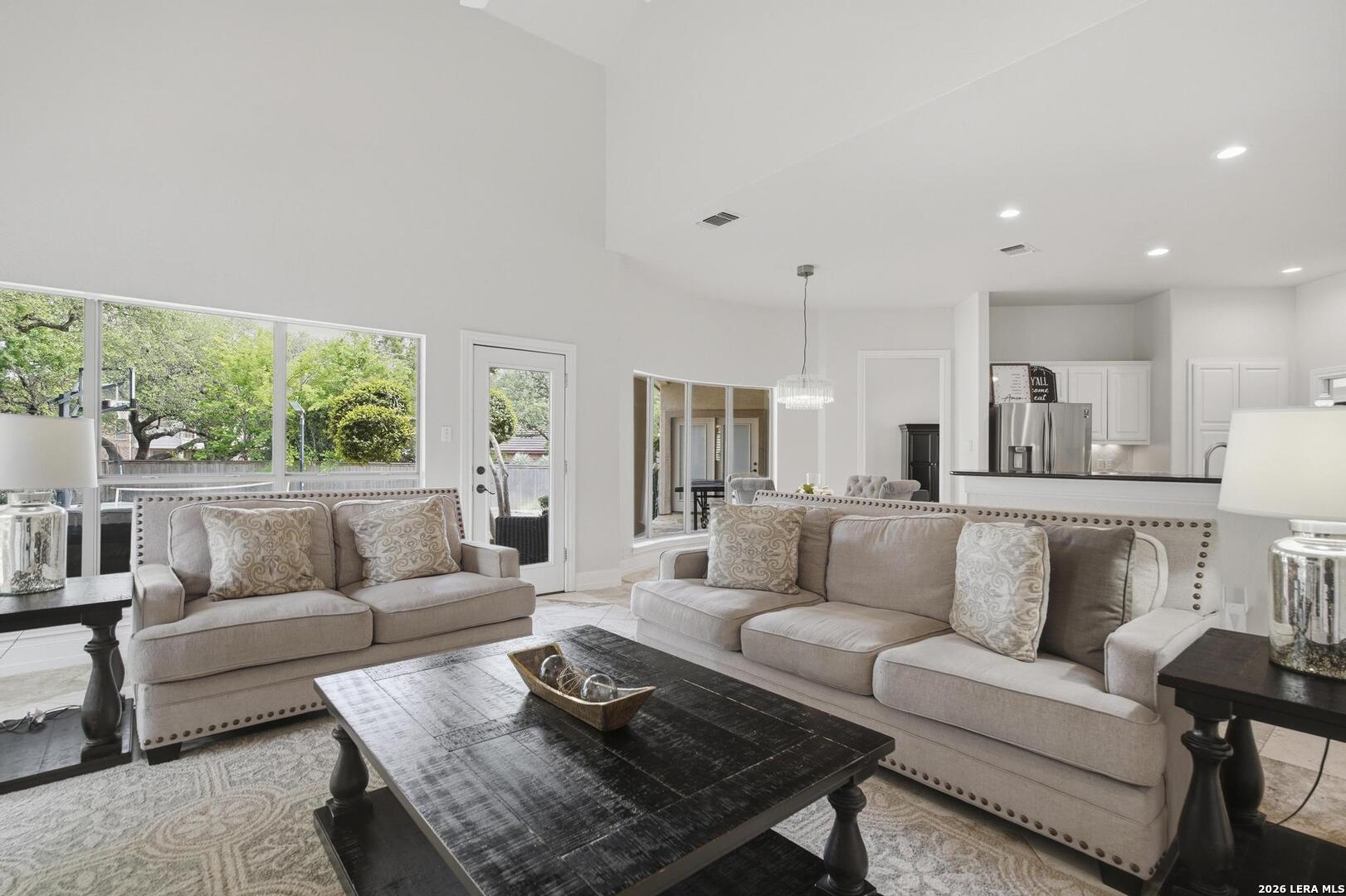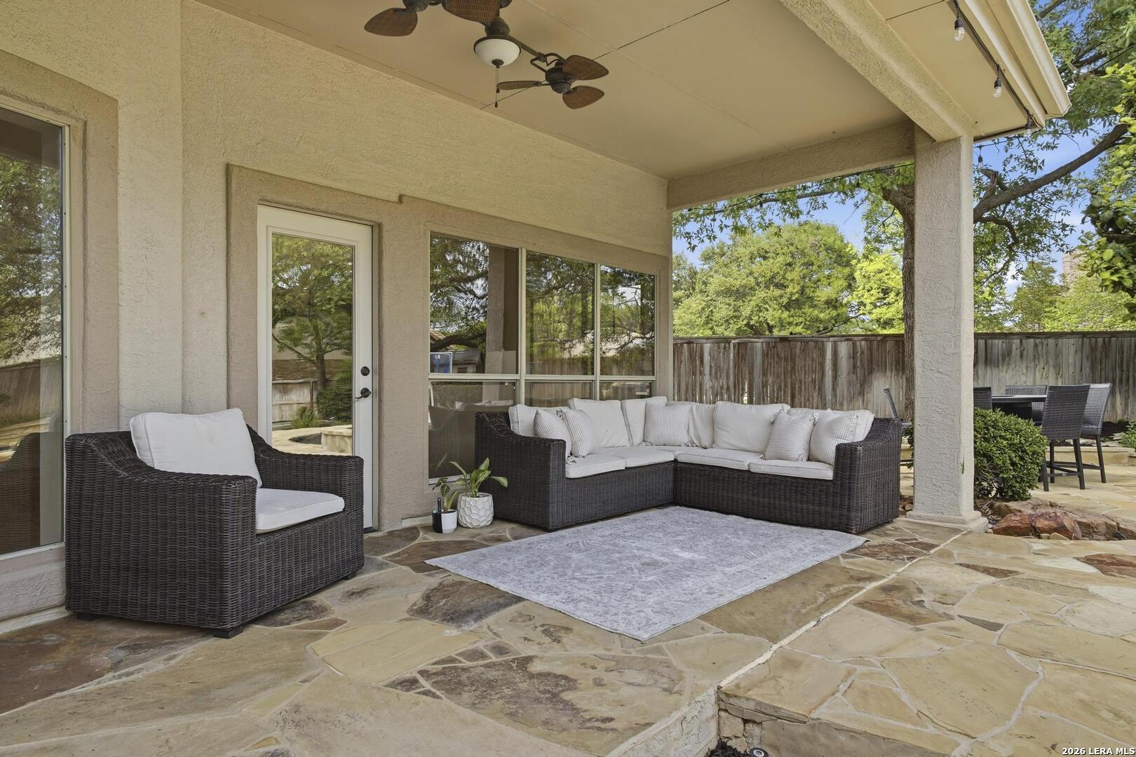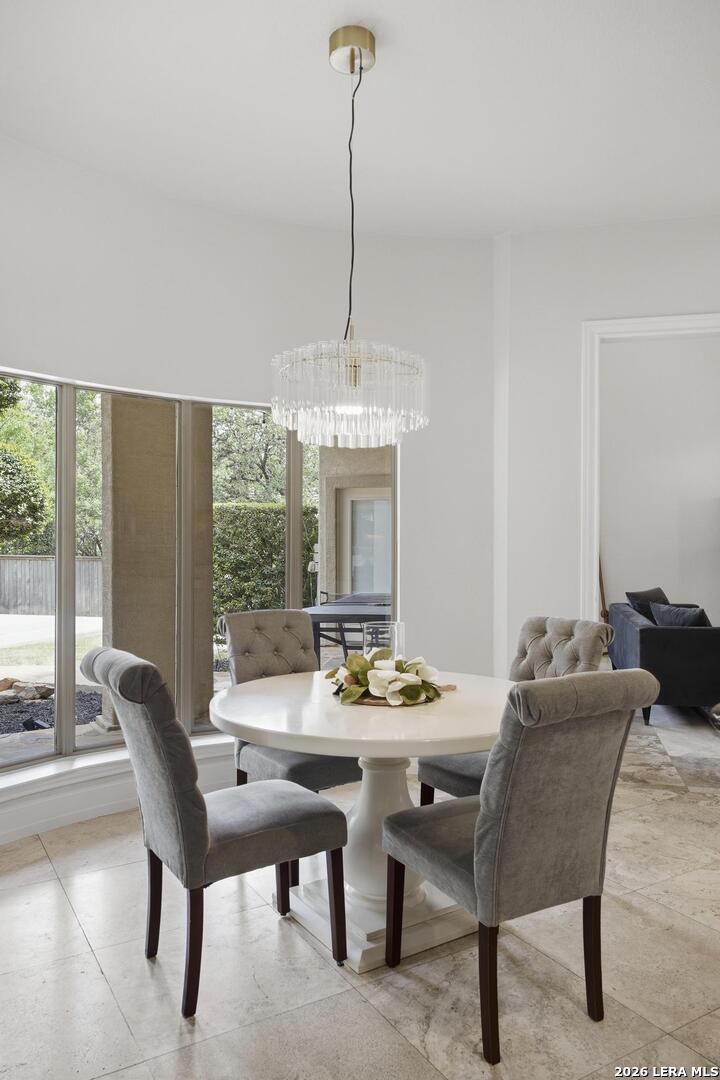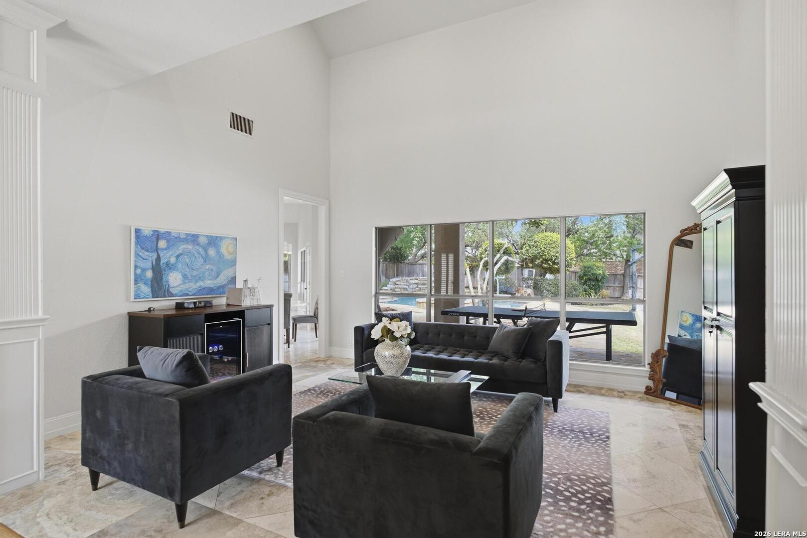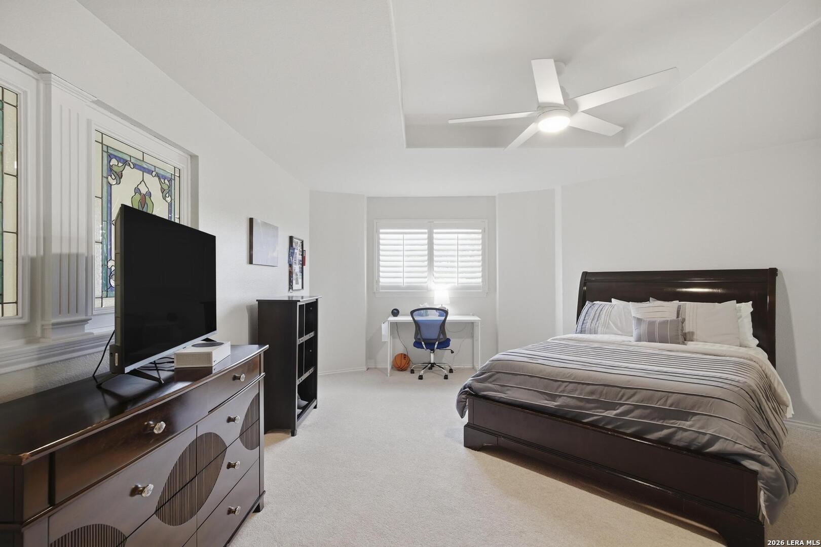 Welcome to this captivating, custom-built Burdick home located in The Fairways of Sonterra. This meticulously maintained 5-bedroom, 4.5-bath property blends timeless sophistication with a neutral color palette and natural materials, creating a welcoming ambiance throughout. The main floor features an exquisite primary suite, a secondary bedroom with a full bath (which could make an excellent office/study), formal dining and formal living room - all enhanced with elegant Plantation Shutters. Enjoy an open-concept layout with a dream kitchen, complete with stainless steel appliances, a spacious island, and abundant counter space, perfect for entertaining. The breakfast area and great room offer a warm, corner fireplace and large, sparkling windows that let natural light flow in throughout this home. Upstairs, discover three generously sized bedrooms, including one with its own private bath. The oversized garage provides ample space for vehicles and a golf cart, ensuring convenience for golf enthusiasts. Step outside to the expansive, private backyard designed for both relaxation and recreation. Enjoy cool breezes on the covered patio, a sparkling heated pool with spa and tranquil waterfall, and a private sport court/pickleball court for endless fun. Recent updates include a new main floor Water Heater, a new High Efficiency Water Softener system, a new Garage Door, Epoxy flooring in the garage, new Carpet in the master bedroom, LED lights, new Ceiling Fans, and more. This exceptional home offers the perfect blend of luxury and comfort - making it a place you may want to make your own.