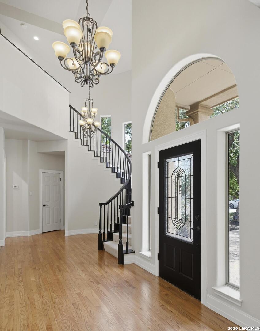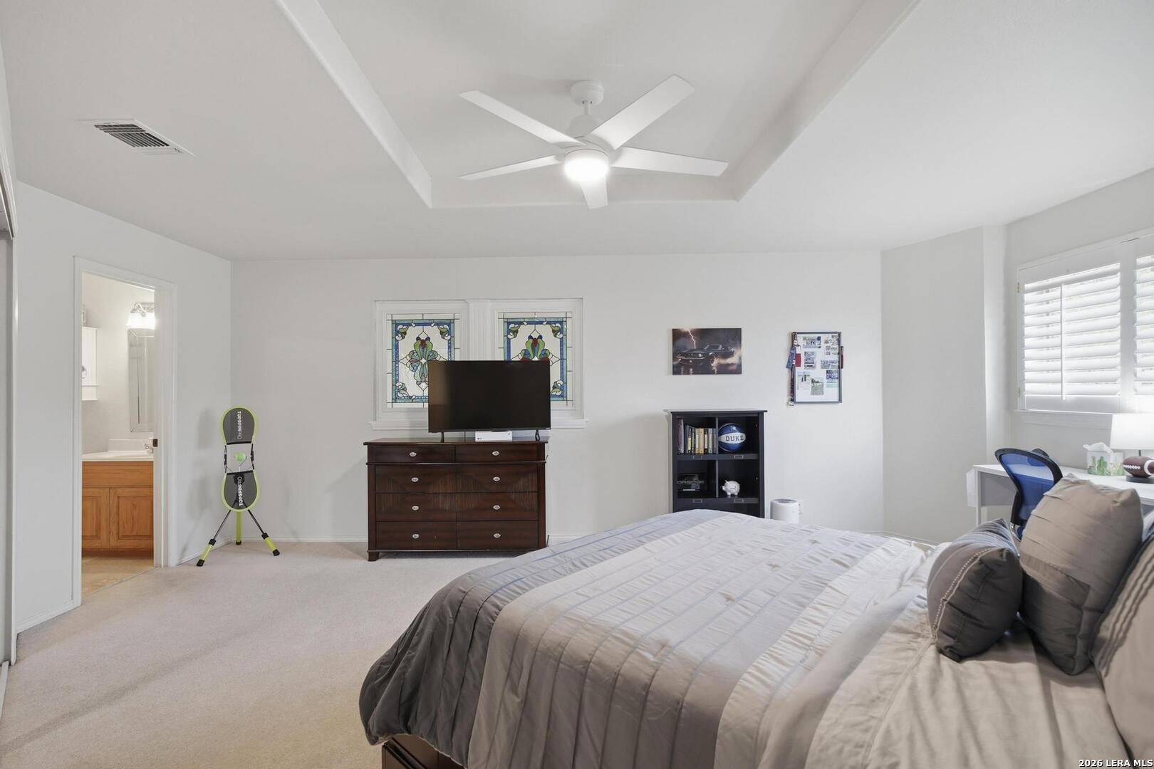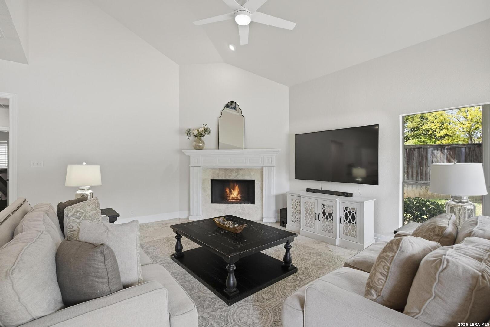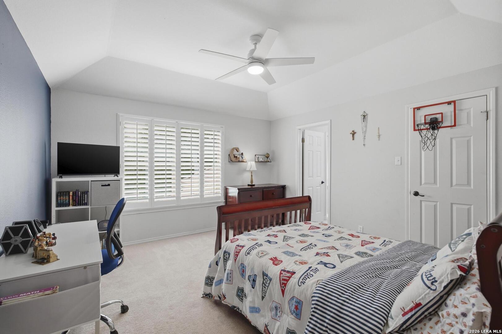 Welcome to this captivating, custom-built Burdick home located in The Fairways of Sonterra. This meticulously maintained 5-bedroom, 4.5-bath property blends timeless sophistication with a neutral color palette and natural materials, creating a welcoming ambiance throughout. The main floor features an exquisite primary suite, a secondary bedroom with a full bath (which could make an excellent office/study), formal dining and formal living room - all enhanced with elegant Plantation Shutters. Enjoy an open-concept layout with a dream kitchen, complete with stainless steel appliances, a spacious island, and abundant counter space, perfect for entertaining. The breakfast area and great room offer a warm, corner fireplace and large, sparkling windows that let natural light flow in throughout this home. Upstairs, discover three generously sized bedrooms, including one with its own private bath. The oversized garage provides ample space for vehicles and a golf cart, ensuring convenience for golf enthusiasts. Step outside to the expansive, private backyard designed for both relaxation and recreation. Enjoy cool breezes on the covered patio, a sparkling heated pool with spa and tranquil waterfall, and a private sport court/pickleball court for endless fun. Recent updates include a new main floor Water Heater, a new High Efficiency Water Softener system, a new Garage Door, Epoxy flooring in the garage, new Carpet in the master bedroom, LED lights, new Ceiling Fans, and more. This exceptional home offers the perfect blend of luxury and comfort - making it a place you may want to make your own.