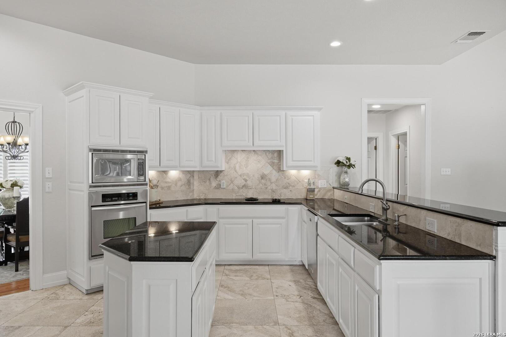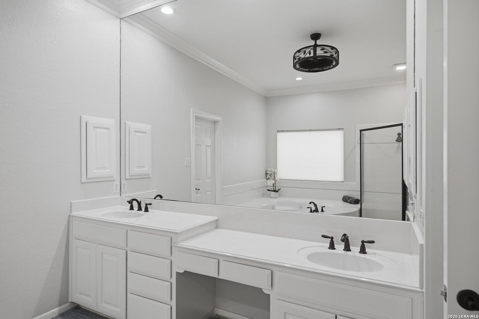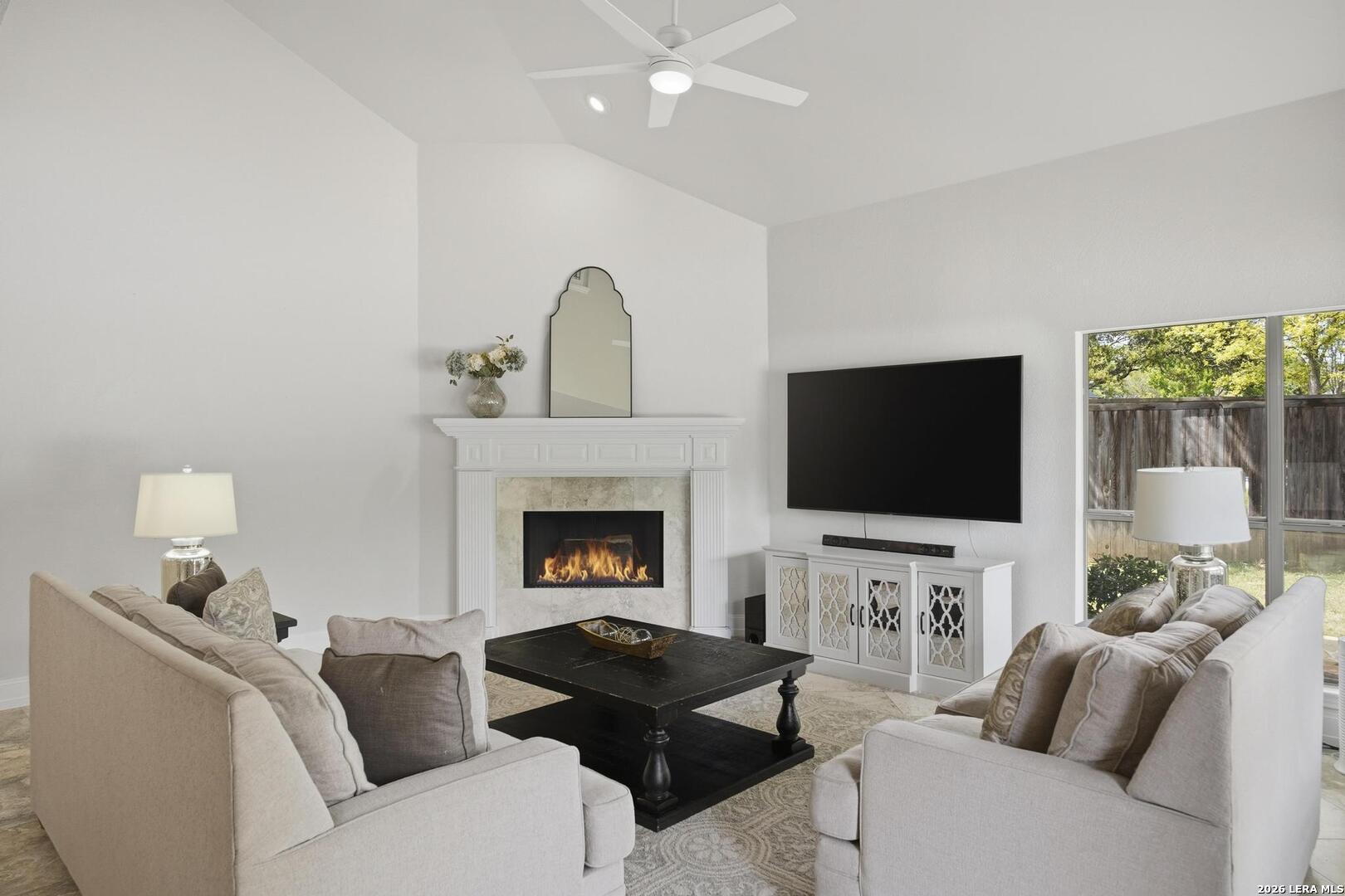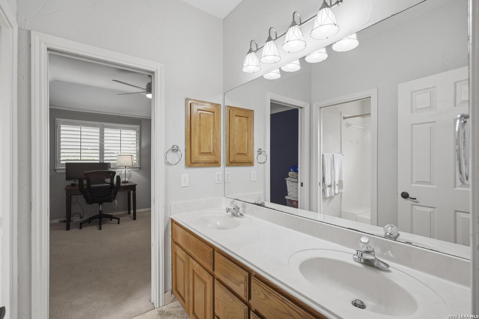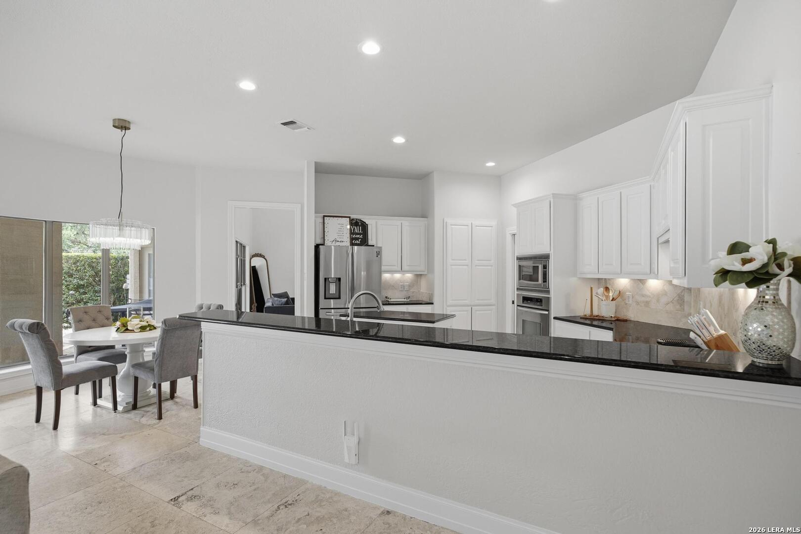 Welcome to this captivating, custom-built Burdick home located in The Fairways of Sonterra. This meticulously maintained 5-bedroom, 4.5-bath property blends timeless sophistication with a neutral color palette and natural materials, creating a welcoming ambiance throughout. The main floor features an exquisite primary suite, a secondary bedroom with a full bath (which could make an excellent office/study), formal dining and formal living room - all enhanced with elegant Plantation Shutters. Enjoy an open-concept layout with a dream kitchen, complete with stainless steel appliances, a spacious island, and abundant counter space, perfect for entertaining. The breakfast area and great room offer a warm, corner fireplace and large, sparkling windows that let natural light flow in throughout this home. Upstairs, discover three generously sized bedrooms, including one with its own private bath. The oversized garage provides ample space for vehicles and a golf cart, ensuring convenience for golf enthusiasts. Step outside to the expansive, private backyard designed for both relaxation and recreation. Enjoy cool breezes on the covered patio, a sparkling heated pool with spa and tranquil waterfall, and a private sport court/pickleball court for endless fun. Recent updates include a new main floor Water Heater, a new High Efficiency Water Softener system, a new Garage Door, Epoxy flooring in the garage, new Carpet in the master bedroom, LED lights, new Ceiling Fans, and more. This exceptional home offers the perfect blend of luxury and comfort - making it a place you may want to make your own.