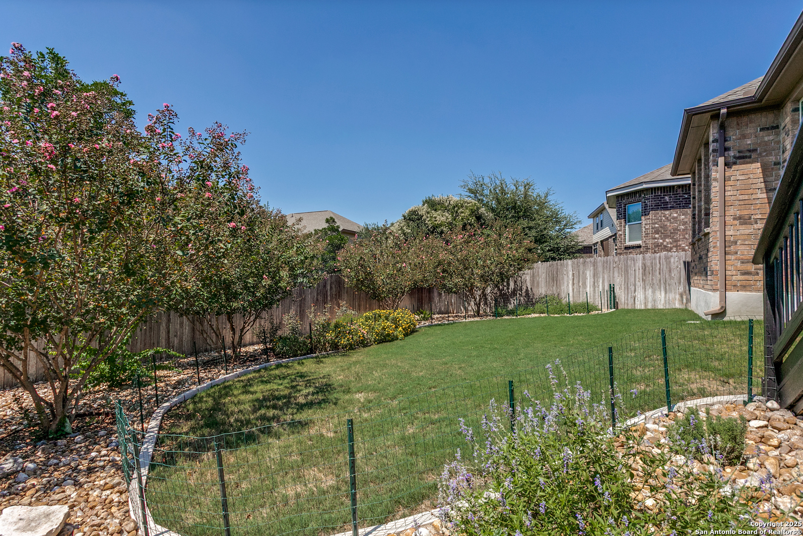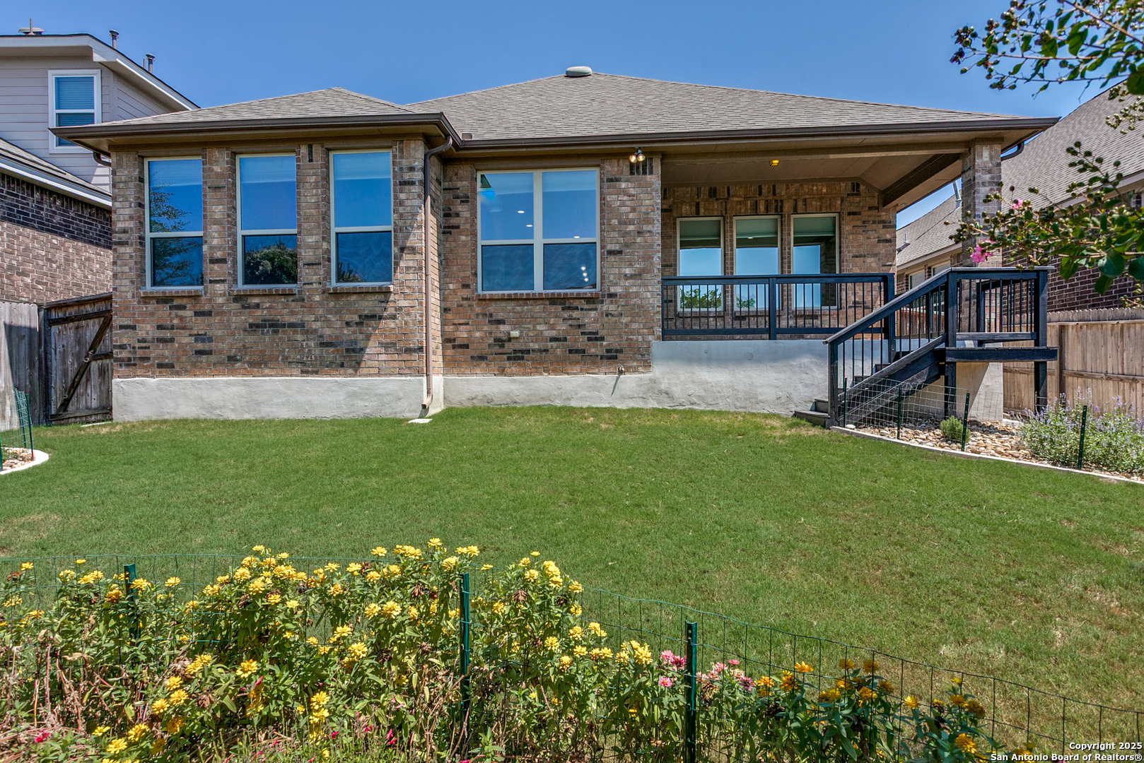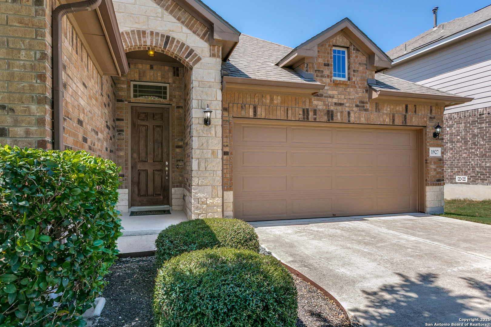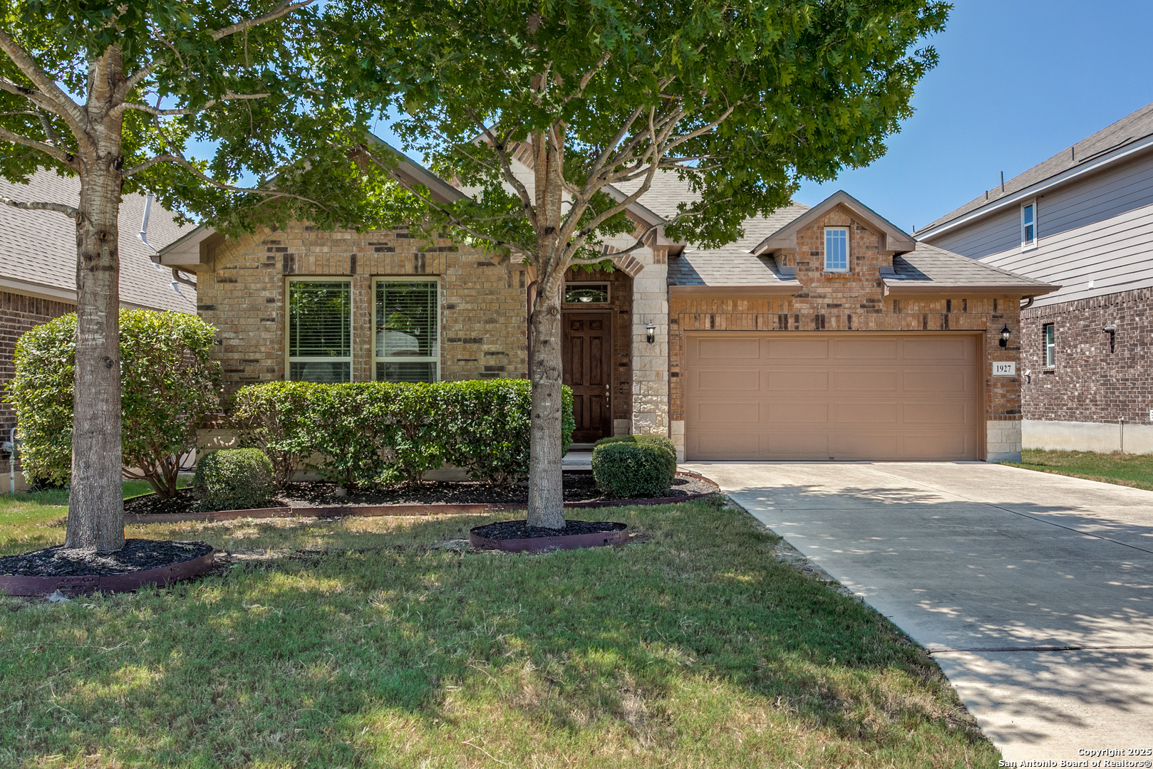 Beautiful Ashton Woods all-brick 1-story offering 1,760 sq.ft. of stylish living space in popular Arcadia Ridge. This thoughtfully designed 3-bedroom, 2-bath home lives better than new, showcasing numerous upgraded designer touches throughout. An inviting entry hallway with large art niches and offset tile floors sets the tone, with brand new carpet only in the bedrooms for added comfort. Custom top-down/bottom up window coverings add both elegance & functionality. The open, airy floor plan is filled with natural light, drawing your eye to the beautifully landscaped backyard from the family room. The gourmet island kitchen is a true centerpiece, complete with gas cooking, sleek solid-surface countertops, an eye-catching tile backsplash, stainless steel appliances (refrigerator included), and abundant cabinetry. The spacious primary suite is a private retreat, featuring a spa-like bath with dual vanities, gorgeous 2-sided entry frameless glass shower with dual shower heads, built-in bench seating, and elegant floor-to-ceiling tile complemented with its lovely designer tiled floor. A generous walk-in closet offers plenty of space for wardrobe needs. Split secondary bedrooms provide privacy and flexibility. Step outside to the covered patio, perfect for entertaining or relaxing while enjoying the lush landscaping and serene evening views. Full sprinkler system, gutters & H2O softener included. Unbeatable location with highly regarded NISD schools, quick access to major highways, shopping, dining, employment centers, and Lackland AFB.