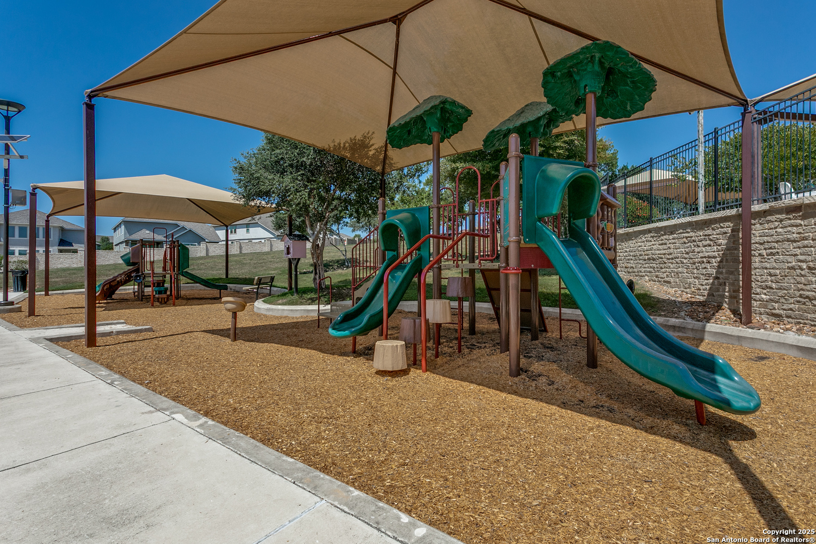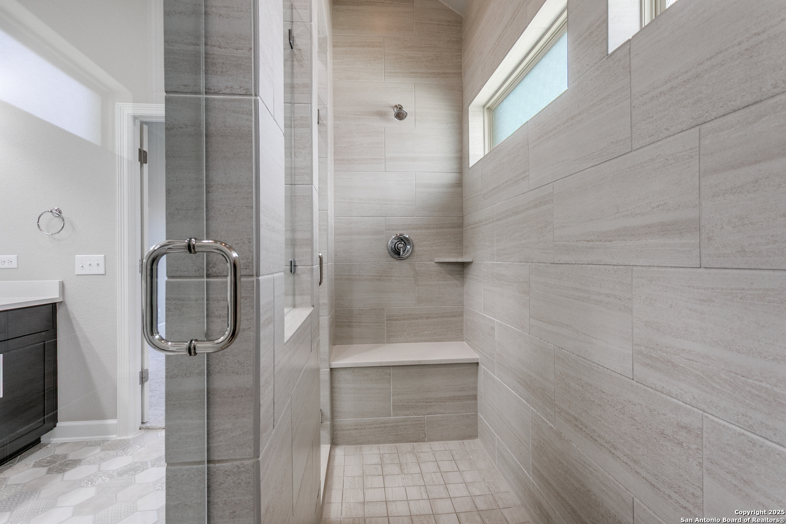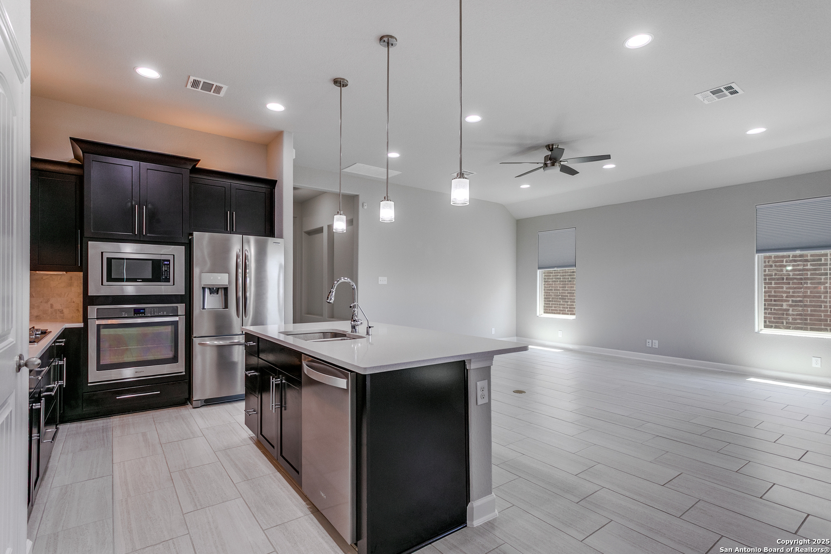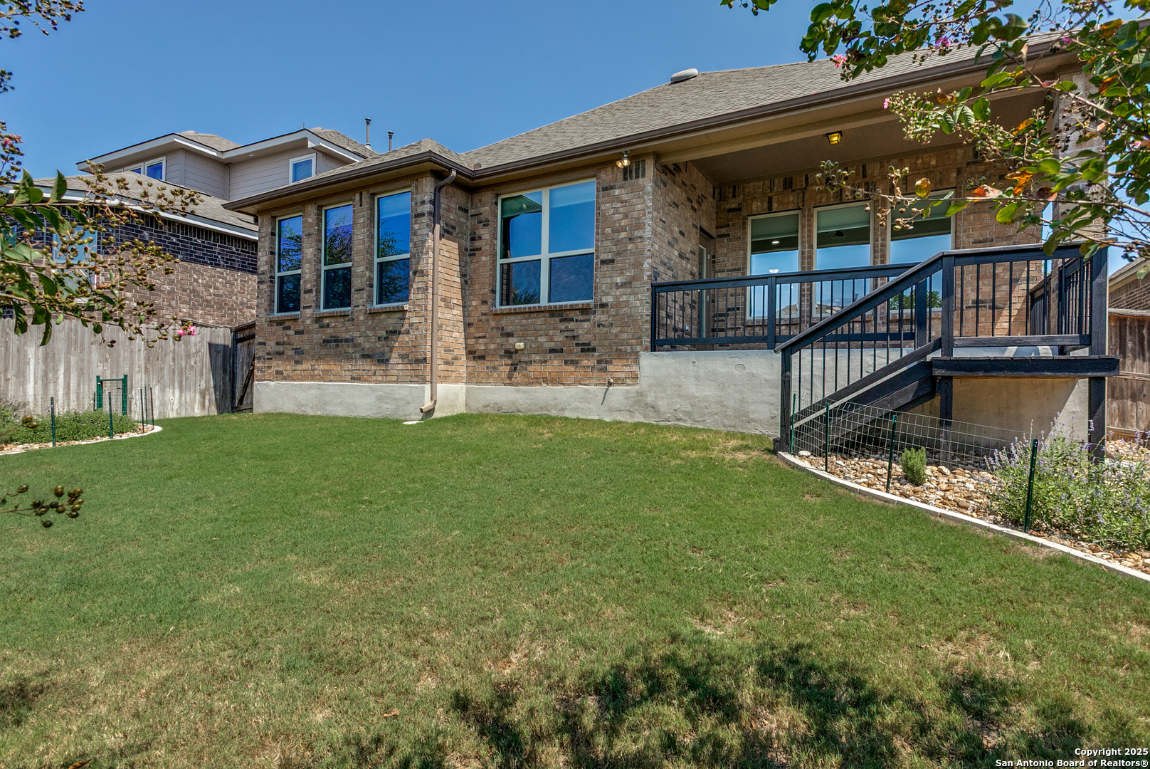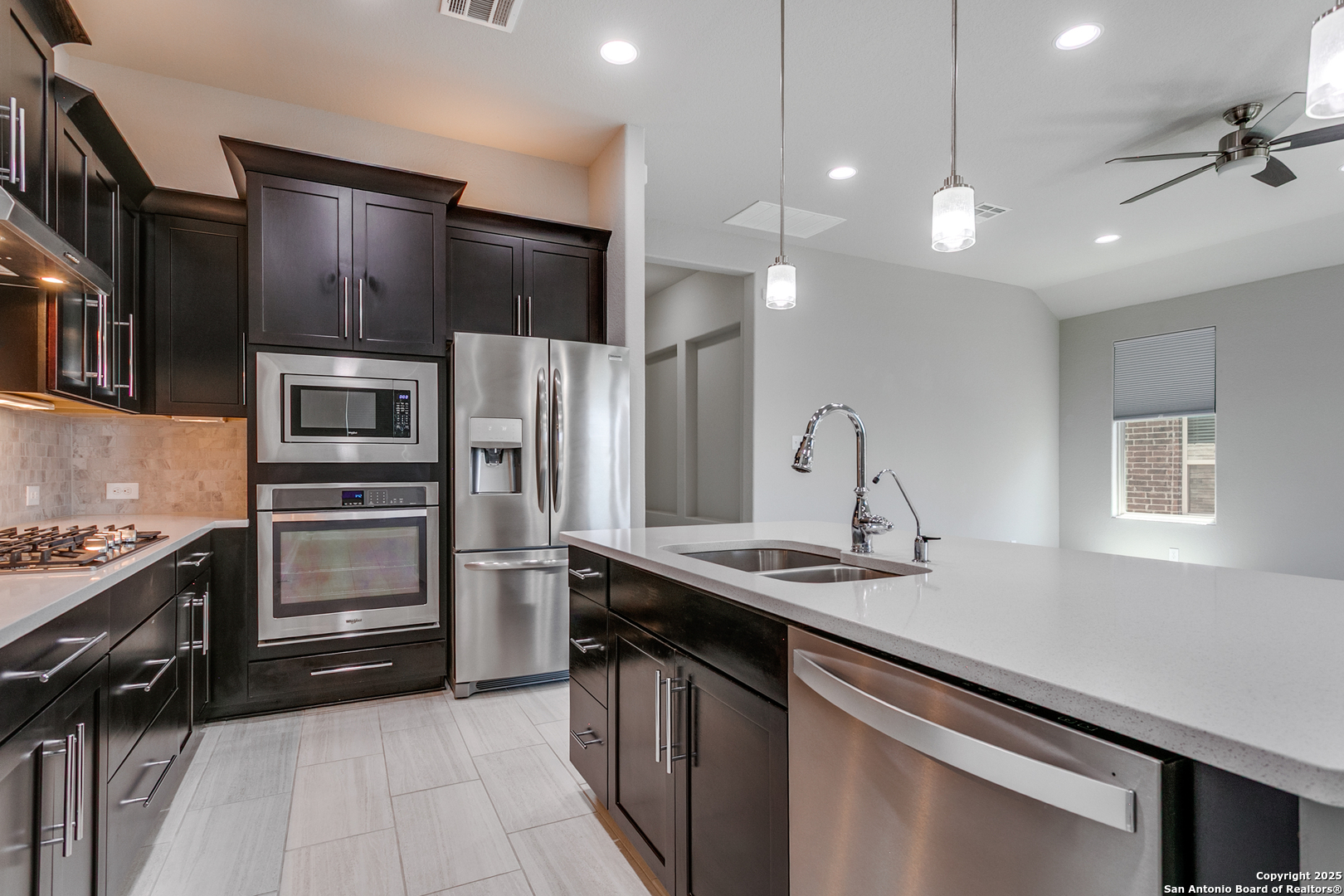Beautiful Ashton Woods all-brick 1-story offering 1,760 sq.ft. of stylish living space in popular Arcadia Ridge. This thoughtfully designed 3-bedroom, 2-bath home lives better than new, showcasing numerous upgraded designer touches throughout. An inviting entry hallway with large art niches and offset tile floors sets the tone, with brand new carpet only in the bedrooms for added comfort. Custom top-down/bottom up window coverings add both elegance & functionality. The open, airy floor plan is filled with natural light, drawing your eye to the beautifully landscaped backyard from the family room. The gourmet island kitchen is a true centerpiece, complete with gas cooking, sleek solid-surface countertops, an eye-catching tile backsplash, stainless steel appliances (refrigerator included), and abundant cabinetry. The spacious primary suite is a private retreat, featuring a spa-like bath with dual vanities, gorgeous 2-sided entry frameless glass shower with dual shower heads, built-in bench seating, and elegant floor-to-ceiling tile complemented with its lovely designer tiled floor. A generous walk-in closet offers plenty of space for wardrobe needs. Split secondary bedrooms provide privacy and flexibility. Step outside to the covered patio, perfect for entertaining or relaxing while enjoying the lush landscaping and serene evening views. Full sprinkler system, gutters & H2O softener included. Unbeatable location with highly regarded NISD schools, quick access to major highways, shopping, dining, employment centers, and Lackland AFB.