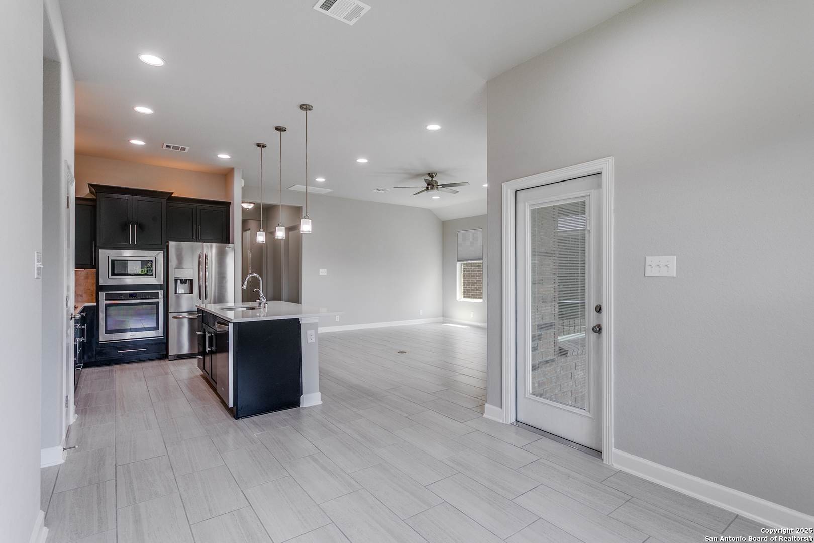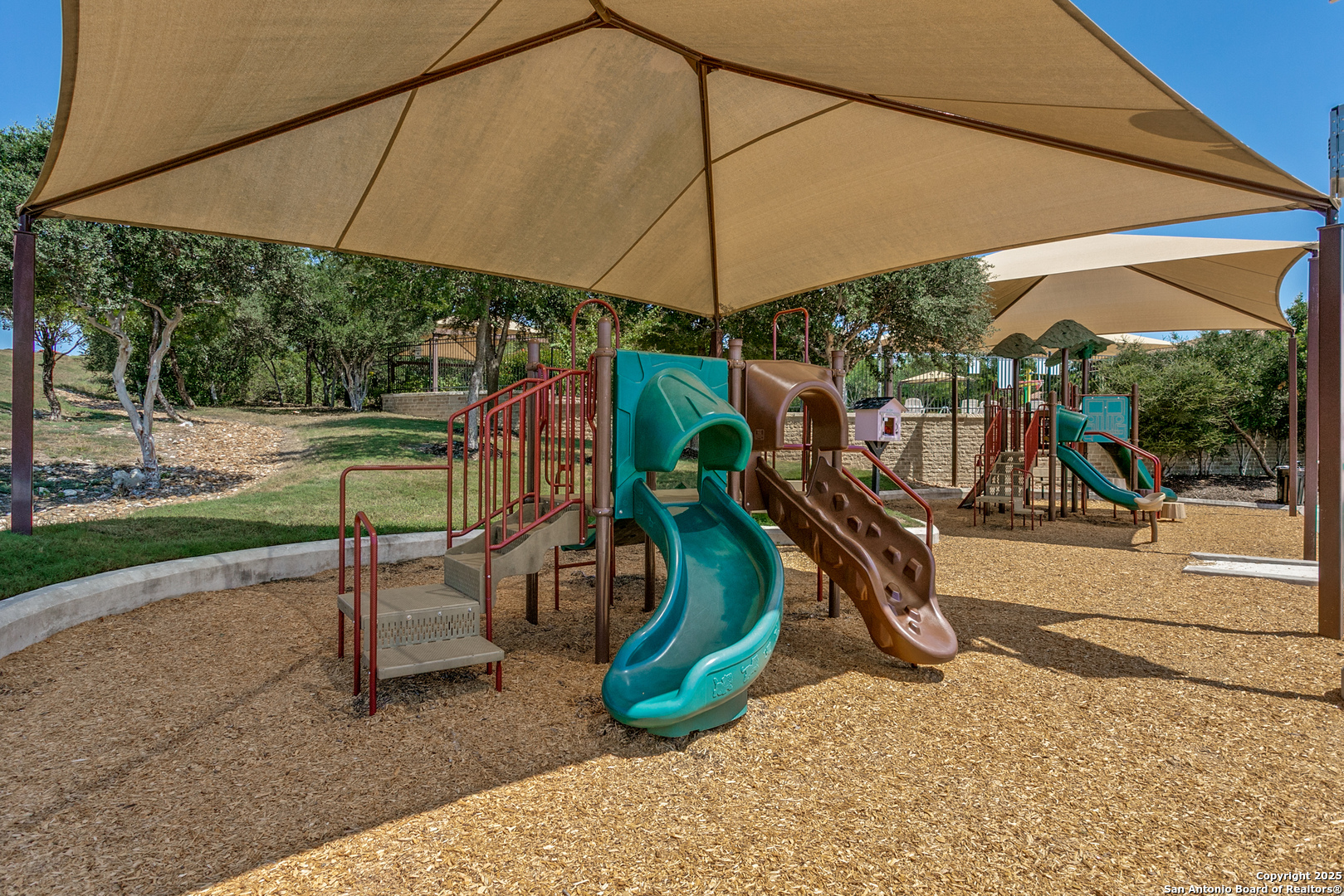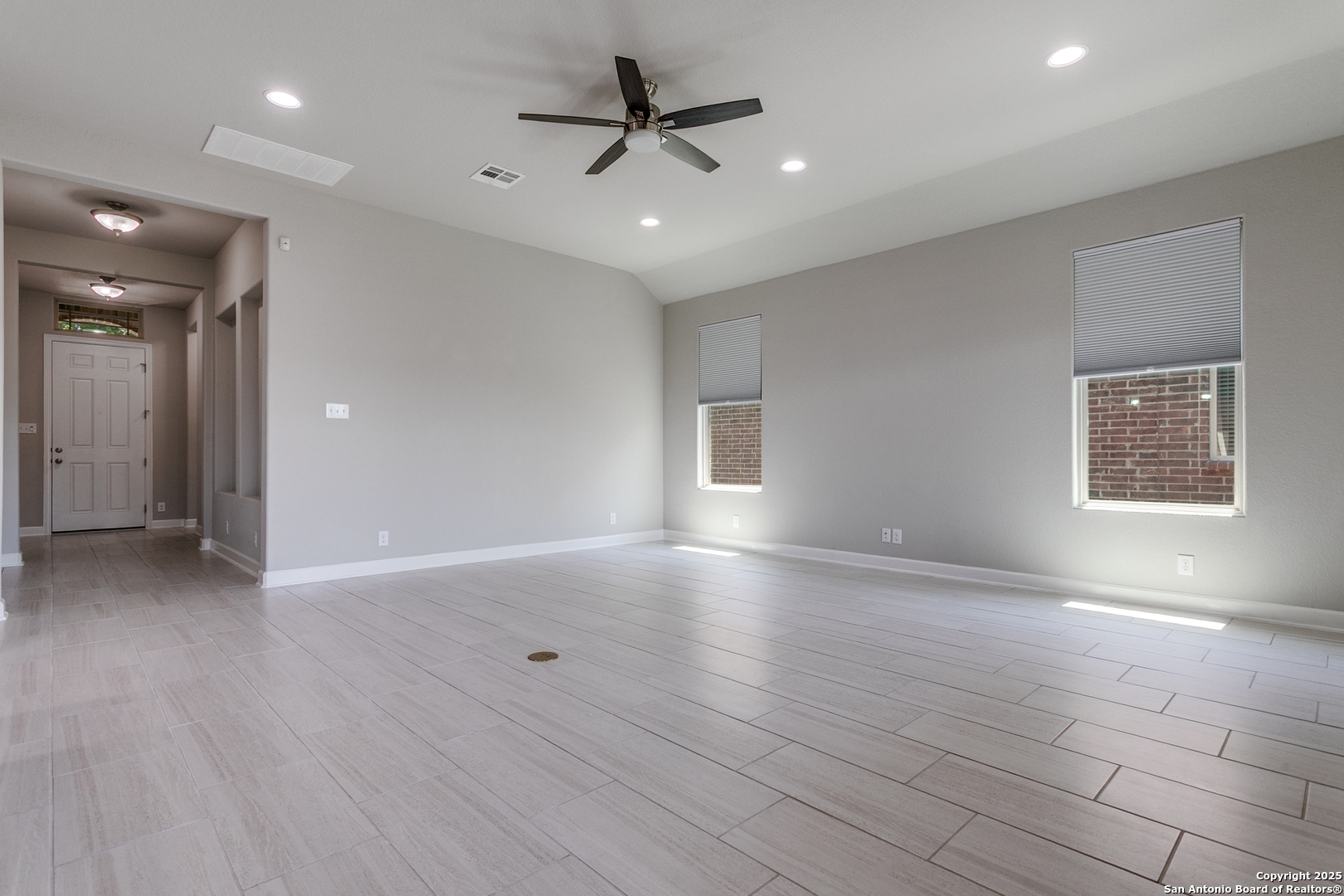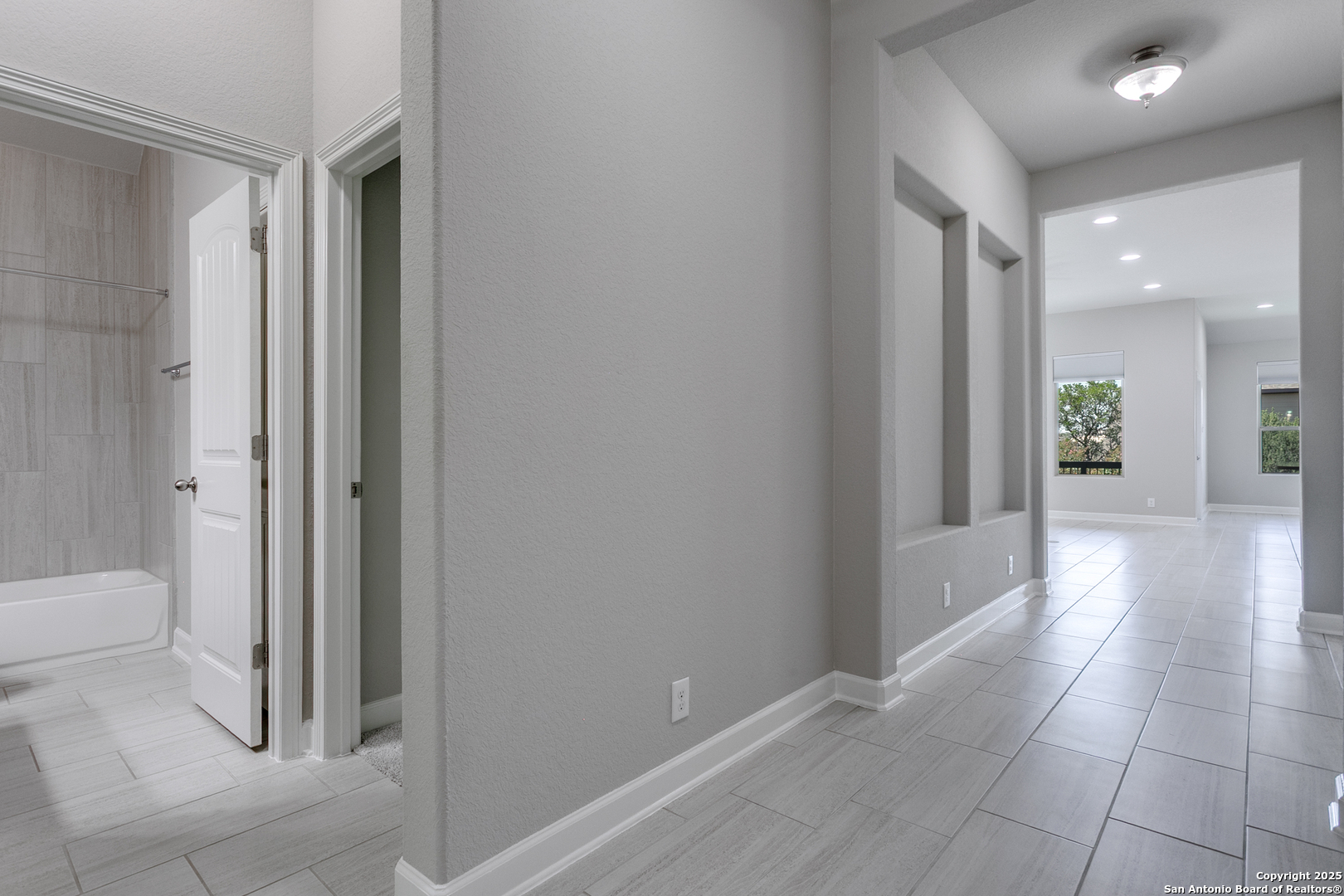 Beautiful Ashton Woods all-brick 1-story offering 1,760 sq.ft. of stylish living space in popular Arcadia Ridge. This thoughtfully designed 3-bedroom, 2-bath home lives better than new, showcasing numerous upgraded designer touches throughout. An inviting entry hallway with large art niches and offset tile floors sets the tone, with brand new carpet only in the bedrooms for added comfort. Custom top-down/bottom up window coverings add both elegance & functionality. The open, airy floor plan is filled with natural light, drawing your eye to the beautifully landscaped backyard from the family room. The gourmet island kitchen is a true centerpiece, complete with gas cooking, sleek solid-surface countertops, an eye-catching tile backsplash, stainless steel appliances (refrigerator included), and abundant cabinetry. The spacious primary suite is a private retreat, featuring a spa-like bath with dual vanities, gorgeous 2-sided entry frameless glass shower with dual shower heads, built-in bench seating, and elegant floor-to-ceiling tile complemented with its lovely designer tiled floor. A generous walk-in closet offers plenty of space for wardrobe needs. Split secondary bedrooms provide privacy and flexibility. Step outside to the covered patio, perfect for entertaining or relaxing while enjoying the lush landscaping and serene evening views. Full sprinkler system, gutters & H2O softener included. Unbeatable location with highly regarded NISD schools, quick access to major highways, shopping, dining, employment centers, and Lackland AFB.