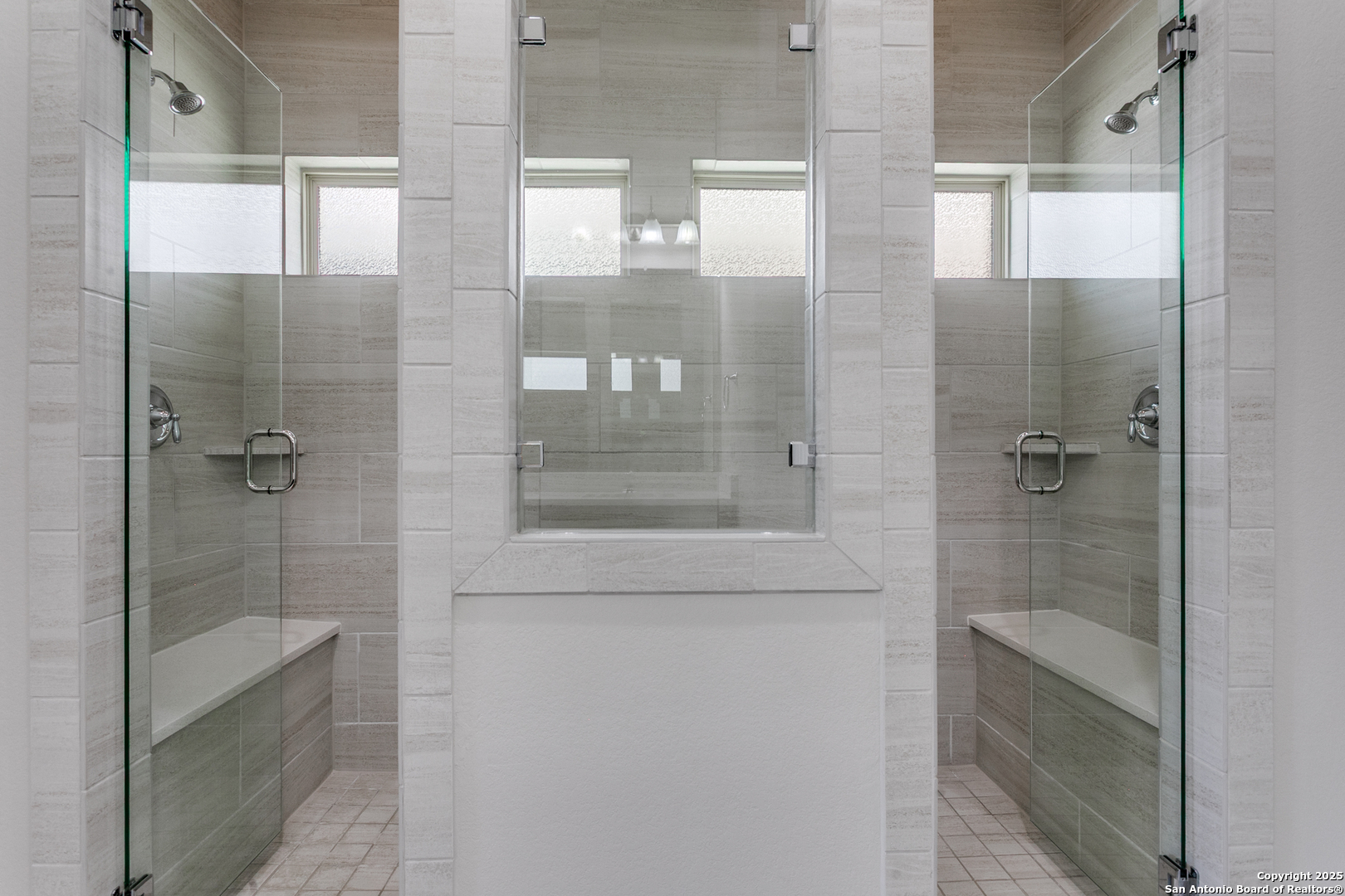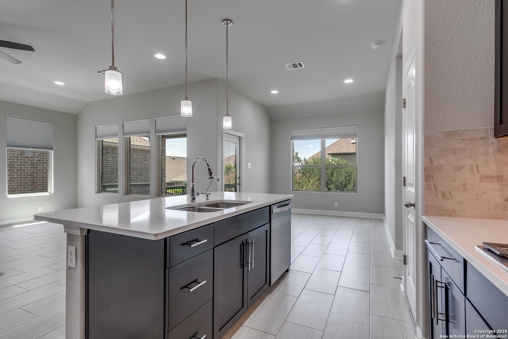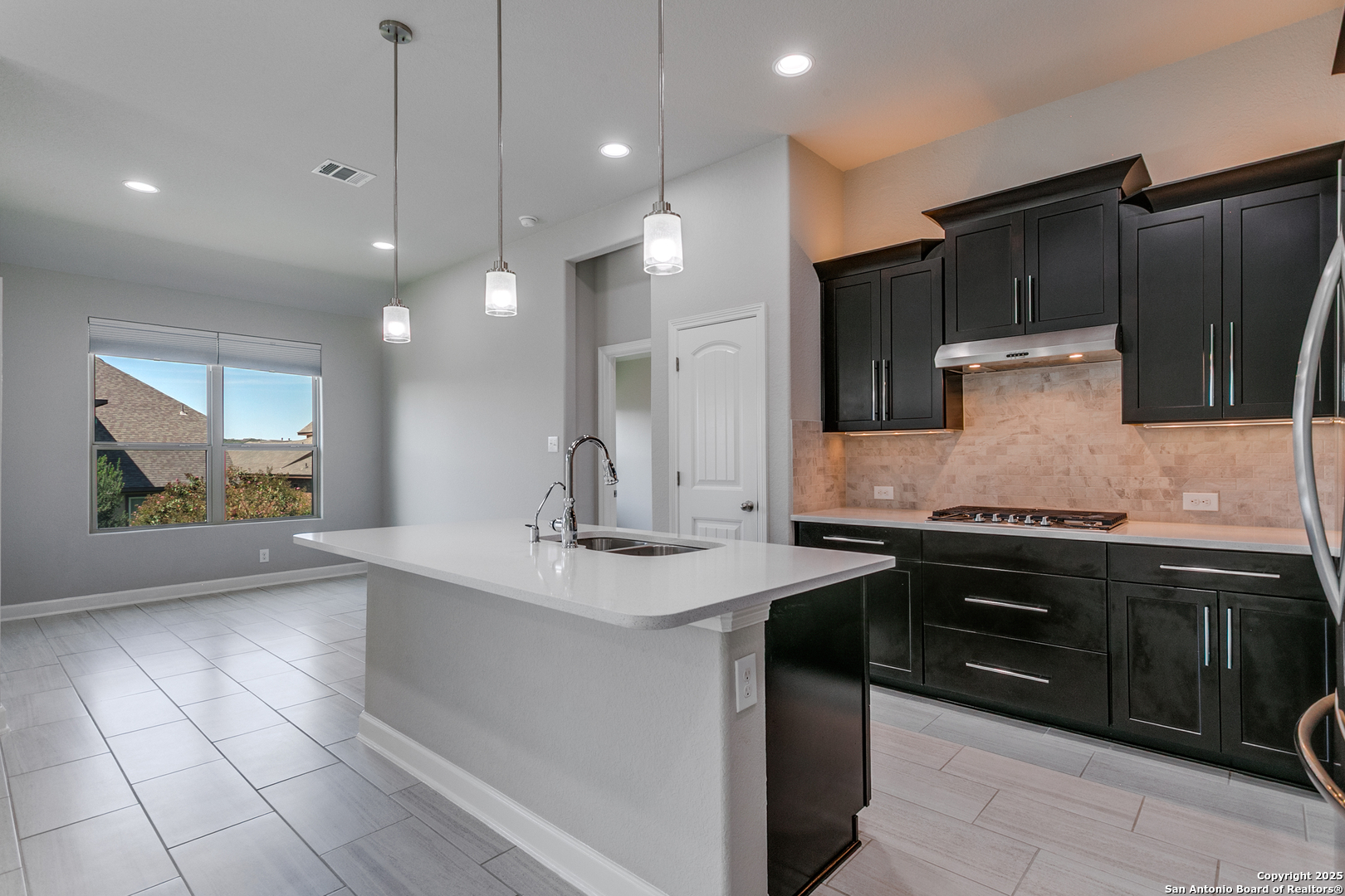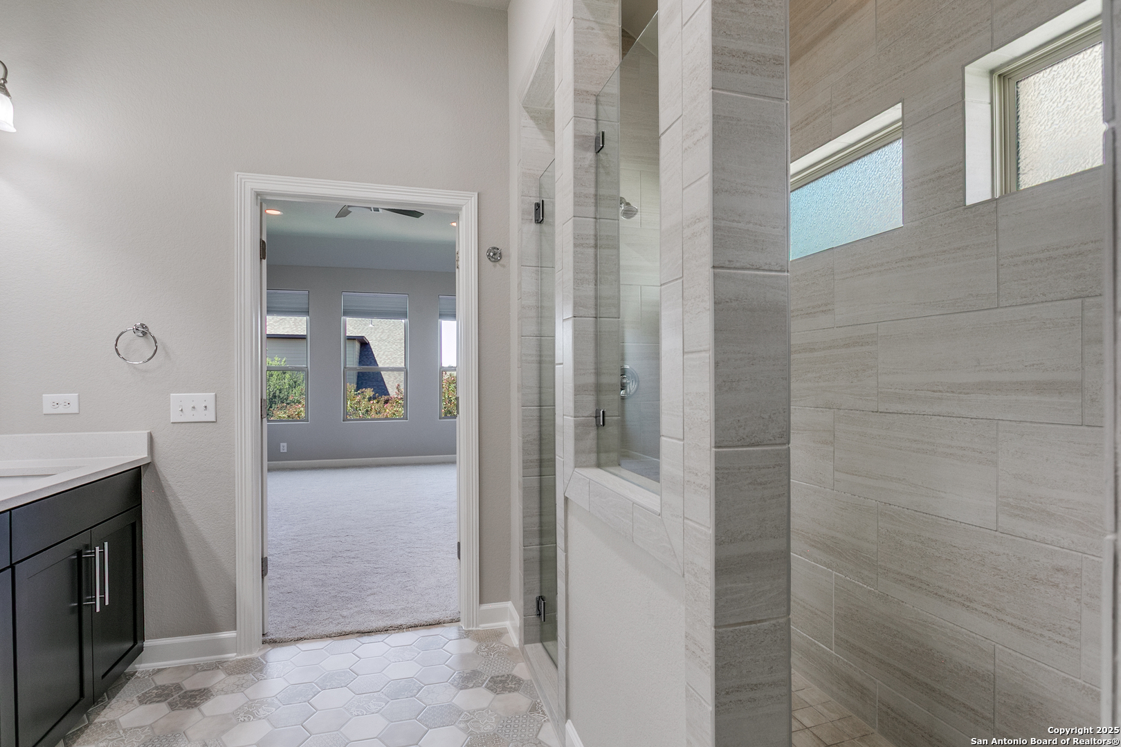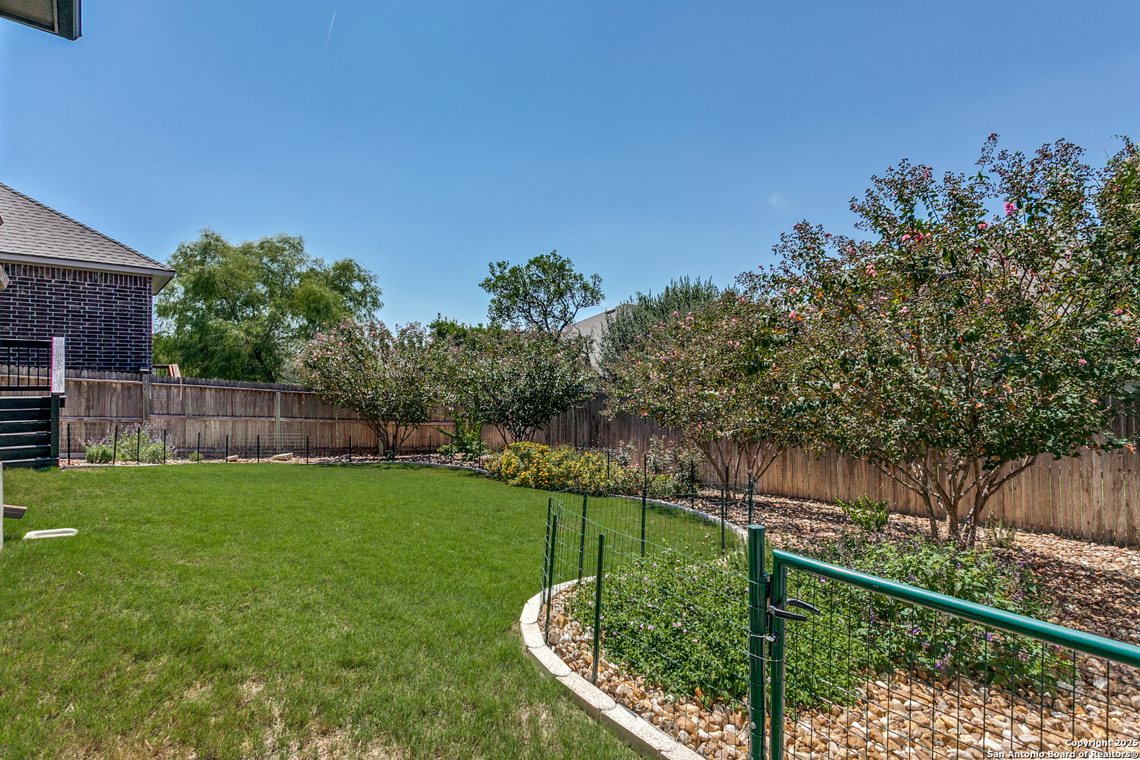 Beautiful Ashton Woods all-brick 1-story offering 1,760 sq.ft. of stylish living space in popular Arcadia Ridge. This thoughtfully designed 3-bedroom, 2-bath home lives better than new, showcasing numerous upgraded designer touches throughout. An inviting entry hallway with large art niches and offset tile floors sets the tone, with brand new carpet only in the bedrooms for added comfort. Custom top-down/bottom up window coverings add both elegance & functionality. The open, airy floor plan is filled with natural light, drawing your eye to the beautifully landscaped backyard from the family room. The gourmet island kitchen is a true centerpiece, complete with gas cooking, sleek solid-surface countertops, an eye-catching tile backsplash, stainless steel appliances (refrigerator included), and abundant cabinetry. The spacious primary suite is a private retreat, featuring a spa-like bath with dual vanities, gorgeous 2-sided entry frameless glass shower with dual shower heads, built-in bench seating, and elegant floor-to-ceiling tile complemented with its lovely designer tiled floor. A generous walk-in closet offers plenty of space for wardrobe needs. Split secondary bedrooms provide privacy and flexibility. Step outside to the covered patio, perfect for entertaining or relaxing while enjoying the lush landscaping and serene evening views. Full sprinkler system, gutters & H2O softener included. Unbeatable location with highly regarded NISD schools, quick access to major highways, shopping, dining, employment centers, and Lackland AFB.