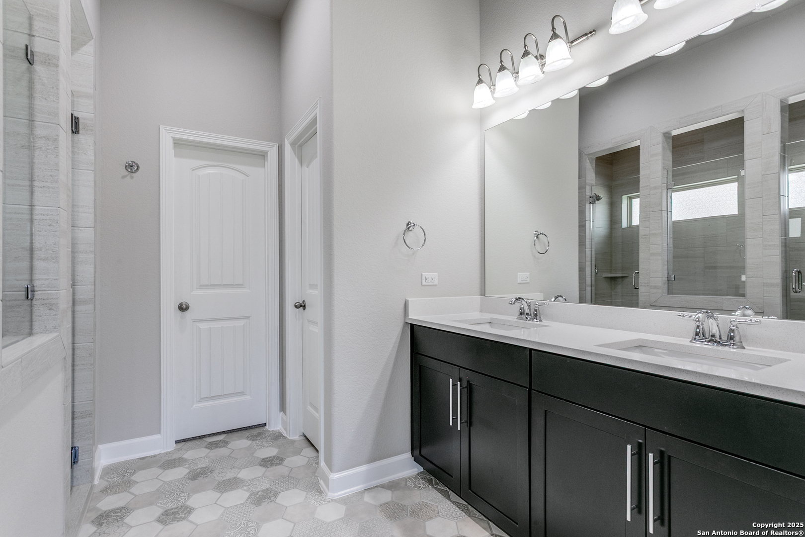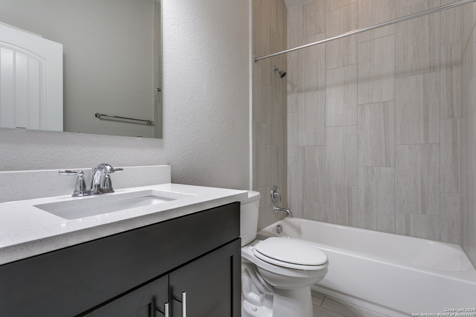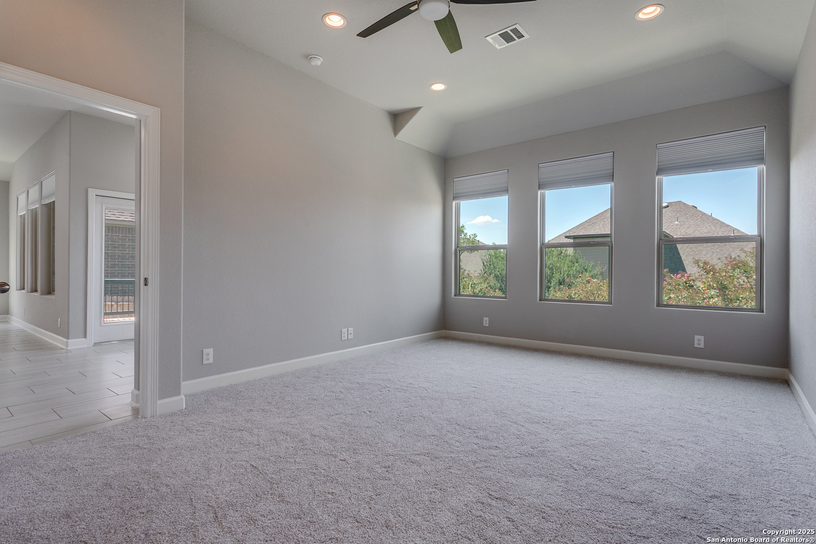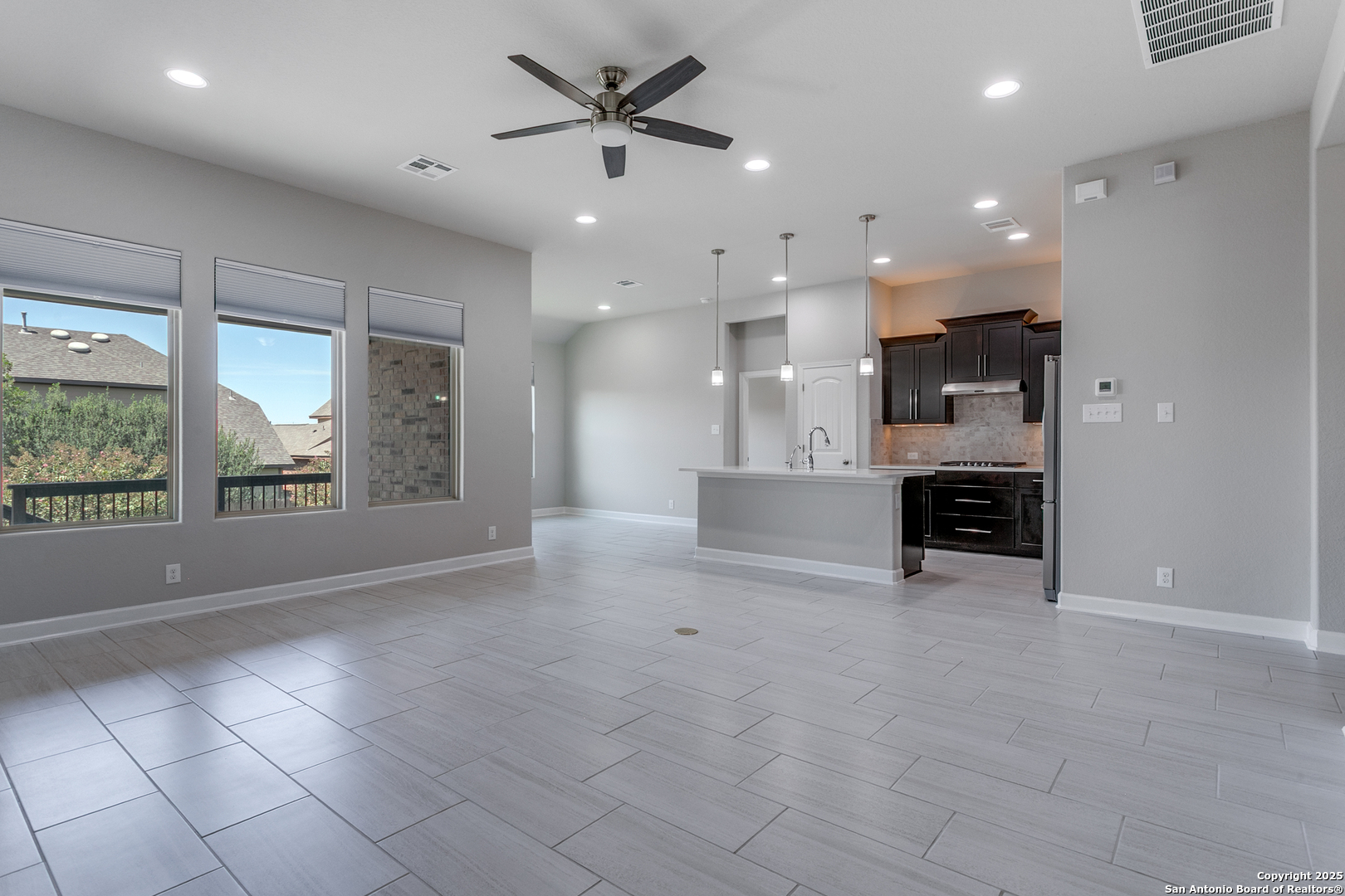 Beautiful Ashton Woods all-brick 1-story offering 1,760 sq.ft. of stylish living space in popular Arcadia Ridge. This thoughtfully designed 3-bedroom, 2-bath home lives better than new, showcasing numerous upgraded designer touches throughout. An inviting entry hallway with large art niches and offset tile floors sets the tone, with brand new carpet only in the bedrooms for added comfort. Custom top-down/bottom up window coverings add both elegance & functionality. The open, airy floor plan is filled with natural light, drawing your eye to the beautifully landscaped backyard from the family room. The gourmet island kitchen is a true centerpiece, complete with gas cooking, sleek solid-surface countertops, an eye-catching tile backsplash, stainless steel appliances (refrigerator included), and abundant cabinetry. The spacious primary suite is a private retreat, featuring a spa-like bath with dual vanities, gorgeous 2-sided entry frameless glass shower with dual shower heads, built-in bench seating, and elegant floor-to-ceiling tile complemented with its lovely designer tiled floor. A generous walk-in closet offers plenty of space for wardrobe needs. Split secondary bedrooms provide privacy and flexibility. Step outside to the covered patio, perfect for entertaining or relaxing while enjoying the lush landscaping and serene evening views. Full sprinkler system, gutters & H2O softener included. Unbeatable location with highly regarded NISD schools, quick access to major highways, shopping, dining, employment centers, and Lackland AFB.