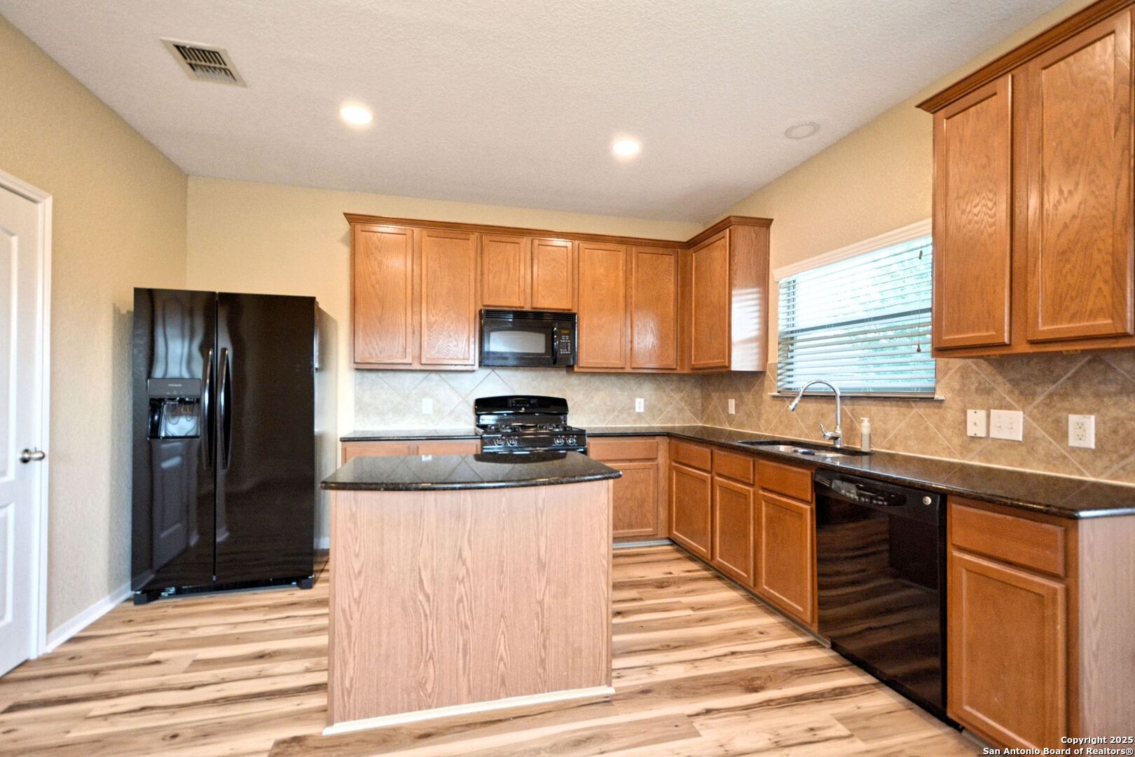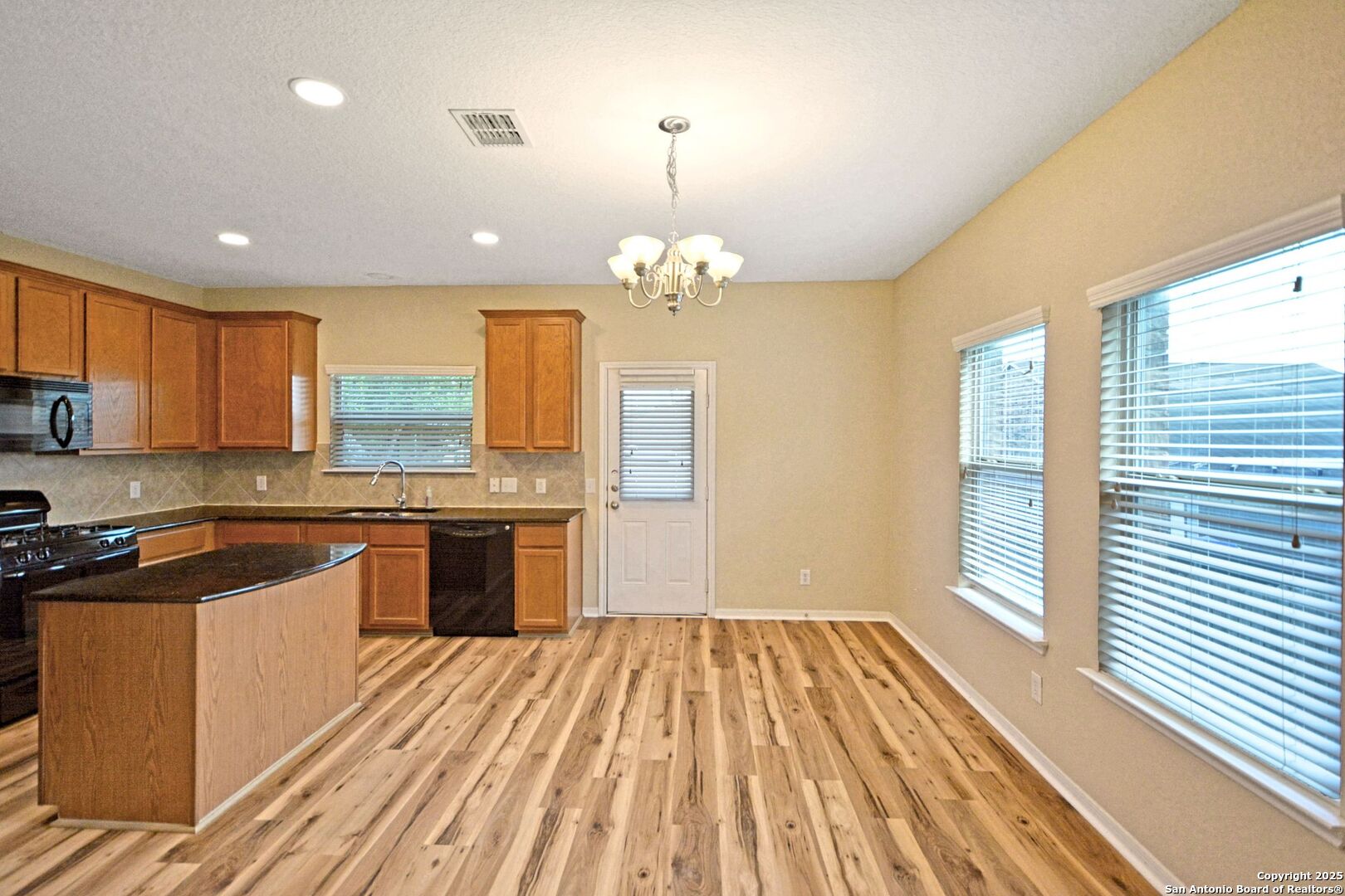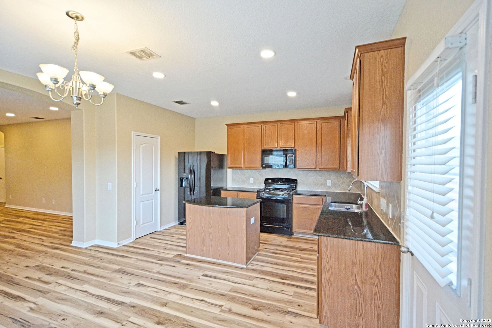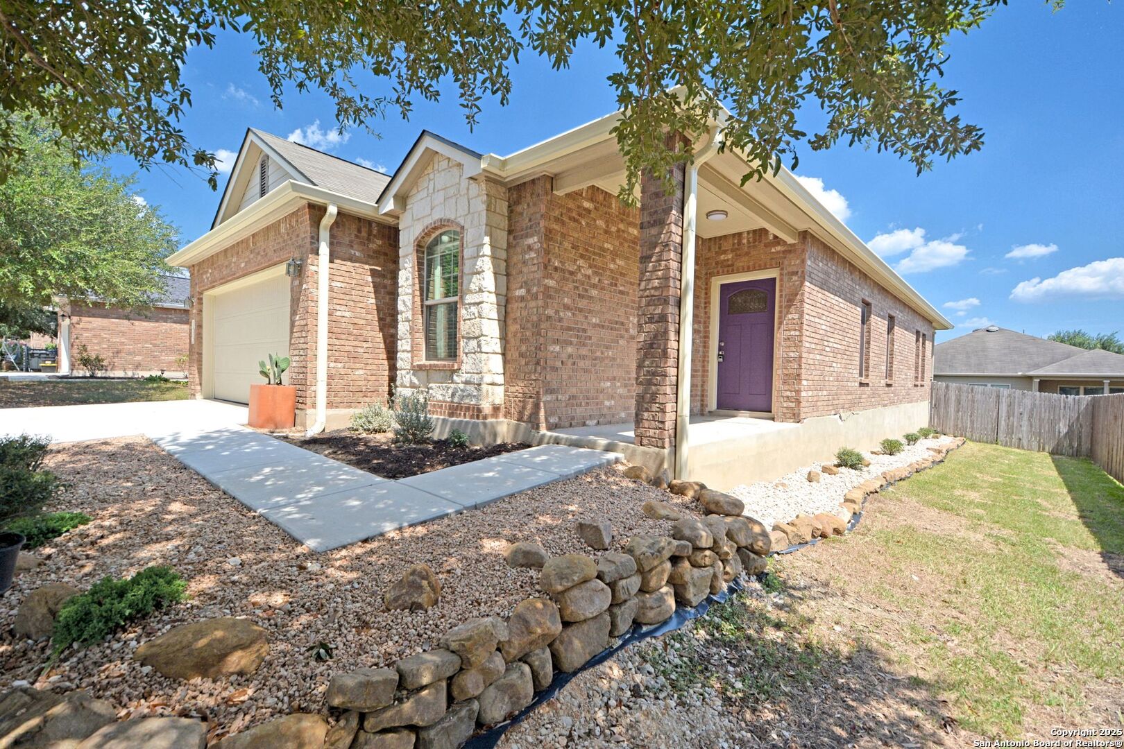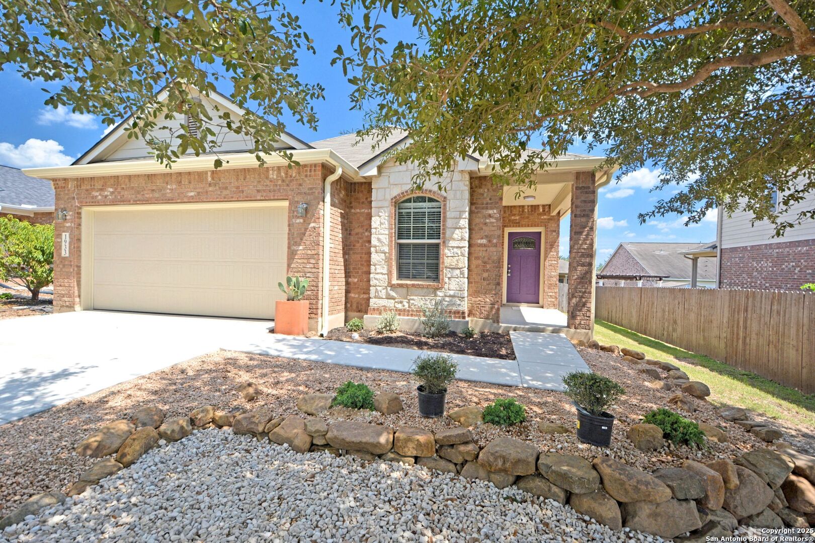 Witness this stylish 3 bed/2 bath stone veneer home with a well shaded front yard that is thoughtfully xeriscaped. Enter into the spacious living room arched entryways and wood-style vinyl flooring that guides you to each room. The island kitchen features dark granite countertops, pantry, and dining area. Check out the primary bedroom with bay windows. Melt your cares away in the primary bathroom suite with garden tub, tiled stand-up shower, and dual sinks. Kick off your shoes and relax underneath the covered porch overlooking the private backyard.