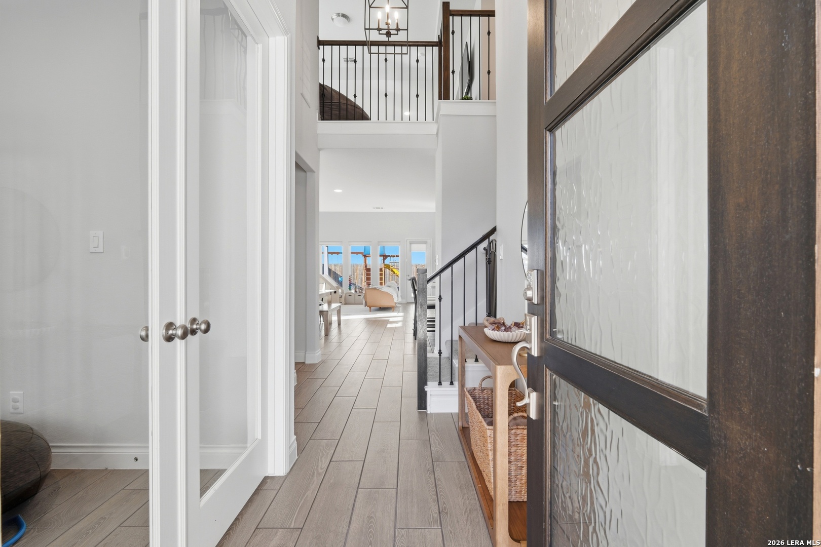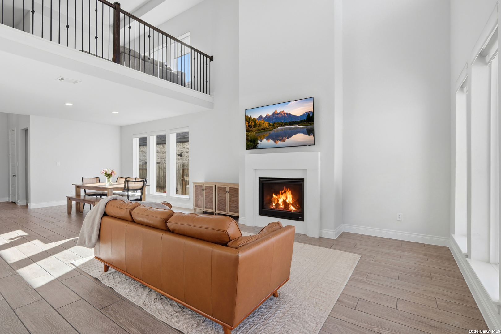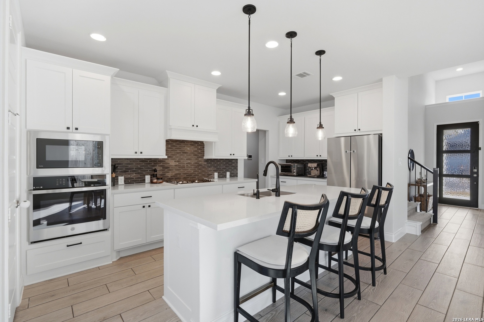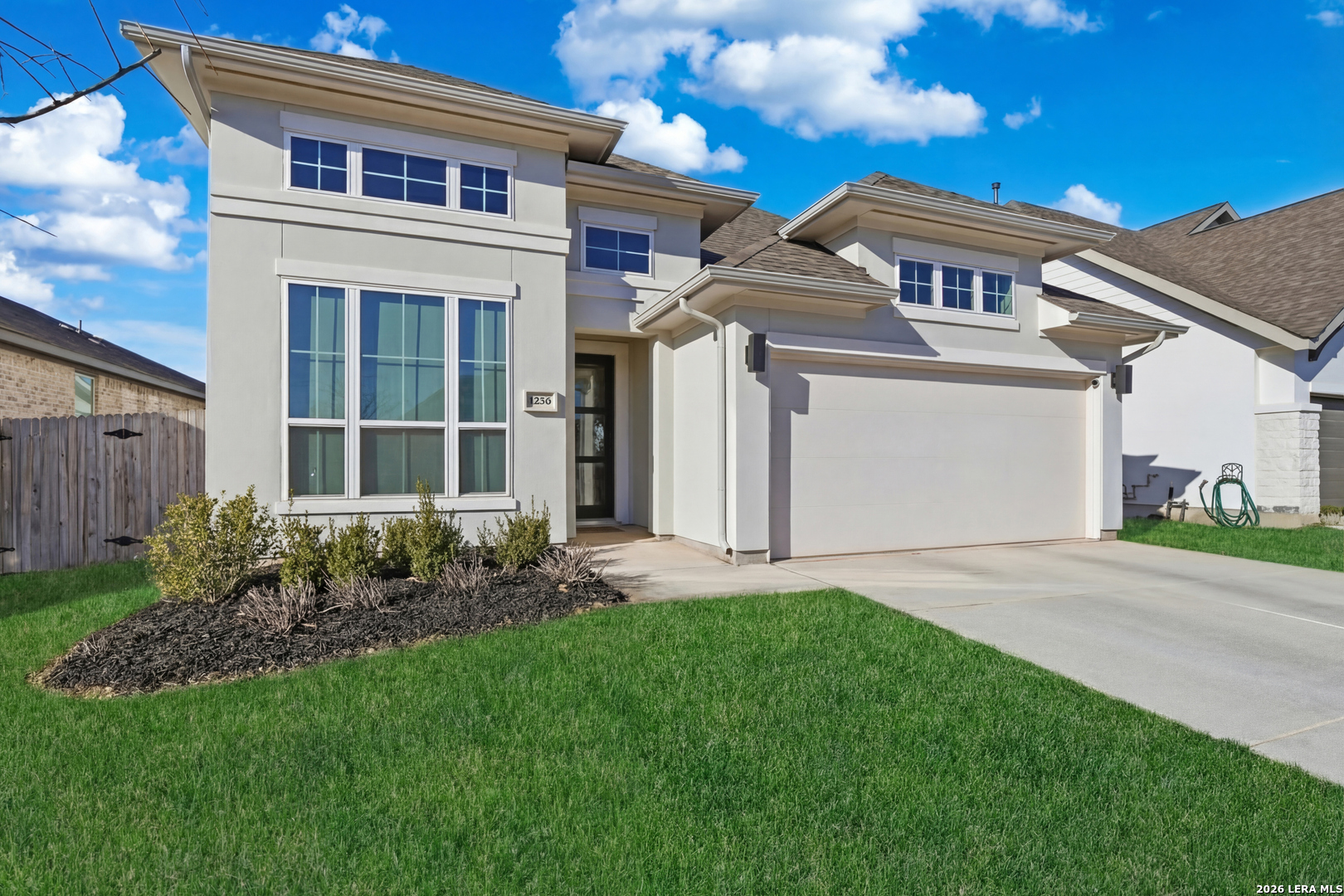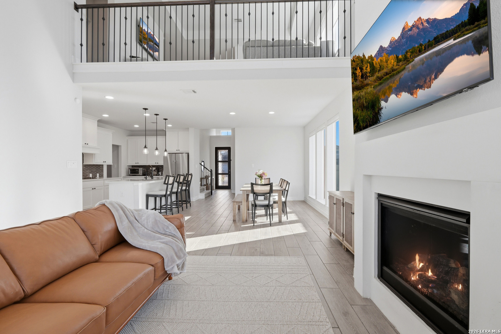 Perfectly located just minutes from New Braunfels and Lake McQueeney, and zoned to the highly desirable Navarro ISD, this stunning home offers the best of location, luxury, and value. Completed in December 2022, this recently built home gives you everything you'd want in new construction, at a fraction of the price, with all major components practically brand new. As you arrive, you're immediately welcomed by a beautiful stucco exterior that extends to all four sides, a rare and valuable upgrade in today's new builds. Step inside and prepare to be impressed by soaring 20-foot ceilings and upgraded tile flooring throughout the entire first floor, setting the tone for the elevated design throughout. To your immediate left, you'll find a versatile office/game room flex space with elegant double doors, perfect for working from home or creating a private retreat. Just beyond is the spacious laundry room. The exposed stair railing and open catwalk above add a modern architectural touch that enhances the home's open-concept feel. The kitchen is truly a chef's dream! Featuring abundant quartz countertop space, ample cabinetry, built-in appliances that elevate the design, a 4-burner gas cooktop, and an incredible walk-in pantry. This space was made for entertaining and everyday living. The dining area sits just off the kitchen, surrounded by beautiful windows that flood the space with natural light. The living room is nothing short of breathtaking, highlighted by 20-foot ceilings, an abundance of windows, and a built-in electric fireplace that creates the perfect focal point. For added convenience and comfort, windows in the living room and dining area include electric blinds. The primary suite is privately located on the first floor and generously sized. The spa-like primary bathroom features a separate soaking tub, walk-in shower, dual vanities, and one of the best features, separate his and hers walk-in closets. Also on the first floor is a secondary bedroom with a full bathroom, making it ideal for a mother-in-law suite or a private guest room. Upstairs, you'll find an expansive loft overlooking the main living area, along with two additional generously sized bedrooms that share a full bathroom, offering plenty of space for family or guests. Step outside to enjoy a spacious backyard with an extended covered patio complete with a gas line ready for hosting BBQs and gatherings. With no back neighbors, you'll enjoy added privacy and peaceful views. To top it off, the home includes a water softener system and reverse osmosis system, already installed and ready to go. This home truly checks every box. Don't miss your opportunity to see it before it's gone!