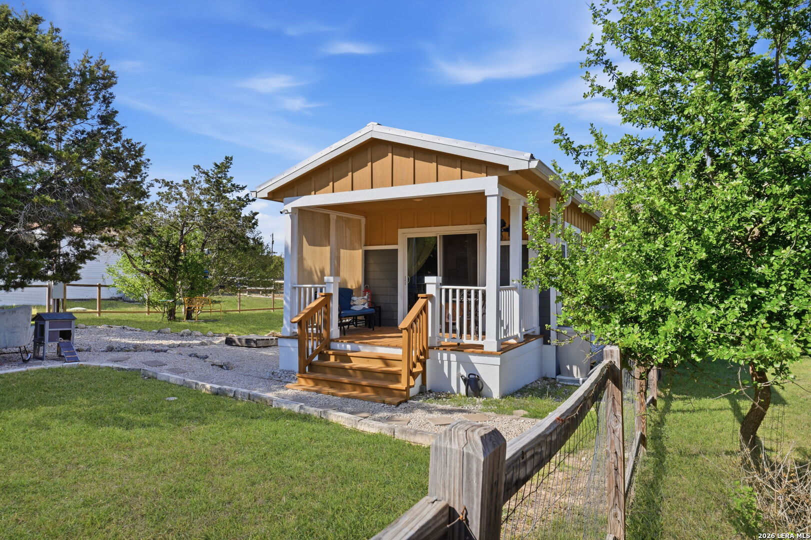 Charming and truly one-of-a-kind Hill Country retreat on nearly half an acre! This well-maintained 2017, 1-bedroom, 1-bath single wide home offers 620 sq ft of efficient living space plus a welcoming front porch perfect for relaxing and enjoying the peaceful setting. The property is packed with incredible features for those seeking a self-sufficient or hobby-focused lifestyle. Enjoy a fenced garden area, 8x8 greenhouse, air-conditioned chicken coop, and multiple outbuildings including a 10x20 workshop with electricity and a 12x8 storage shed. Unwind in your private sauna or take advantage of the 12x20 RV carport. Also included is a 2015 1-bedroom, 1-bath travel trailer is included-ideal for guests, rental potential, or additional living space. The .46-acre lot is thoughtfully laid out with three gated entry points, offering flexibility, privacy, and convenience. Whether you're looking for a weekend getaway, full-time residence, or investment opportunity, this unique property delivers versatility and charm.