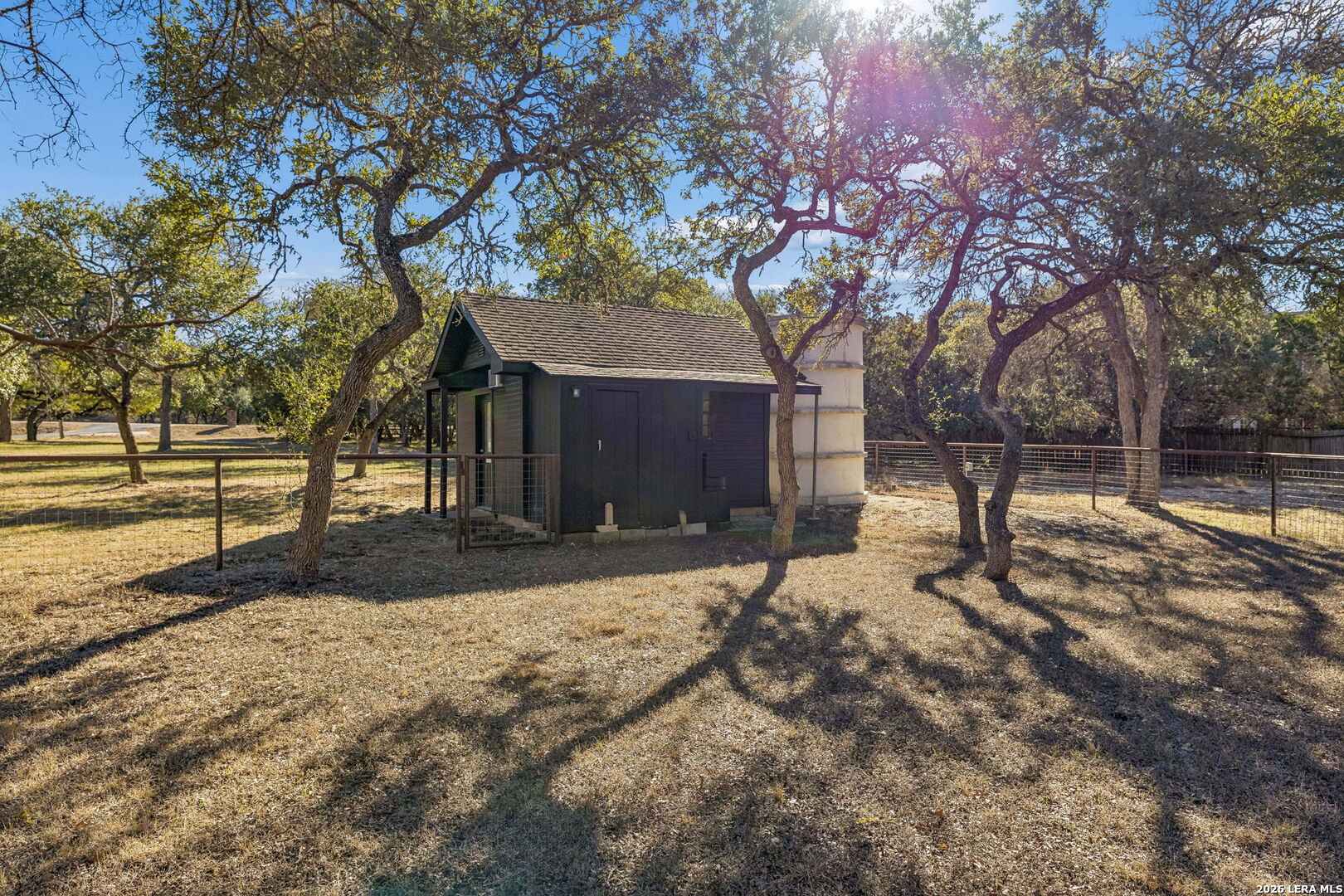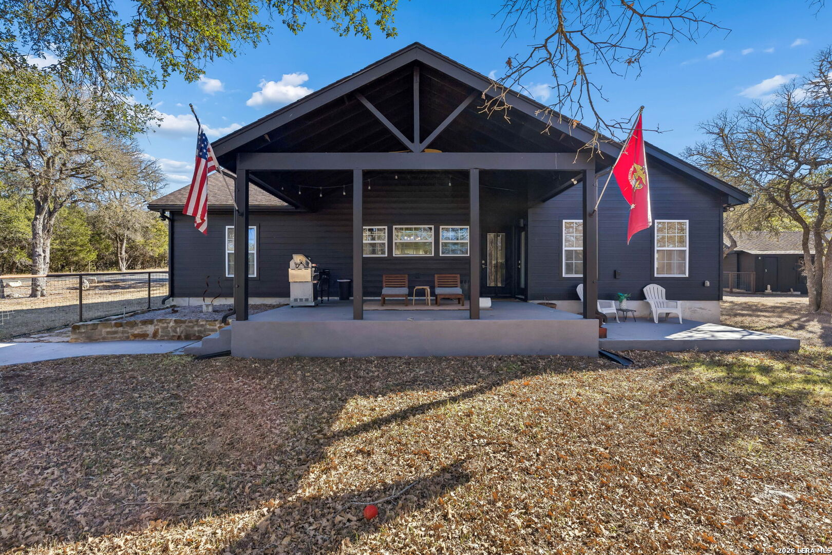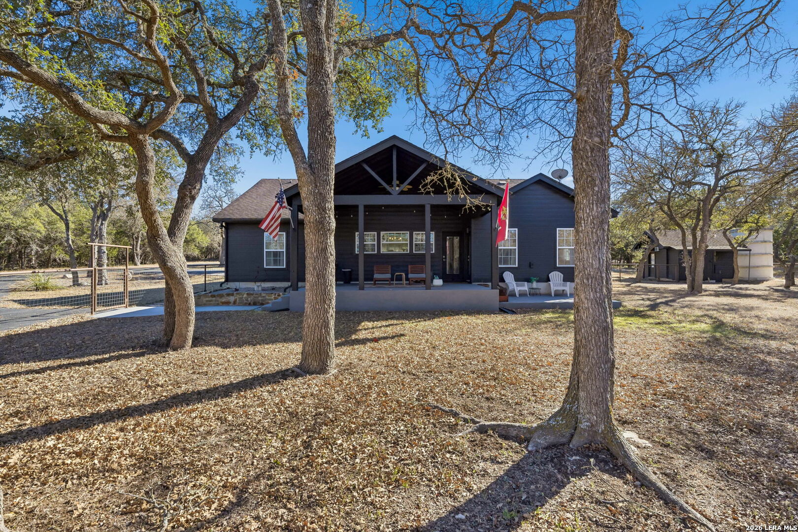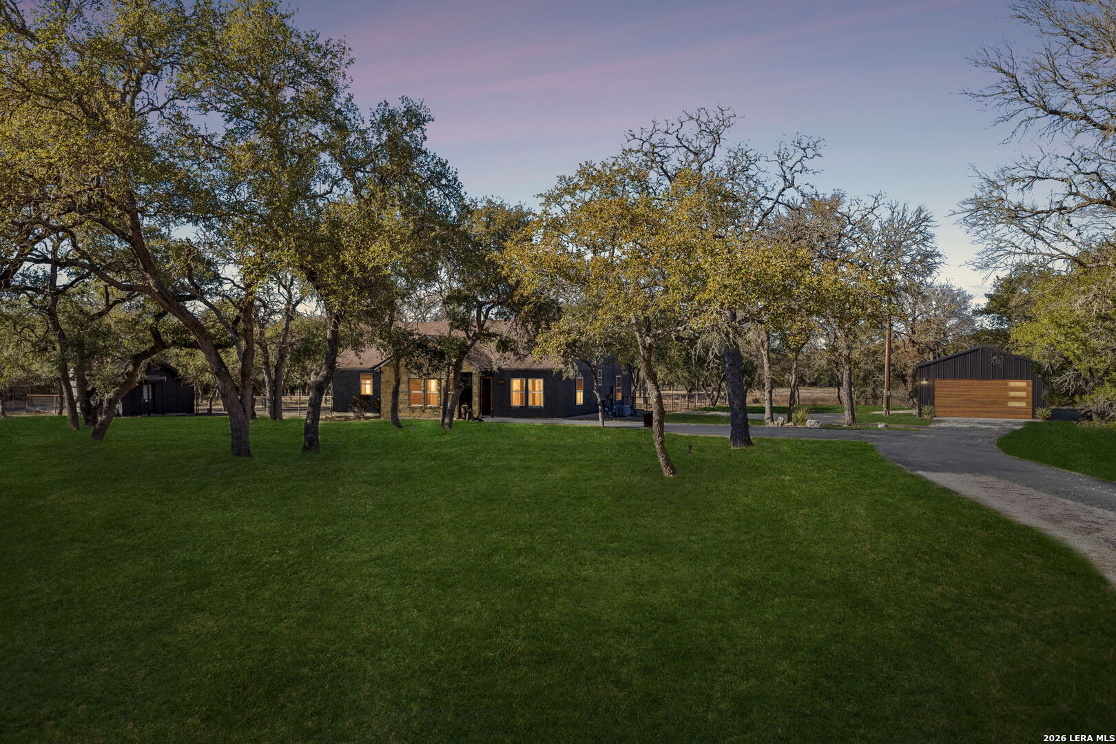 Tucked away on 5+ private acres in Cypress Springs, this tranquil Hill Country retreat offers rare freedom, thoughtful infrastructure, and everyday comfort. Mature oaks, open country views, and a peaceful setting just minutes from shopping, restaurants, and Hwy 281. The single story home features 3 bedrooms, 2 baths, an oversized island kitchen, and a steam shower in the primary suite. Step outside to the covered patio and firepit and enjoy quiet evenings under the stars. This property truly stands apart because of the infrastructure already in place. Expansive 4+ car detached oversized garage and workshop wired for 220V. Auxiliary dual fuel generator professionally wired for power outages. Dedicated RV parking with 50 amp hookup. Separate RV septic plus an independent home septic system. A 3,400 gallon cistern. 220V wiring suitable for a future outdoor hot tub. Bring the horses. Livestock is allowed at one per acre and there is already a paddock in place. Owners enjoy river access and RV park access for residents and guests. ADUs are permitted with approval and must be site built, making multigenerational living possible. No current short term rental restrictions. Subdivision is not allowed, preserving privacy and acreage integrity. Private acreage. Mature trees. Seasonal creek. Real usable land with real infrastructure already done. Opportunities like this do not come around often.