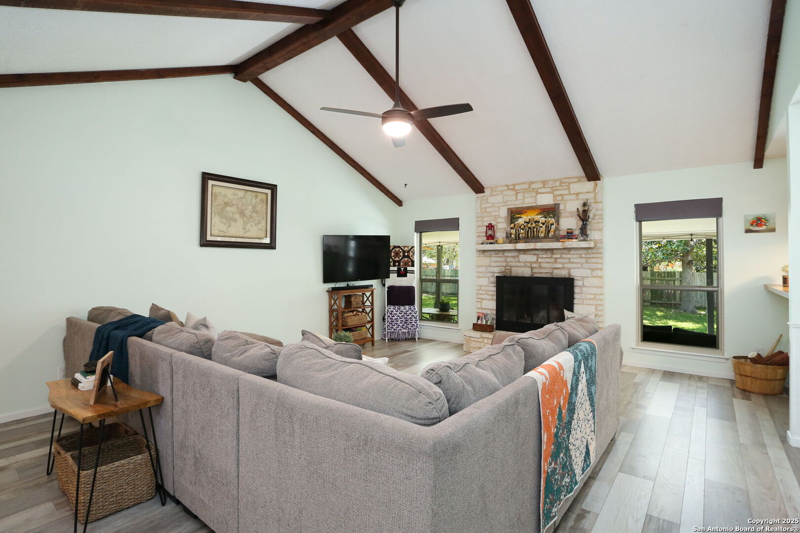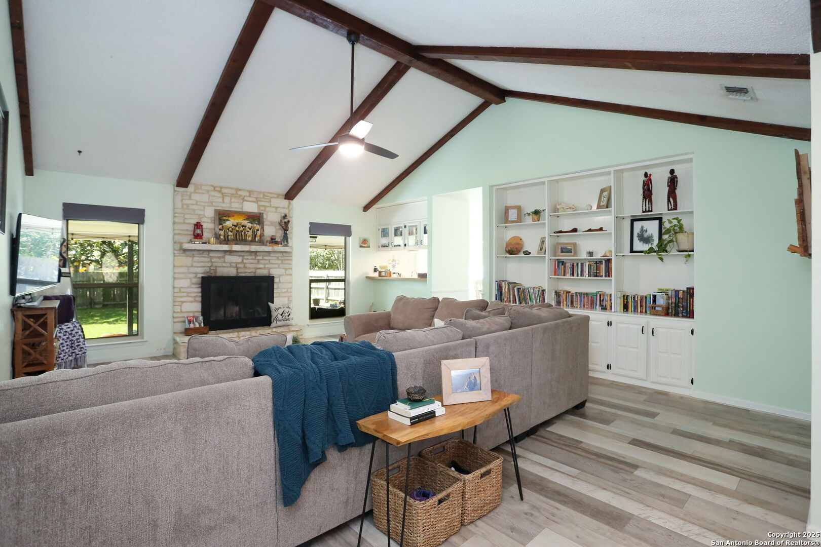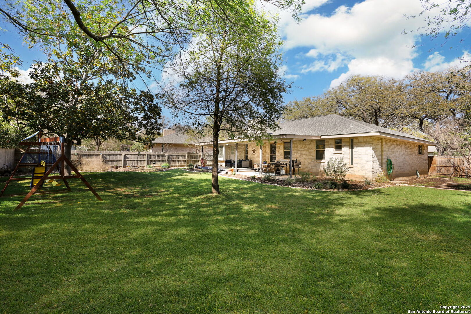 Nestled in the heart of the Encino Park community, this beautifully updated 3-bedroom, 2-bath home offers 1967 sq ft. of stylish living space on a spacious .28-acre lot. Attractive rock exterior on 4 sides and recently upgraded windows allow this home to be loaded with natural light while enhancing energy efficiency. The inviting kitchen and family room are the best for family gatherings. In the cooler months enjoy get-togethers by the cozy fireplace. With so many wonderfully warm days, you'll spend many an evening under the spacious outdoor patio area relaxing under the Texas stars. The modernized master bath is a luxurious retreat, featuring contemporary finishes and a spa-like ambiance. This home improvement was completed in 2022. Step outside to a kid friendly backyard, a safe and spacious haven perfect for playtime, family gatherings, or simply relaxing. With its open floor plan, inviting living areas, and updated features, this home offers the perfect blend of comfort and functionality. Located in the north central area of the city with access to top NEISD schools and community amenities, it's an ideal choice for those seeking both convenience and charm. Additional perks: Roof replaced less than 5 years ago with warranty through 2035. Window warranty through 2033, Dishwasher and water heater replaced, 2024. Don't miss your chance to make this updated gem your forever home-schedule a tour today!