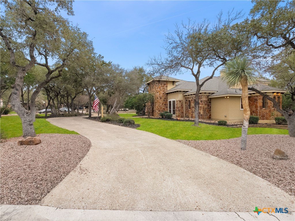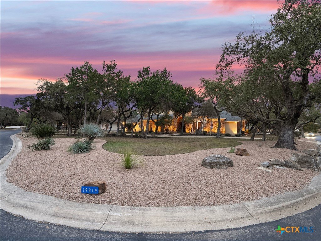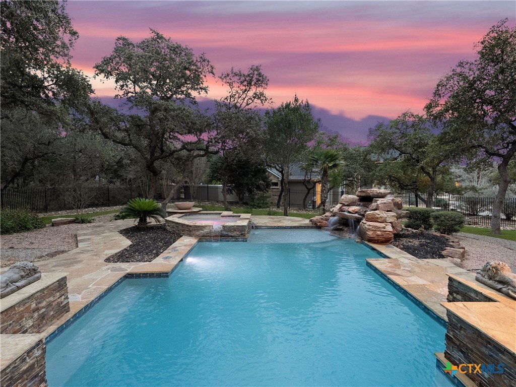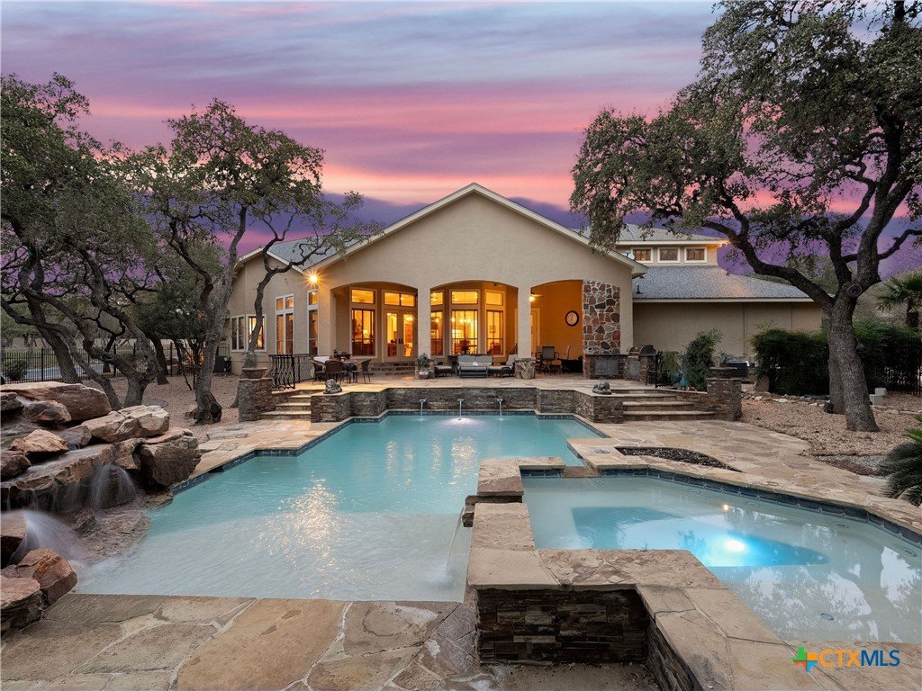 Custom built by Craftman and remodeled by Pencsak, this exceptional estate blends timeless craftsmanship with thoughtful modern updates in the highly sought-after Wild Wind community of Garden Ridge. Positioned on a spacious corner lot surrounded by mature trees and lush landscaping, the property offers privacy, scale, and enduring architectural appeal. The interior showcases expansive living spaces with 24x24 travertine flooring throughout the common areas, complemented by new hardwood floors in all main-level bedrooms and closets. Distinctive features include 8-foot solid wood interior doors on the main level, custom wood slat blinds, and multiple gas and wood-burning fireplaces that enhance both comfort and character. The primary suite has been beautifully updated, featuring a fully remodeled spa-style bath and a custom walk-in closet by Michael Edwards. Designed for seamless indoor-outdoor living, the backyard is a true retreat with a custom swimming pool, heated spa, and waterfall feature. Outdoor lighting, fireplaces, and custom cast-iron fencing create an inviting environment ideal for entertaining or quiet evenings at home. The main floor includes the primary suite, a dedicated office, and two guest bedrooms, each with its own ensuite bath, while the second level offers an additional guest suite with private bath and a versatile multi-use craft or storage space. Meticulously maintained, this Craftman built and Pencsak remodeled residence delivers the quality, comfort, and presence of a newly constructed home within an established neighborhood.