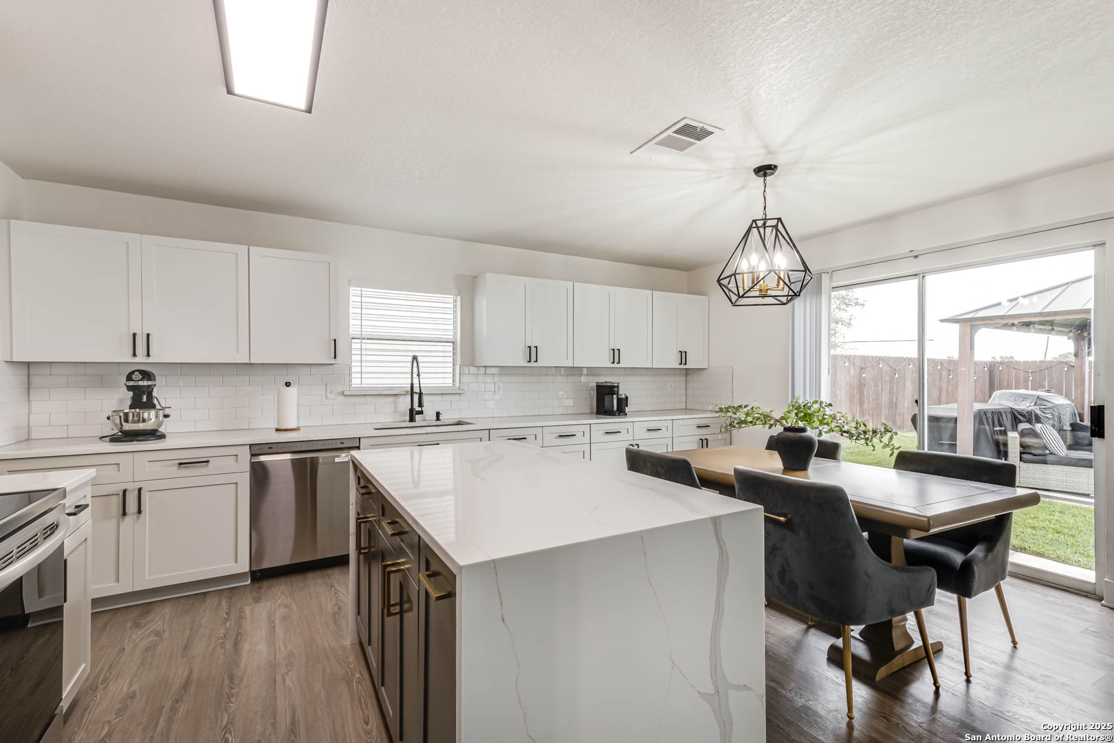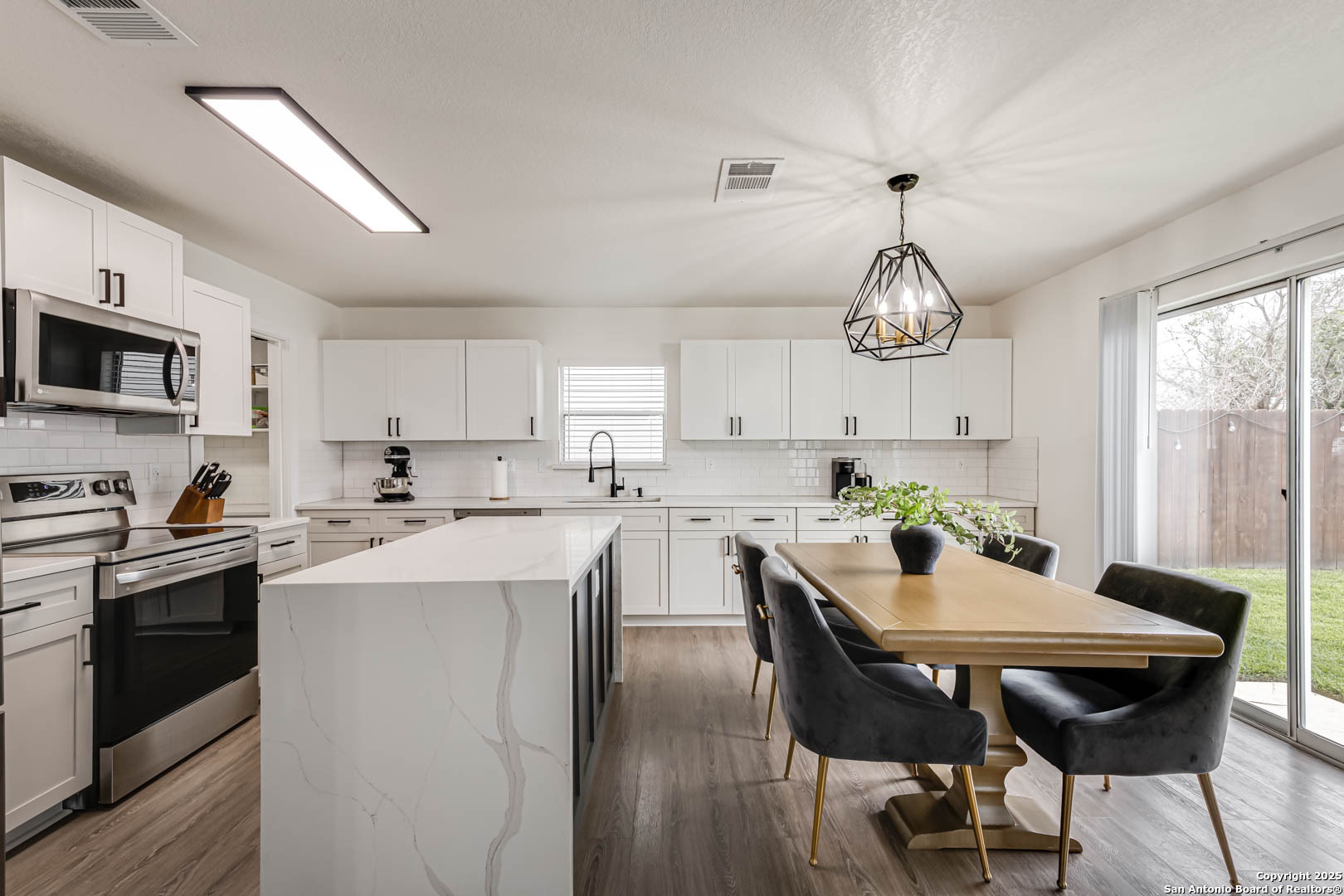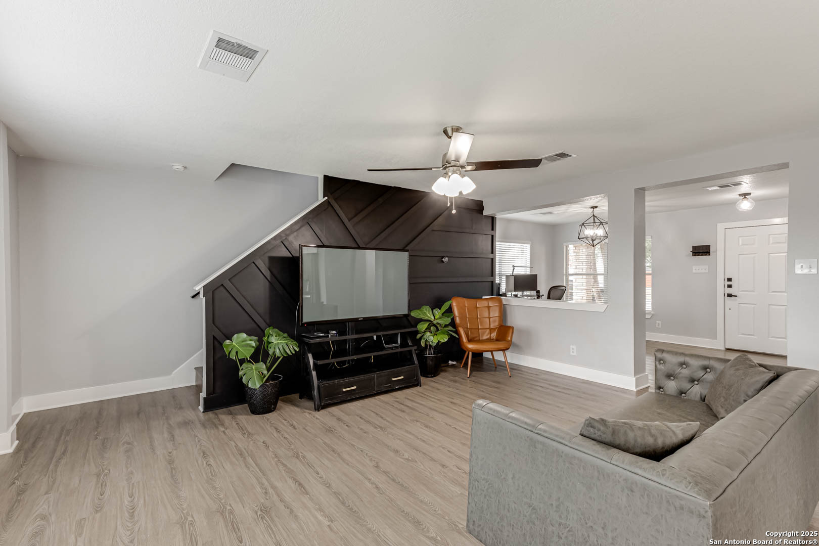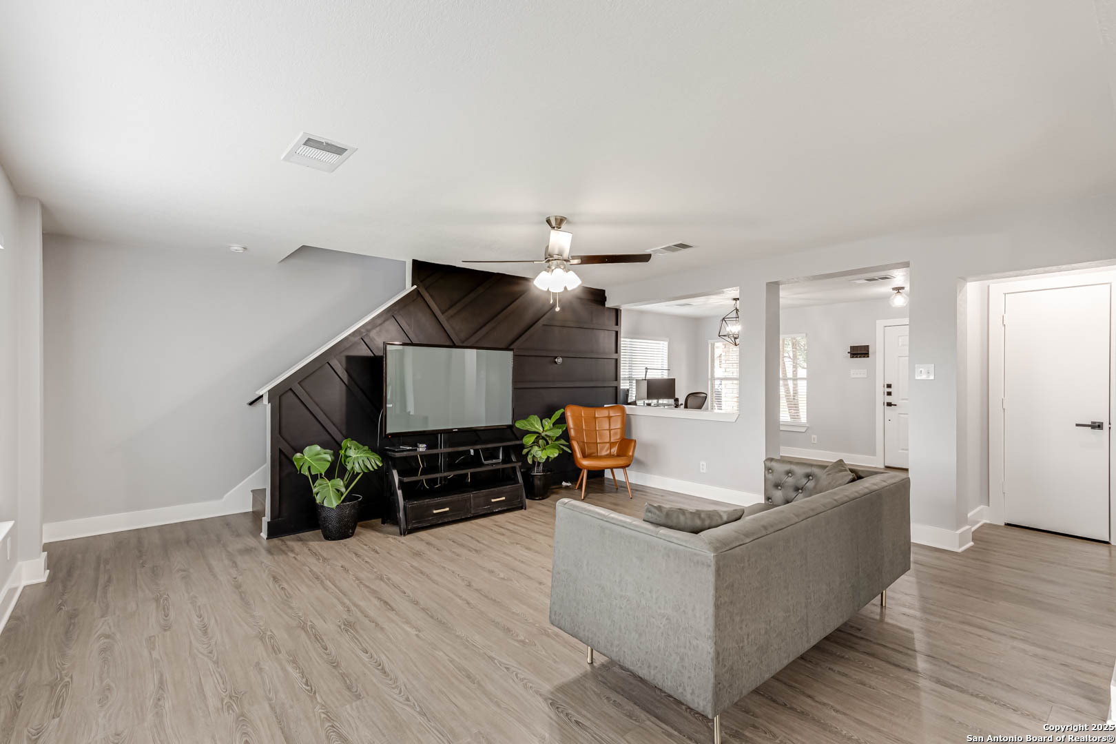 Step into this beautifully remodeled modern dream home offering 3 bedrooms, 2.5 bathrooms, and a 2-car garage. Centrally located off Thousand Oaks, this home offers convenient access to grocery stores, popular restaurants, and a great school district -making everyday living a breeze. The neighborhood has private access to McAllister Park as well. Inside, you'll find luxury vinyl plank flooring throughout, fresh interior paint, upgraded trim, and designer light fixtures that bring a stylish and cohesive feel to every room. The fully renovated kitchen is the centerpiece of the home, featuring a stunning marble waterfall island that perfectly blends elegance and functionality. Enjoy multiple living spaces ideal for both entertaining and everyday living, including a spacious family room and a flexible additional area perfect for a home office. The oversized laundry room with an attached walk-in pantry adds practicality and storage. Beautiful accent walls throughout the home add character and charm. Upstairs, all bedrooms are thoughtfully tucked away alongside a generous game room. The oversized primary suite includes an en suite bathroom with a sleek double vanity, tub/shower combo, and a large walk-in closet. Outside, relax under the pergola or gather around the fire pit with friends and family-ideal for weekend barbecues or quiet evenings under the stars. This move-in-ready home combines modern updates, functional spaces, and a prime location to deliver the full package.