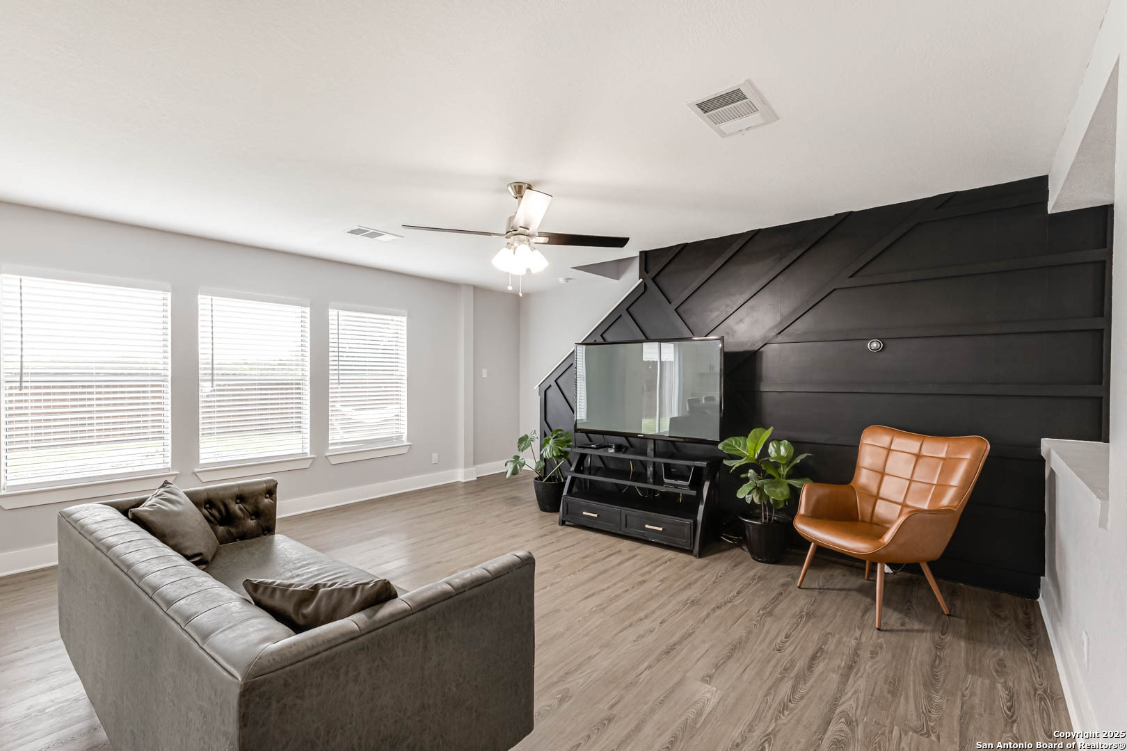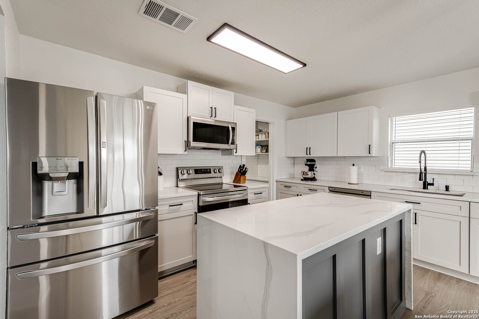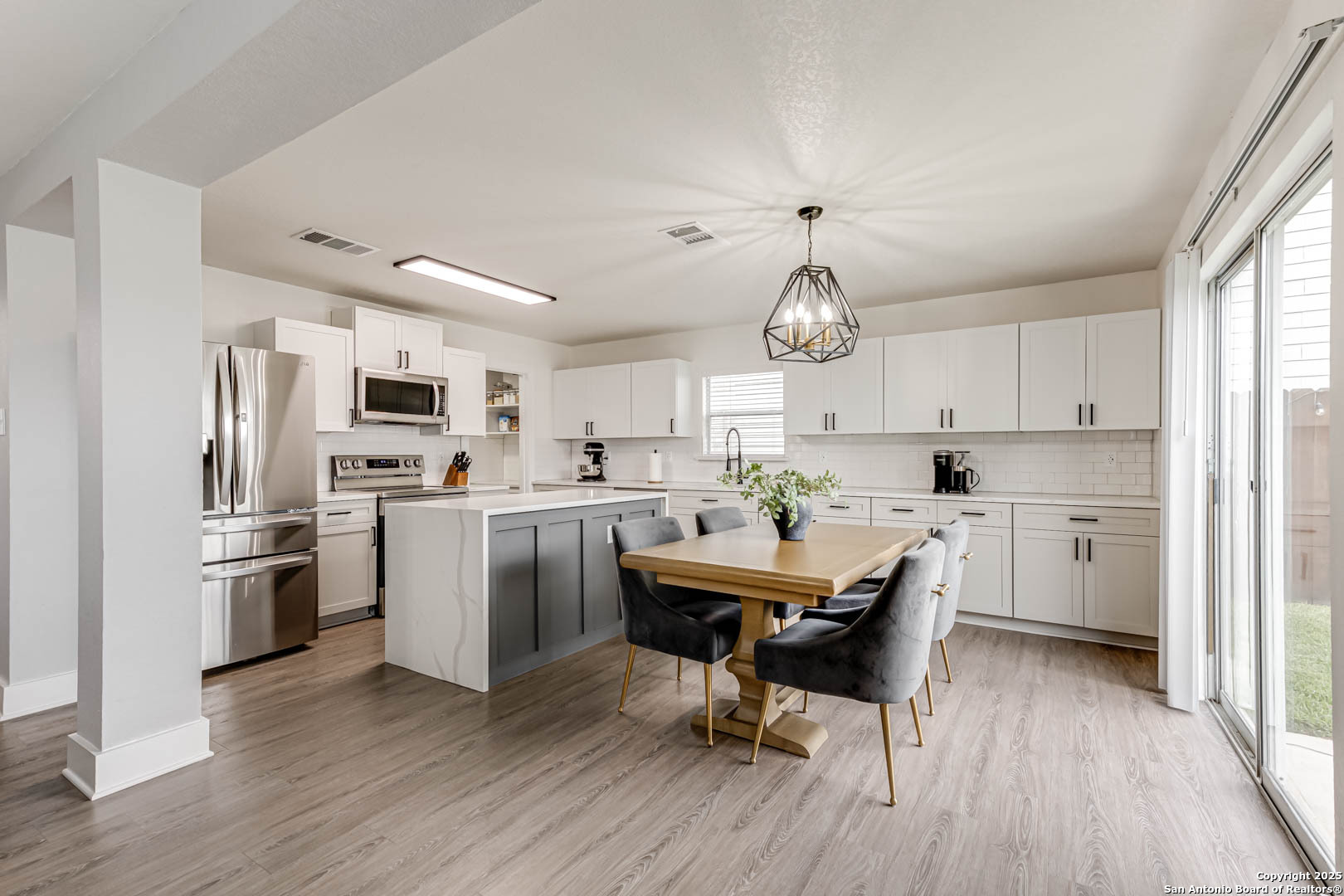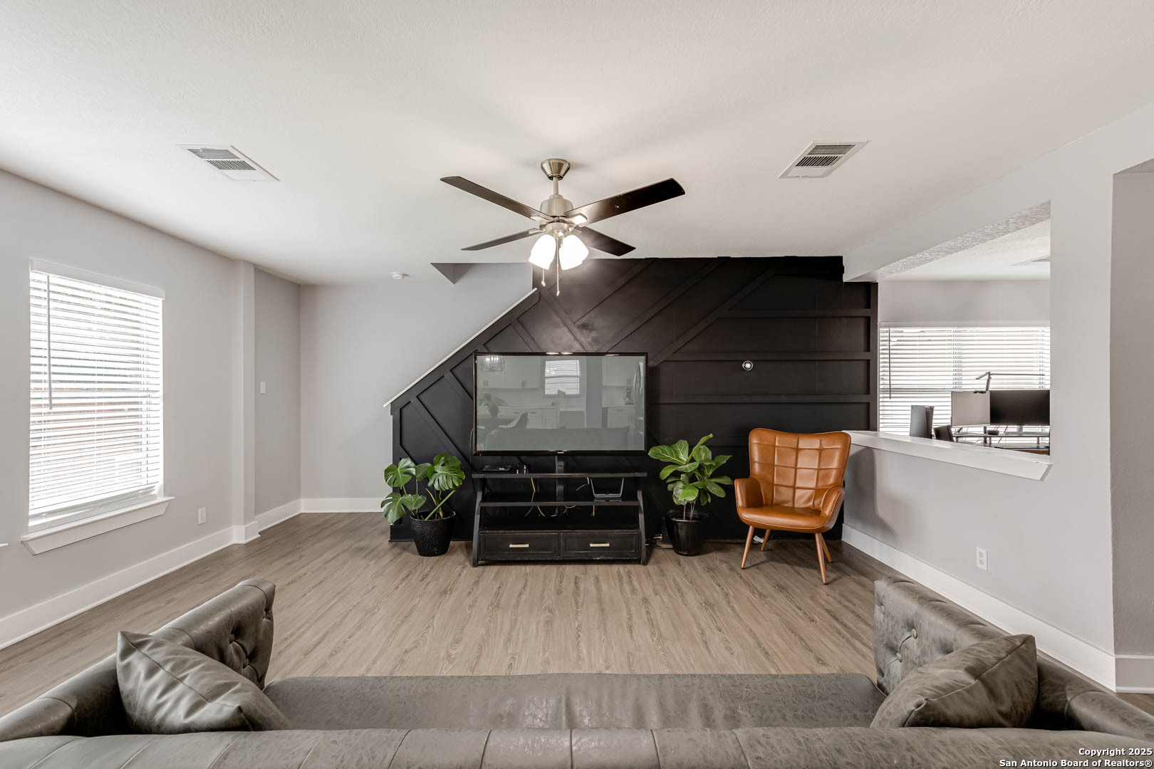 Step into this beautifully remodeled modern dream home offering 3 bedrooms, 2.5 bathrooms, and a 2-car garage. Centrally located off Thousand Oaks, this home offers convenient access to grocery stores, popular restaurants, and a great school district -making everyday living a breeze. The neighborhood has private access to McAllister Park as well. Inside, you'll find luxury vinyl plank flooring throughout, fresh interior paint, upgraded trim, and designer light fixtures that bring a stylish and cohesive feel to every room. The fully renovated kitchen is the centerpiece of the home, featuring a stunning marble waterfall island that perfectly blends elegance and functionality. Enjoy multiple living spaces ideal for both entertaining and everyday living, including a spacious family room and a flexible additional area perfect for a home office. The oversized laundry room with an attached walk-in pantry adds practicality and storage. Beautiful accent walls throughout the home add character and charm. Upstairs, all bedrooms are thoughtfully tucked away alongside a generous game room. The oversized primary suite includes an en suite bathroom with a sleek double vanity, tub/shower combo, and a large walk-in closet. Outside, relax under the pergola or gather around the fire pit with friends and family-ideal for weekend barbecues or quiet evenings under the stars. This move-in-ready home combines modern updates, functional spaces, and a prime location to deliver the full package.