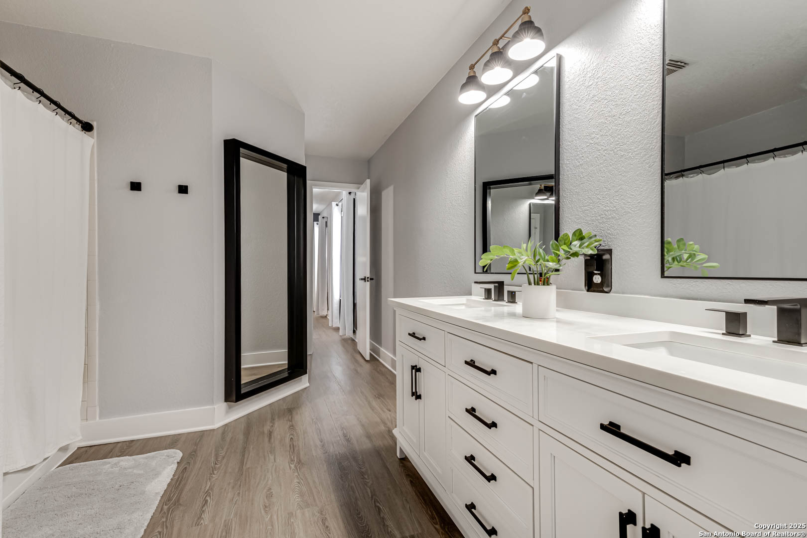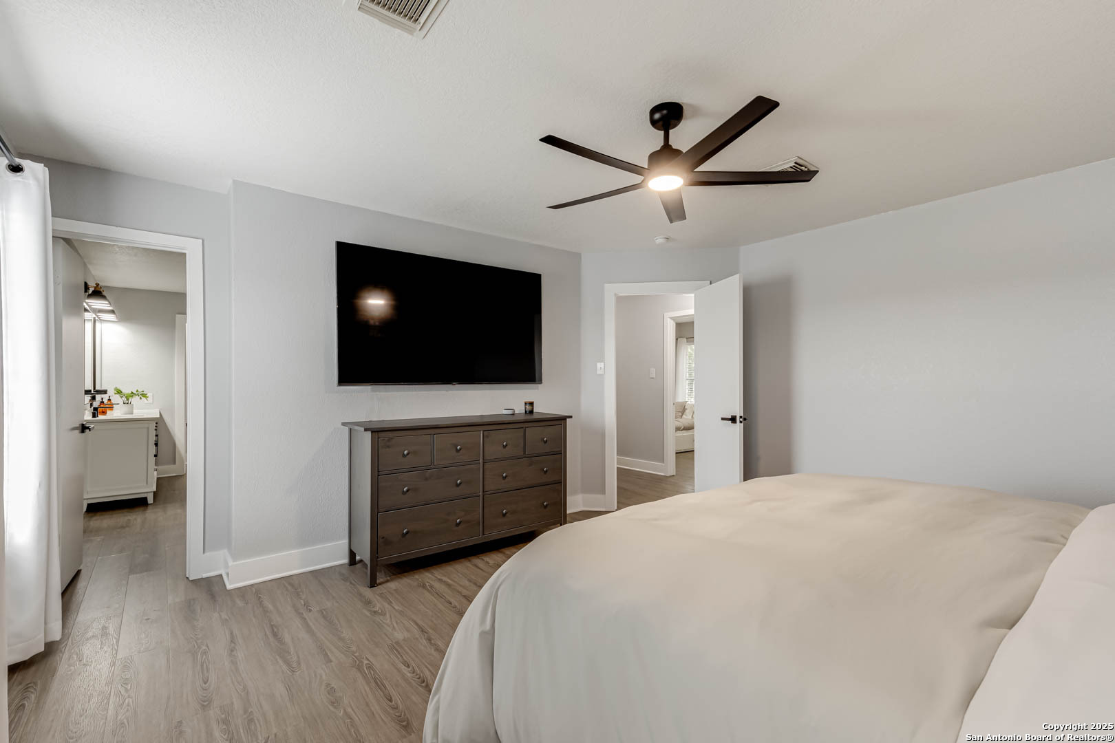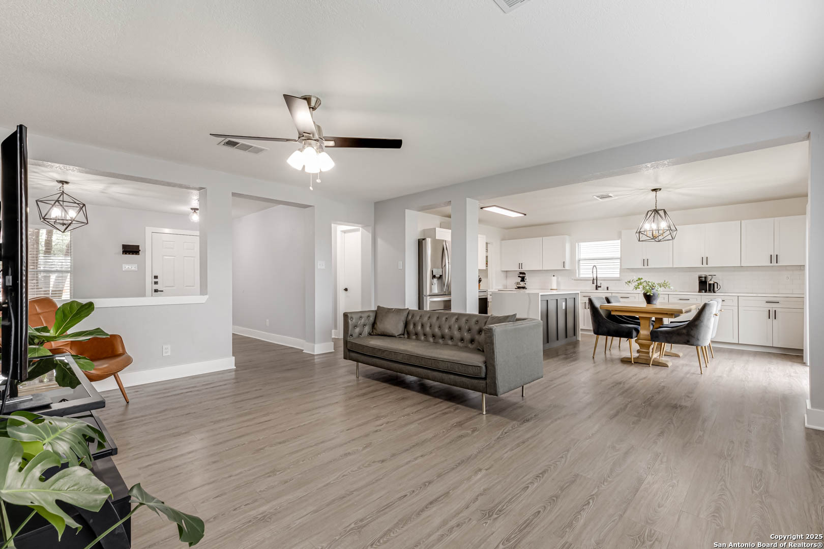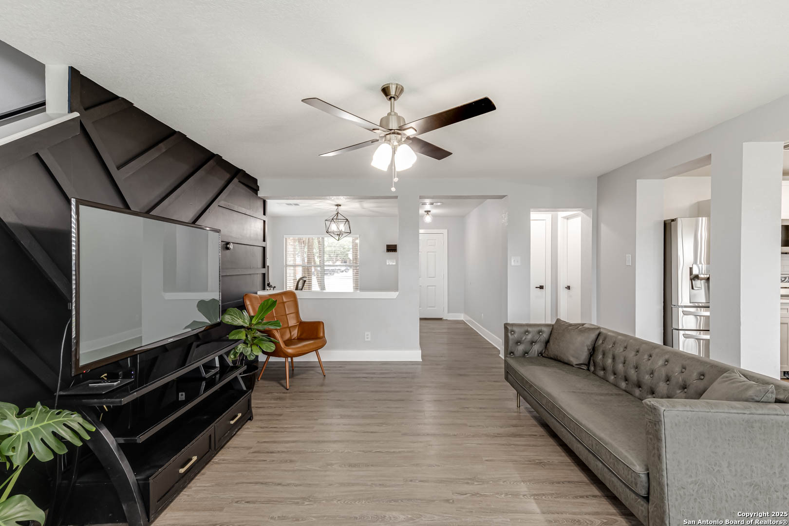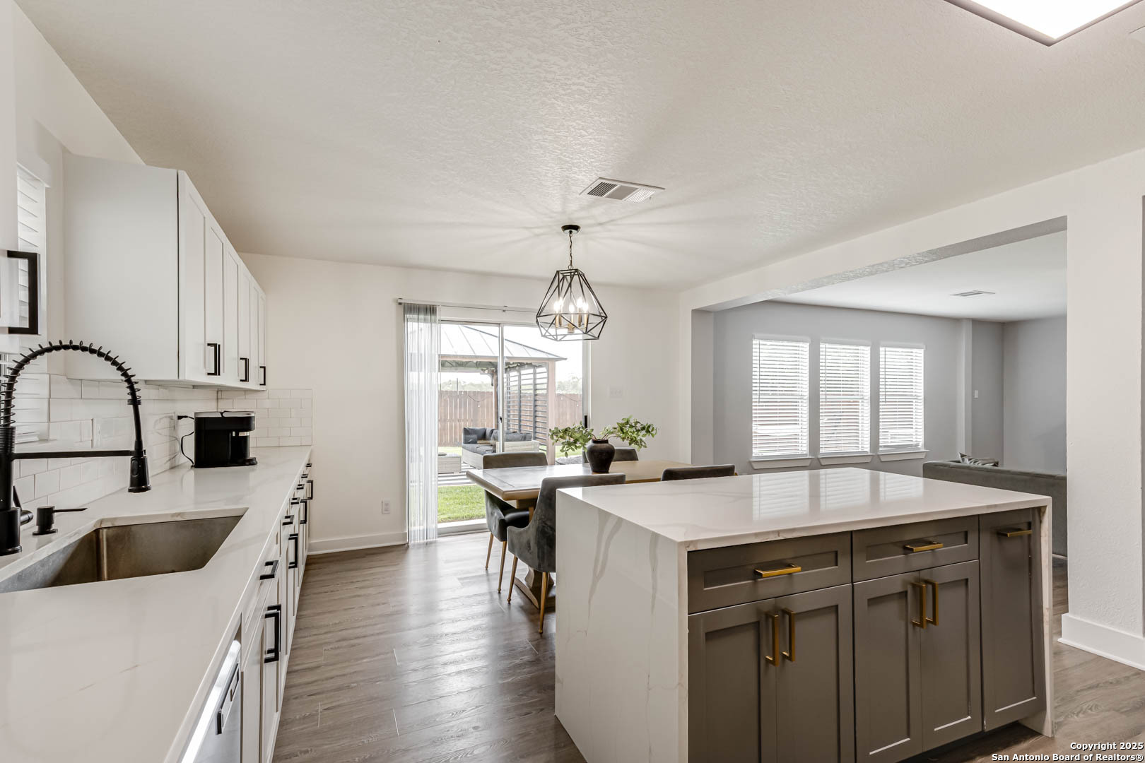 Step into this beautifully remodeled modern dream home offering 3 bedrooms, 2.5 bathrooms, and a 2-car garage. Centrally located off Thousand Oaks, this home offers convenient access to grocery stores, popular restaurants, and a great school district -making everyday living a breeze. The neighborhood has private access to McAllister Park as well. Inside, you'll find luxury vinyl plank flooring throughout, fresh interior paint, upgraded trim, and designer light fixtures that bring a stylish and cohesive feel to every room. The fully renovated kitchen is the centerpiece of the home, featuring a stunning marble waterfall island that perfectly blends elegance and functionality. Enjoy multiple living spaces ideal for both entertaining and everyday living, including a spacious family room and a flexible additional area perfect for a home office. The oversized laundry room with an attached walk-in pantry adds practicality and storage. Beautiful accent walls throughout the home add character and charm. Upstairs, all bedrooms are thoughtfully tucked away alongside a generous game room. The oversized primary suite includes an en suite bathroom with a sleek double vanity, tub/shower combo, and a large walk-in closet. Outside, relax under the pergola or gather around the fire pit with friends and family-ideal for weekend barbecues or quiet evenings under the stars. This move-in-ready home combines modern updates, functional spaces, and a prime location to deliver the full package.