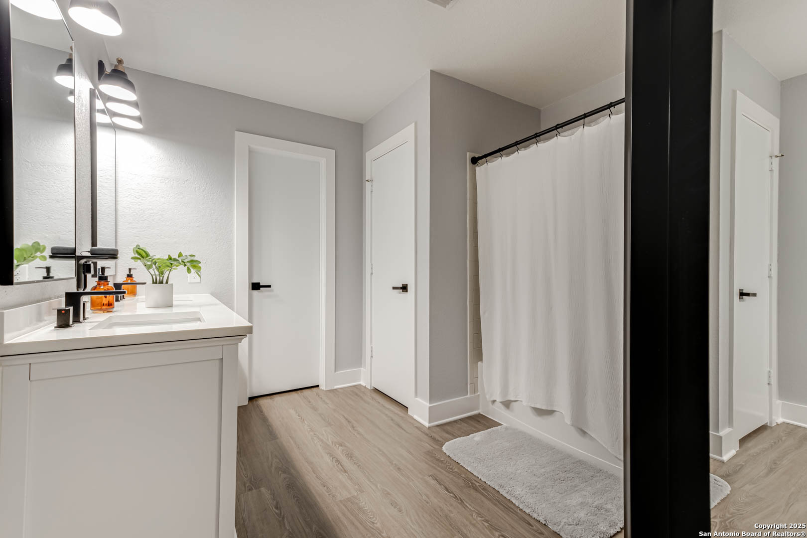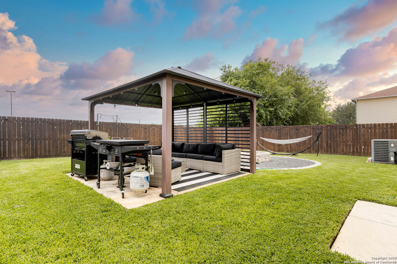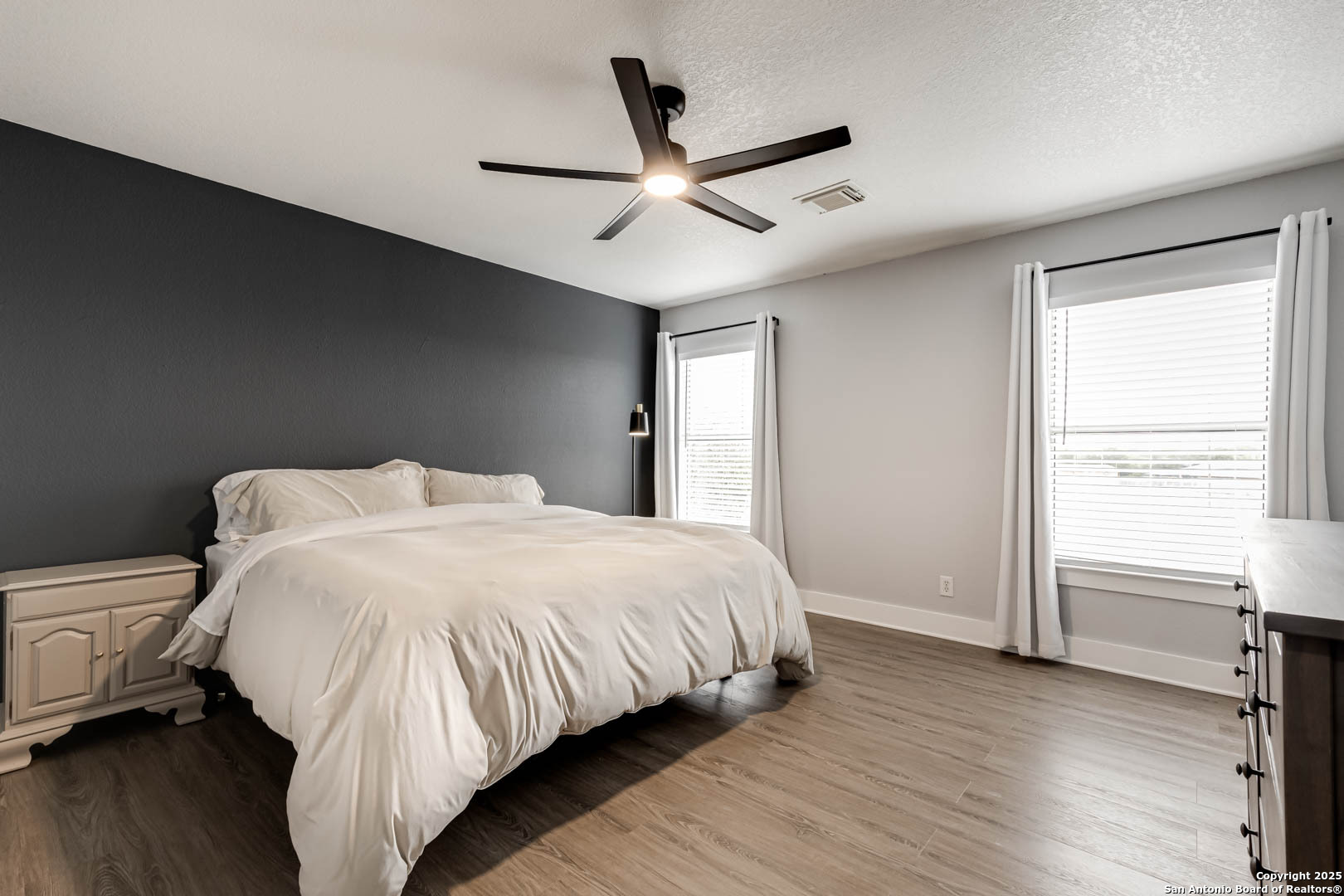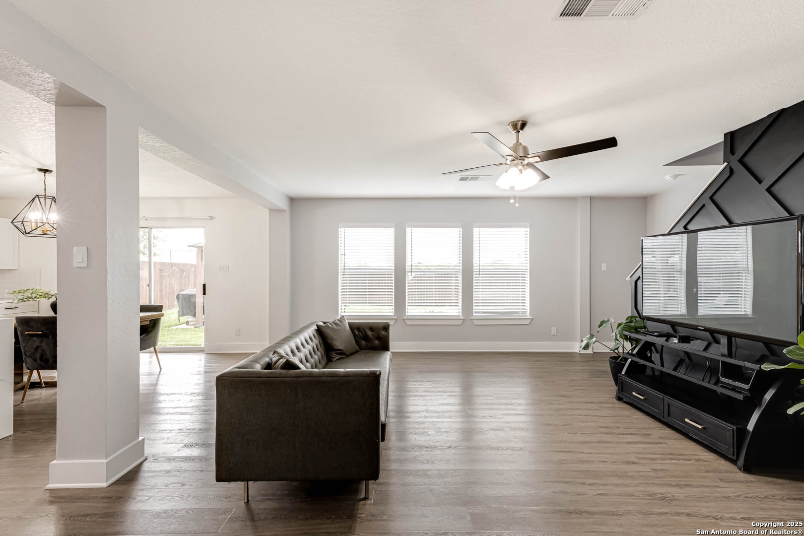 Step into this beautifully remodeled modern dream home offering 3 bedrooms, 2.5 bathrooms, and a 2-car garage. Centrally located off Thousand Oaks, this home offers convenient access to grocery stores, popular restaurants, and a great school district -making everyday living a breeze. The neighborhood has private access to McAllister Park as well. Inside, you'll find luxury vinyl plank flooring throughout, fresh interior paint, upgraded trim, and designer light fixtures that bring a stylish and cohesive feel to every room. The fully renovated kitchen is the centerpiece of the home, featuring a stunning marble waterfall island that perfectly blends elegance and functionality. Enjoy multiple living spaces ideal for both entertaining and everyday living, including a spacious family room and a flexible additional area perfect for a home office. The oversized laundry room with an attached walk-in pantry adds practicality and storage. Beautiful accent walls throughout the home add character and charm. Upstairs, all bedrooms are thoughtfully tucked away alongside a generous game room. The oversized primary suite includes an en suite bathroom with a sleek double vanity, tub/shower combo, and a large walk-in closet. Outside, relax under the pergola or gather around the fire pit with friends and family-ideal for weekend barbecues or quiet evenings under the stars. This move-in-ready home combines modern updates, functional spaces, and a prime location to deliver the full package.