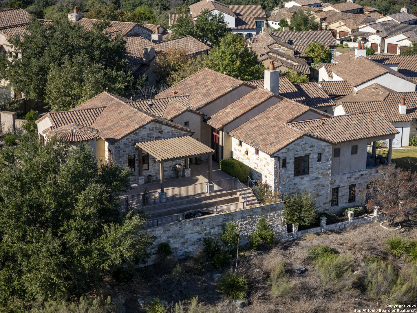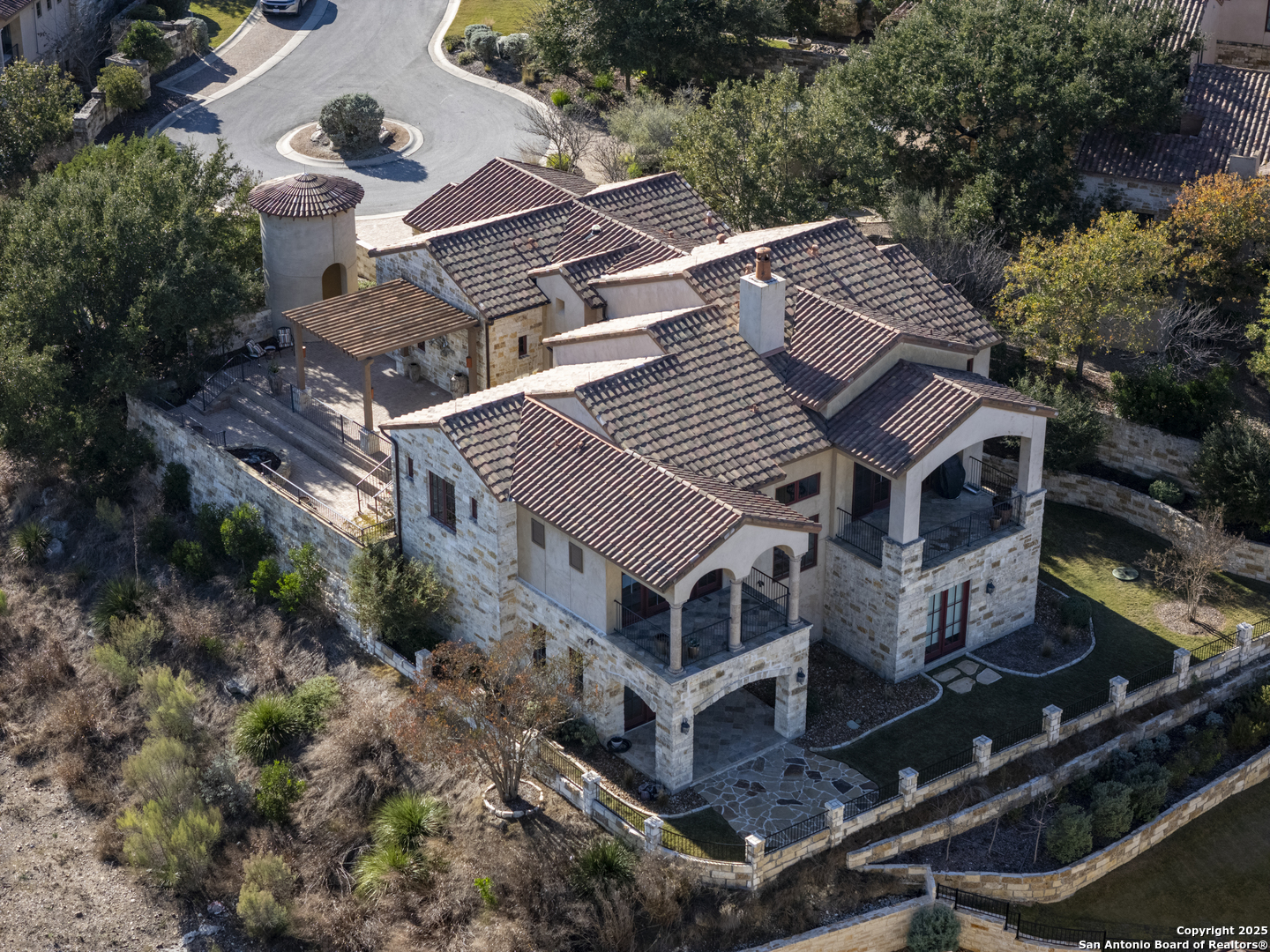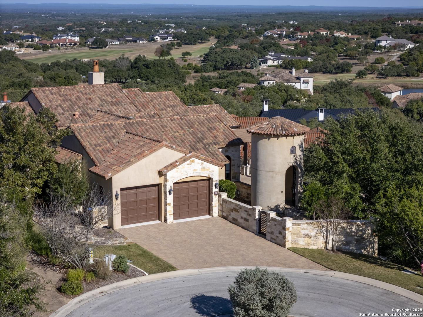 *THIS HOME HAS A FULL MASTER GOLF MEMBERSHIP AVAILABLE FOR PURCHASE* Perched atop a scenic hill, this Di Lusso Villa offers breathtaking panoramic views and an elevated lock-and-leave lifestyle, tucked behind a private gated entry within the prestigious, guard-gated community of Cordillera Ranch. Ideally located just minutes from the Golf Course, Clubhouse, and world-class amenities, the home is easily accessible by private golf cart. A grand, welcoming courtyard sets the stage as you enter the residence, immediately drawing your attention to the stunning vistas beyond. Inside, a dramatic foyer opens to a grand-scale family room, where refined Hill Country living and meticulous attention to detail are evident throughout. The open-concept floor plan features soaring ceilings, exposed wood beams, and generous living spaces, offering four bedrooms, each with its own ensuite bath. Designed for both beauty and function, the chef's kitchen is a culinary showpiece with Viking and Fisher & Paykel appliances, ample workspace, and seamless flow to the adjacent dining area-perfect for entertaining while enjoying sweeping Hill Country views. The luxurious primary suite, located on the main level, serves as a private retreat with expansive windows framing the surrounding landscape. The spa-inspired bath features radiant heated floors and an oversized soaking tub positioned to take in the rolling countryside. An additional guest suite on the main floor provides comfort and privacy for visitors. The second level offers a versatile great room or game room complete with a wet bar and access to an oversized patio-ideal for relaxing or entertaining while soaking in the dramatic scenery. Two additional bedrooms with ensuite baths complete this level, offering flexible living options. Designed for year-round enjoyment, the home features four spacious patios, perfect for entertaining or unwinding amid gentle Hill Country breezes. A Generac 24KW whole-home generator provides added peace of mind during inclement weather.