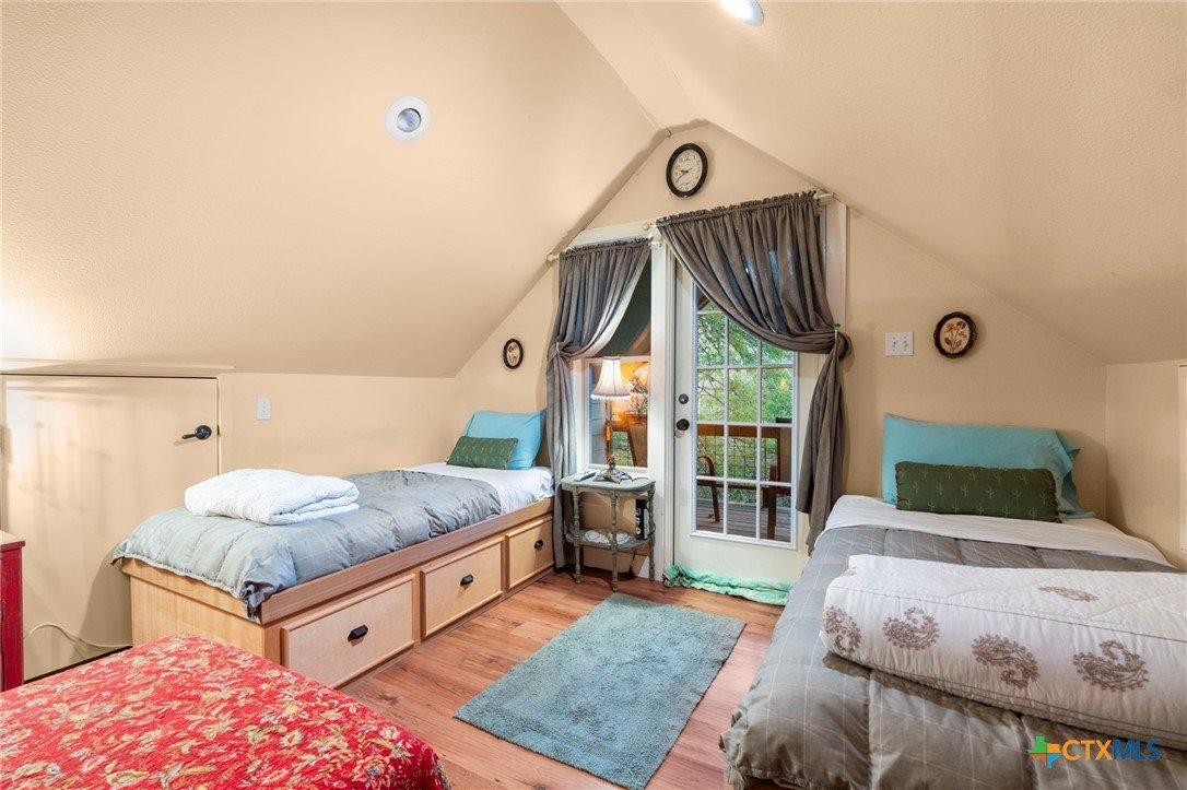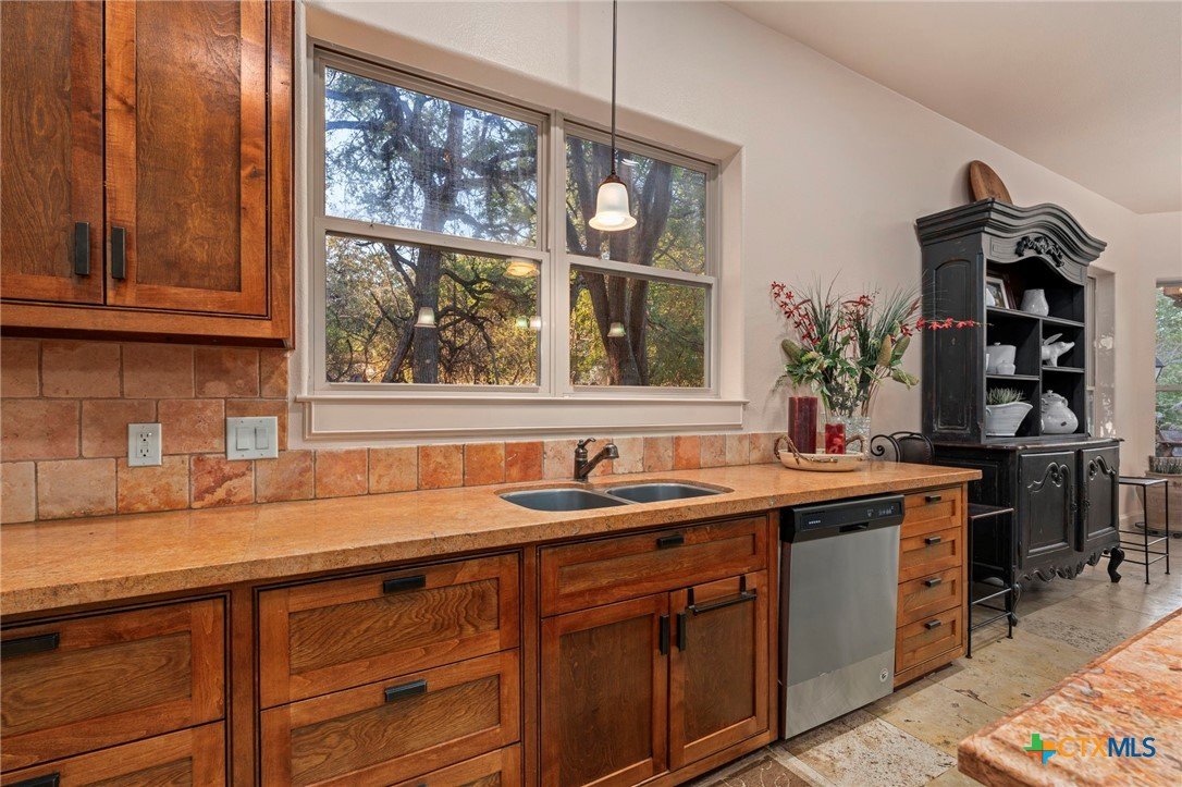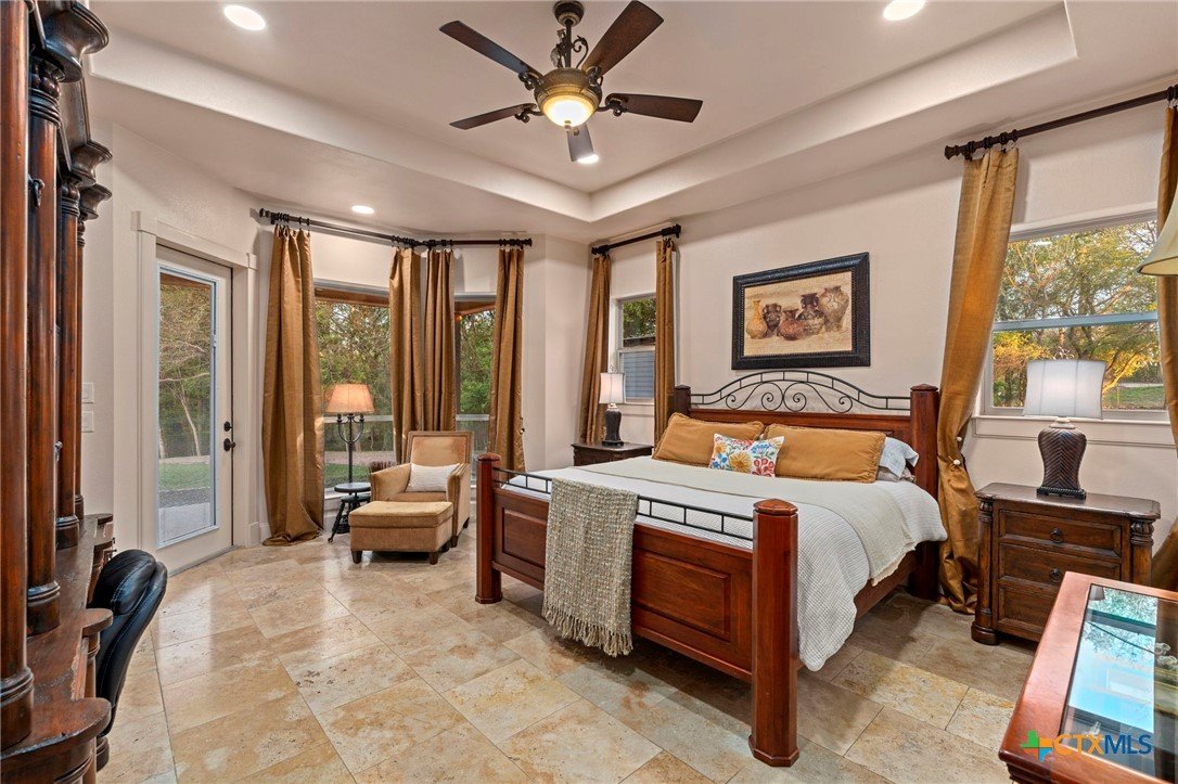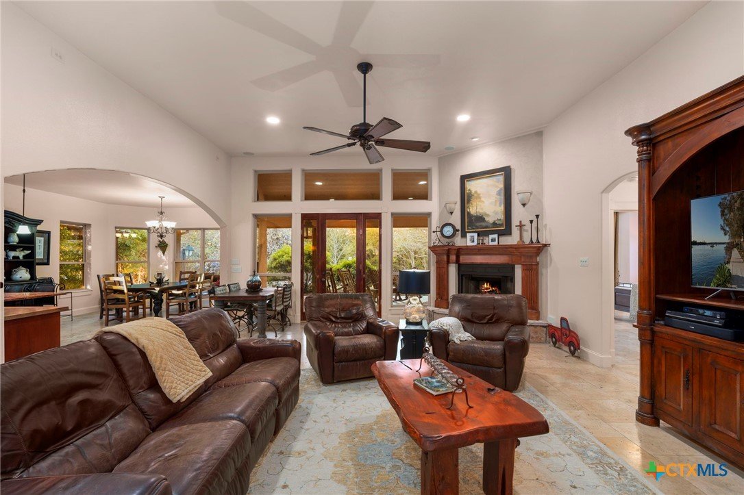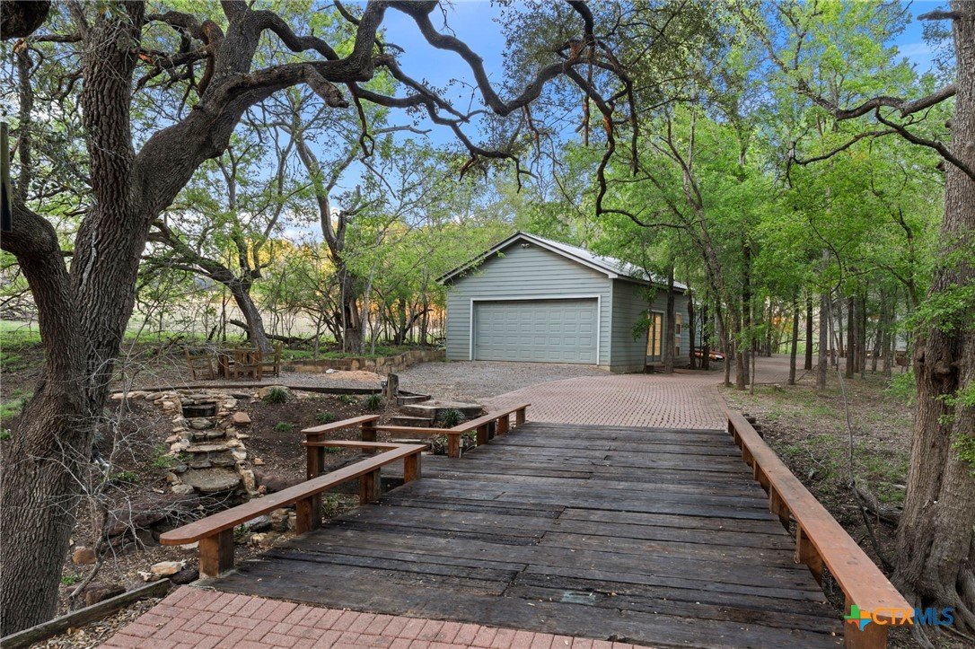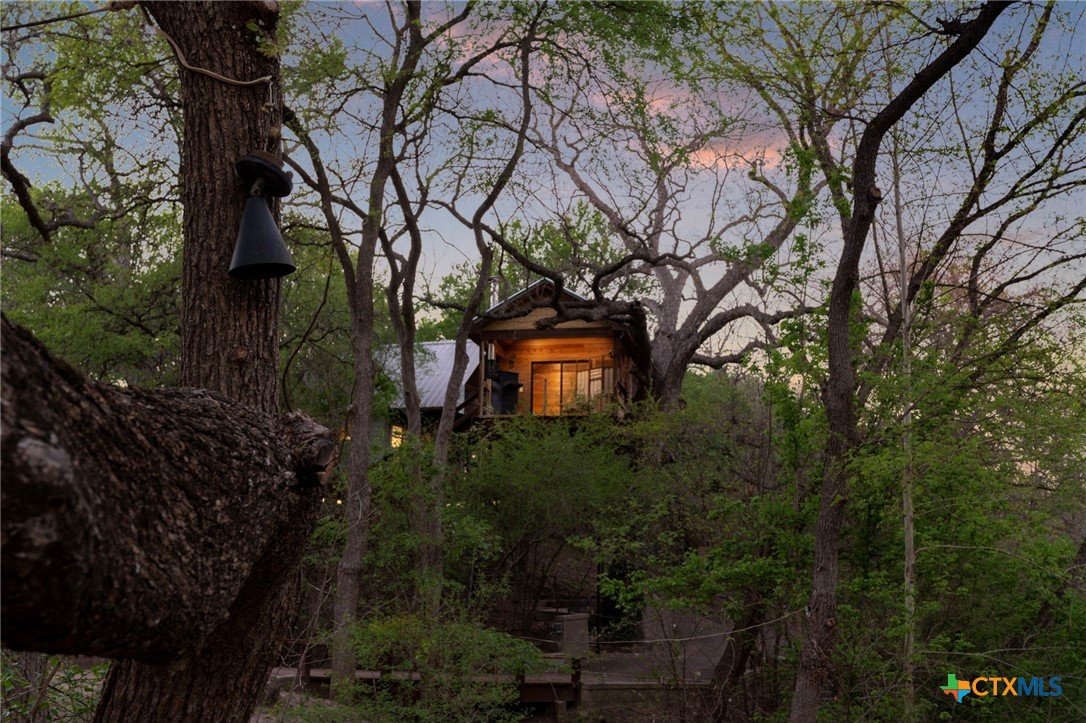 Mediterranean Inspired Riverfront Estate with Exceptional Grounds and Guest Accommodations Set on approximately 2.84 acres with direct San Marcos River frontage, this distinctive estate offers a rare combination of architectural character, expansive outdoor living, and guest accommodations. Thoughtfully designed, the property provides a private setting enhanced by natural surroundings. The main residence is a Mediterranean-style stucco home featuring three bedrooms and two and a half bathrooms with travertine flooring throughout. The kitchen includes a marble island and custom cabinetry. Two secondary bedrooms open to a private courtyard for seamless indoor-outdoor living. The primary suite offers a spacious retreat with a two-story closet, jetted tub with heating system, and reinforced safe room. Outdoor living includes a covered patio with fireplace, TV space, full outdoor kitchen, and fire pit. Additional features include a whole-home generator, leafguard gutters, and a two-car garage with extendable awning. The property also features a four-car garage with tongue and groove flooring, plumbing, and outdoor shower, plus an additional two to three car garage or workshop. A separate one-bedroom guesthouse with full kitchen and private balcony provides comfortable accommodations. A standout feature is the elevated treehouse retreat overlooking the river, designed as an efficiency with kitchenette, living area, outdoor shower, and deck with wood-burning pizza oven and fireplace. The grounds include approximately 18,000 square feet of brick pavers leading from the gated entrance to a riverfront deck, along with covered picnic areas and gathering spaces. Additional highlights include a water feature beneath a bridge, riverside sitting, and full RV hookup. Combining river frontage, architectural detail, and extensive amenities, this property offers a unique opportunity for private enjoyment, entertaining, or flexible living in a scenic Texas setting.