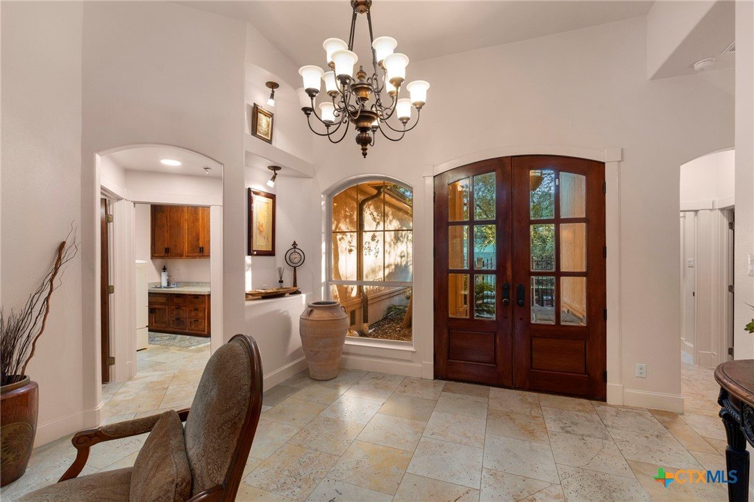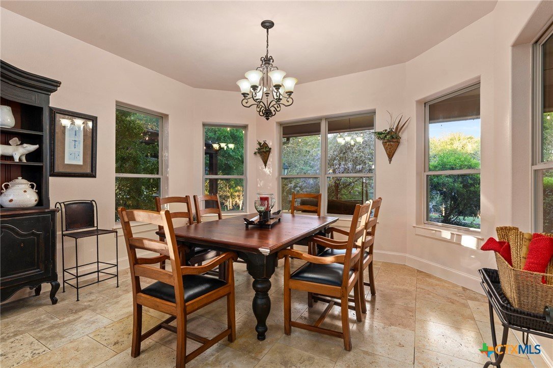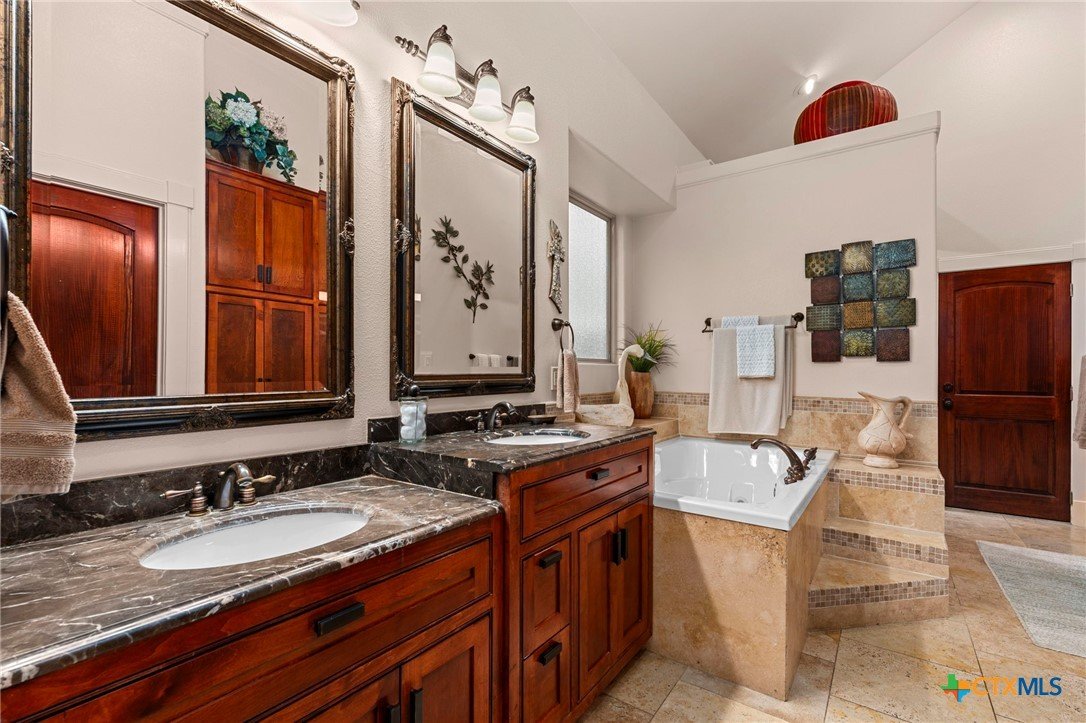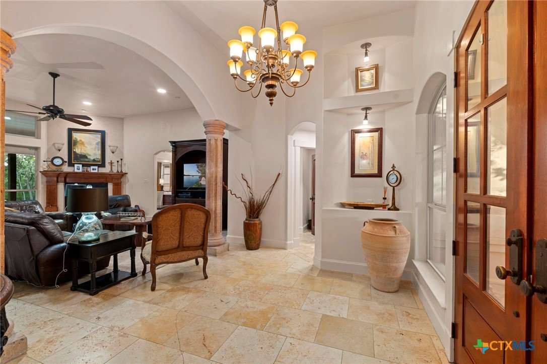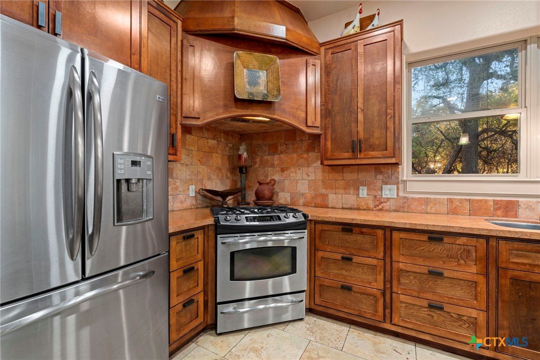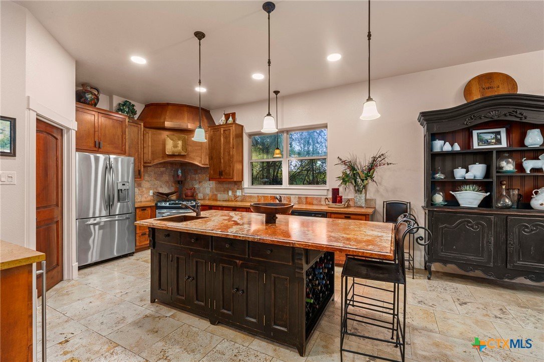 Mediterranean Inspired Riverfront Estate with Exceptional Grounds and Guest Accommodations Set on approximately 2.84 acres with direct San Marcos River frontage, this distinctive estate offers a rare combination of architectural character, expansive outdoor living, and guest accommodations. Thoughtfully designed, the property provides a private setting enhanced by natural surroundings. The main residence is a Mediterranean-style stucco home featuring three bedrooms and two and a half bathrooms with travertine flooring throughout. The kitchen includes a marble island and custom cabinetry. Two secondary bedrooms open to a private courtyard for seamless indoor-outdoor living. The primary suite offers a spacious retreat with a two-story closet, jetted tub with heating system, and reinforced safe room. Outdoor living includes a covered patio with fireplace, TV space, full outdoor kitchen, and fire pit. Additional features include a whole-home generator, leafguard gutters, and a two-car garage with extendable awning. The property also features a four-car garage with tongue and groove flooring, plumbing, and outdoor shower, plus an additional two to three car garage or workshop. A separate one-bedroom guesthouse with full kitchen and private balcony provides comfortable accommodations. A standout feature is the elevated treehouse retreat overlooking the river, designed as an efficiency with kitchenette, living area, outdoor shower, and deck with wood-burning pizza oven and fireplace. The grounds include approximately 18,000 square feet of brick pavers leading from the gated entrance to a riverfront deck, along with covered picnic areas and gathering spaces. Additional highlights include a water feature beneath a bridge, riverside sitting, and full RV hookup. Combining river frontage, architectural detail, and extensive amenities, this property offers a unique opportunity for private enjoyment, entertaining, or flexible living in a scenic Texas setting.