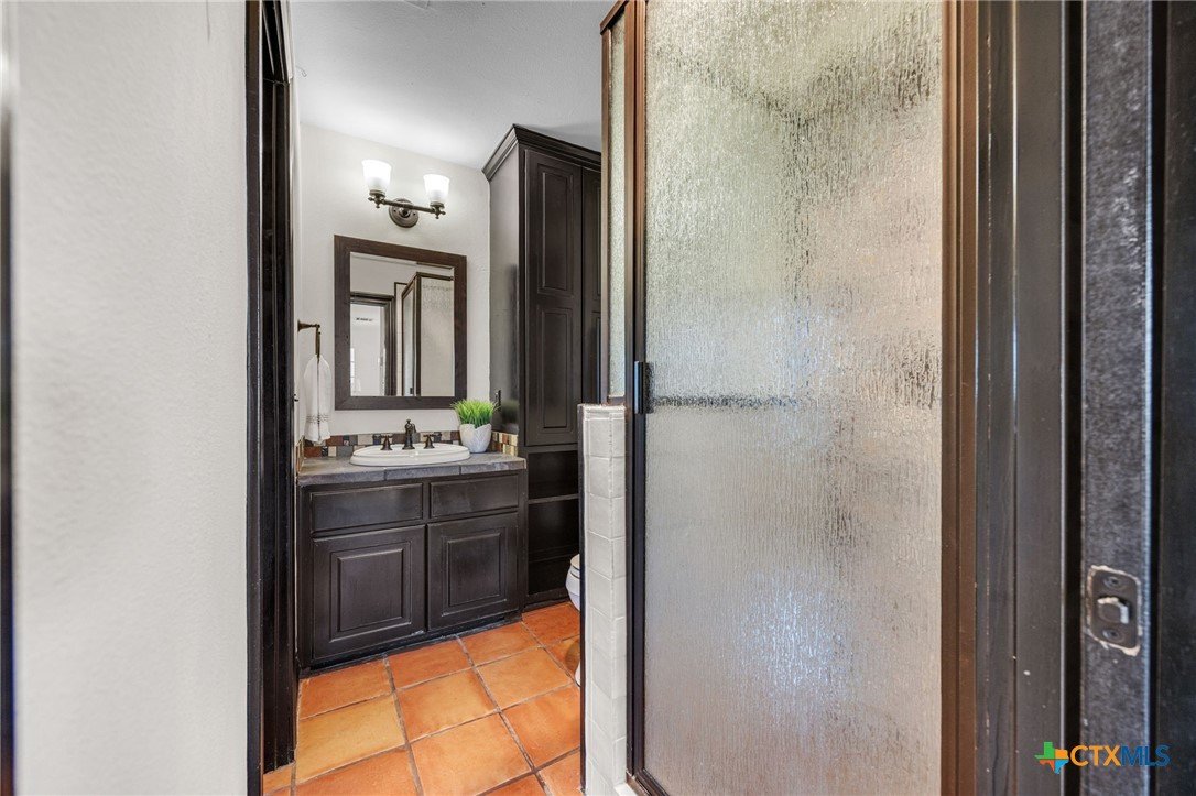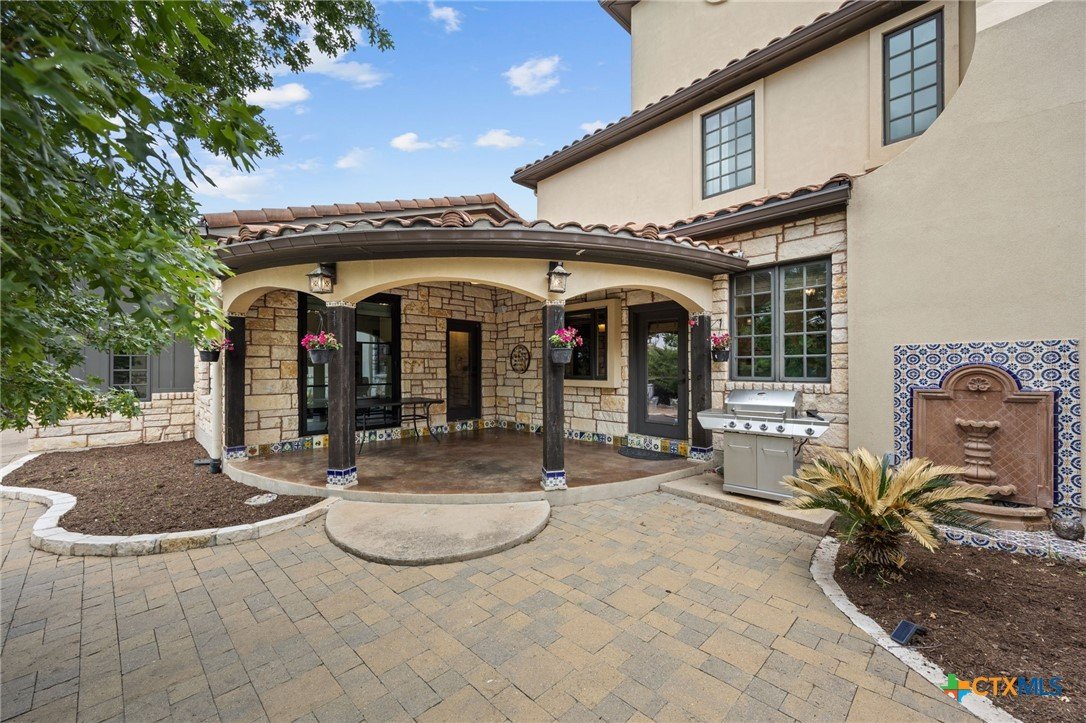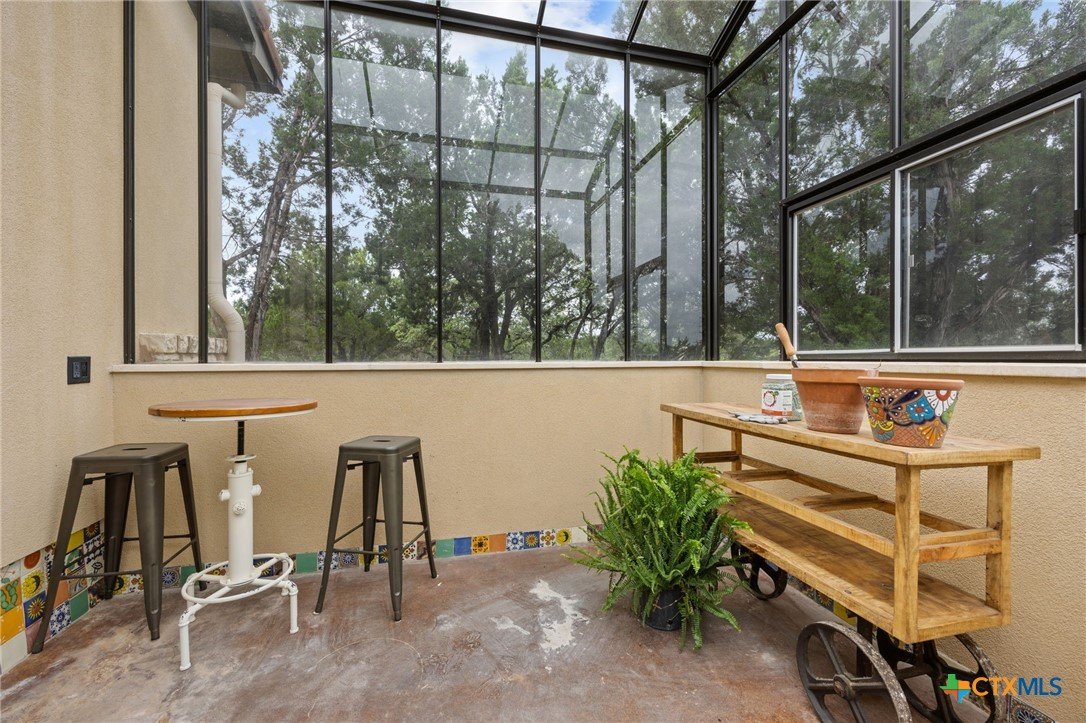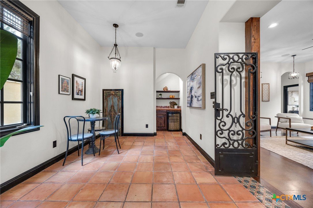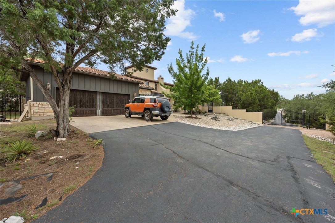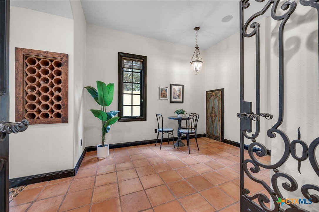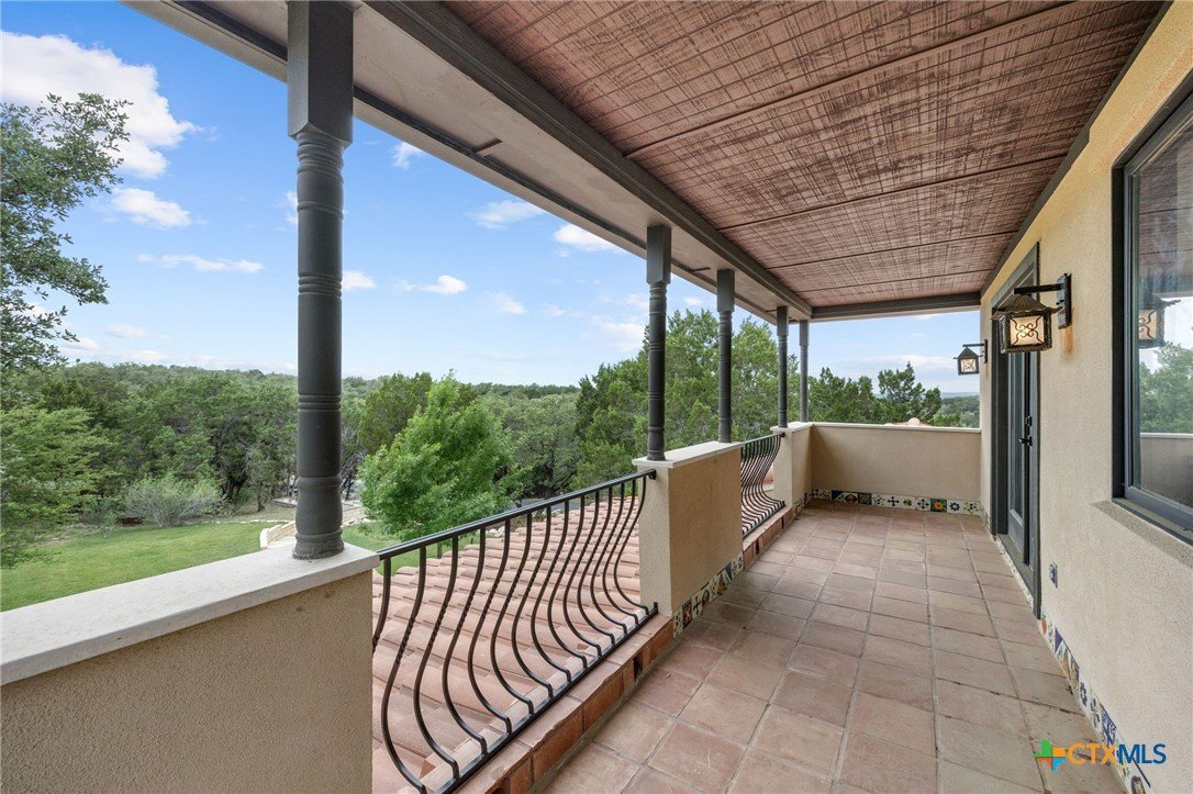 Set on 2.5 secluded acres in the Texas Hill Country, this Spanish villa is genuinely one of a kind. A private gated entrance welcomes you in, leading down a winding drive through mature live oaks before the home comes into view. The red tile roof, limestone and stucco exterior, arched entryways, and wrought iron details give it real character, and the sweeping paver walkway and manicured grounds make you feel right at home from the moment you arrive. The primary bath was recently renovated — freestanding soaking tub, floor-to-ceiling marble tile, herringbone walk-in shower, wood double vanity with backlit mirrors, and a crystal pendant chandelier over the tub. The kitchen feels right at home with dark wood cabinetry, hand-painted Talavera tile, and quartz countertops with a large commercial refrigerator. The attached glass greenhouse is one of those spaces you don't expect to find — cathedral glass panels, treetop views, and endless potential as a sunroom, studio, or plant lover's dream. If you're looking for something with real character, privacy, and acreage in Lago Vista, this is the one!