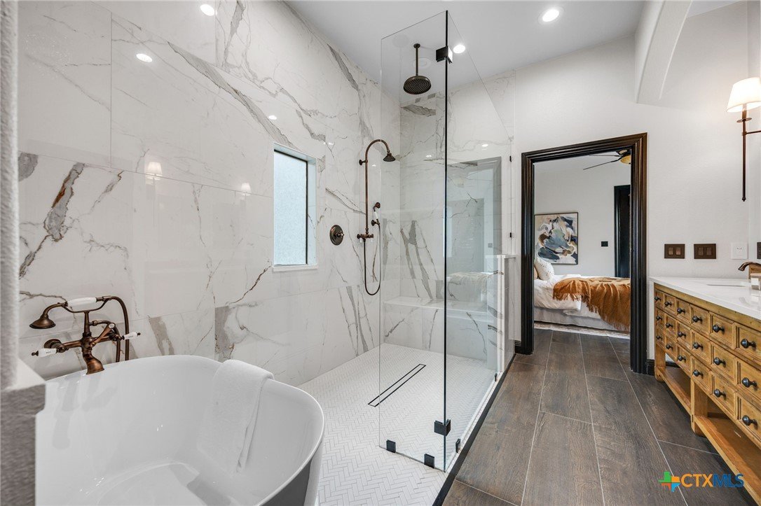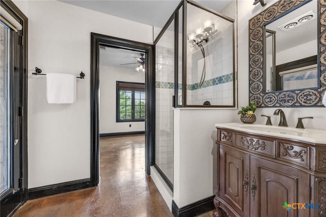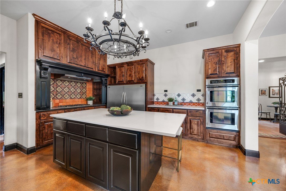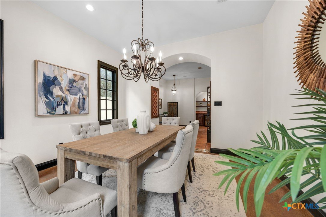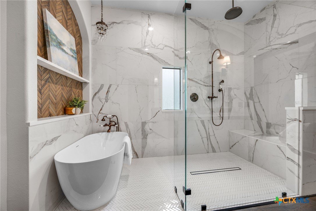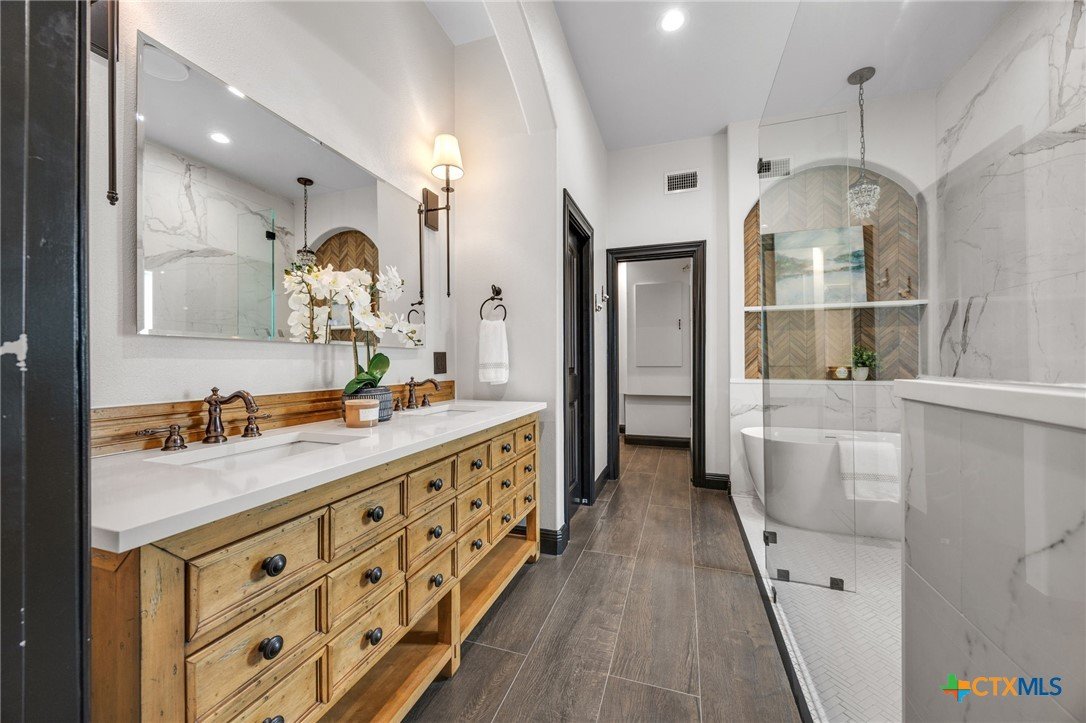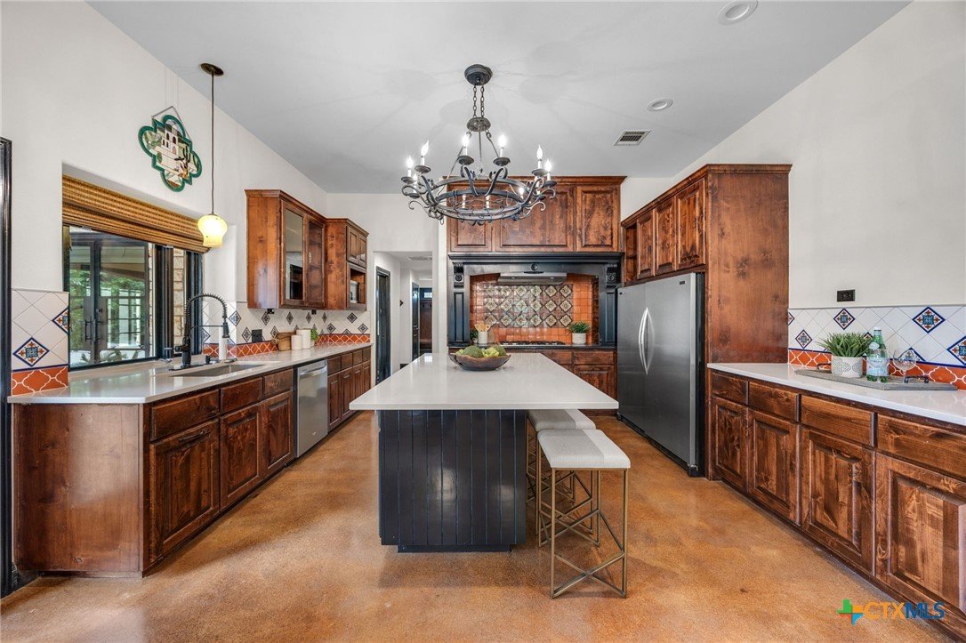Set on 2.5 secluded acres in the Texas Hill Country, this Spanish villa is genuinely one of a kind. A private gated entrance welcomes you in, leading down a winding drive through mature live oaks before the home comes into view. The red tile roof, limestone and stucco exterior, arched entryways, and wrought iron details give it real character, and the sweeping paver walkway and manicured grounds make you feel right at home from the moment you arrive. The primary bath was recently renovated — freestanding soaking tub, floor-to-ceiling marble tile, herringbone walk-in shower, wood double vanity with backlit mirrors, and a crystal pendant chandelier over the tub. The kitchen feels right at home with dark wood cabinetry, hand-painted Talavera tile, and quartz countertops with a large commercial refrigerator. The attached glass greenhouse is one of those spaces you don't expect to find — cathedral glass panels, treetop views, and endless potential as a sunroom, studio, or plant lover's dream. If you're looking for something with real character, privacy, and acreage in Lago Vista, this is the one!