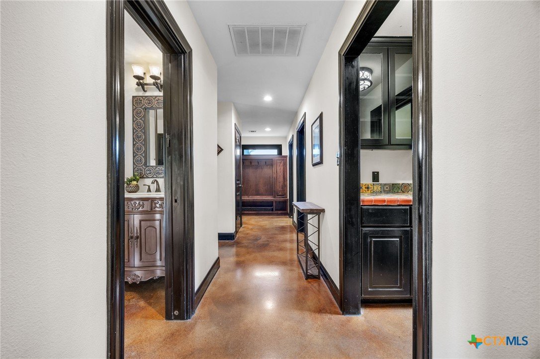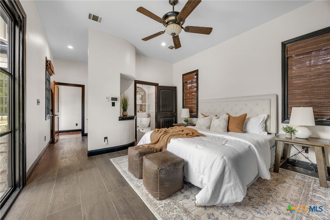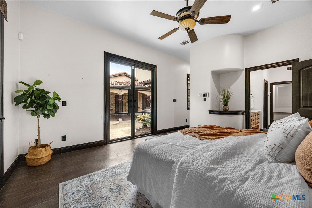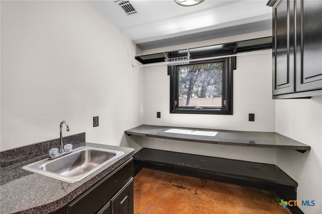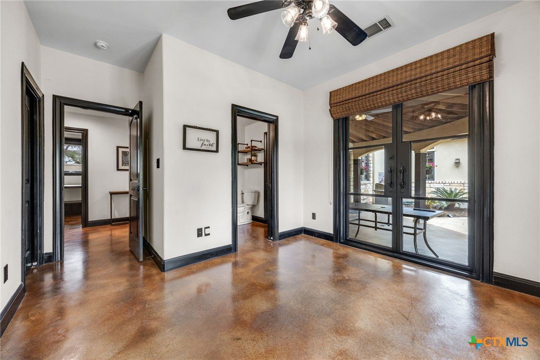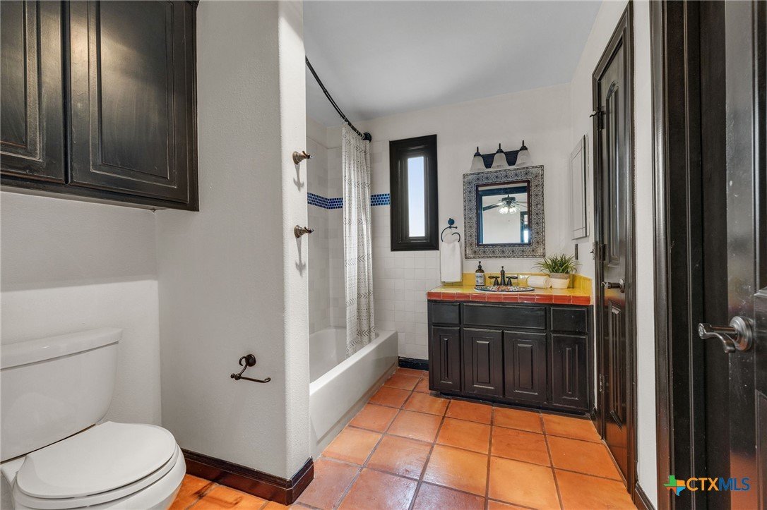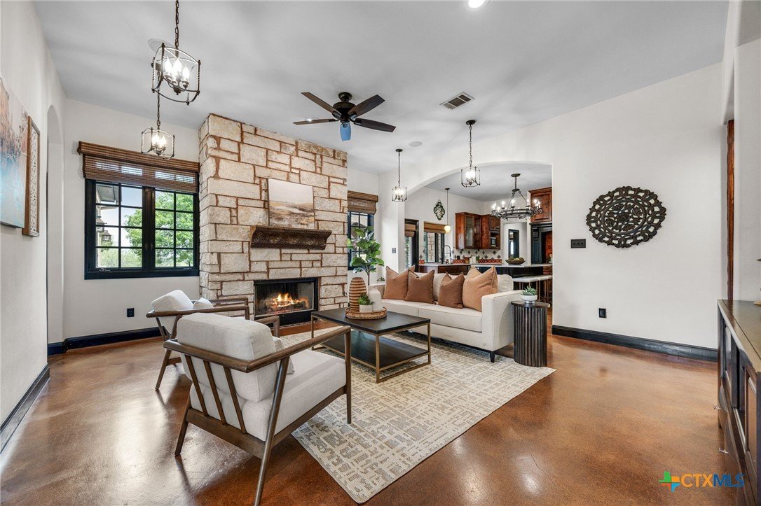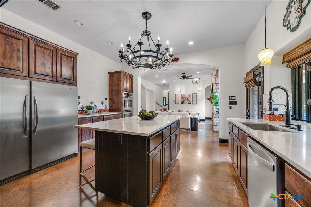 Set on 2.5 secluded acres in the Texas Hill Country, this Spanish villa is genuinely one of a kind. A private gated entrance welcomes you in, leading down a winding drive through mature live oaks before the home comes into view. The red tile roof, limestone and stucco exterior, arched entryways, and wrought iron details give it real character, and the sweeping paver walkway and manicured grounds make you feel right at home from the moment you arrive. The primary bath was recently renovated — freestanding soaking tub, floor-to-ceiling marble tile, herringbone walk-in shower, wood double vanity with backlit mirrors, and a crystal pendant chandelier over the tub. The kitchen feels right at home with dark wood cabinetry, hand-painted Talavera tile, and quartz countertops with a large commercial refrigerator. The attached glass greenhouse is one of those spaces you don't expect to find — cathedral glass panels, treetop views, and endless potential as a sunroom, studio, or plant lover's dream. If you're looking for something with real character, privacy, and acreage in Lago Vista, this is the one!