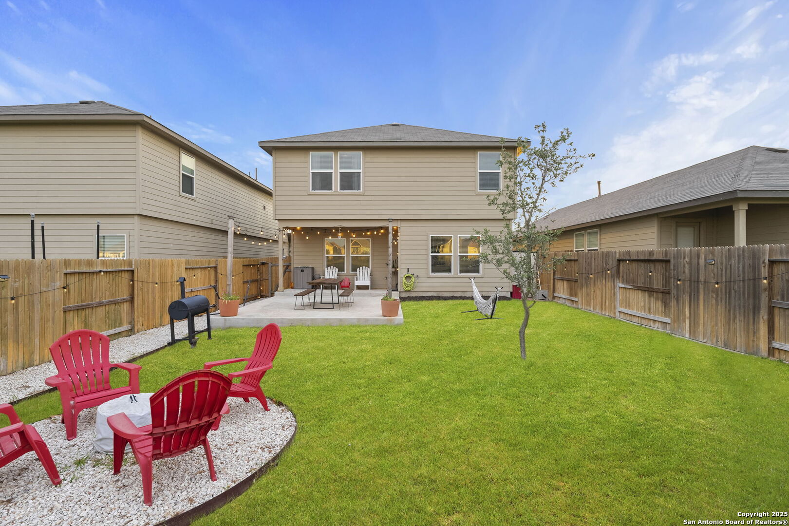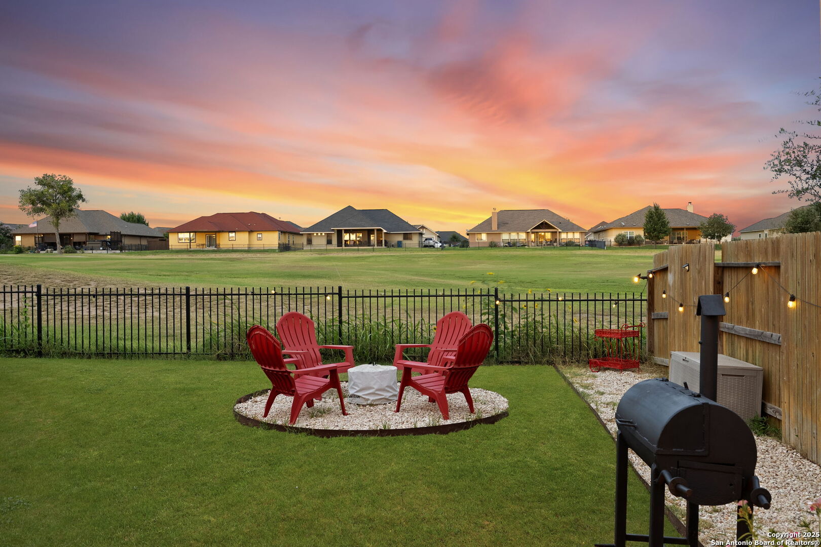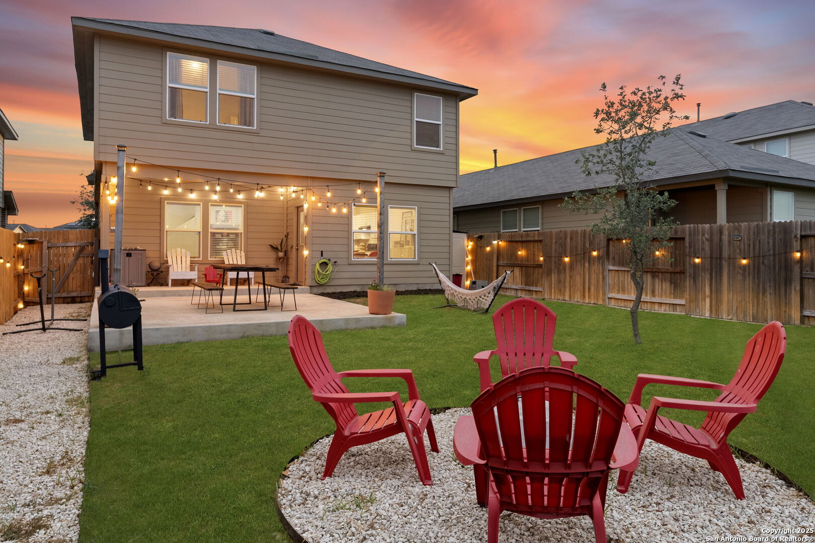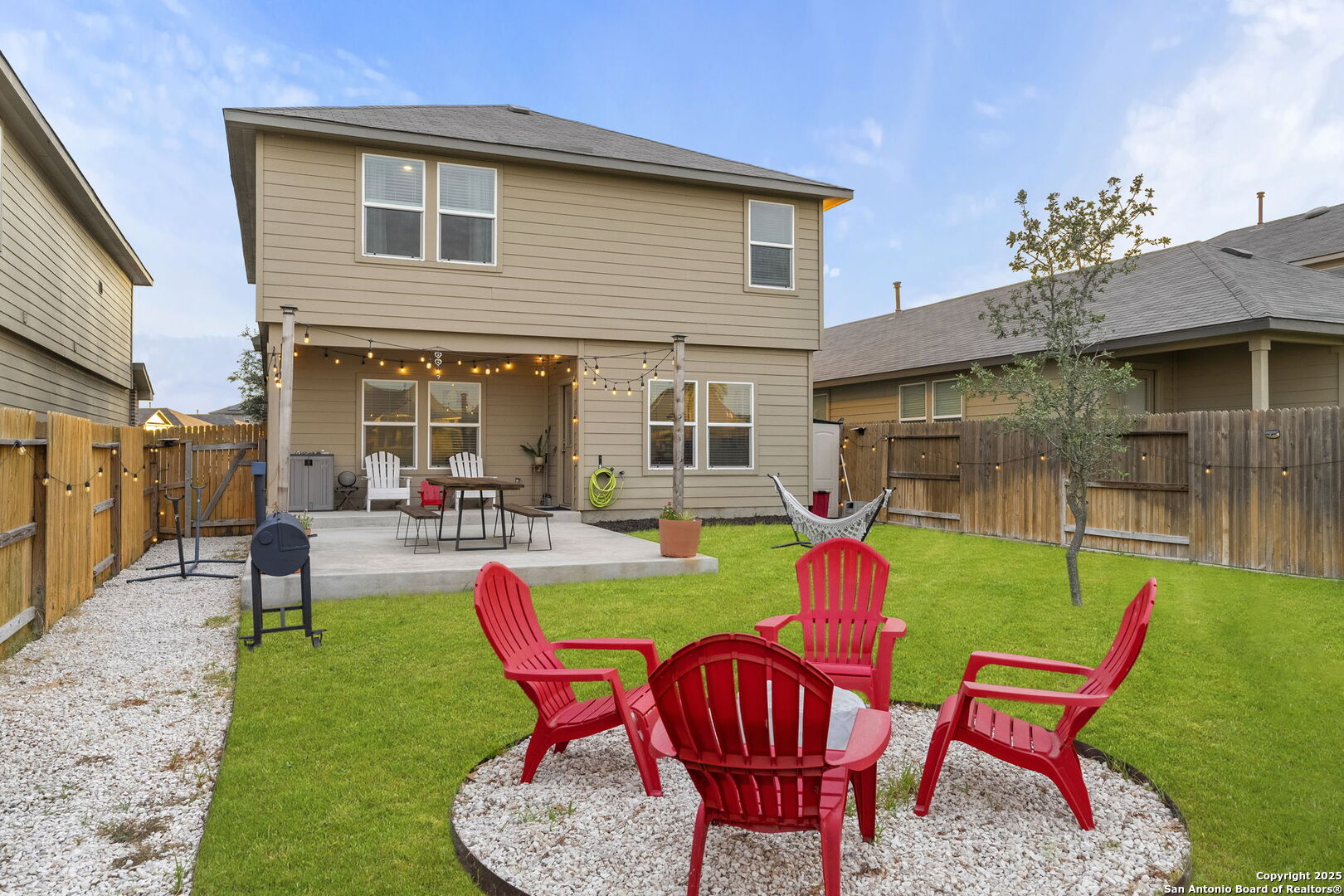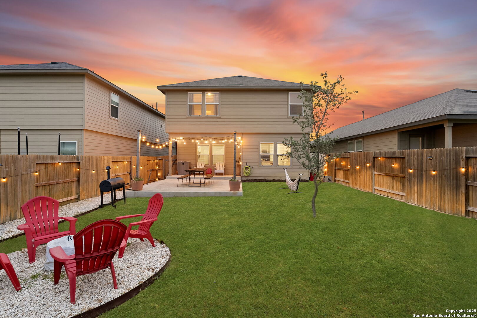Take advantage of an assumable loan at an incredible LOW interest rate and enjoy golf course living at its finest. Wake up to panoramic golf course views and unforgettable Texas sunsets at The Links at River Bend in the heart of Floresville, Texas. This beautifully maintained 4-bedroom, 2.5-bath home offers a seamless blend of modern style and serene surroundings, backing directly onto the lush fairways for ultimate privacy. Step inside to an inviting open-concept floor plan featuring vinyl flooring, soft neutral tones, and designer accents. The spacious living room flows effortlessly into the dining area and gourmet kitchen, which is equipped with granite countertops, a large center island, sleek white cabinetry, and GE appliances. Perfect for entertaining, the main level showcases views of the backyard oasis and golf course beyond. Upstairs, discover generously sized bedrooms, including a private primary suite with a spa-like ensuite, and a walk-in closet. Additional rooms offer versatility for guest accommodations, a home office, or creative spaces. Outside, the backyard is a showstopper-string-lit patio, fire pit lounge area, and endless open skies set the stage for weekend barbecues and relaxing evenings. No rear neighbors-just fairway views and peace.