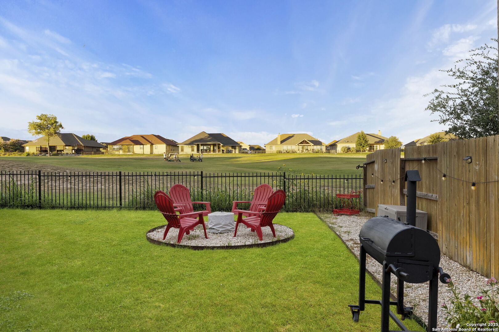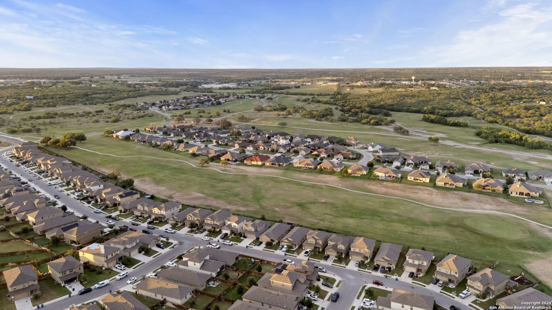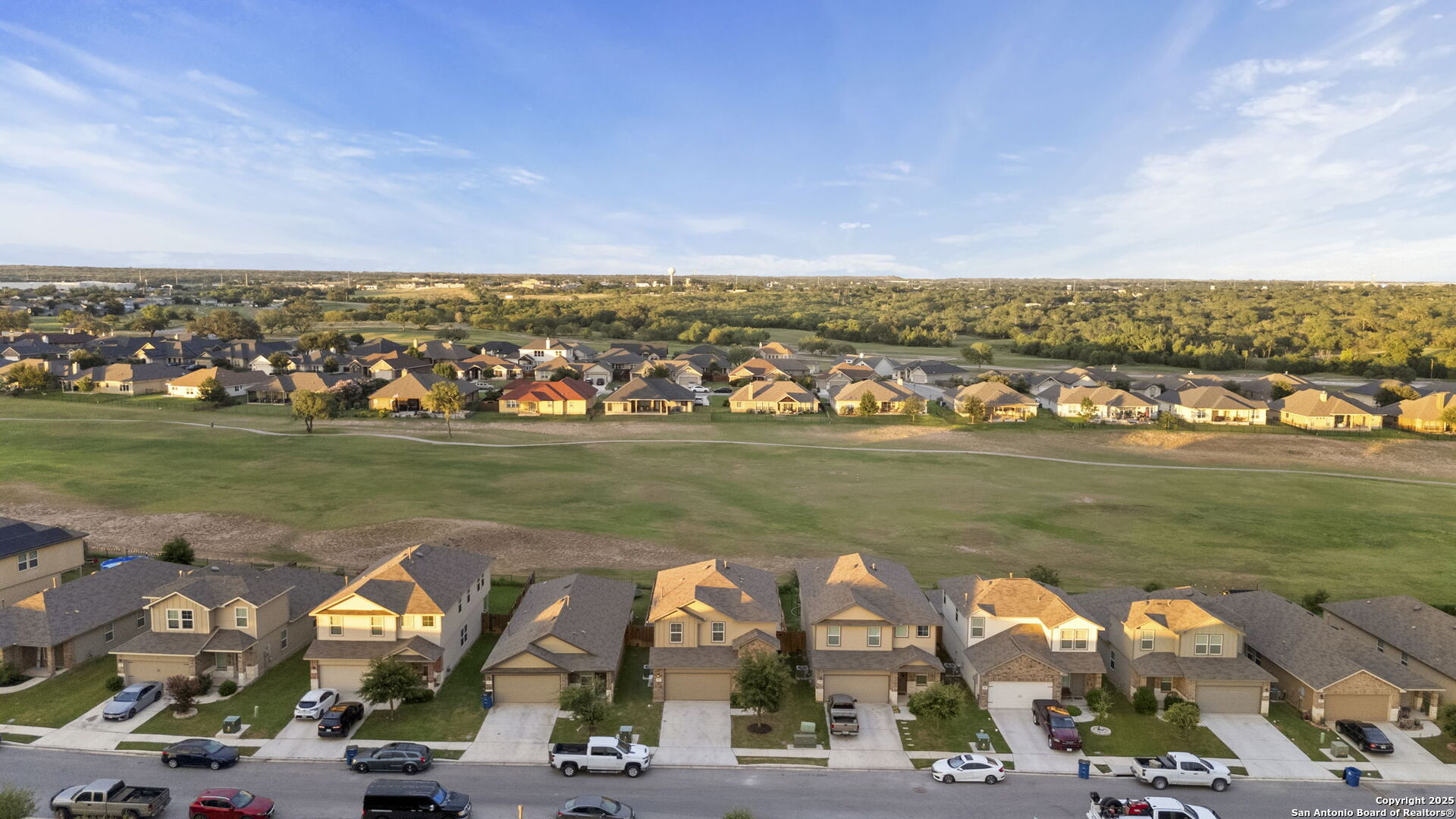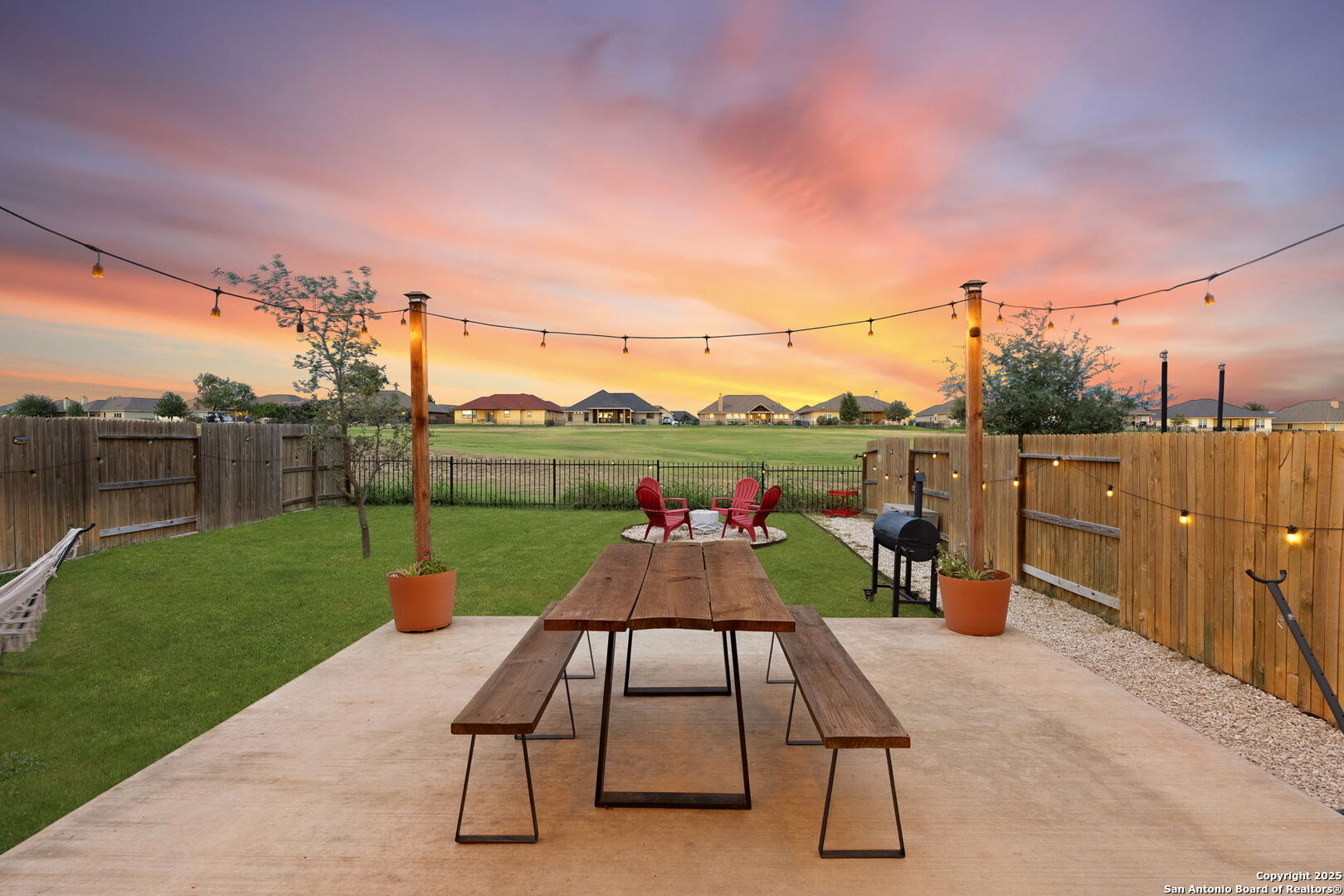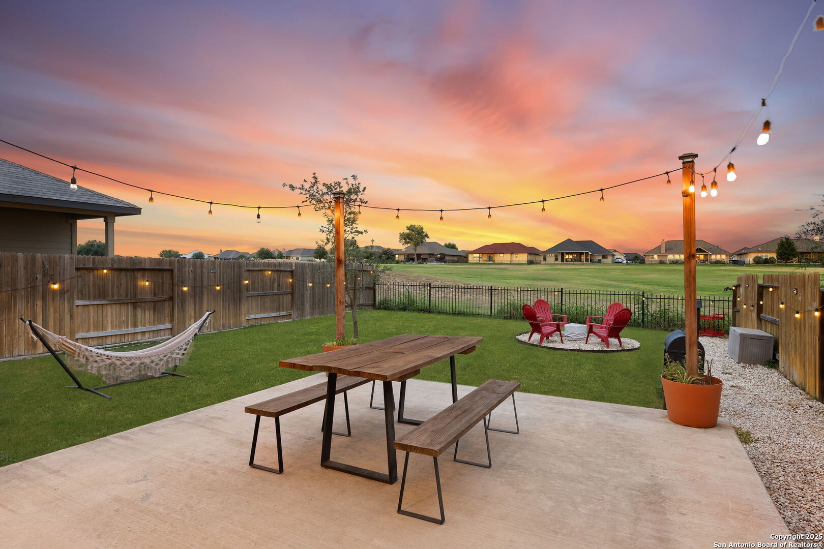 Take advantage of an assumable loan at an incredible LOW interest rate and enjoy golf course living at its finest. Wake up to panoramic golf course views and unforgettable Texas sunsets at The Links at River Bend in the heart of Floresville, Texas. This beautifully maintained 4-bedroom, 2.5-bath home offers a seamless blend of modern style and serene surroundings, backing directly onto the lush fairways for ultimate privacy. Step inside to an inviting open-concept floor plan featuring vinyl flooring, soft neutral tones, and designer accents. The spacious living room flows effortlessly into the dining area and gourmet kitchen, which is equipped with granite countertops, a large center island, sleek white cabinetry, and GE appliances. Perfect for entertaining, the main level showcases views of the backyard oasis and golf course beyond. Upstairs, discover generously sized bedrooms, including a private primary suite with a spa-like ensuite, and a walk-in closet. Additional rooms offer versatility for guest accommodations, a home office, or creative spaces. Outside, the backyard is a showstopper-string-lit patio, fire pit lounge area, and endless open skies set the stage for weekend barbecues and relaxing evenings. No rear neighbors-just fairway views and peace.