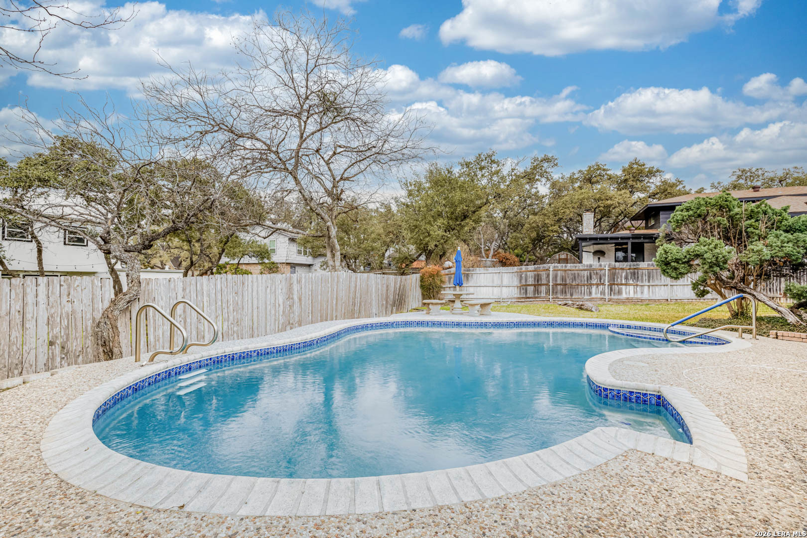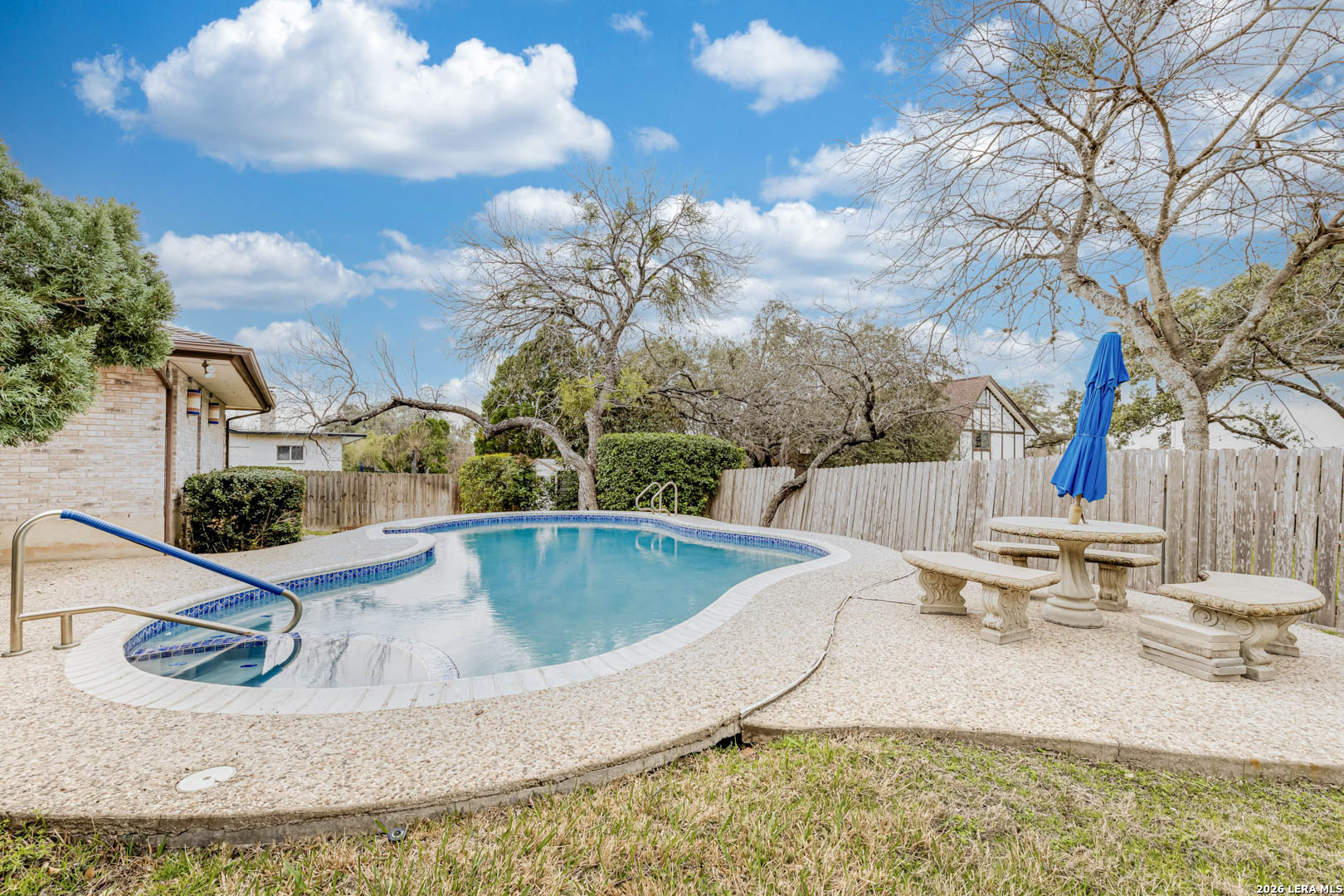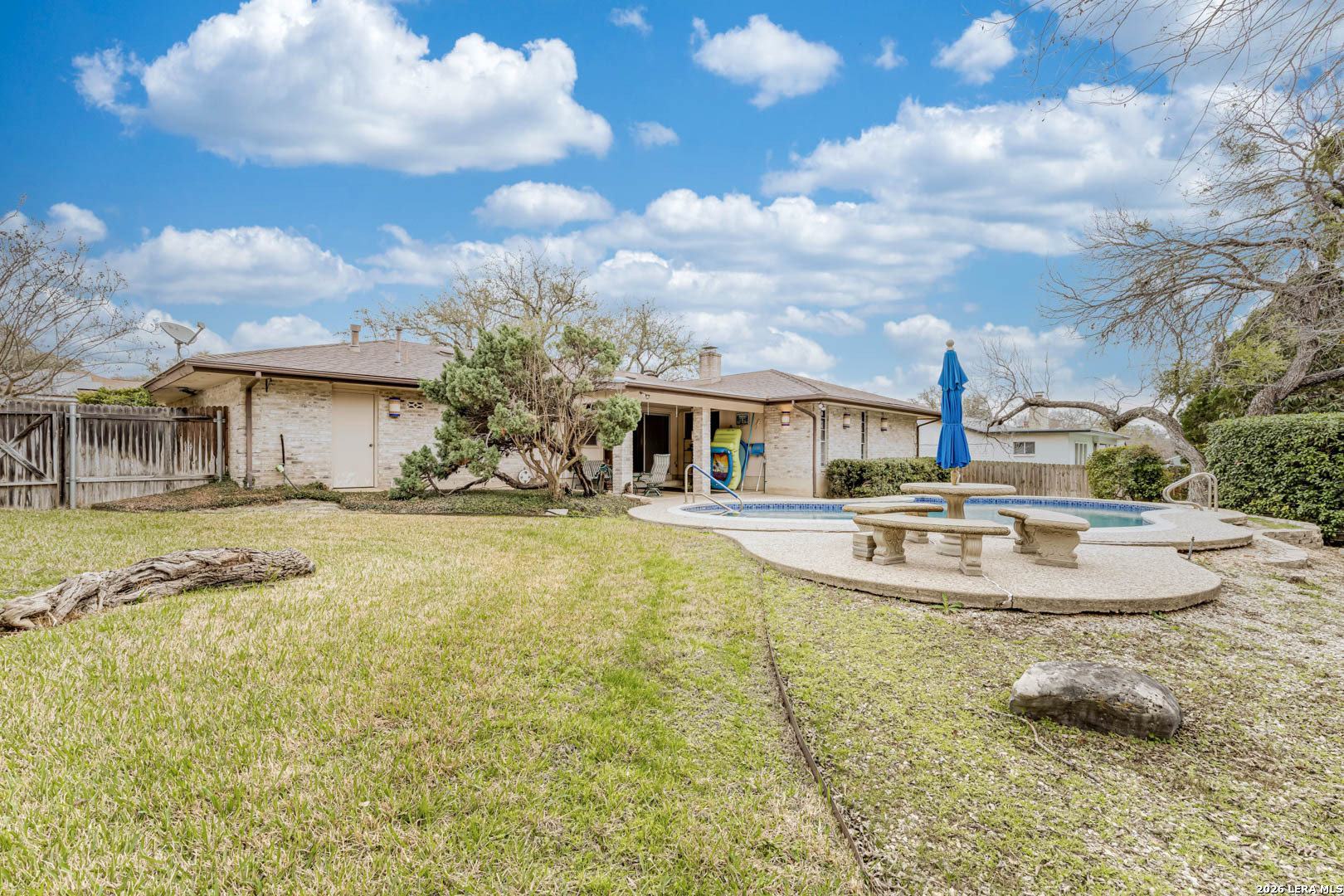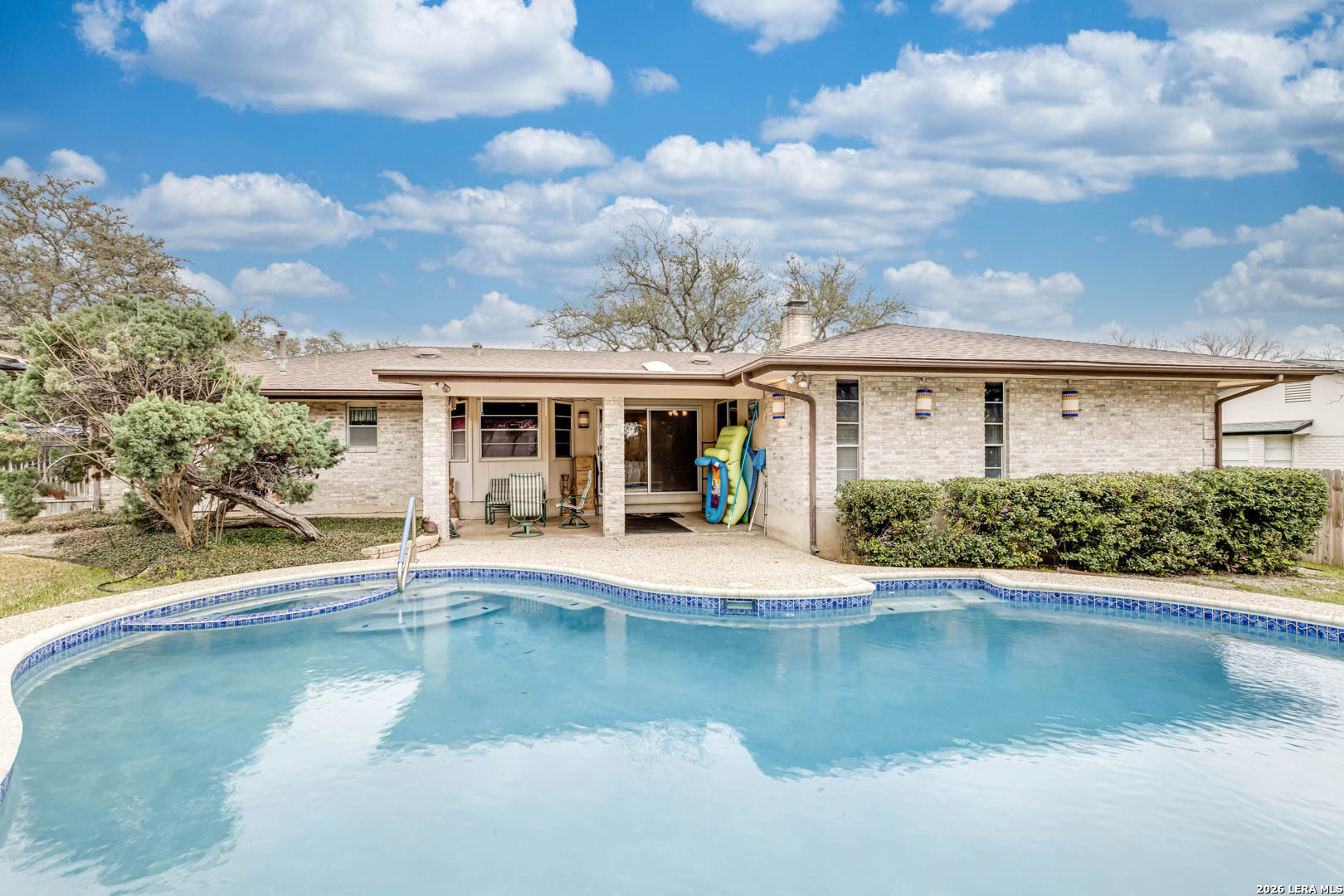 Nestled under mature trees in North San Antonio's Thousand Oaks community, this charming single-story home offers space, character, and endless potential. Inside, soaring ceilings with exposed beams and a floor-to-ceiling brick fireplace create a warm and inviting family room. With 4 bedrooms (or 3 plus an office) and 2 full baths, the secondary bedrooms allow flexibility for guests, hobbies, or a home office. The kitchen opens to the living and dining areas, provides abundant natural light, and offers generous cabinet space and a functional footprint ready for your modern updates. Step outside to your private backyard retreat, complete with a sparkling in-ground pool, covered patio, and mature trees, perfect for summer gatherings, weekend barbecues, or peaceful evenings at home. The A storage shed provides additional space for tools and outdoor equipment, while the two-car garage includes extra room for a workbench or added storage. Well-maintained and priced to allow for personalization and improvements, this home offers a great opportunity to customize in an established neighborhood with excellent schools and convenient access to major roadways, shopping, and dining.