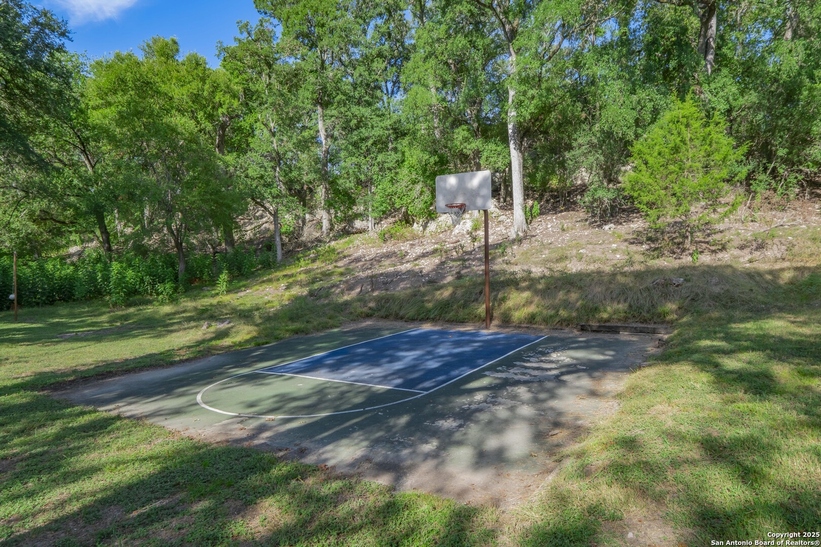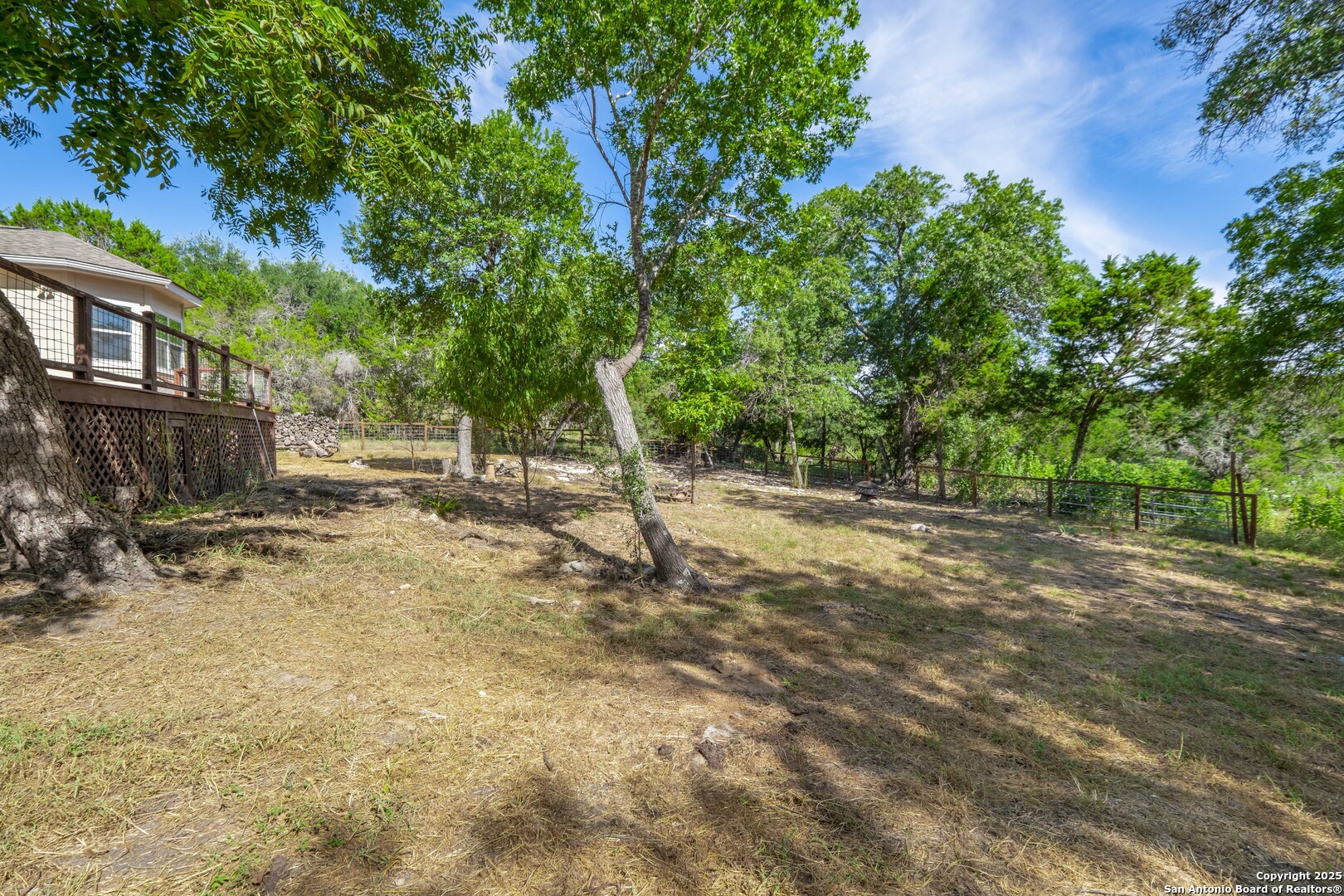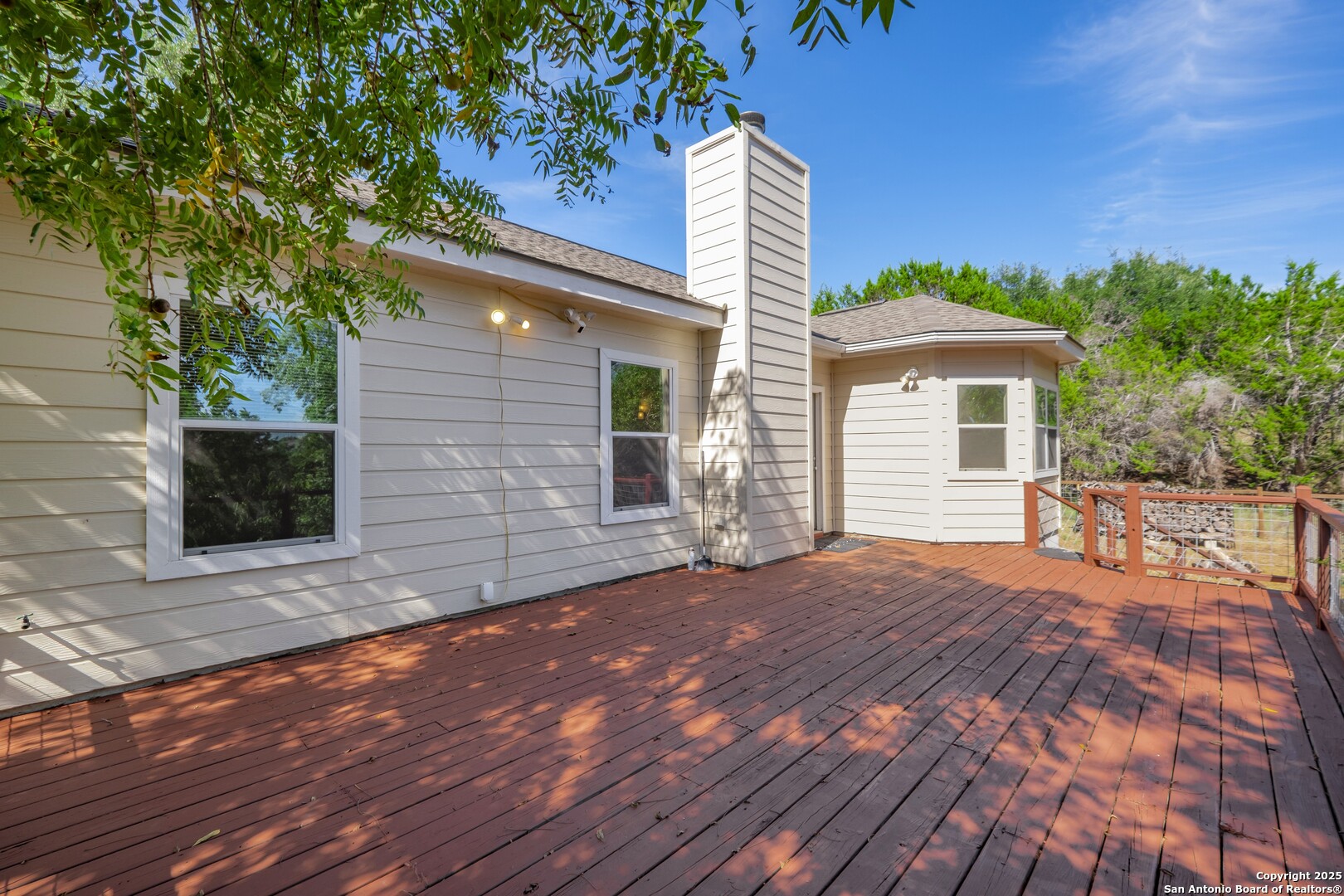 A Hill Country Treasure! This 3-bedroom, 2-bath home sits on a private and secluded 1.37-acre lot surrounded by mature trees, offering 1,745 sq. ft. of living space and a beautiful setting in the Texas Hill Country. The community provides exclusive riverfront access to the Guadalupe River, complete with a pavilion, tennis courts, basketball court, playground, and park, making it the perfect place to entertain family and friends. Inside, the open floor plan welcomes you with a foyer featuring crown molding and a formal dining room to the left, which can also be used as an office. The granite eat-in kitchen includes a breakfast bar and flows seamlessly into the large living room with a stone fireplace. Elegant coffered ceilings in the living room, kitchen, and breakfast nook add architectural charm and dimension. The split-bedroom design ensures privacy, with the primary suite tucked on one side of the home. The primary bedroom features crown molding, a spacious walk-in closet, and an ensuite bath with separate vanities, a garden tub, and a walk-in shower. Two additional bedrooms and a full bath are located on the opposite side of the home, with all bedrooms carpeted for comfort. Step outside to a huge deck overlooking the property and pond, where you can enjoy the serene natural surroundings and Hill Country views. With its tranquil setting, spacious design, and access to top-notch amenities, this property is the perfect blend of comfort, charm, and Texas Hill Country living. In front is the covered water pump in a dual-use shed/well-house. Put your imagination to work to make this flow with the rest of the property (no pun intended). If that weren't enough, this home is located in the sought-after area of The Crossing Mountain Creek that includes direct river access to the Guadalupe, picnic areas, tennis, basketball, clubhouse, and hiking to thoroughly enjoy living in the Texas Hill Country. With its tranquil setting, spacious design, and access to the river and more, this property is the perfect blend of comfort, charm, and Texas Hill Country living. Come take a tour, before it's gone!