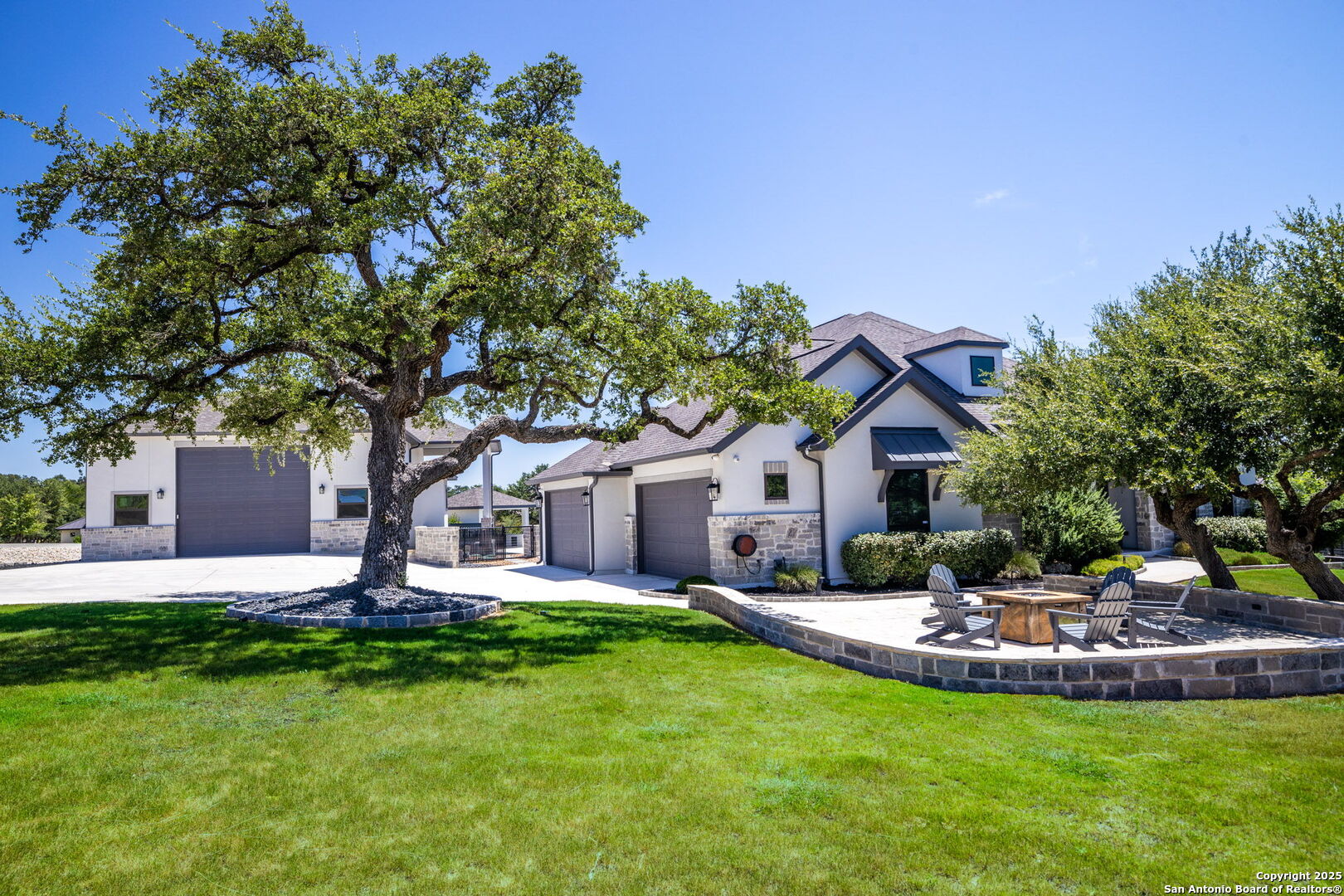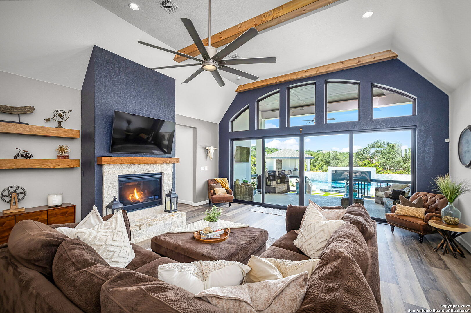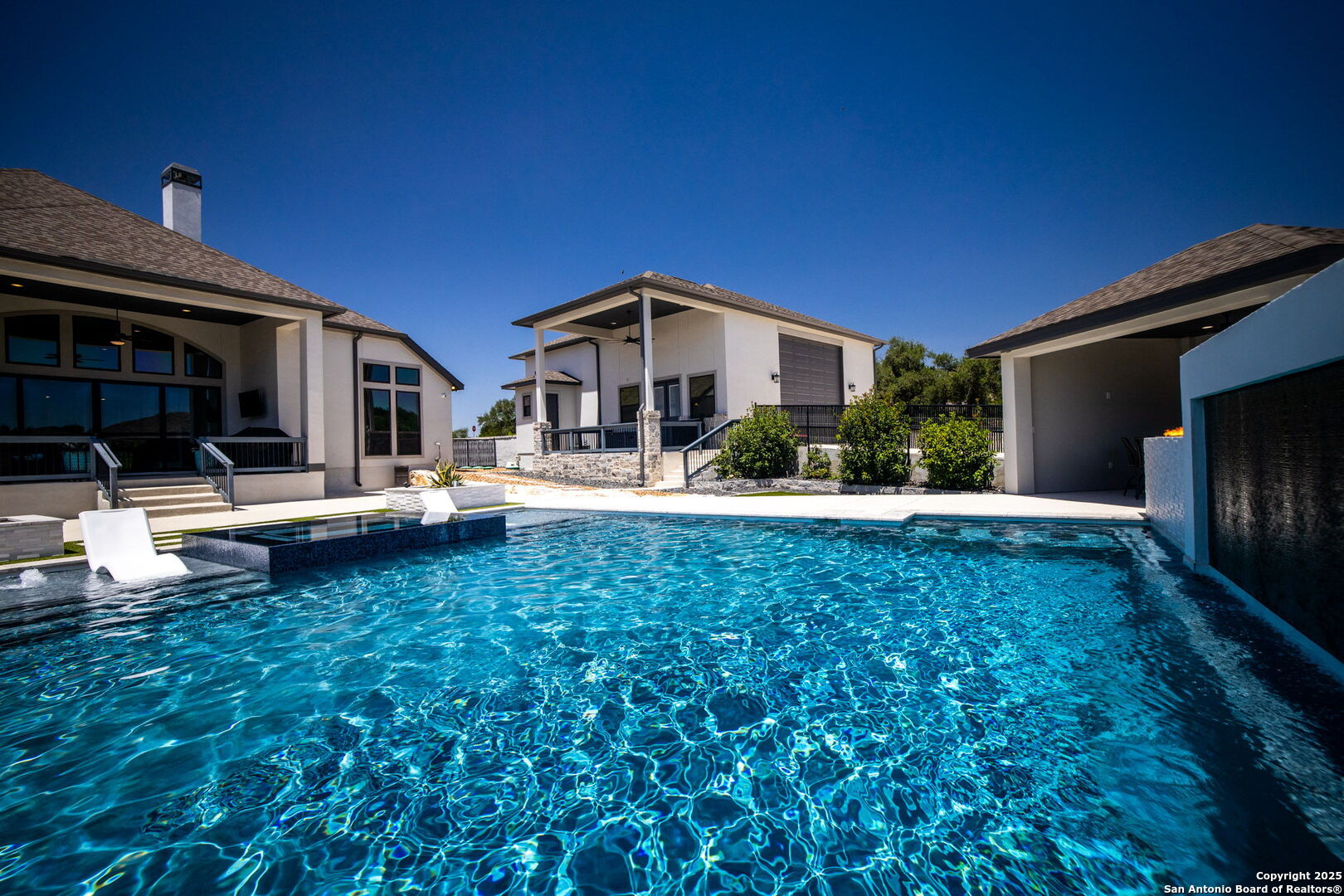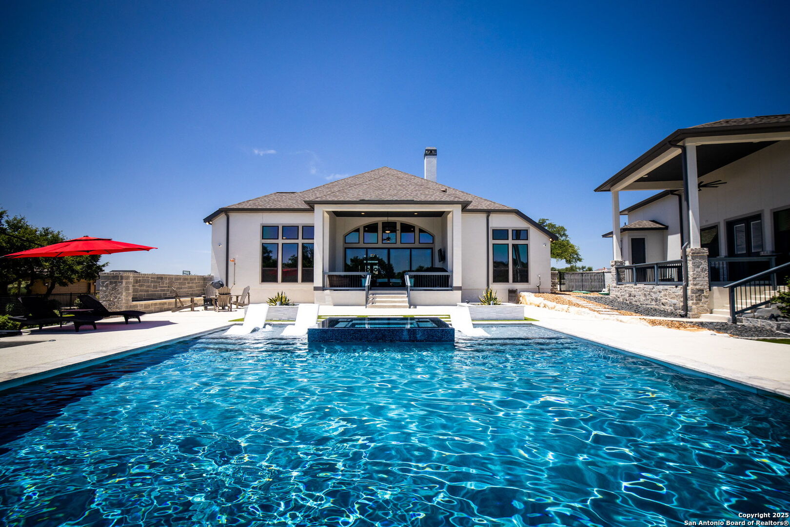 Welcome to an extraordinary Hill Country estate in the heart of the coveted Vintage Oaks community of New Braunfels, Texas-where luxury meets lifestyle and every inch is built for unforgettable entertaining. Spanning 3,856 square feet, this custom-designed residence is a true showpiece of refined design, comfort, and high-end functionality, set on a beautifully manicured lot that offers both privacy and grandeur. From the moment you arrive, you'll be captivated by the striking curb appeal, enhanced by warm stone accents, wooden beams, and inviting outdoor spaces that hint at the resort-style experience waiting inside. Step through the grand entryway and into a spacious open-concept layout filled with natural light, soaring ceilings, and exquisite finishes throughout. Rich wooden beams and not one, but two fireplaces bring warmth and architectural elegance, while a separate dining room and dedicated office provide ideal spaces for work, celebration, and everything in between. Designed with the entertainer in mind, the chef's kitchen is a culinary dream. Outfitted with beautiful appliances, gorgeous cabinetry, stone countertops, a spacious island, and thoughtful storage, it effortlessly blends form and function. Whether you're preparing an intimate dinner or hosting a festive gathering, this space delivers the style and flow to make it all seamless. The layout includes four spacious bedrooms, three full bathrooms, and two half baths, perfectly designed to accommodate guests while maintaining personal comfort. The primary suite is a retreat unto itself, offering spa-like serenity with an expansive ensuite bathroom, walk-in shower, dual vanities, and large walk-in closet. A dedicated media room provides the ultimate spot for movie nights or game day, rounding out the luxurious indoor experience. But the real magic begins when you step outside. Welcome to your personal backyard paradise-a true entertainer's dream. At the heart of it all is the resort-style pool, complete with swim-up barstools, a sun ledge, and an adjacent spa, all surrounded by thoughtfully designed multiple patios, a gazebo, and lush landscaping. The outdoor kitchen is ready for Texas-sized barbecues, complete with ample prep space and bar seating. Whether you're relaxing in the sun or hosting under the stars, this space offers the perfect balance of leisure and luxury. Car enthusiasts, hobbyists, or RV travelers will love the incredible 1,512-square-foot drive-through RV garage and workshop-a rare and coveted feature that adds significant value and versatility. In addition to that, you'll enjoy the convenience of a 4-car attached garage, giving you more than enough space for vehicles, gear, and storage. Situated in one of New Braunfels' most desirable neighborhoods, this home gives you access to all the award-winning Vintage Oaks amenities-resort-style pools, a state-of-the-art fitness center, sports courts, scenic nature trails, and a vibrant social calendar that makes this community feel like home the moment you arrive. Whether you're enjoying a quiet morning coffee under the patio beams, gathering around the pool for sunset cocktails, or simply soaking in the tranquil Hill Country setting, this one-of-a-kind home offers a lifestyle unlike any other. Schedule your private showing today and experience what it means to live, entertain, and unwind in true Hill Country luxury.