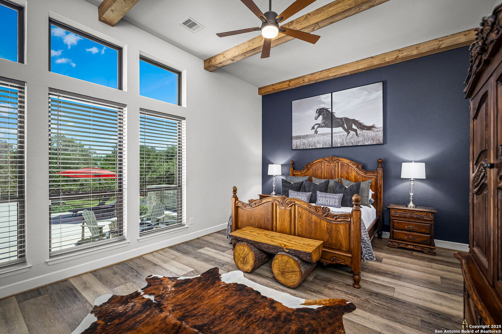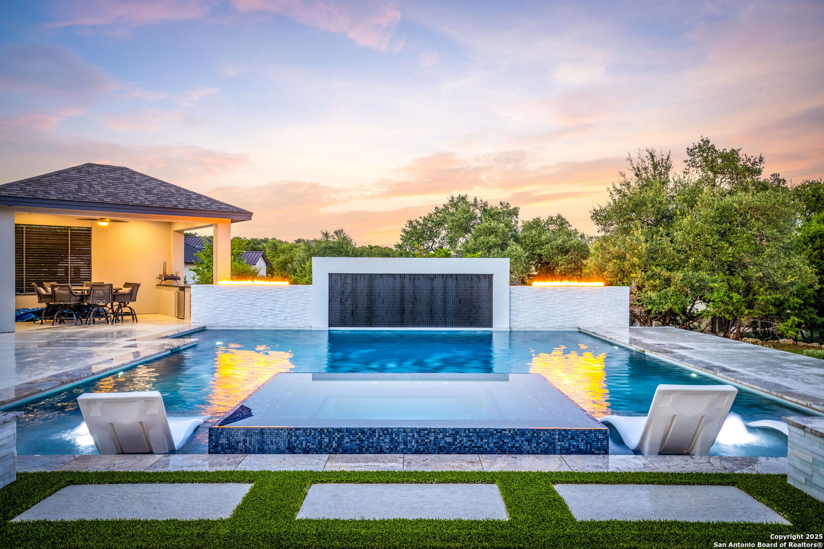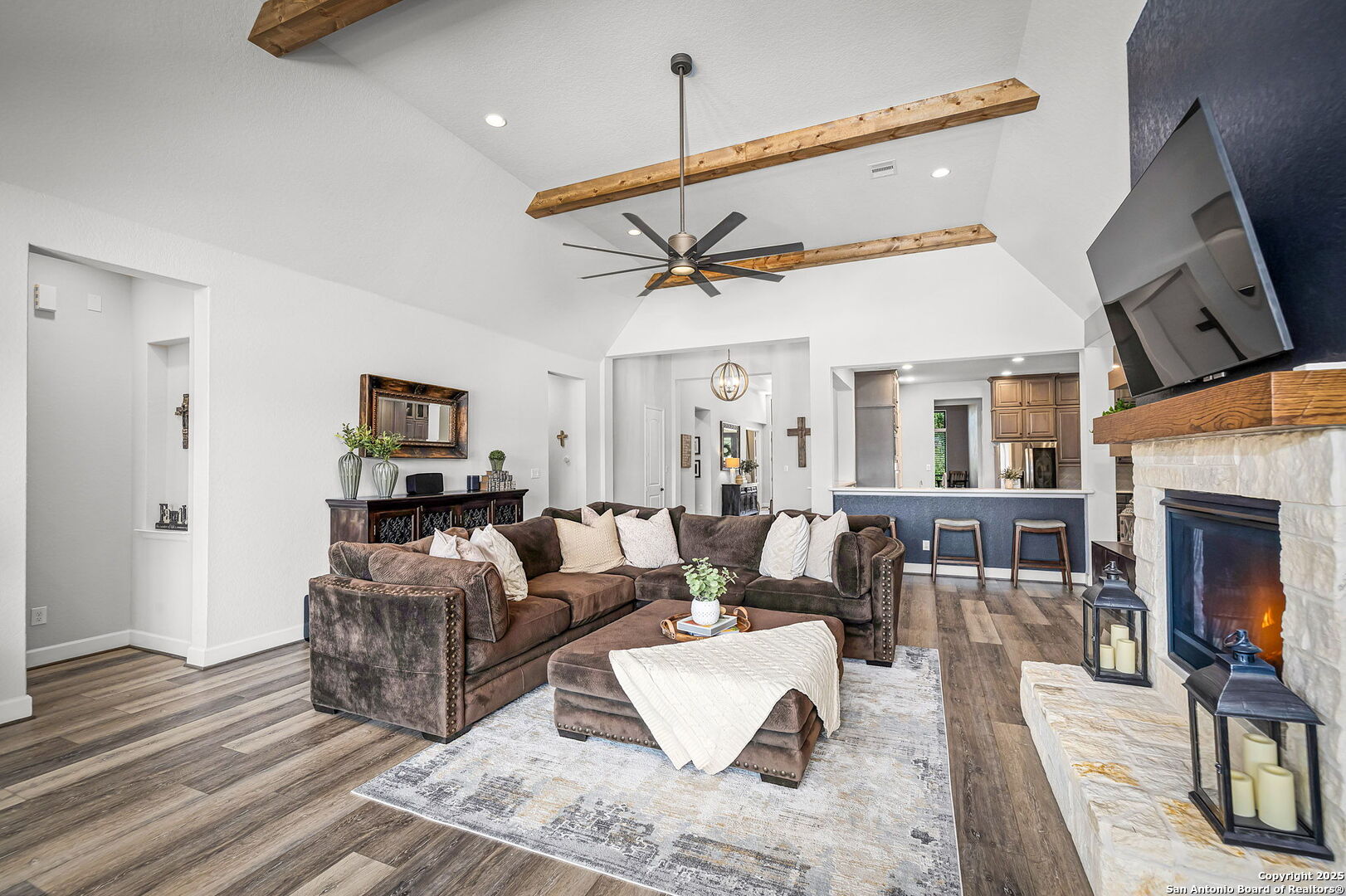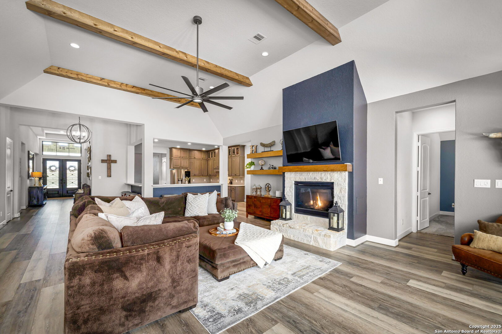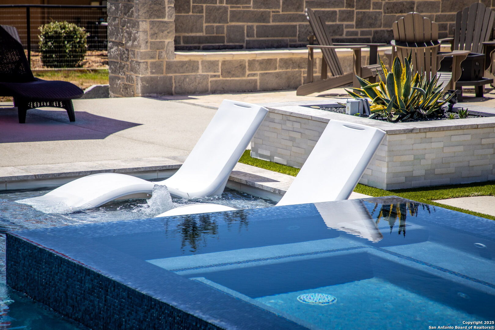 Welcome to an extraordinary Hill Country estate in the heart of the coveted Vintage Oaks community of New Braunfels, Texas-where luxury meets lifestyle and every inch is built for unforgettable entertaining. Spanning 3,856 square feet, this custom-designed residence is a true showpiece of refined design, comfort, and high-end functionality, set on a beautifully manicured lot that offers both privacy and grandeur. From the moment you arrive, you'll be captivated by the striking curb appeal, enhanced by warm stone accents, wooden beams, and inviting outdoor spaces that hint at the resort-style experience waiting inside. Step through the grand entryway and into a spacious open-concept layout filled with natural light, soaring ceilings, and exquisite finishes throughout. Rich wooden beams and not one, but two fireplaces bring warmth and architectural elegance, while a separate dining room and dedicated office provide ideal spaces for work, celebration, and everything in between. Designed with the entertainer in mind, the chef's kitchen is a culinary dream. Outfitted with beautiful appliances, gorgeous cabinetry, stone countertops, a spacious island, and thoughtful storage, it effortlessly blends form and function. Whether you're preparing an intimate dinner or hosting a festive gathering, this space delivers the style and flow to make it all seamless. The layout includes four spacious bedrooms, three full bathrooms, and two half baths, perfectly designed to accommodate guests while maintaining personal comfort. The primary suite is a retreat unto itself, offering spa-like serenity with an expansive ensuite bathroom, walk-in shower, dual vanities, and large walk-in closet. A dedicated media room provides the ultimate spot for movie nights or game day, rounding out the luxurious indoor experience. But the real magic begins when you step outside. Welcome to your personal backyard paradise-a true entertainer's dream. At the heart of it all is the resort-style pool, complete with swim-up barstools, a sun ledge, and an adjacent spa, all surrounded by thoughtfully designed multiple patios, a gazebo, and lush landscaping. The outdoor kitchen is ready for Texas-sized barbecues, complete with ample prep space and bar seating. Whether you're relaxing in the sun or hosting under the stars, this space offers the perfect balance of leisure and luxury. Car enthusiasts, hobbyists, or RV travelers will love the incredible 1,512-square-foot drive-through RV garage and workshop-a rare and coveted feature that adds significant value and versatility. In addition to that, you'll enjoy the convenience of a 4-car attached garage, giving you more than enough space for vehicles, gear, and storage. Situated in one of New Braunfels' most desirable neighborhoods, this home gives you access to all the award-winning Vintage Oaks amenities-resort-style pools, a state-of-the-art fitness center, sports courts, scenic nature trails, and a vibrant social calendar that makes this community feel like home the moment you arrive. Whether you're enjoying a quiet morning coffee under the patio beams, gathering around the pool for sunset cocktails, or simply soaking in the tranquil Hill Country setting, this one-of-a-kind home offers a lifestyle unlike any other. Schedule your private showing today and experience what it means to live, entertain, and unwind in true Hill Country luxury.