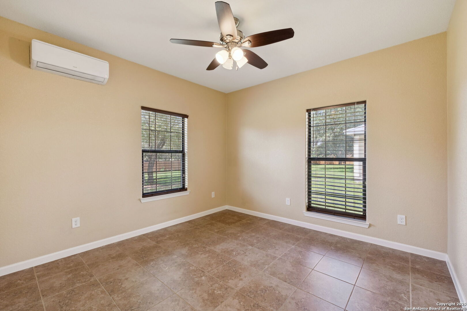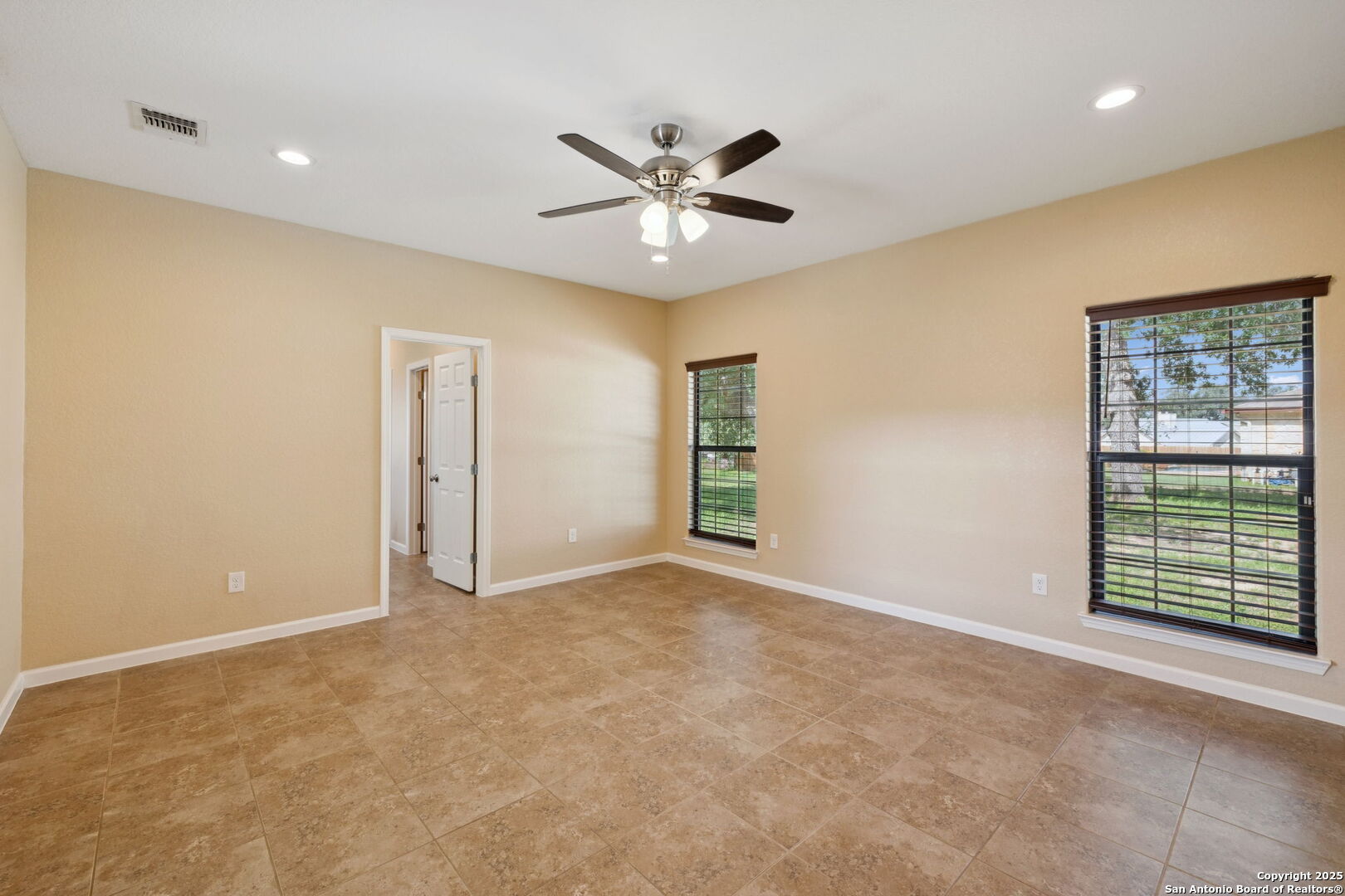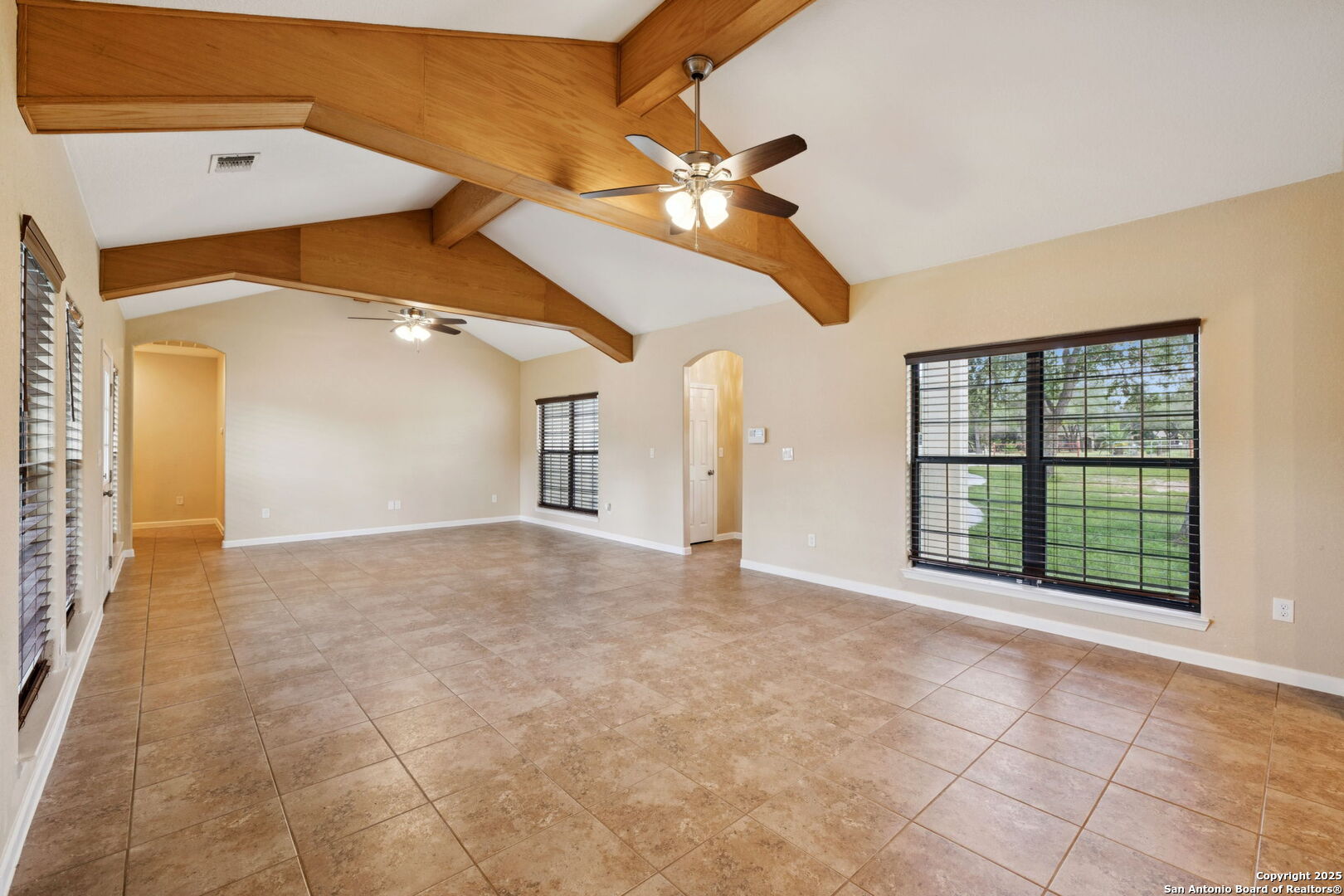 Welcome to this gently lived-in Texas ranch, nestled on 1.5 acres filled with mature trees and serene scenery. This single-story home features 5 bedrooms, 2.5 bathrooms, and offers just under 2,600 square feet of comfortable living space-all with no carpet! Primary bedroom includes a walk in closet with his/hers vanity and privacy access to the back porch. Enjoy high ceilings and an abundance of windows throughout, allowing natural light to flow freely. The open-concept living area includes an upgraded feature of all-natural wood beams, with easy access to the covered back porch-perfect for entertaining or simply relaxing. The kitchen includes a brand new dishwasher and gas stove for the cook enthusiast. A long driveway provides ample parking for family and guests. Conveniently located just 10 minutes from local dining and shopping, you can enjoy country living with city convenience at your disposal.