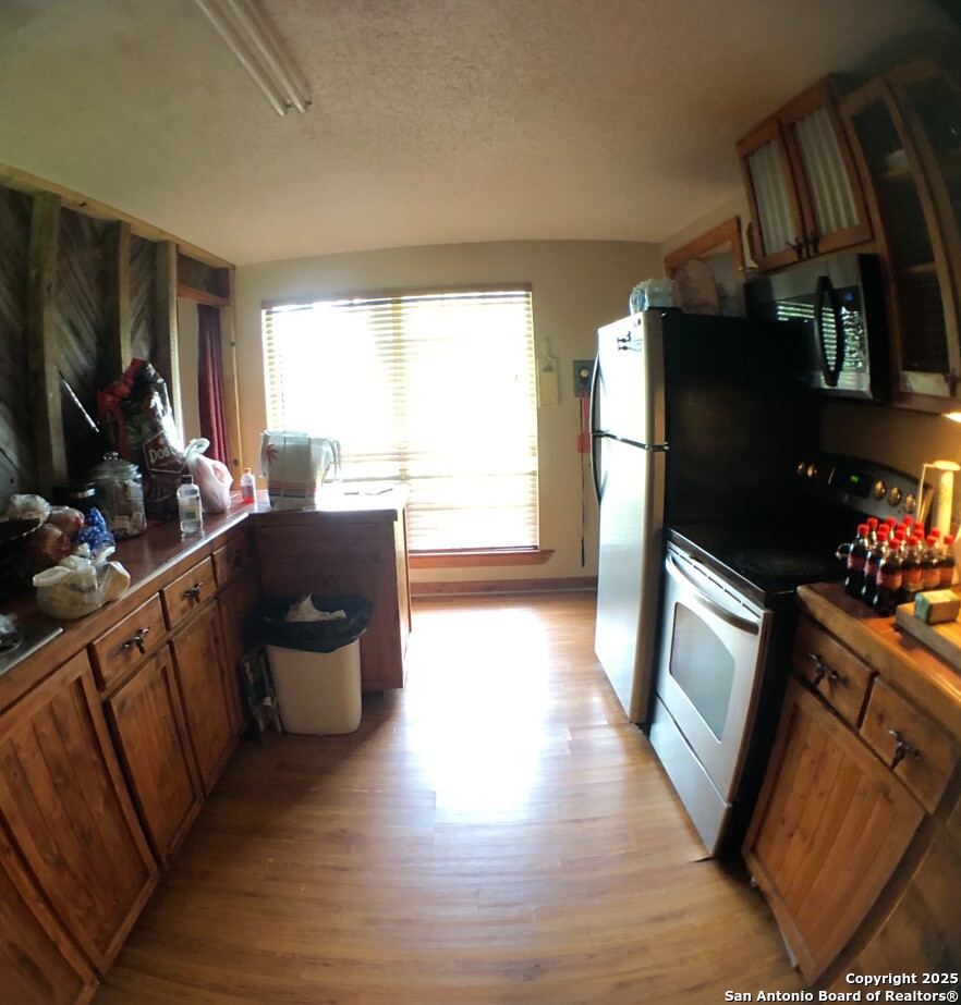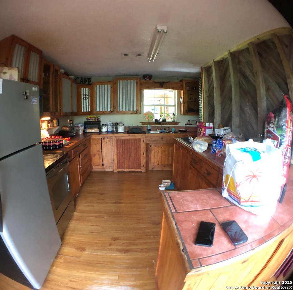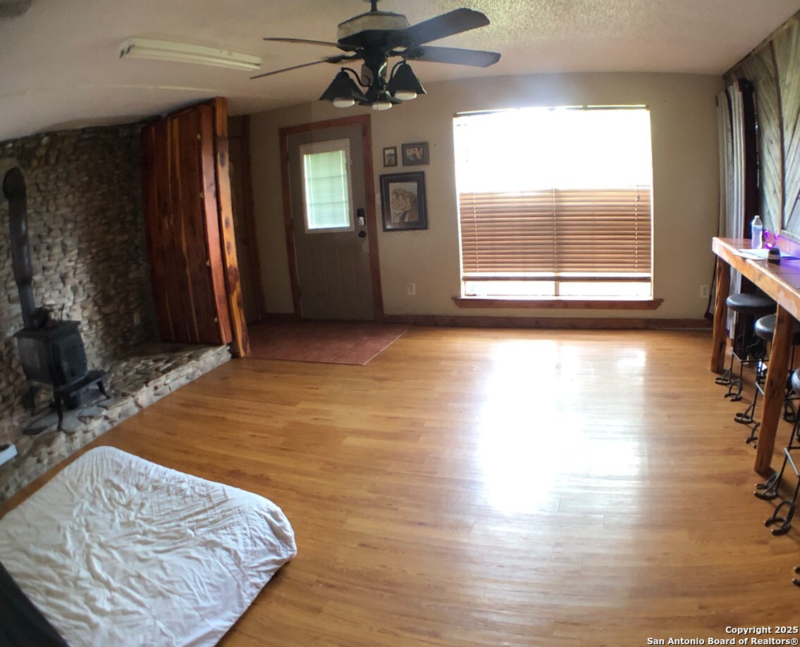 Escape to peaceful Hill Country living on this beautifully maintained 5.37-acre property just minutes from Center Point and Kerrville. This spacious 2-bedroom, 1.5-bath home offers over 2,000 sq ft of open-concept living with a covered deck, stunning hill views, and room to roam. Inside, enjoy a bright and functional layout with tile and hardwood floors, a walk-in closet, pantry, jetted tub, laundry room, and cozy wood/pellet stove. The property includes a spa/hot tub, workshop space, gated entry, and ample off-street parking for up to 20 vehicles. No HOA, low 2024 taxes, and room for your animals, garden, or future expansion. Perfect for full-time living, rental income, or a serene weekend retreat in the heart of the Hill Country.