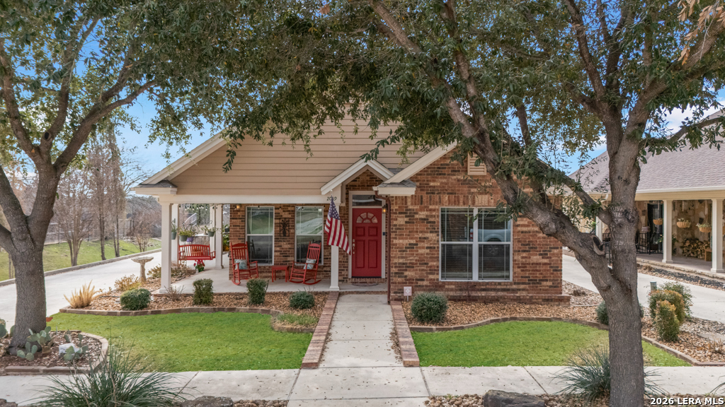 Live the Gruene lifestyle in highly sought-after Cotton Crossing. Welcome to one of the most desirable pocket neighborhoods in historic Gruene. Sidewalks for safety. Just a short golf cart ride away, you'll find Gruene Hall, boutique shopping, iconic landmarks and some of the area's best wineries and restaurants. This unique home is perfectly positioned on a private corner lot with expansive greenspace behind. The wraparound covered porch creates multiple spaces to relax. Start your mornings with coffee in a rocking chair as the sun rises, then unwind in the evening on the side porch with wine, grilling, and sunset views. The spacious open-concept living room features tall, coffered ceilings and flows seamlessly into the dining area. The island kitchen has granite counter space, extensive cabinetry, and stainless-steel appliances. The split master features rich wood flooring, a cozy sitting area, and direct access to the fenced backyard-ideal for letting pets out with ease. Primary bath includes oversized walk-in shower, as well as a safe step-in tub Dual granite undermount vanities. Two walk-in closets. Two additional bedrooms with wood flooring are located off the entry and offer generous closet space. A shared full bath provides ample counter space and cabinetry. Upstairs, you'll find a versatile space with a full bath and large closet. Whether you need a private office, guest suite, media room or playroom, this space adapts. Built-in cabinetry provides excellent storage for supplies or hobbies.The backyard patio is ready for relaxing evenings-and could easily accommodate a hot tub under the stars. This pool-ready yard offers a rare opportunity within Cotton Crossing. Mature shade trees across the parkway provide welcome relief during hot Texas summers. Need serious storage space? The 24' x 29' garage offers approximately 729 square feet (per recent appraisal), providing room for large vehicles, a golf cart, kayaks, bikes, and more. Homes in Cotton Crossing with this combination of privacy, flexibility, storage, and outdoor living are rare. Don't miss the opportunity to experience the best of Gruene living. HOA residents only, Guadalupe River access across Gruene Road.