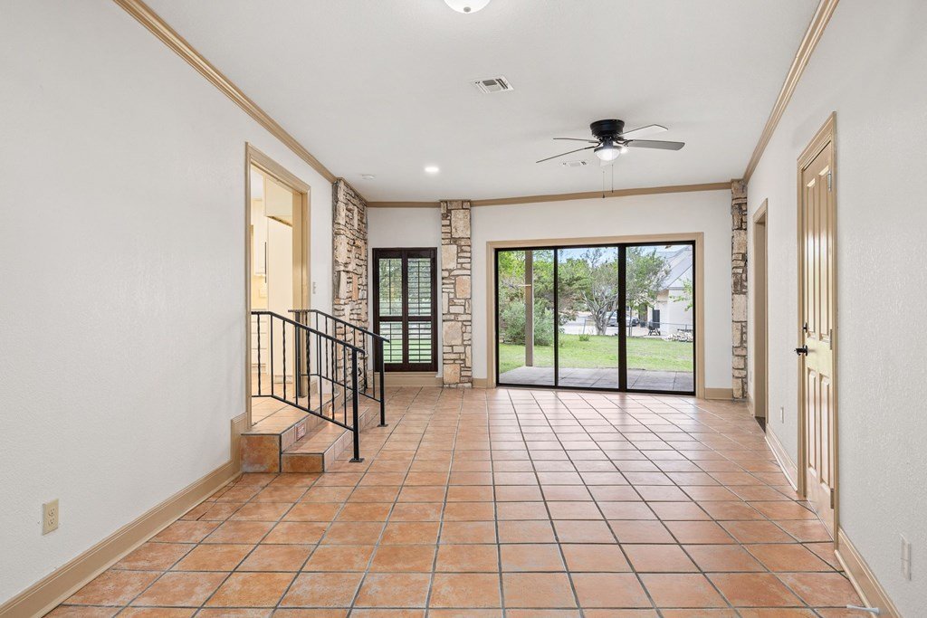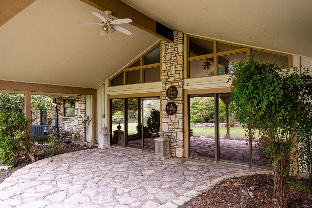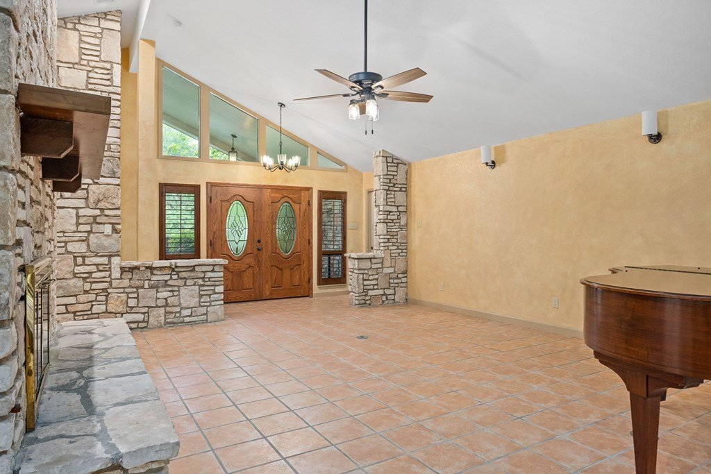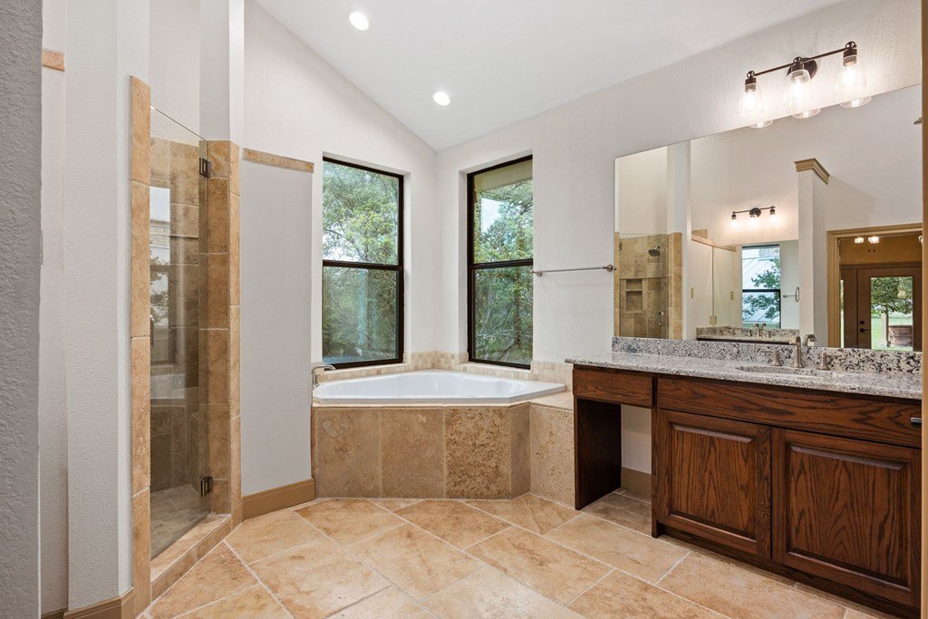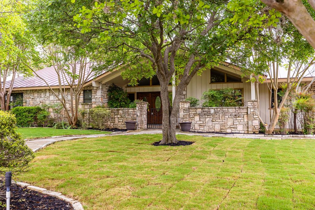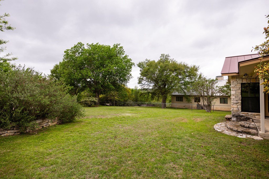 Beautiful single-story home in the desirable Riverhill community, offering classic Hill Country charm and spacious living. This 4-bedroom, 3.5-bath home features a primary suite addition with a private sitting area and an updated bath with walk-in shower and soaking tub. The main living area showcases vaulted ceilings, a striking floor-to-ceiling stone fireplace, and large windows that bring in abundant natural light. The kitchen is equipped with granite countertops, ample cabinetry, and an eat-in bar, making it ideal for both everyday living and entertaining. A dedicated dining area adds additional flexibility for gatherings. Additional highlights include walk-in closets, a large laundry room with a built in desk with granite top, and generous storage throughout. Step outside to a covered patio overlooking an oversized backyard filled with mature trees, offering shade and plenty of room to enjoy the outdoors. Ideally located in Riverhill, this home combines comfort, character, and a great location.