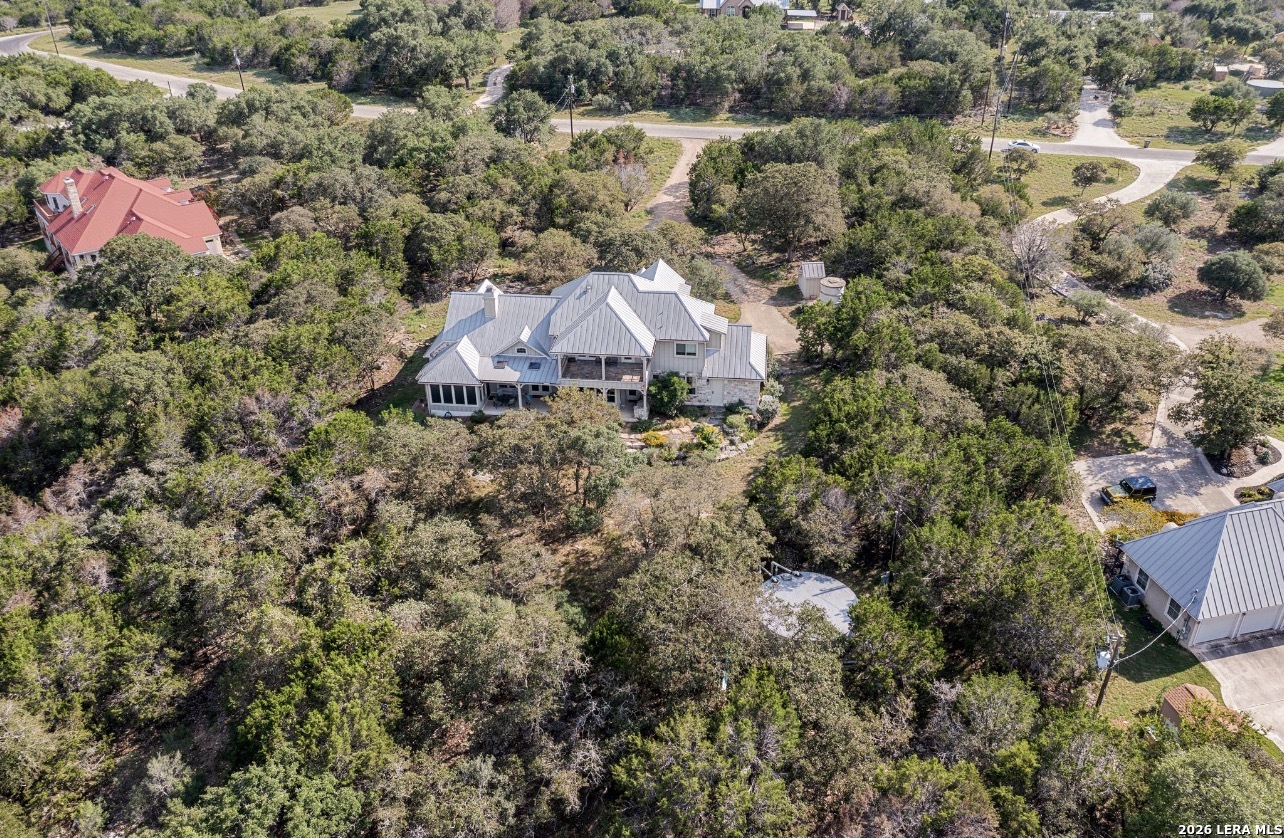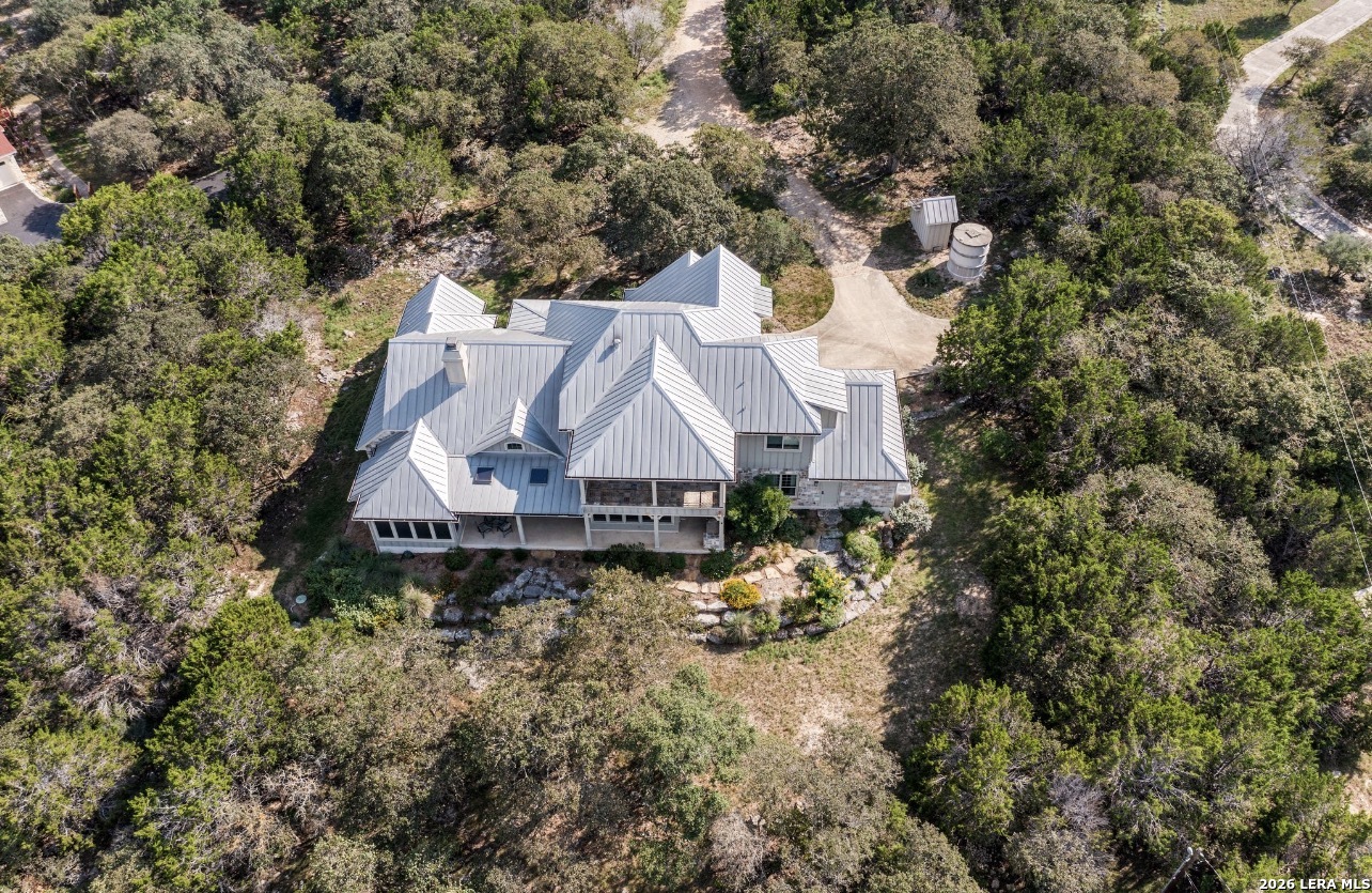 Designed by Israel Pena, this custom residence in River Mountain Ranch delivers refined Hill Country living. Built in 2010 and set on 3.93 acres, the 4,267-square-foot home offers 4 bedrooms, 3 1/2 baths, and thoughtfully designed living spaces that balance comfort and scale. A welcoming foyer opens to a bright, expansive living room with soaring ceilings and a statement fireplace. The chef's kitchen features premium appliances, a large island, walk-in pantry, and flows seamlessly into a light-filled breakfast area overlooking the landscape. The main-level primary suite is a private retreat with direct access to the oversized screened porch. The spa-inspired bath includes dual vanities, a walk-in shower, and a soaking tub. A secondary bedroom and full bath are also conveniently located downstairs. Upstairs, you'll find two additional bedrooms, a full bath, a spacious study, and a game room with balcony access capturing sweeping Hill Country views. Outdoors, the expansive back porch invites year-round entertaining and quiet evenings, all centered around the rare luxury of private river access. Modern Hill Country design, generous proportions, and seamless indoor-outdoor living define this exceptional property.