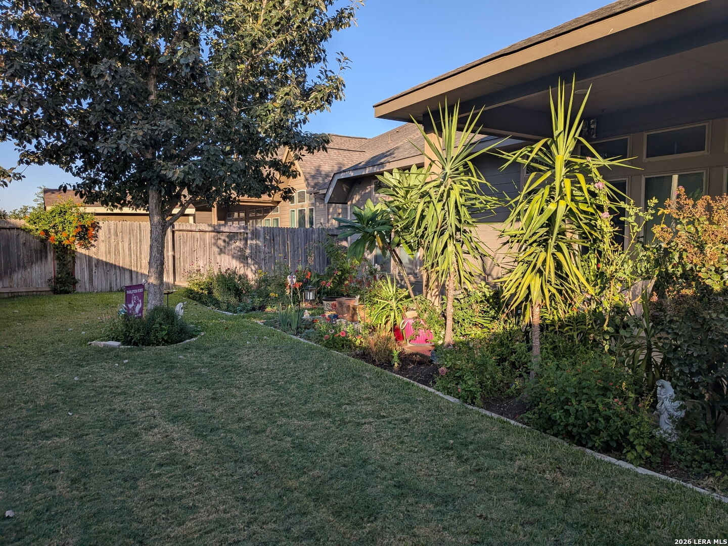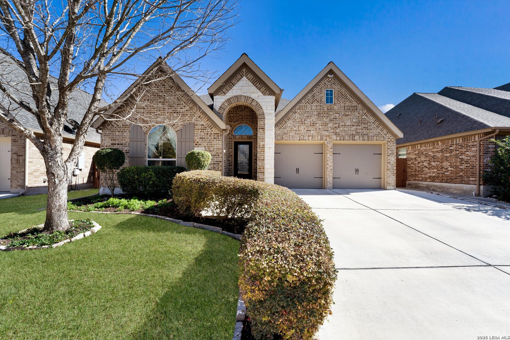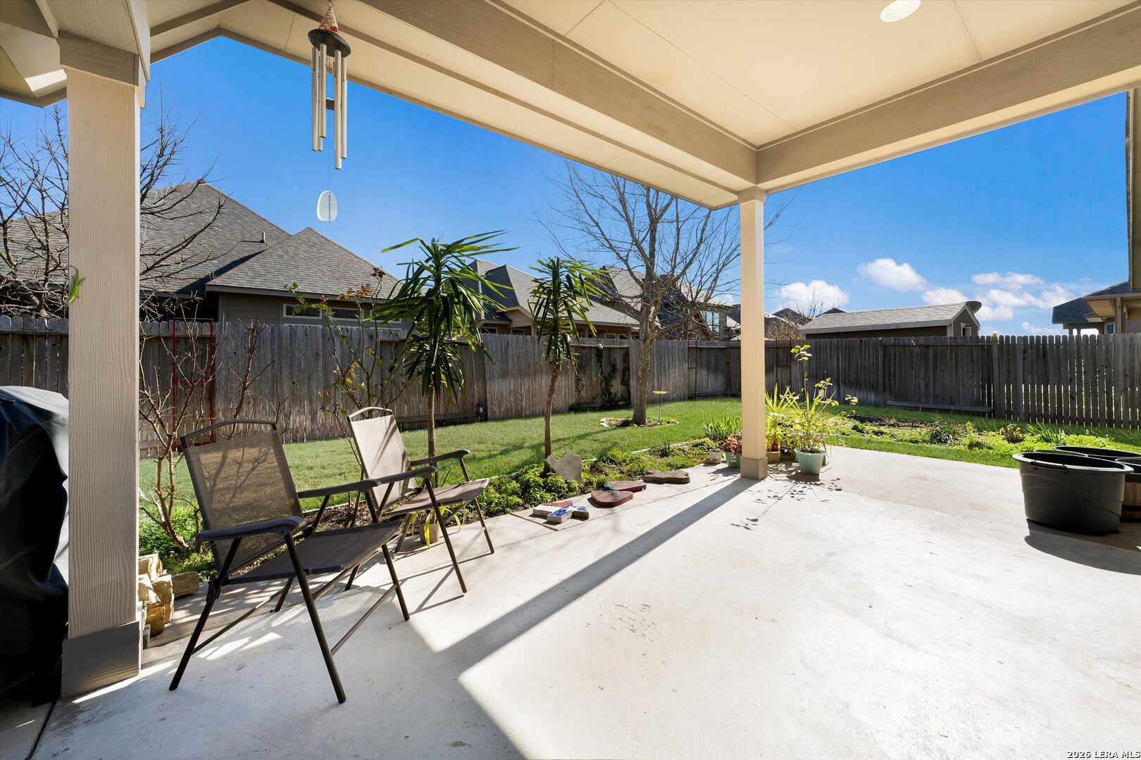 Welcome to this beautifully maintained one-story home in Mill Creek Crossing, ideally located between New Braunfels and Seguin with convenient access to I-10. From the moment you arrive, the exceptional curb appeal stands out - enhanced landscaping, mature greenery, and thoughtful exterior details set this home apart from others in the community. Inside, you're greeted by a grand entry that opens into a spacious, light-filled floorplan designed for both everyday comfort and effortless entertaining. The open-concept living, dining, and kitchen areas create a seamless flow, highlighted by tile flooring in main areas and durable luxury vinyl plank throughout for both style and functionality. This thoughtfully designed layout offers three bedrooms, two bathrooms, and a dedicated study - ideal for working from home, a playroom, or flex space. The primary suite is a true retreat, featuring split vanities, separate his-and-her walk-in closets, and ample space to unwind. Step outside to an extended covered patio - a unique upgrade not commonly found in the neighborhood - overlooking a private backyard complete with fruit trees, a small garden area, and additional side walkways for ease and convenience. Whether relaxing in the shade or tending to the garden, this outdoor space offers both charm and versatility. The tandem three-car garage provides exceptional parking and storage options, along with attic access featuring plywood decking for substantial additional storage. Meticulously cared for and move-in ready, this home offers comfort, upgrades, and functionality in one of the area's growing communities.