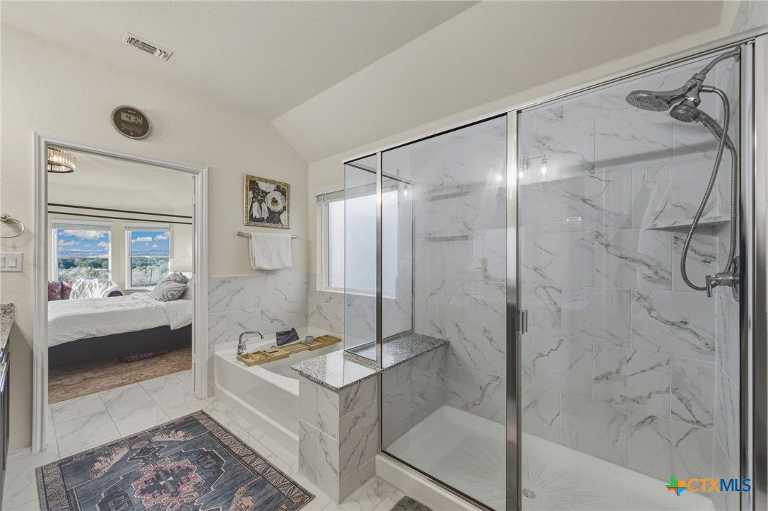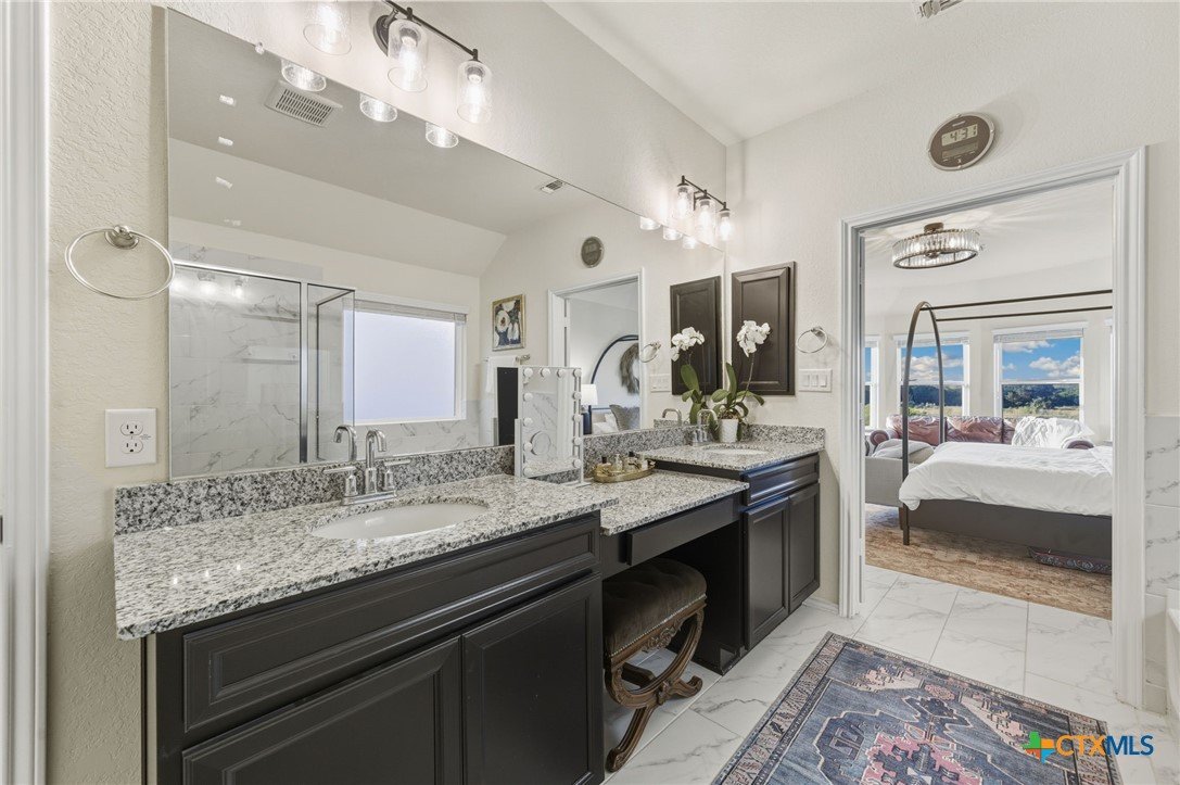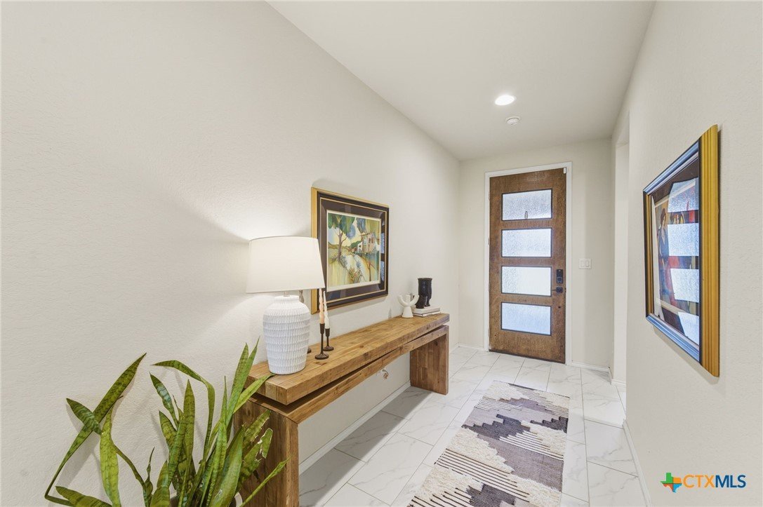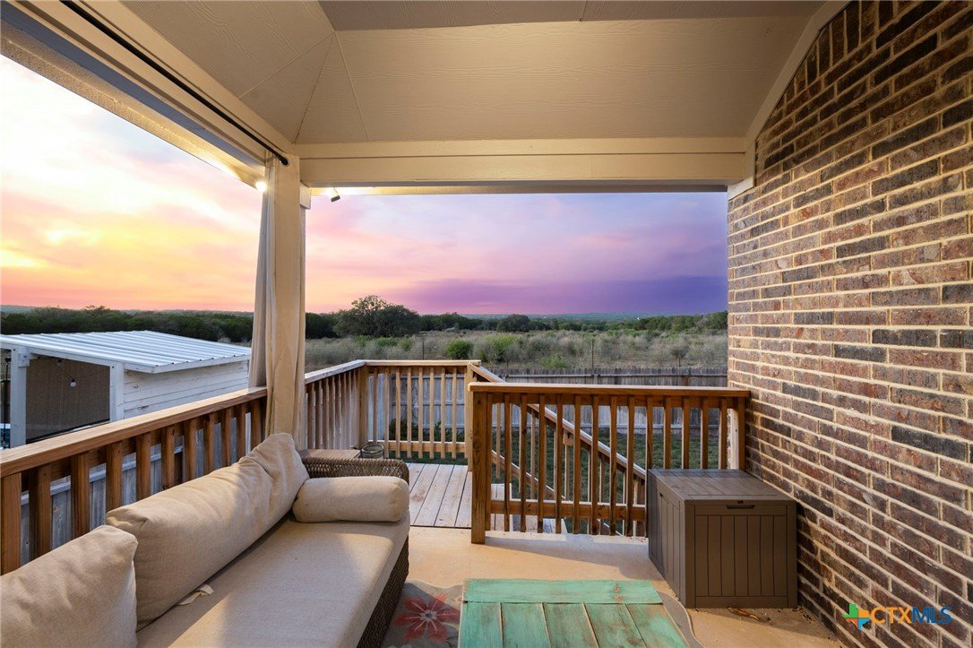 Welcome to this beautifully maintained 4 bedroom, 2 bath Pulte home in the highly sought-after Veramendi community. Built in 2023, this spacious one-story offers 2,129 sq ft of comfortable, open-concept living with thoughtful design throughout. One of the standout features of this property is its rare homesite, backing to private land with no current rear neighbors, providing an exceptional sense of privacy and peaceful Hill Country views. The heart of the home is the bright and inviting kitchen, featuring a large island, gas cooking, stainless steel appliances, and plenty of cabinet and counter space. The kitchen opens seamlessly into the dining area and living room, where abundant natural light and a cozy fireplace create the perfect setting for everyday living and gathering. The private primary suite is generous in size, offering space for a seating area and a bay window that frames scenic views. The ensuite bath includes a soaking tub, separate shower, and double vanity. The home also features four dedicated coat, storage, and utility closets that provide exceptional organization and convenience throughout the layout. Three secondary bedrooms offer flexibility for guests, office space, or hobbies. Additional highlights include tile flooring in main areas, carpet in bedrooms, a water softener, and a covered back patio overlooking the fully fenced yard. Located in Veramendi, residents enjoy access to community amenities including a pool, multiple parks, playgrounds, and walking trails, all within minutes of schools, shopping, and dining in New Braunfels. This home combines modern comfort, thoughtful design, and a rare private setting. Do not miss the opportunity to make it yours.