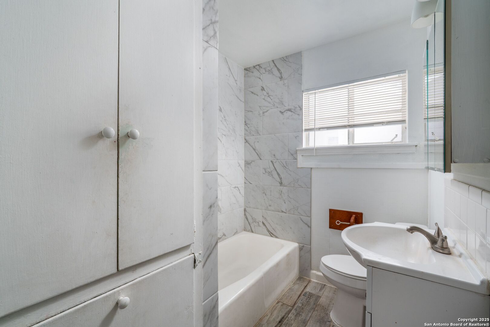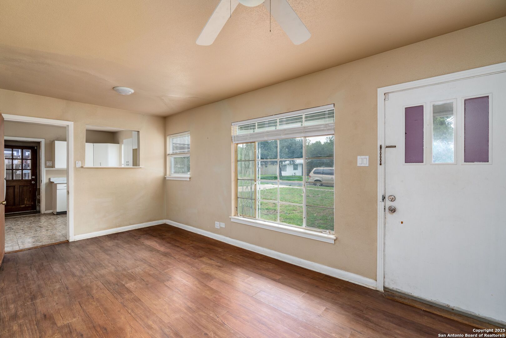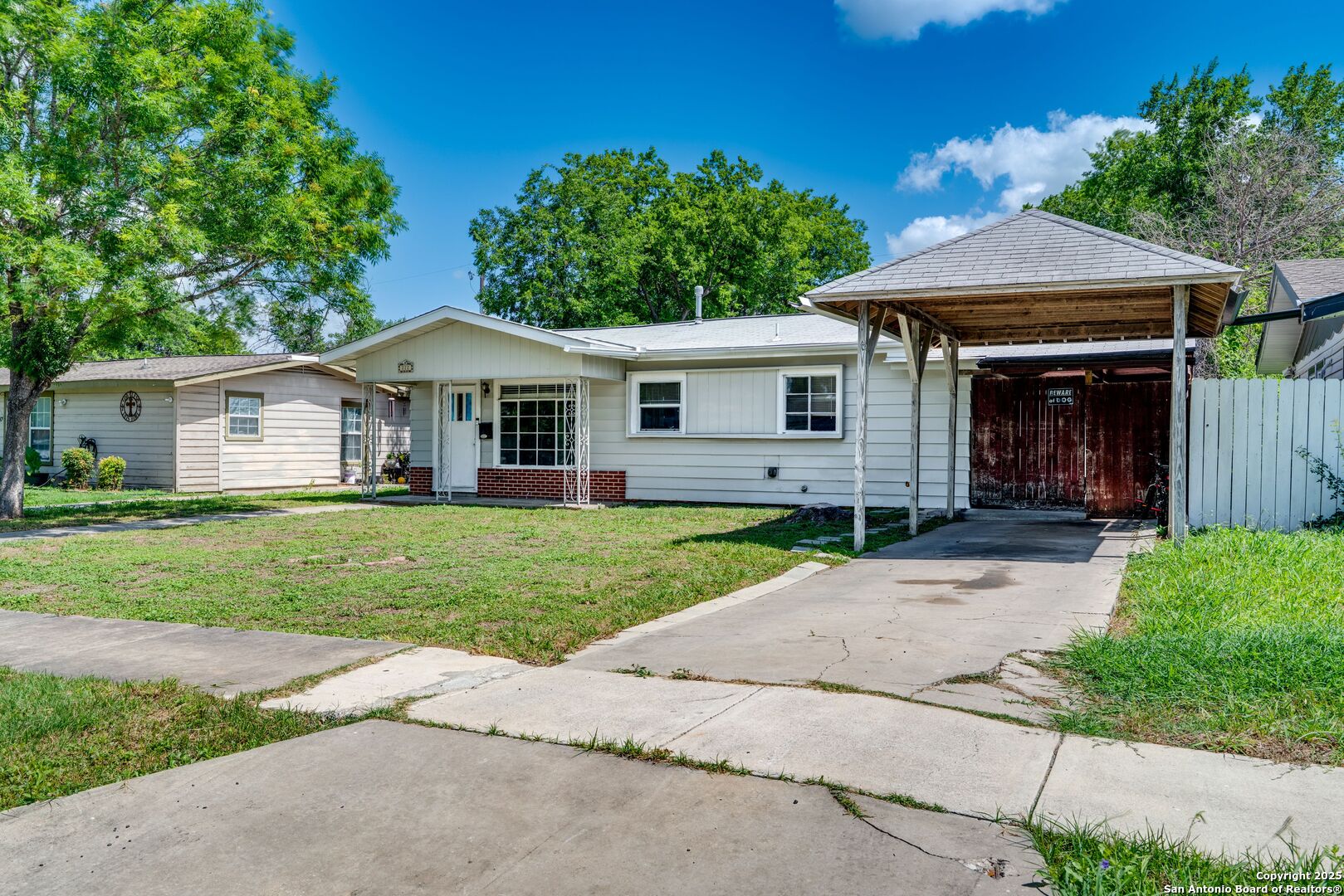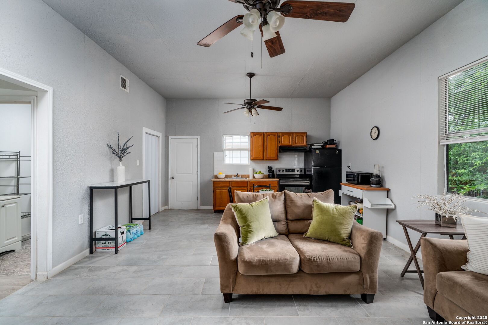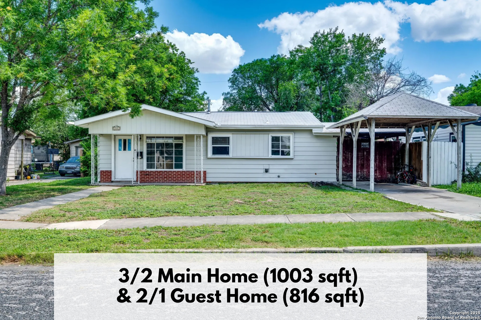 A rare chance to secure two thoughtfully arranged homes on one well-kept lot in Green Meadow. Together they provide approximately 1,819 square feet: a three-bedroom, two-bath main residence and a private two-bedroom, one-bath guest house-ideal for guests, a home office, or additional rental income. Inside the primary home, durable tile & vinyl-plank flooring ties together the open living-dining space and a roomy eat-in kitchen-the natural hub for daily routines. The primary suite enjoys a functional walk-in-closet and spacious bathroom, while two secondary bedrooms share an upscale bathroom with a tiled shower. Steps away, the additional two-bedroom casita features its own entrance, a cheerful kitchen, and spacious living+dining room-ready for tenants, guests, or a quiet office/studio. Both structures share a level 0.16-acre homesite with city utilities, no HOA restrictions, and easy access to Loop 410, downtown, and the airport.