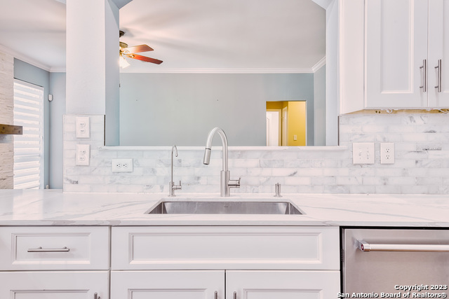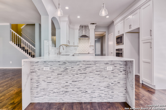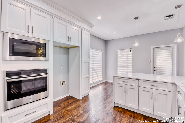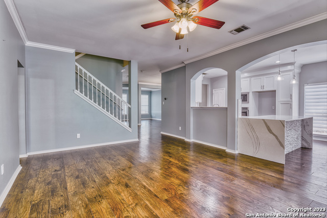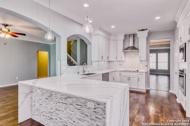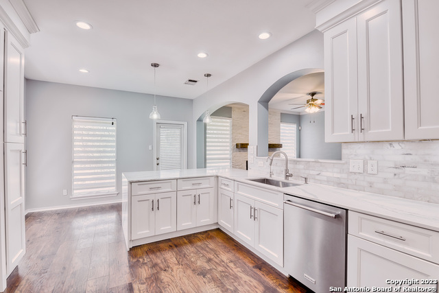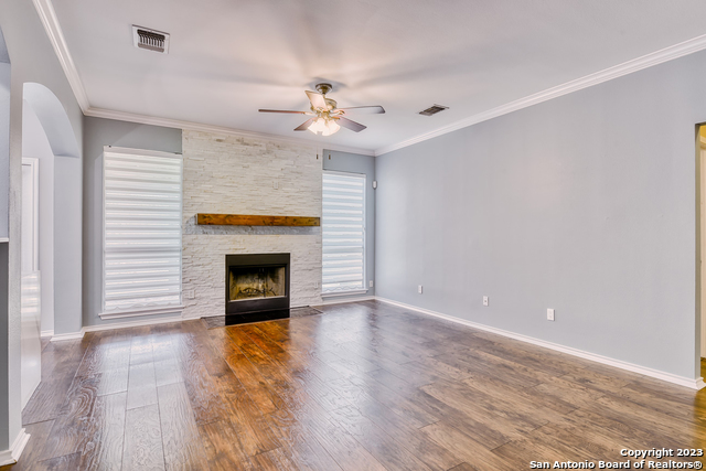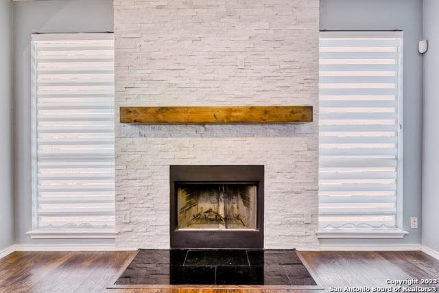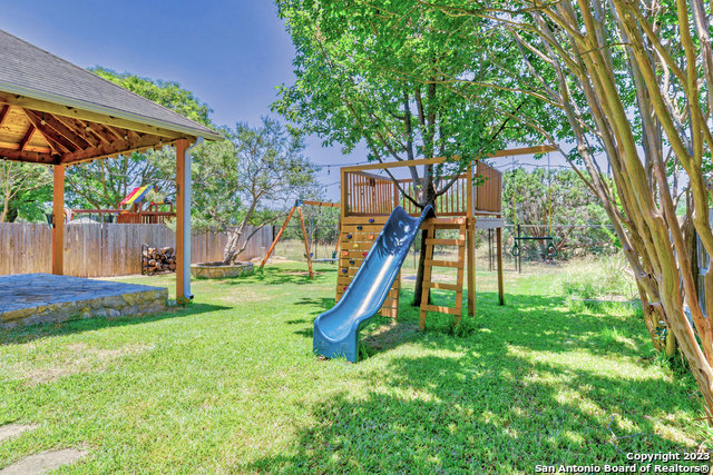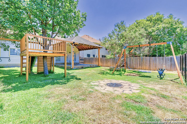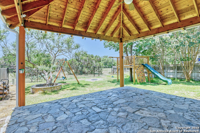 Welcome to the gated Wilderness Pointe at Stone Oak, highly sought after area with top schools! Kitchen, all 3 bathrooms and fireplace are completely remodeled, plus many enhancements in and out of this beautiful home is ready to welcome you! Custom soft close cabinets, quartz countertops, breakfast bar, reverse osmosis water filter, built in oven and microwave offers you quality time in kitchen. This 3028 sf high ceiling spacious home has 3 bedrooms, 2 and a half bath, office/4th bedroom, 2 living rooms, formal and family dining, utility room and 2 car garage. Laminate wood flooring all around the first floor, owned water softener, sprinkler system, wood burning fireplace, front porch, backing to greenbelt are just some of the features. Mature trees at front and back including crape myrtle and vitex trees with amazing flowers in season. Custom made tree house with slide, climbing wall, rope, monkey bar and large swing set with 3 options is just full of fun for kids to spend great time in outdoor at the backyard. Huge covered patio offers you to enjoy amazing views of the Panther Springs Park through the chain wire fence, your backyard neighbor is the nature! Gated community, right on Wilderness Oak. This well maintained and cared home is a rare find! Schedule your showing today, come and see for yourself! *Pet allowance is on case-by-case basis.