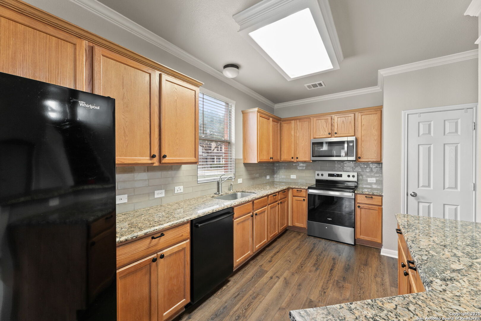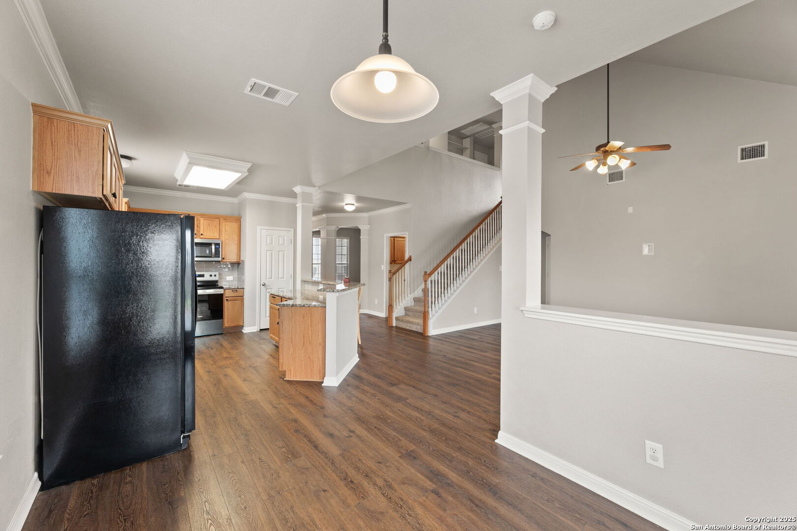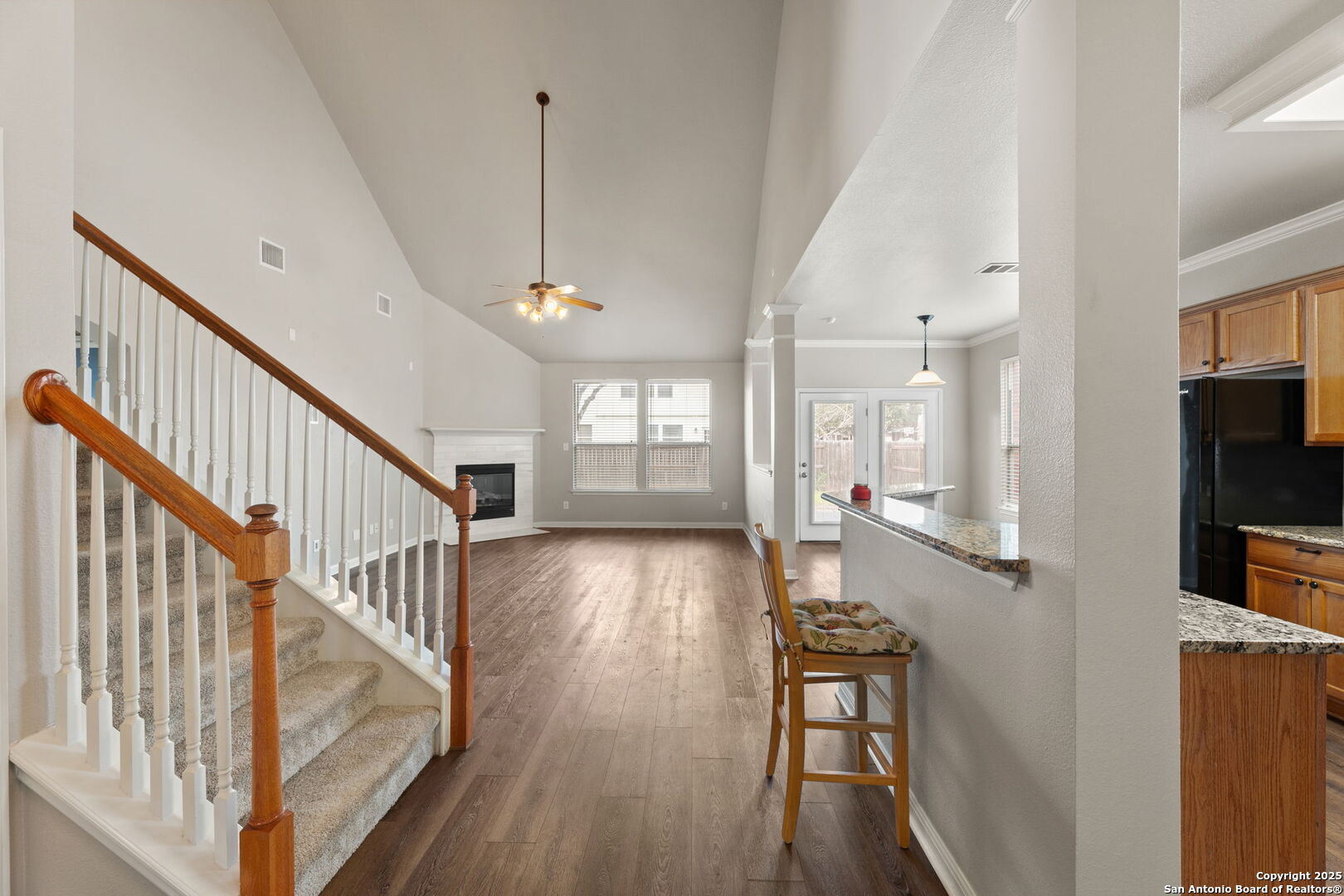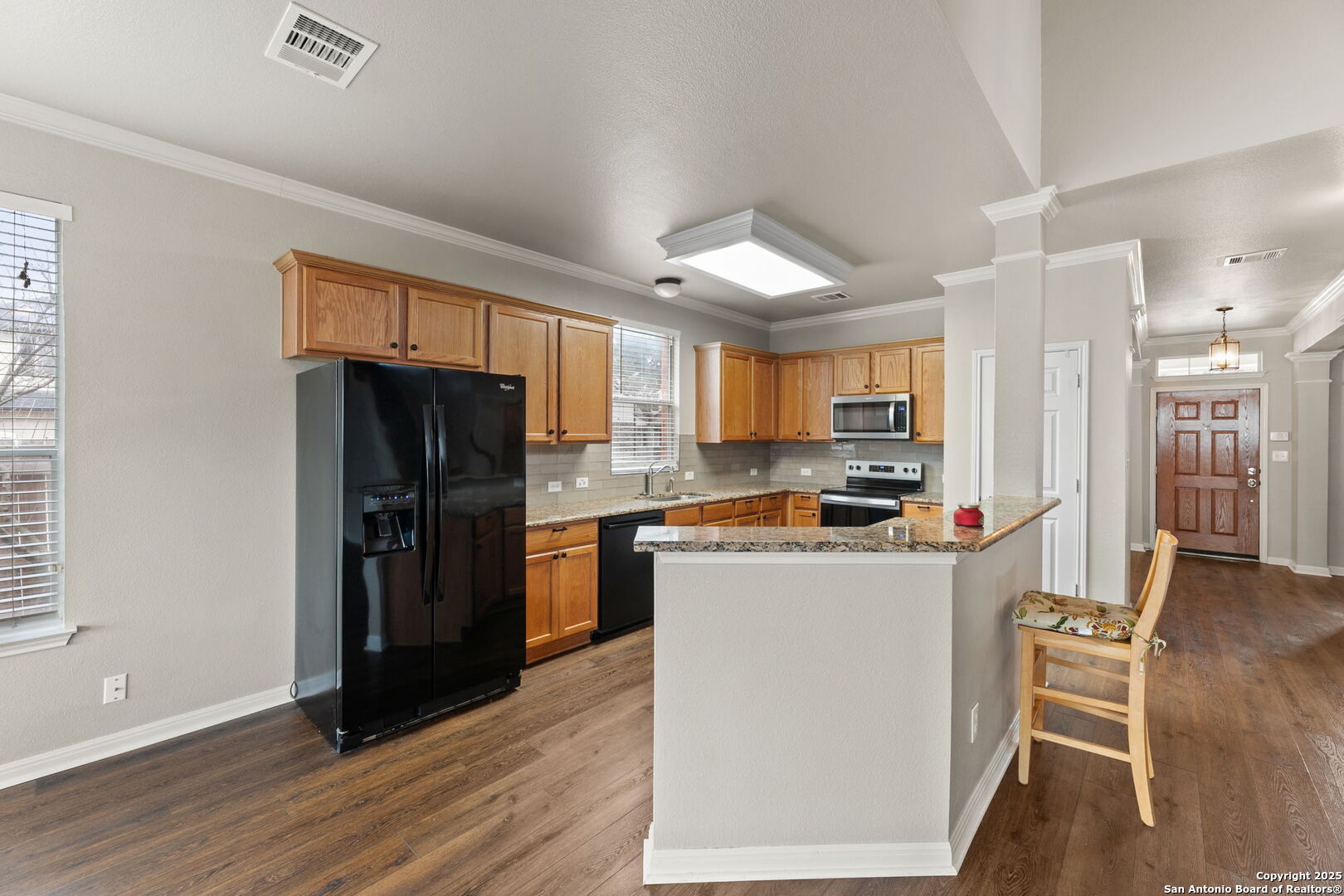 This beautifully designed David Weekly home is situated on a corner lot in one of Cibolo's most sought after neighborhoods. Settle in and relax in this move in ready, spacious open floor plan. You'll appreciate the modern finishes and the recent upgrades. The light, airy kitchen boasts several brand new appliances, new tile backsplash, farmhouse sink, breakfast bar, pantry, and a refrigerator. Enjoy casual dining in the breakfast nook, a quick snack at the breakfast bar, or a special meal in the formal dining room. Gather the gang for game night, TV, or any favorite fun activities in the large family room anchored by a cozy fireplace. Downstairs you'll also enjoy a formal living room when you need a more luxurious setting, and the comfortable master suite and deluxe bath. Up the stairs you'll find three additional generous bedrooms, and a separate work station, storage, and other built-ins at the top of the stairs. There is plenty of storage in the walk-in attic, a generous fenced yard, and a lovely covered patio to enjoy outdoor living as well. Great home, great price, come make it yours today.