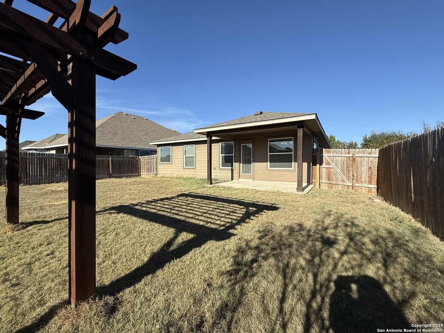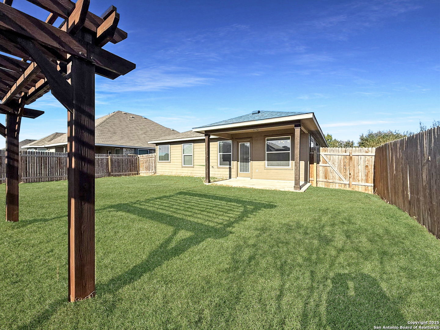 Experience comfort and convenience in this cute three-bedroom, two-bath rental. Step into a modern kitchen, equipped with granite countertops and stainless steel appliances, including a refrigerator and microwave. High ceilings and ceiling fans add to the open, airy feel of the home. The main bedroom provides a tranquil retreat with a walk-in closet and a double-vanity en-suite. The private backyard is an entertainer's dream, featuring a covered patio and a large pergola. A sprinkler system is included for easy lawn maintenance. The community offers fantastic amenities, including a pool and playscape, to which you'll have access. Two pets are welcome.