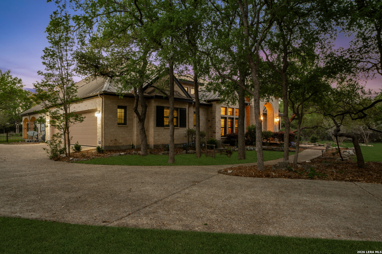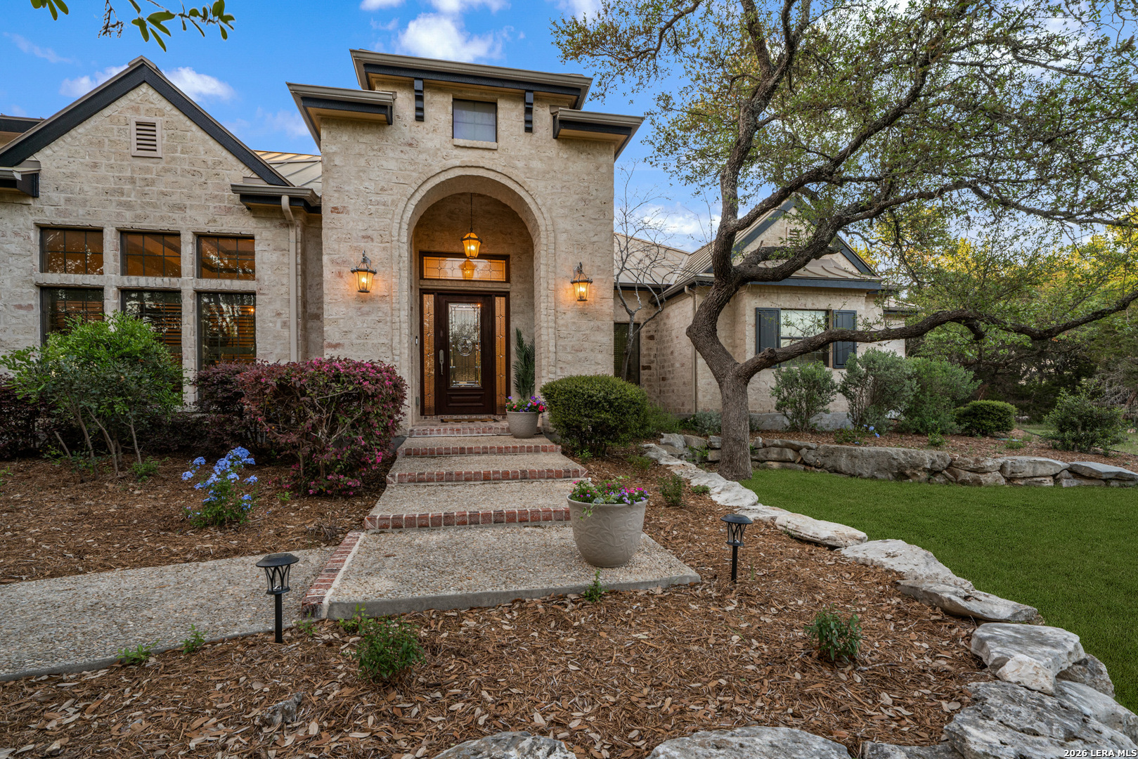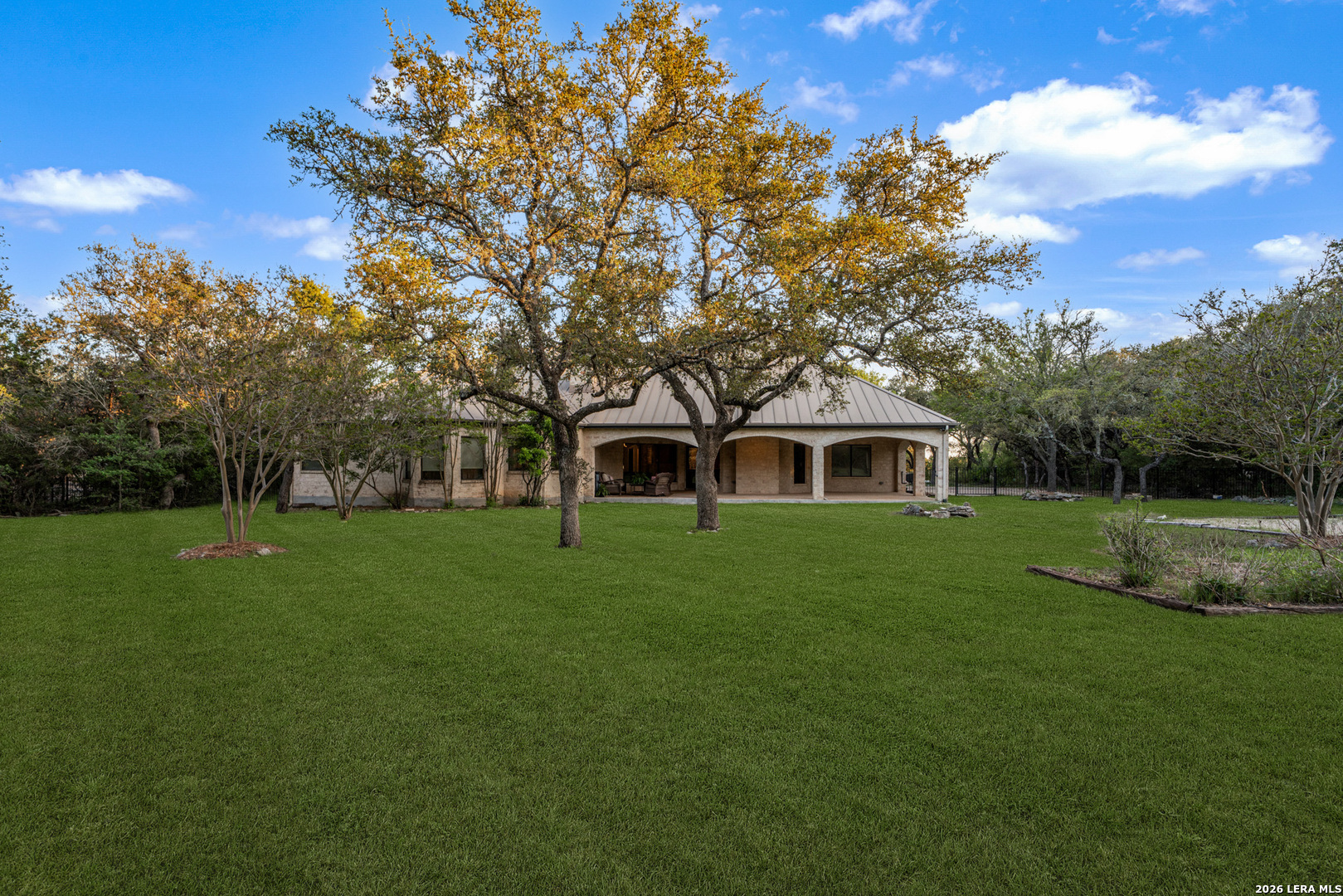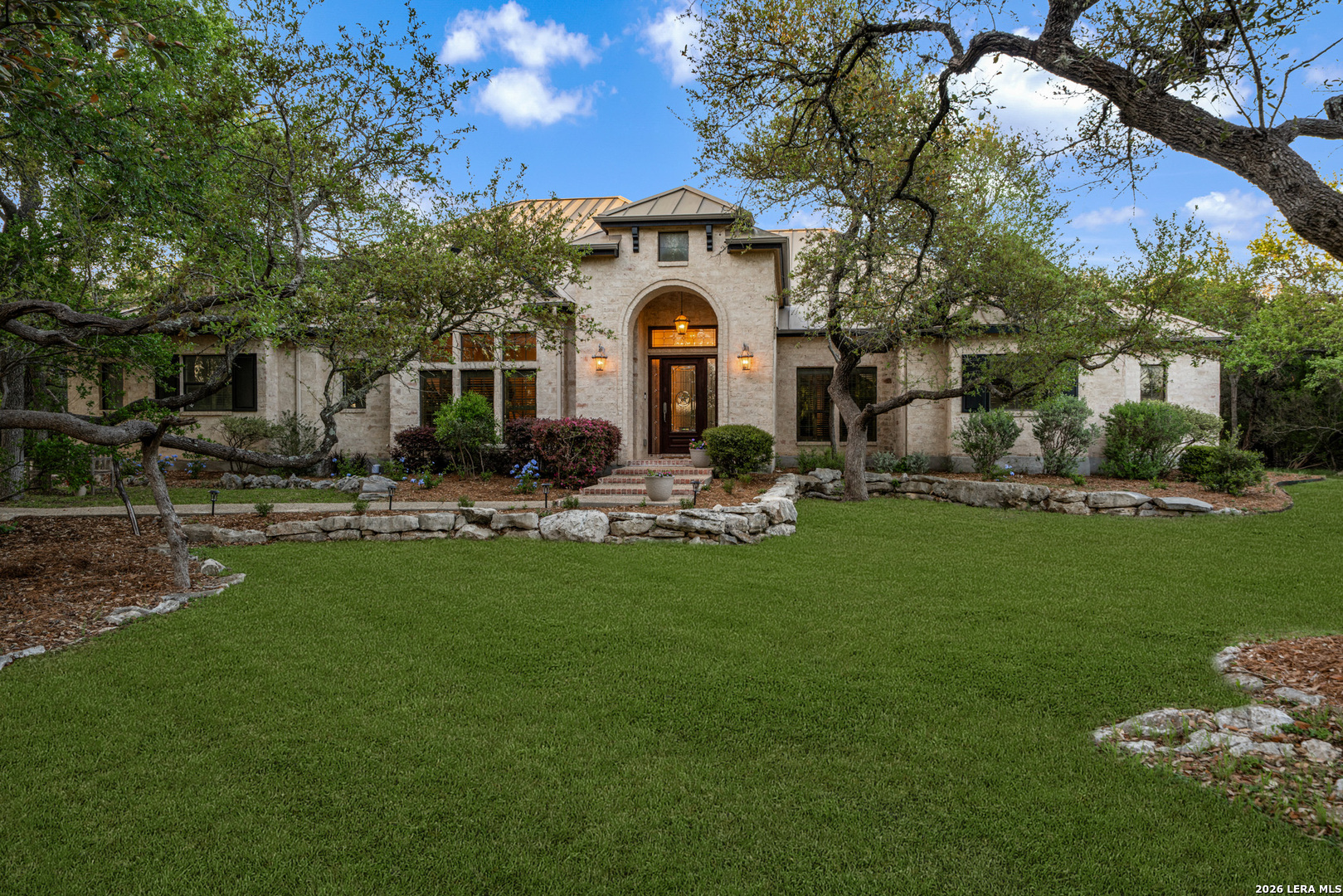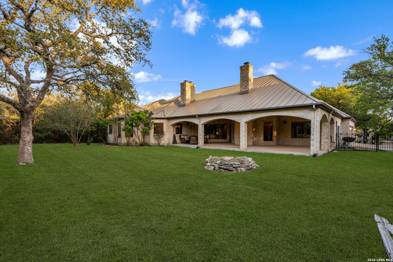 Recently updated and refreshed, this exceptional Hill Country residence in the prestigious Fossil Ridge community offers the perfect balance of peaceful, private living and everyday convenience. Set on a picturesque 1.26-acre homesite shaded by mature oaks, this single-story home by Harry Finigan Custom Homes features over 4,200 square feet of thoughtfully designed living space with a warm, inviting feel throughout. Natural light fills the interiors, highlighting timeless architectural details including wide plank wood floors, custom built-ins, and three striking stone fireplaces. Thoughtfully updated modern lighting throughout adds a refined, cohesive ambiance, enhancing each space while complementing the home's natural warmth and character. The open-concept design flows effortlessly, creating an ideal setting for both relaxed daily living and elegant entertaining. At the heart of the home, the chef's kitchen has been tastefully refreshed with new quartz countertops, offering both beauty and functionality. Generous prep space, quality appliances, and a charming breakfast area with its own fireplace create an inviting setting for gatherings both large and small. The private owner's retreat provides a peaceful escape with a cozy sitting area, fireplace, and spa-inspired bath featuring updated fixtures, while three additional bedrooms, a dedicated study, formal dining room, and versatile flex/game room offer space to live, work, and unwind with ease. Outdoors, a covered patio invites you to slow down and enjoy the surrounding natural beauty, with expansive grounds offering endless possibilities for relaxation or recreation. Here, quiet mornings and serene evenings are part of everyday life, yet you remain just minutes from top-rated NEISD schools, the JW Marriott, dining, shopping, medical facilities and easy access to Highway 281. Blending thoughtful updates, timeless design, and a setting that feels both private and connected, this home offers a rare opportunity to enjoy refined Hill Country living at an exceptional value.