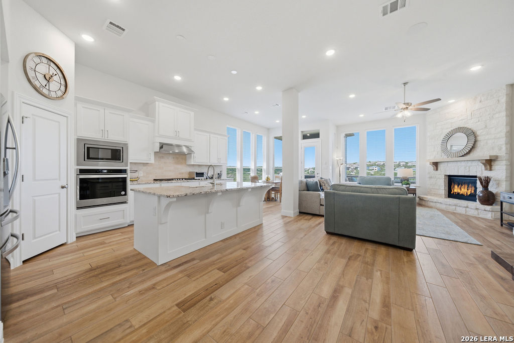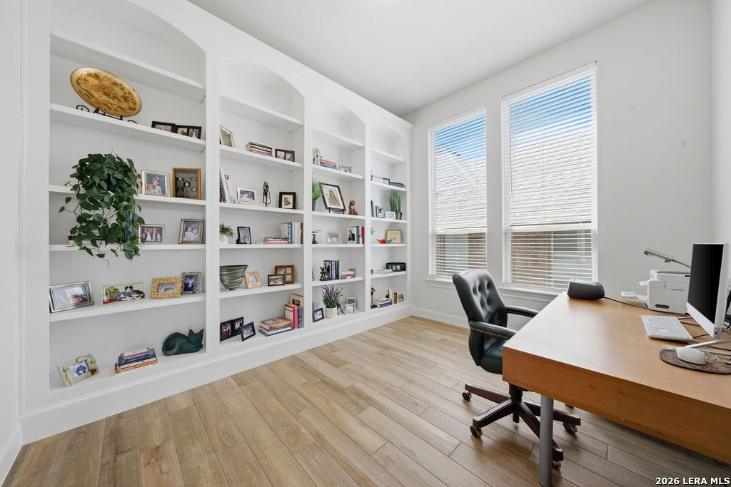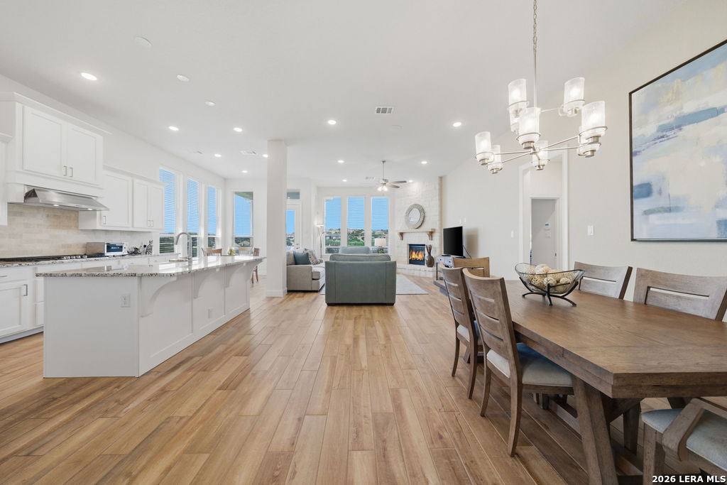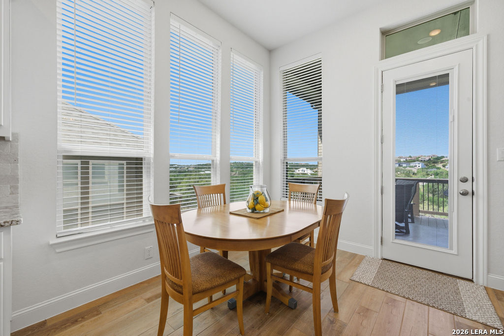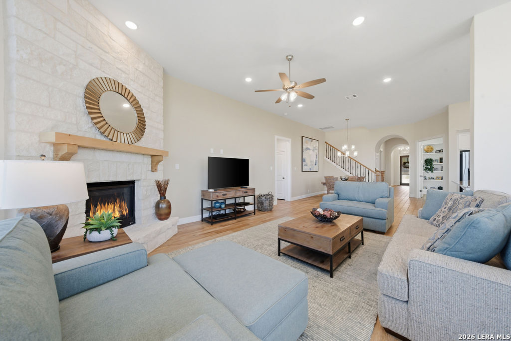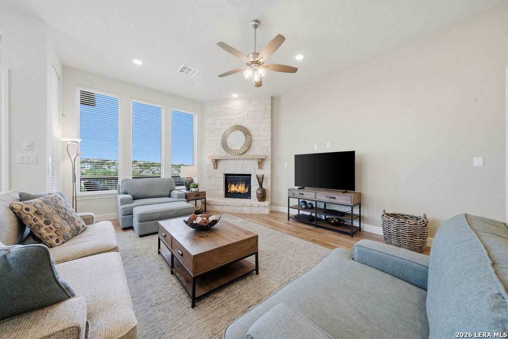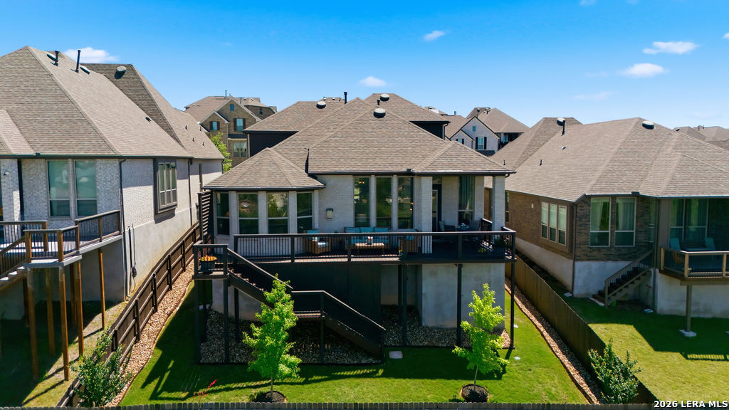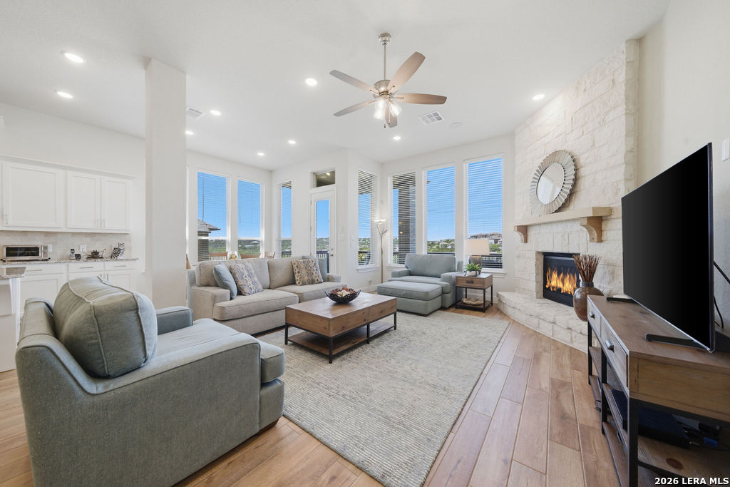 EPIC SUNSET VIEWS! Many luxury upgrades in this ONE AND A HALF STORY Highland Home. This move in ready home has it all and more! The spacious floorplan includes 4 bedrooms and 3 bathrooms with 3 car garage plus a dedicated office space. You'll love the open layout with high ceilings in the main living area. The floor to ceiling stone fireplace is amazing. Imagine yourself cooking in the fabulous kitchen with upgraded cabinets, farmhouse sink, built in oven, and 5 burner gas stove. The oversized granite island seats 4 with lots of cabinet space. Private study/office has custom built in shelving for the avid reader. Relax in your owners suite with captivating sunset views bow window detail. The spa like master bath features oversized vanity, his and hers sinks, as well as walk in shower and garden tub. Don't miss the expanded covered patio and deck with gas hook up. Enjoy the evening breeze and summer BBQ with hill country views. Upstairs you will find the perfect media/game room or "man cave". Additional bedroom and bath upstairs are perfect for teens, guests or family. This is a wonderful opportunity to be in a great location near restaurants, grocery stores, and entertainment. Coveted NEISD schools. Welcome Home!