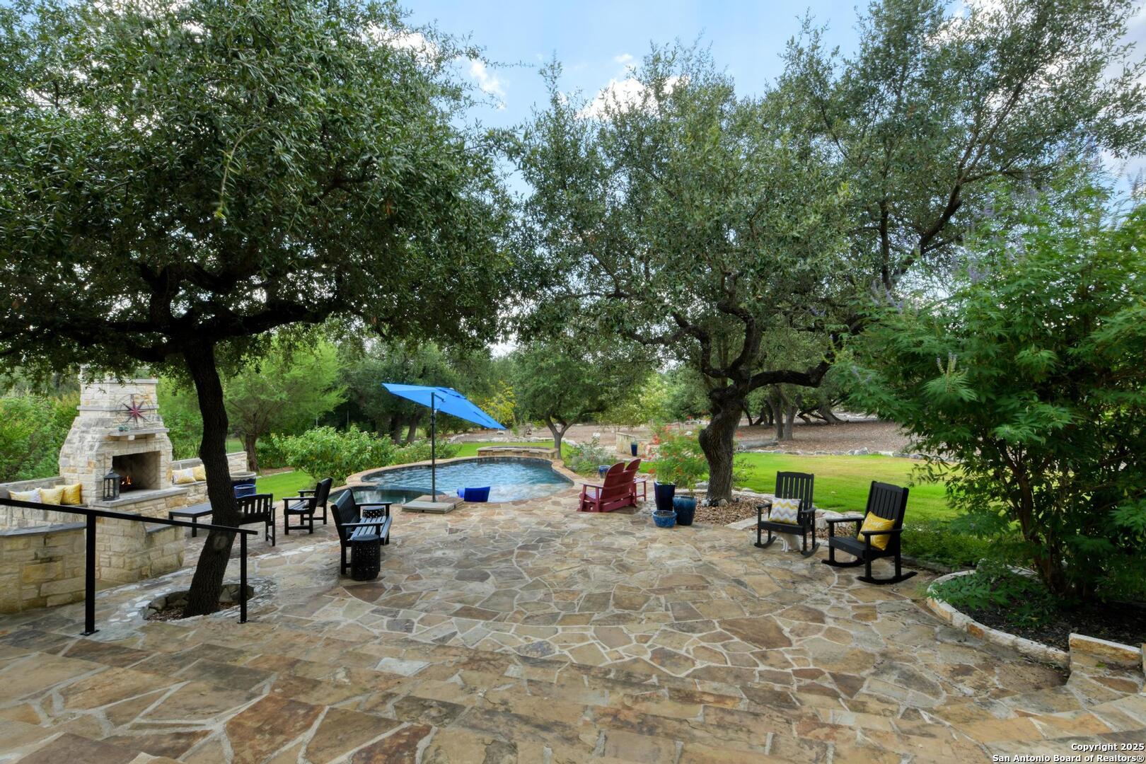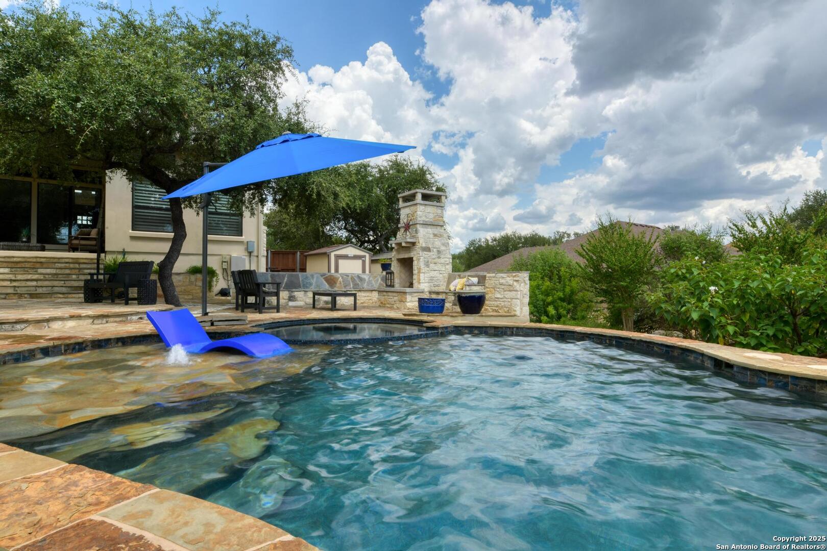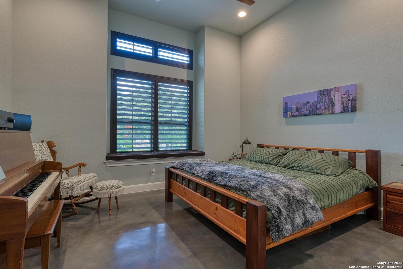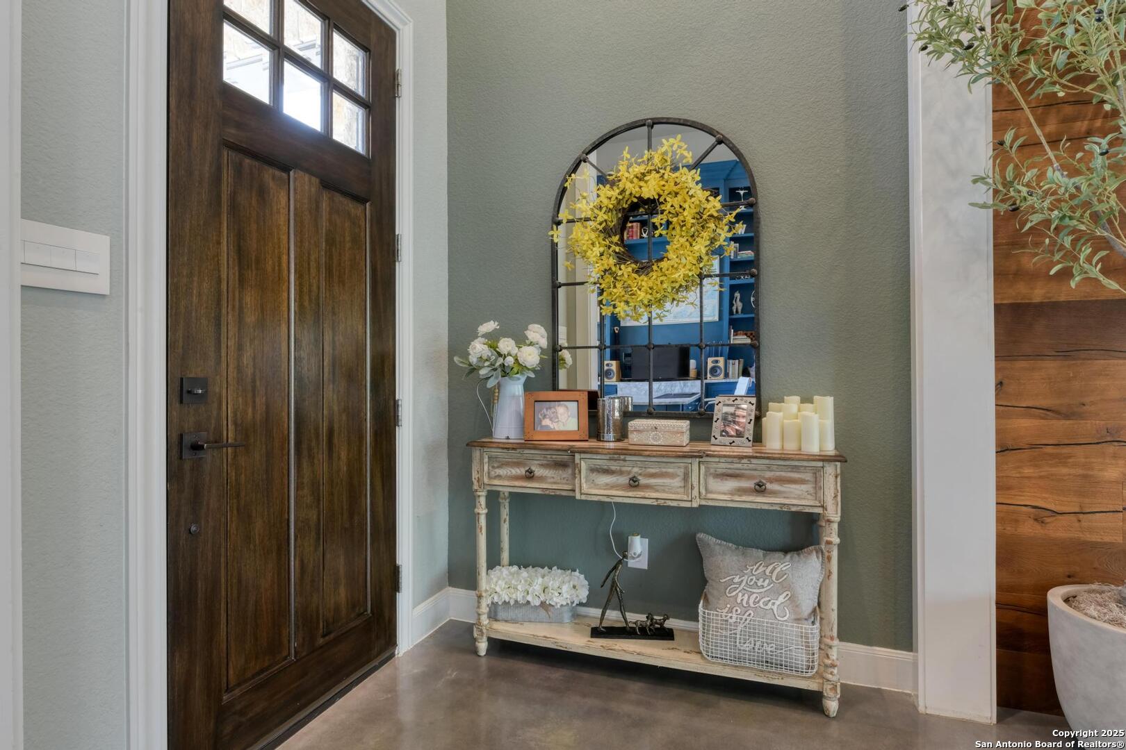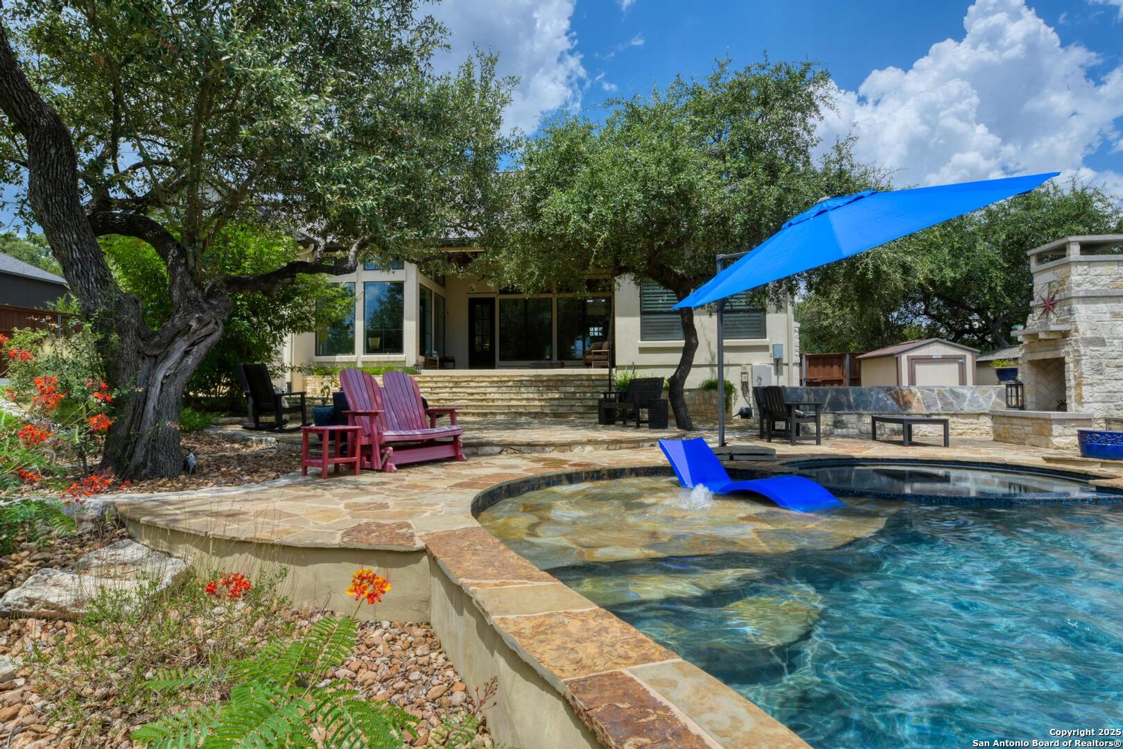 This exceptional property on Paradise Hills, is truly a Paradise. Custom built in 2015, the attention to detail is evident in every space of the home. The front study / library has custom built-in shelves and desk with exposed ceiling beams. The living space and primary bedroom each have a hardwood accent wall, and the entire home has stained concrete floors with no carpet. The stunning chef's kitchen is huge and has so much room to "eat-in" the space and this area connects to a seemless back patio that extends the living space. The primary bedroom space is next level with a closet larger than most bedrooms, which connects to an oversized laundry space for added convenience. The show stopper of this property is the resort style backyard. No expense was sparred on pool, landscaping, and special yard lighting to include 8 different types of trees. This property is an oasis on just over 1 acre - so much to love!