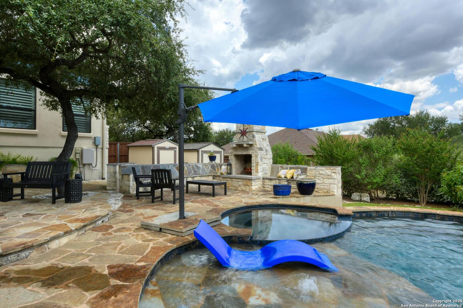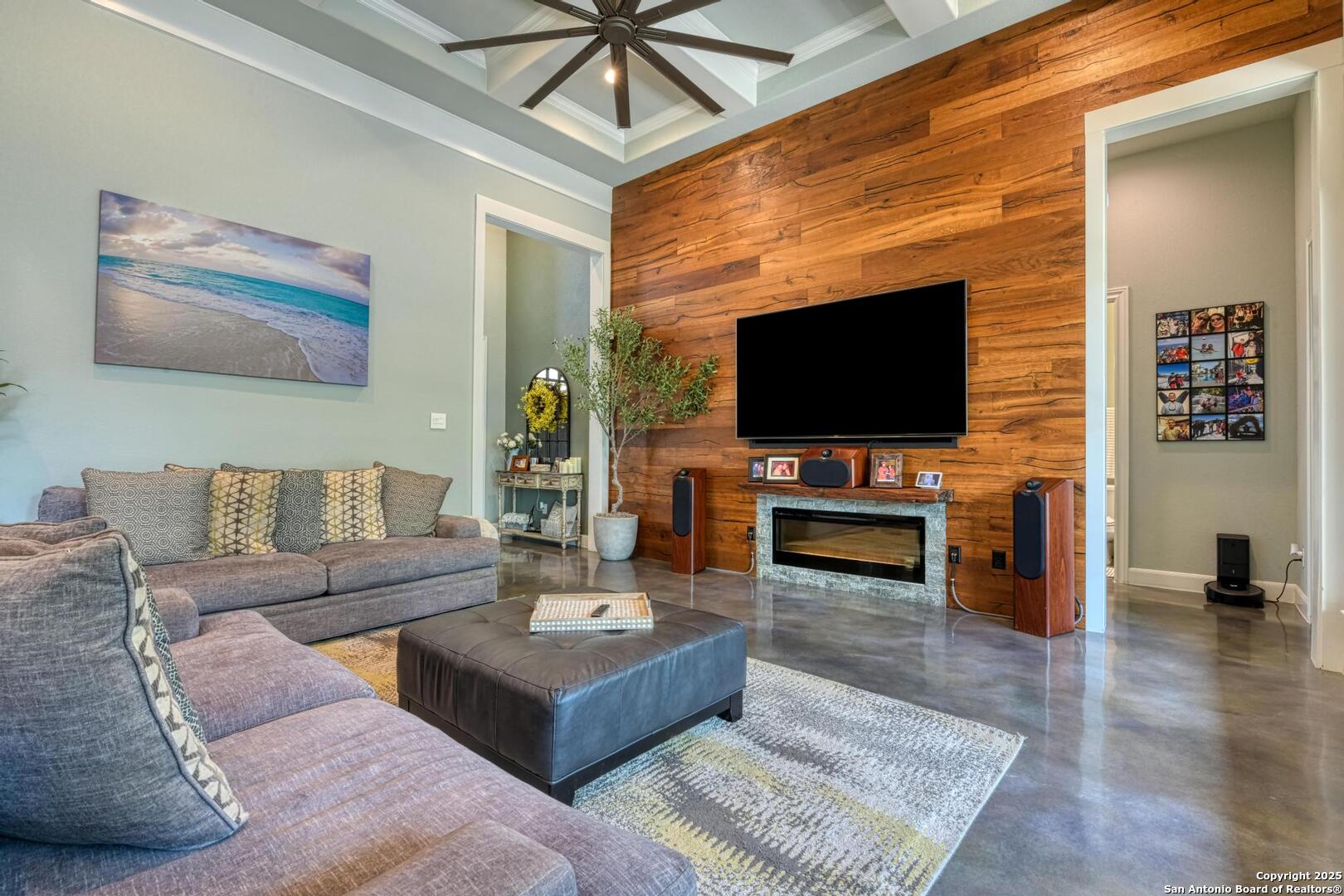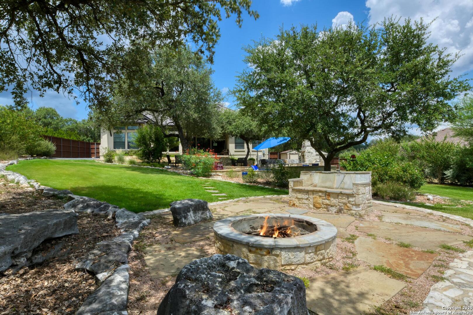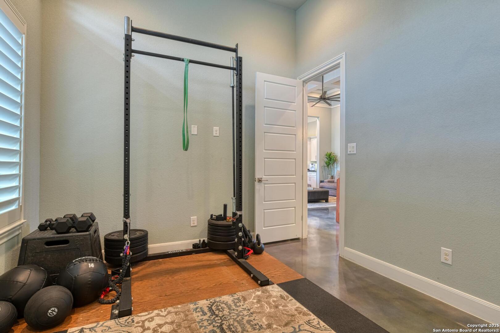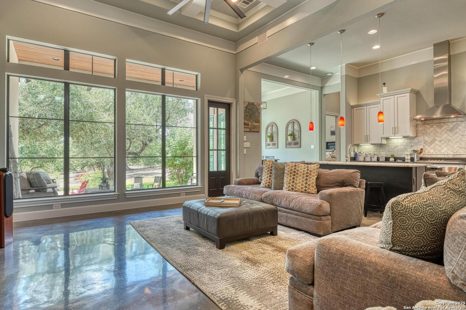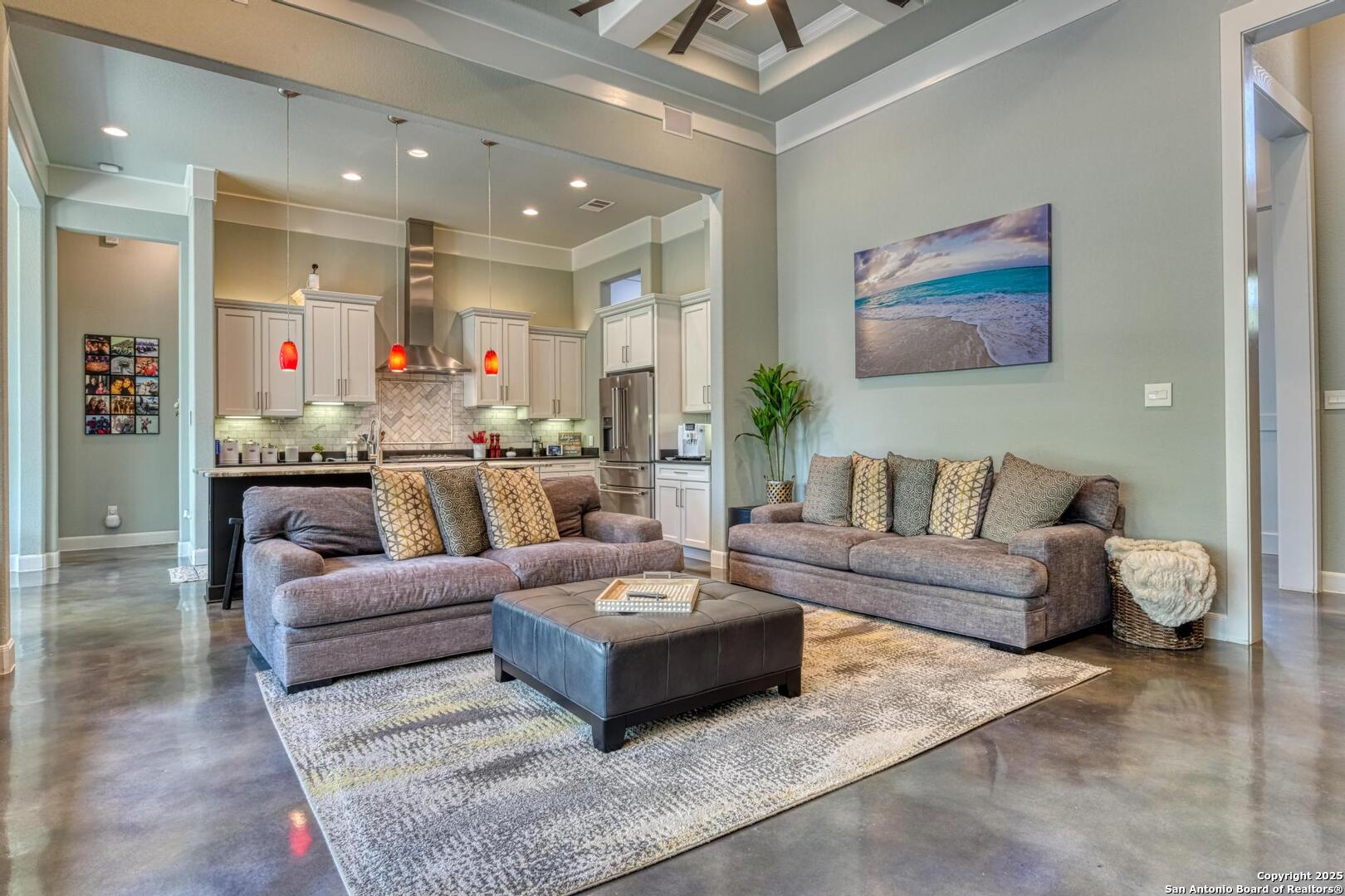 This exceptional property on Paradise Hills, is truly a Paradise. Custom built in 2015, the attention to detail is evident in every space of the home. The front study / library has custom built-in shelves and desk with exposed ceiling beams. The living space and primary bedroom each have a hardwood accent wall, and the entire home has stained concrete floors with no carpet. The stunning chef's kitchen is huge and has so much room to "eat-in" the space and this area connects to a seemless back patio that extends the living space. The primary bedroom space is next level with a closet larger than most bedrooms, which connects to an oversized laundry space for added convenience. The show stopper of this property is the resort style backyard. No expense was sparred on pool, landscaping, and special yard lighting to include 8 different types of trees. This property is an oasis on just over 1 acre - so much to love!