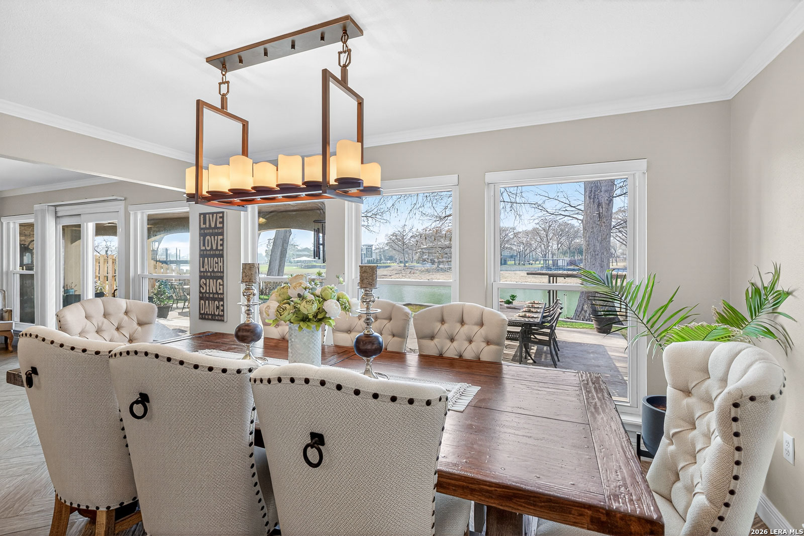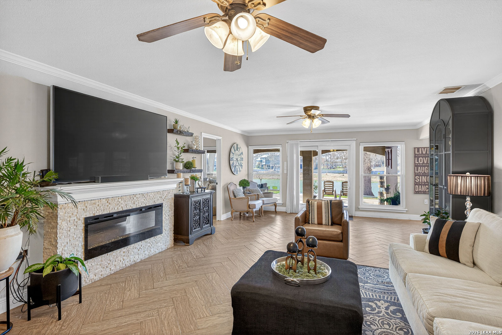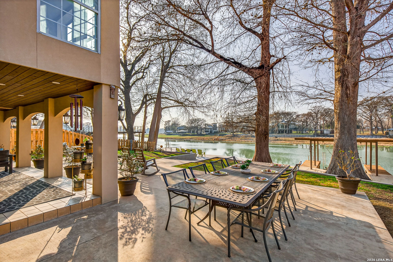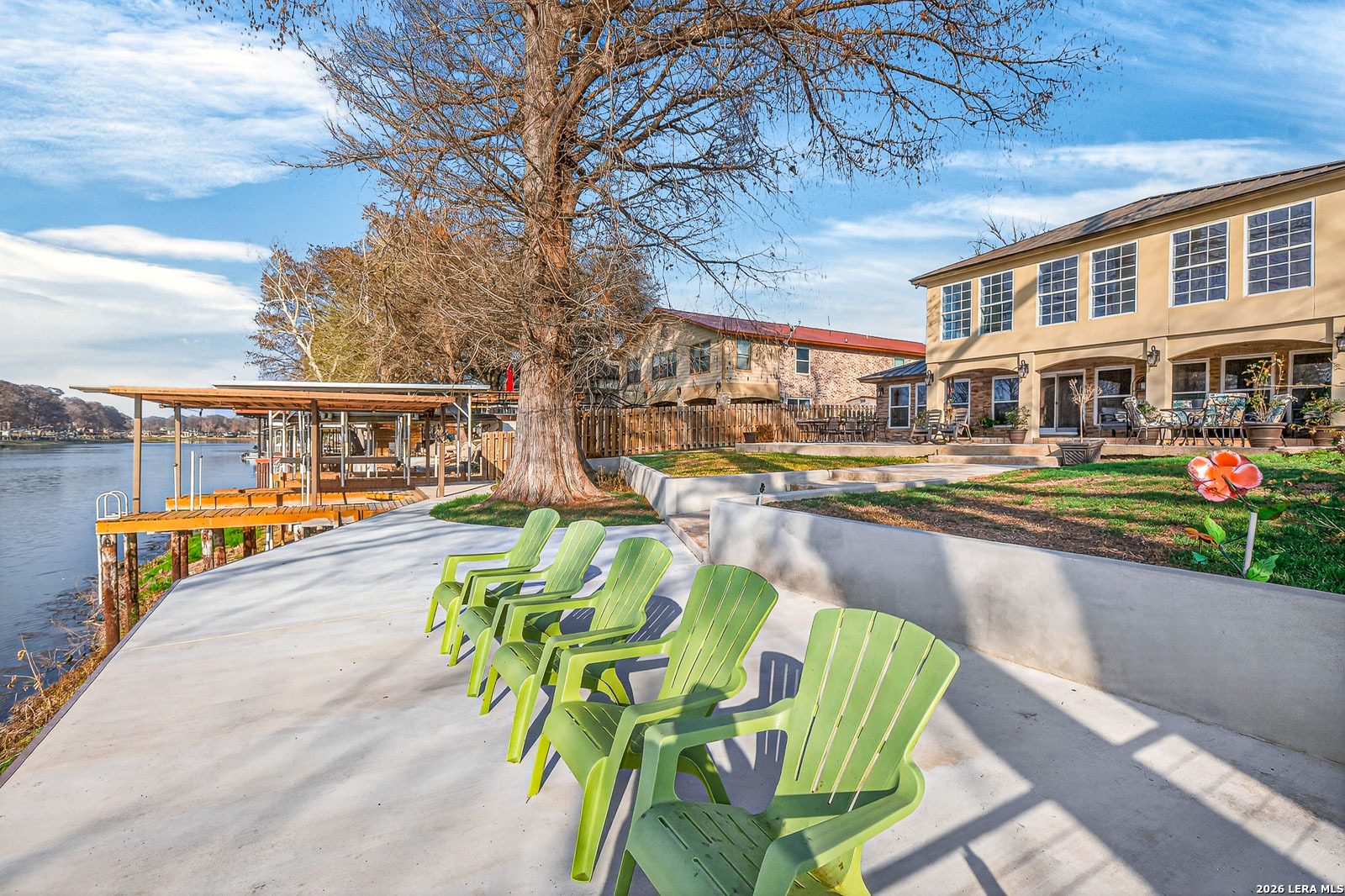 Lake McQueeney is set to return in March 2026 - and this is your chance to secure your spot before the water does. This waterfront home commands wide water views, prime positioning, and unforgettable sunsets on one of McQueeney's most desirable stretches. When the lake is full, this location delivers big water presence with easy access to everything that makes McQueeney iconic. The ski lodge is a short boat ride away! Stone, rock, and stucco construction paired with a metal roof and wrought-iron French doors create bold curb appeal. The covered back patio-wired for outdoor TV-overlooks the shoreline and flows to an expansive concrete entertaining space and private boathouse with electric lift. Inside, the split floorplan blends comfort and style with quartz countertops, double ovens, crown molding, tray ceilings, recessed lighting, and upgraded finishes throughout. The oversized owner's suite offers water views and a spa-style bath complete with soaking tub, steam shower, towel warmer, quartz counters, and custom closet system. Upstairs, additional bedrooms and a loft/game room with beverage station and enclosed balcony give guests their own space with lake views. Three-car garage. Zoned HVAC (2022). Dual water heaters. WiFi-controlled systems throughout. Lake McQueeney is coming back. The question is-will you already be here when it does?