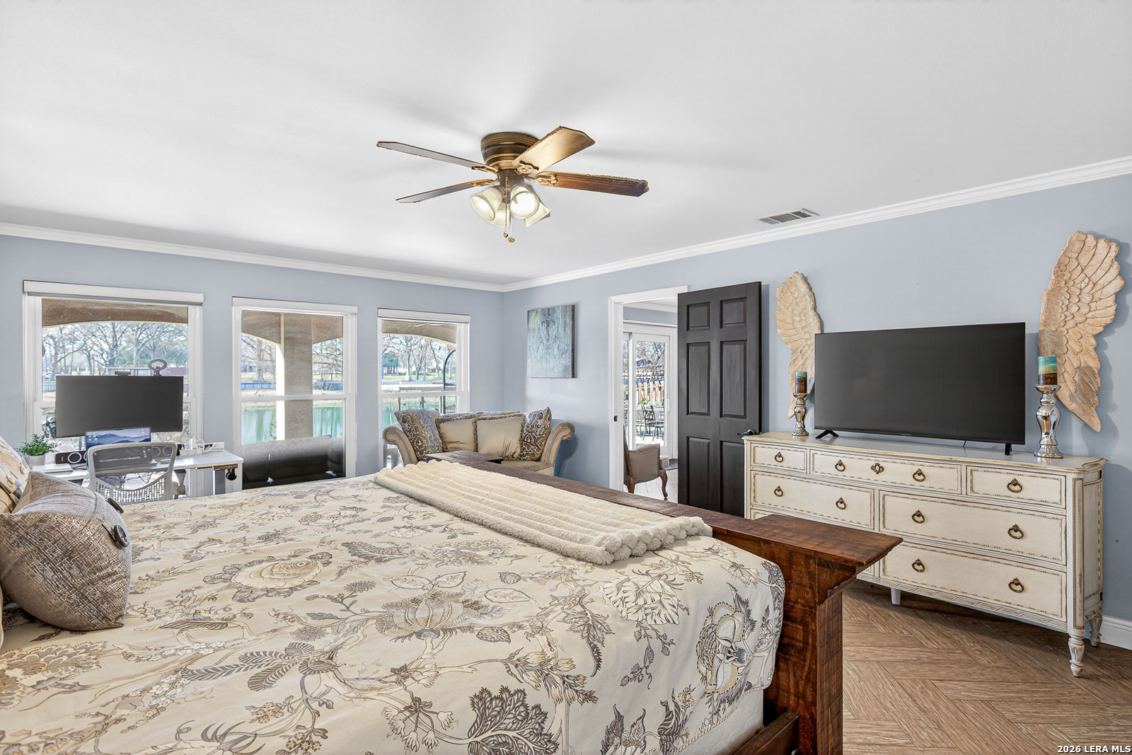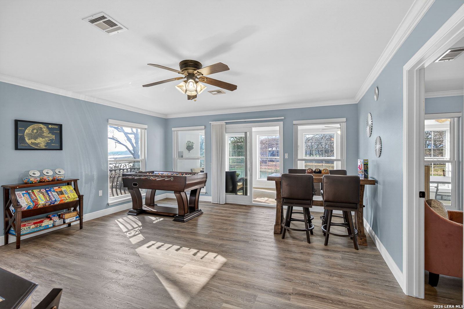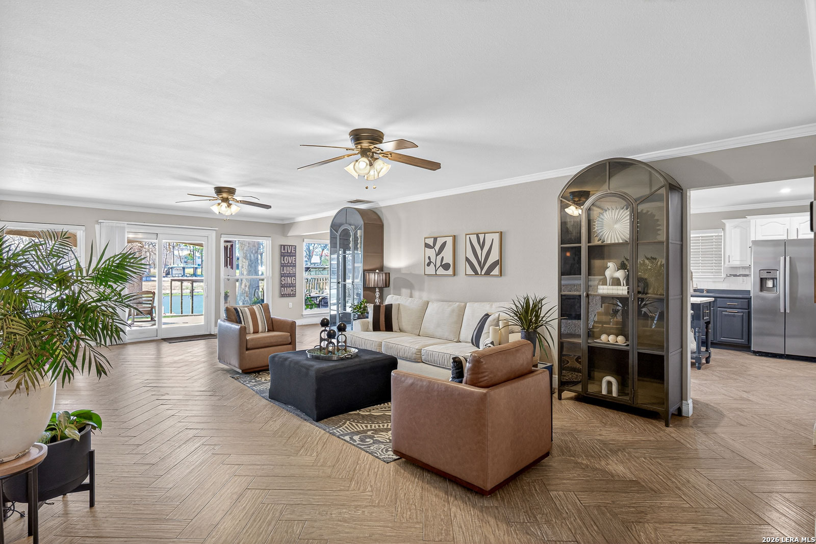 Lake McQueeney is set to return in March 2026 - and this is your chance to secure your spot before the water does. This waterfront home commands wide water views, prime positioning, and unforgettable sunsets on one of McQueeney's most desirable stretches. When the lake is full, this location delivers big water presence with easy access to everything that makes McQueeney iconic. The ski lodge is a short boat ride away! Stone, rock, and stucco construction paired with a metal roof and wrought-iron French doors create bold curb appeal. The covered back patio-wired for outdoor TV-overlooks the shoreline and flows to an expansive concrete entertaining space and private boathouse with electric lift. Inside, the split floorplan blends comfort and style with quartz countertops, double ovens, crown molding, tray ceilings, recessed lighting, and upgraded finishes throughout. The oversized owner's suite offers water views and a spa-style bath complete with soaking tub, steam shower, towel warmer, quartz counters, and custom closet system. Upstairs, additional bedrooms and a loft/game room with beverage station and enclosed balcony give guests their own space with lake views. Three-car garage. Zoned HVAC (2022). Dual water heaters. WiFi-controlled systems throughout. Lake McQueeney is coming back. The question is-will you already be here when it does?