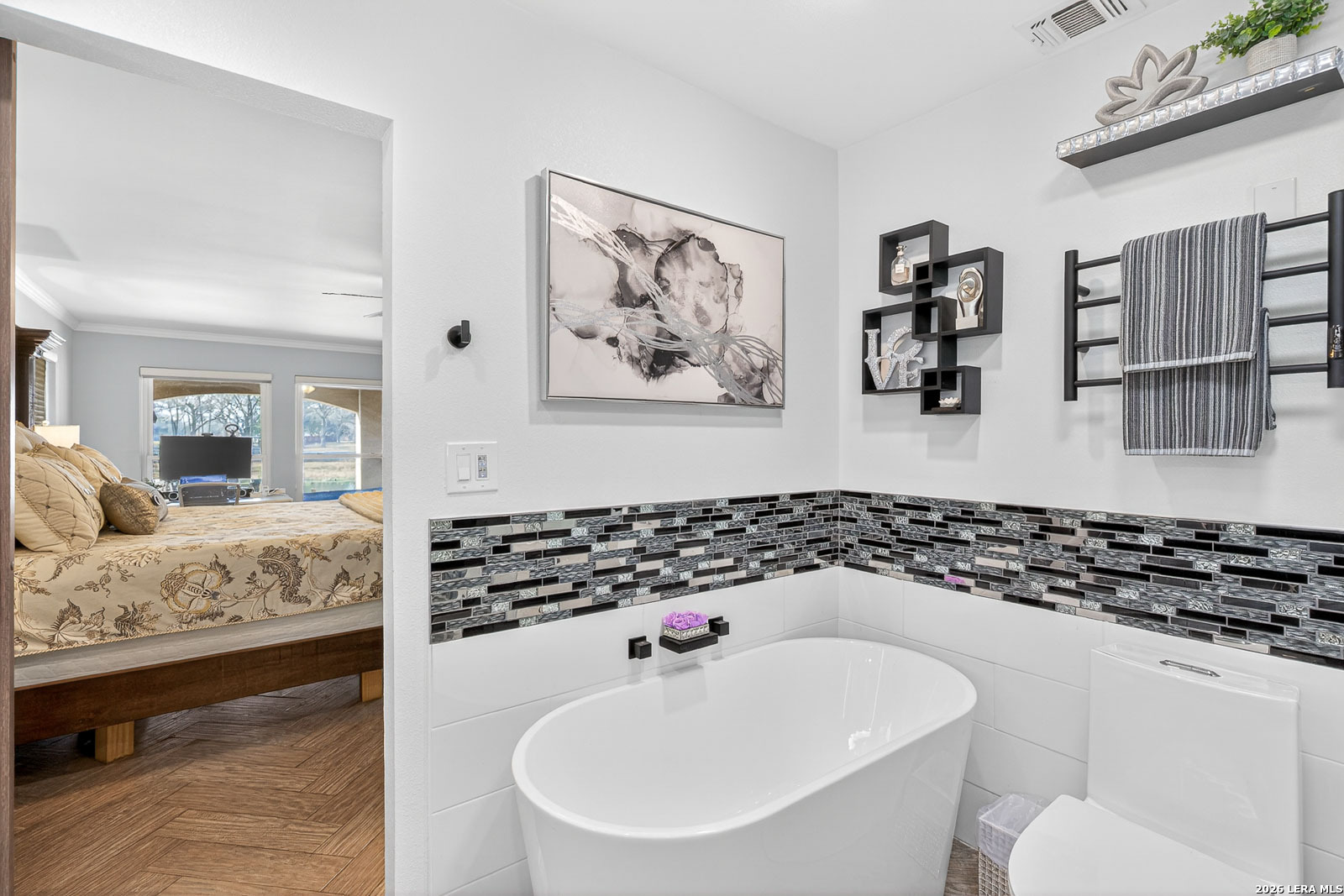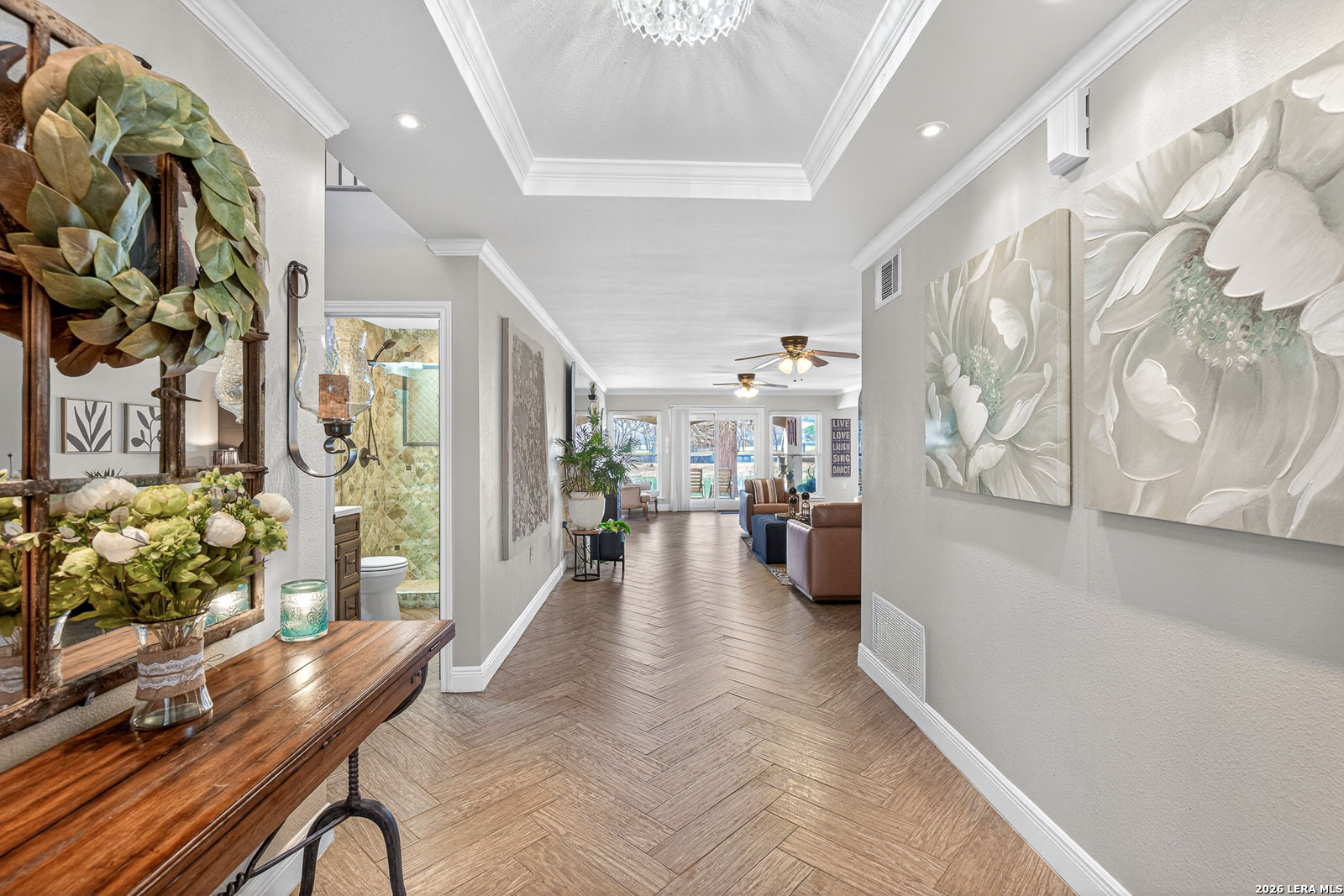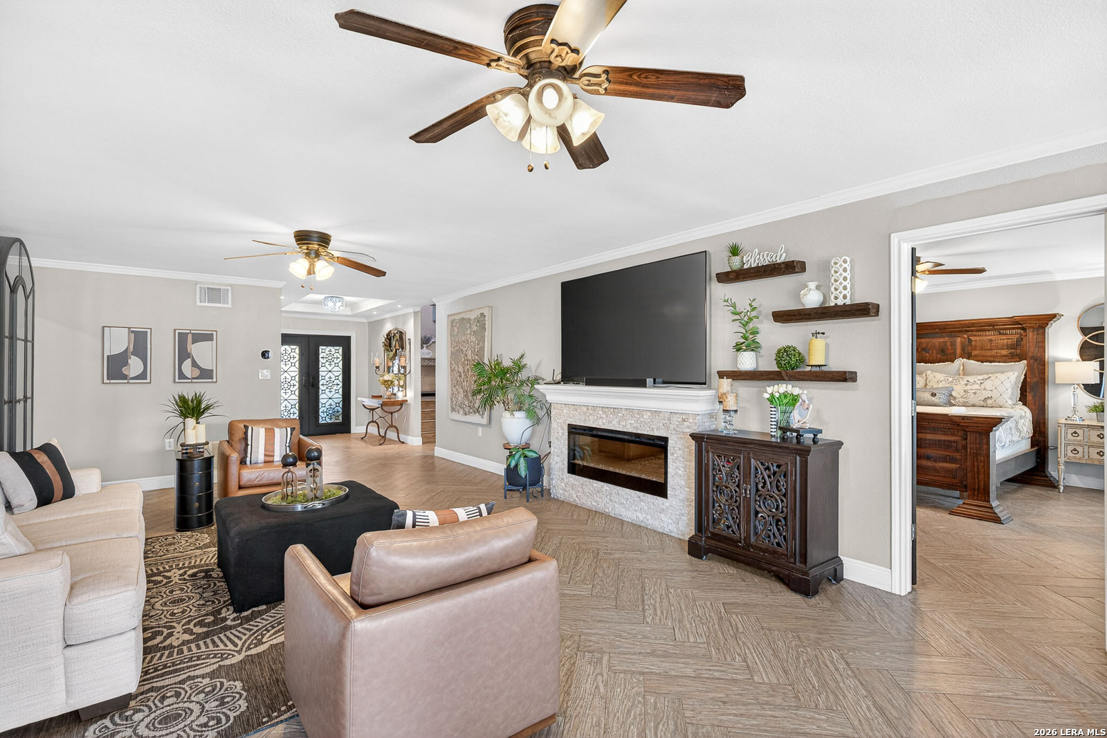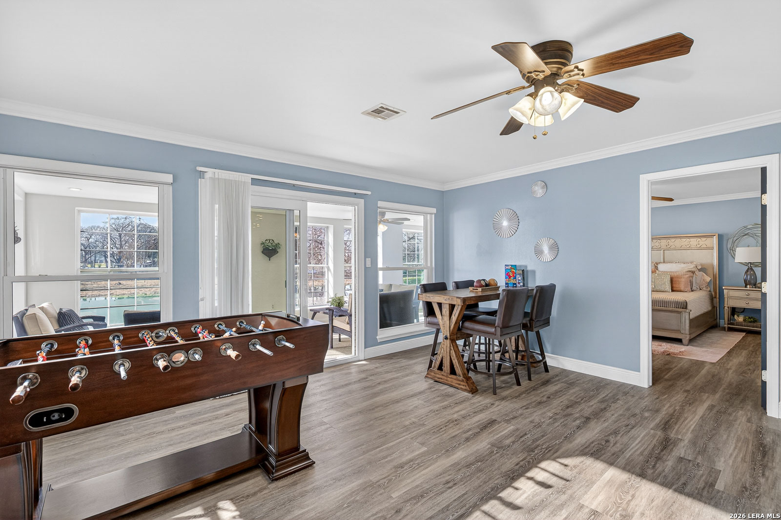 Lake McQueeney is set to return in March 2026 - and this is your chance to secure your spot before the water does. This waterfront home commands wide water views, prime positioning, and unforgettable sunsets on one of McQueeney's most desirable stretches. When the lake is full, this location delivers big water presence with easy access to everything that makes McQueeney iconic. The ski lodge is a short boat ride away! Stone, rock, and stucco construction paired with a metal roof and wrought-iron French doors create bold curb appeal. The covered back patio-wired for outdoor TV-overlooks the shoreline and flows to an expansive concrete entertaining space and private boathouse with electric lift. Inside, the split floorplan blends comfort and style with quartz countertops, double ovens, crown molding, tray ceilings, recessed lighting, and upgraded finishes throughout. The oversized owner's suite offers water views and a spa-style bath complete with soaking tub, steam shower, towel warmer, quartz counters, and custom closet system. Upstairs, additional bedrooms and a loft/game room with beverage station and enclosed balcony give guests their own space with lake views. Three-car garage. Zoned HVAC (2022). Dual water heaters. WiFi-controlled systems throughout. Lake McQueeney is coming back. The question is-will you already be here when it does?