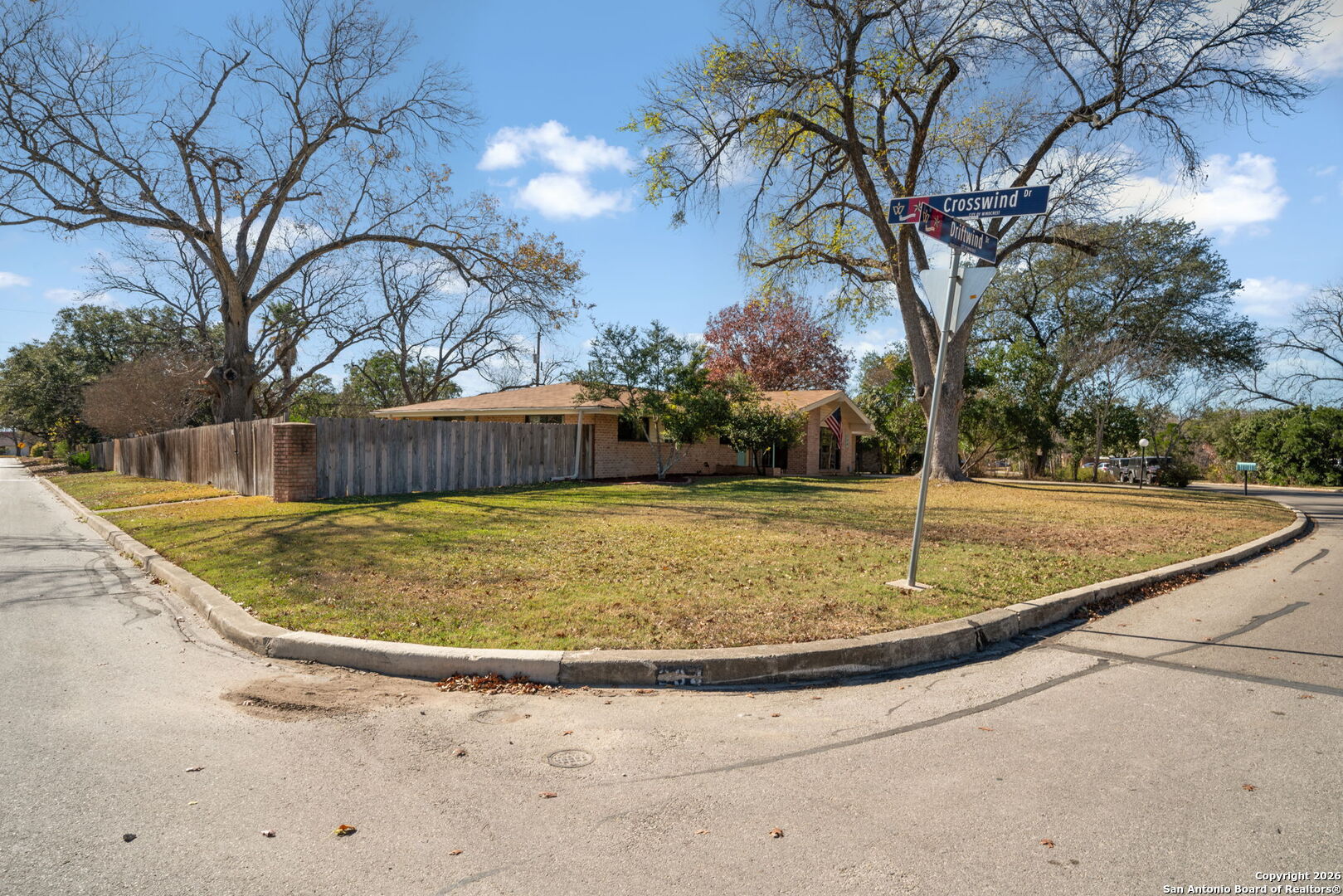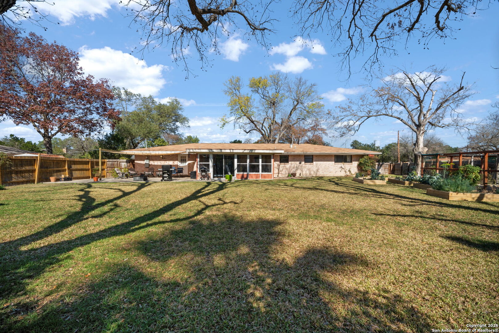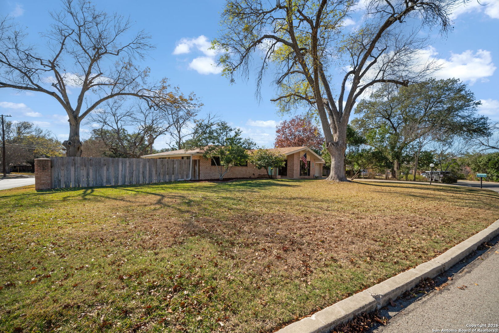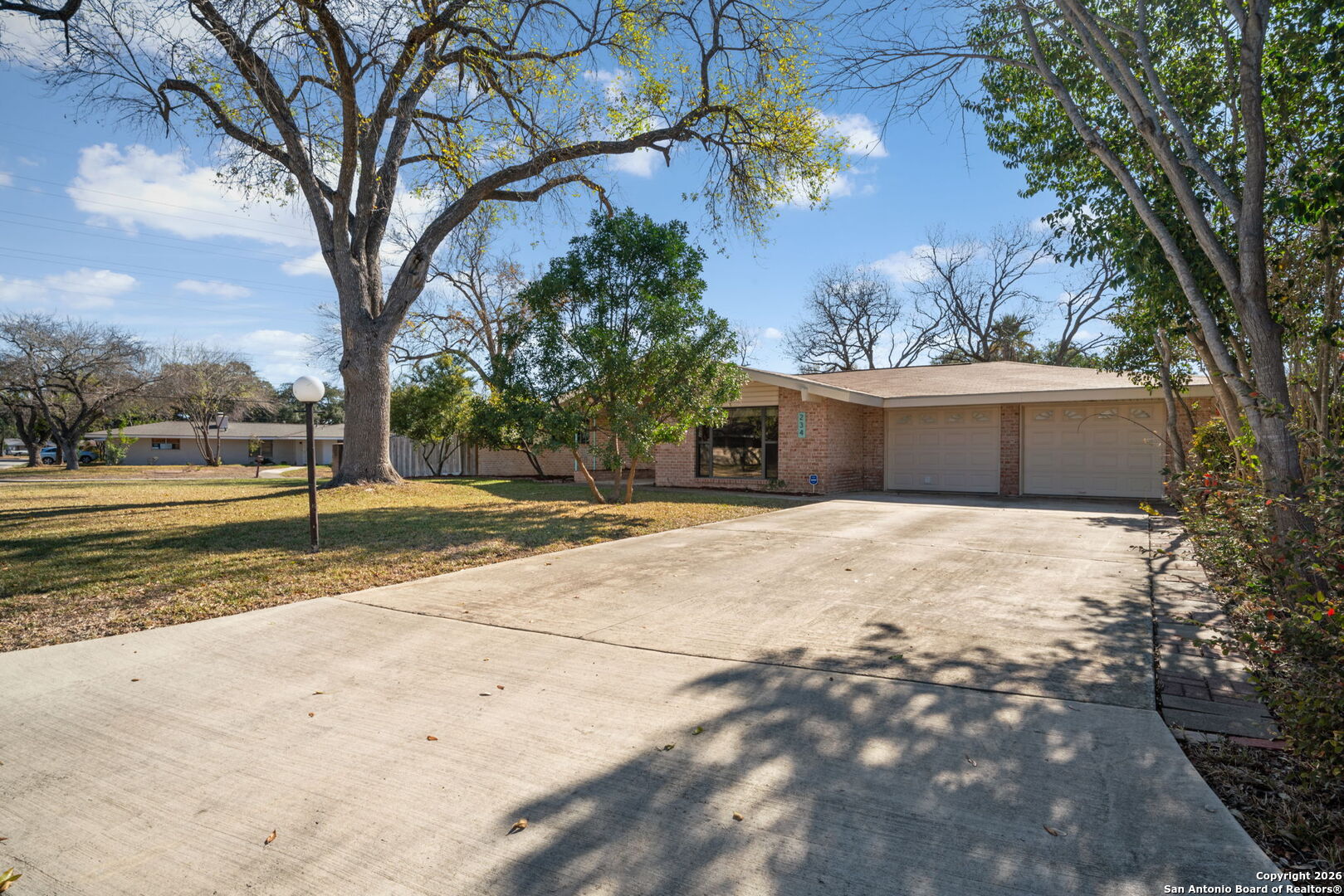 Welcome to this truly stylish single-story home located in one of San Antonio's most cherished communities, Windcrest. Situated on an oversized corner lot of +/- 0.377 acres, this property is surrounded by mature trees and lush landscaping, offering exceptional space, privacy, and a distinctive architectural style that truly sets it apart. Upon entry, you are welcomed by a bright, open floor plan with a front living area highlighted by a striking brick feature wall that creates a warm and inviting atmosphere. The thoughtfully designed kitchen features granite countertops, stainless steel appliances, a breakfast bar, and generous cabinet and counter space, making it ideal for both everyday living and entertaining. The primary bedroom offers a peaceful view of the backyard and includes a private, updated ensuite with a single vanity and walk-in shower. Two generously sized secondary bedrooms are complemented by an updated secondary bathroom with a tub & shower combination. A large utility room with a sink provides outstanding storage and added functionality. The enclosed sunroom currently serves as a home gym but easily functions as an additional living area, game room, or flexible space to suit your needs. Step outside to the expansive backyard where you will find a large patio, mature shade trees, a vegetable garden, and Tuff Shed, creating the perfect setting for outdoor relaxation or entertaining. This home offers a rare combination of lot size, character, and versatility within an established community. Enjoy nearby parks, walking trails, a top-rated golf course, and the quiet, welcoming atmosphere that makes Windcrest so special. Schedule your private showing today and experience everything this exceptional property has to offer.